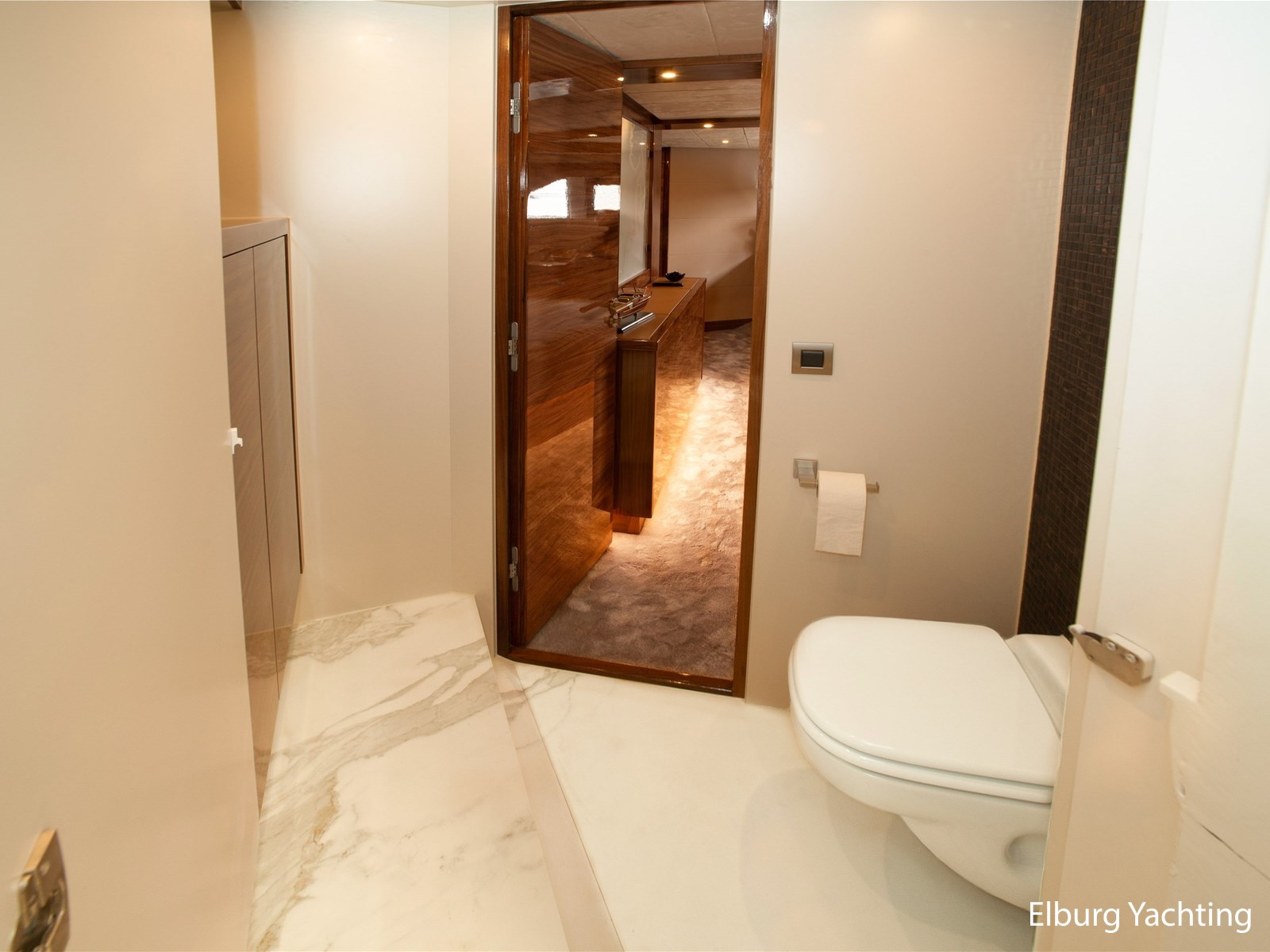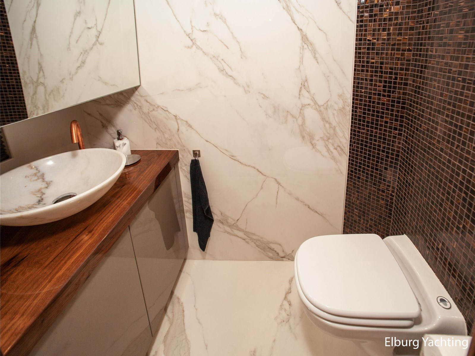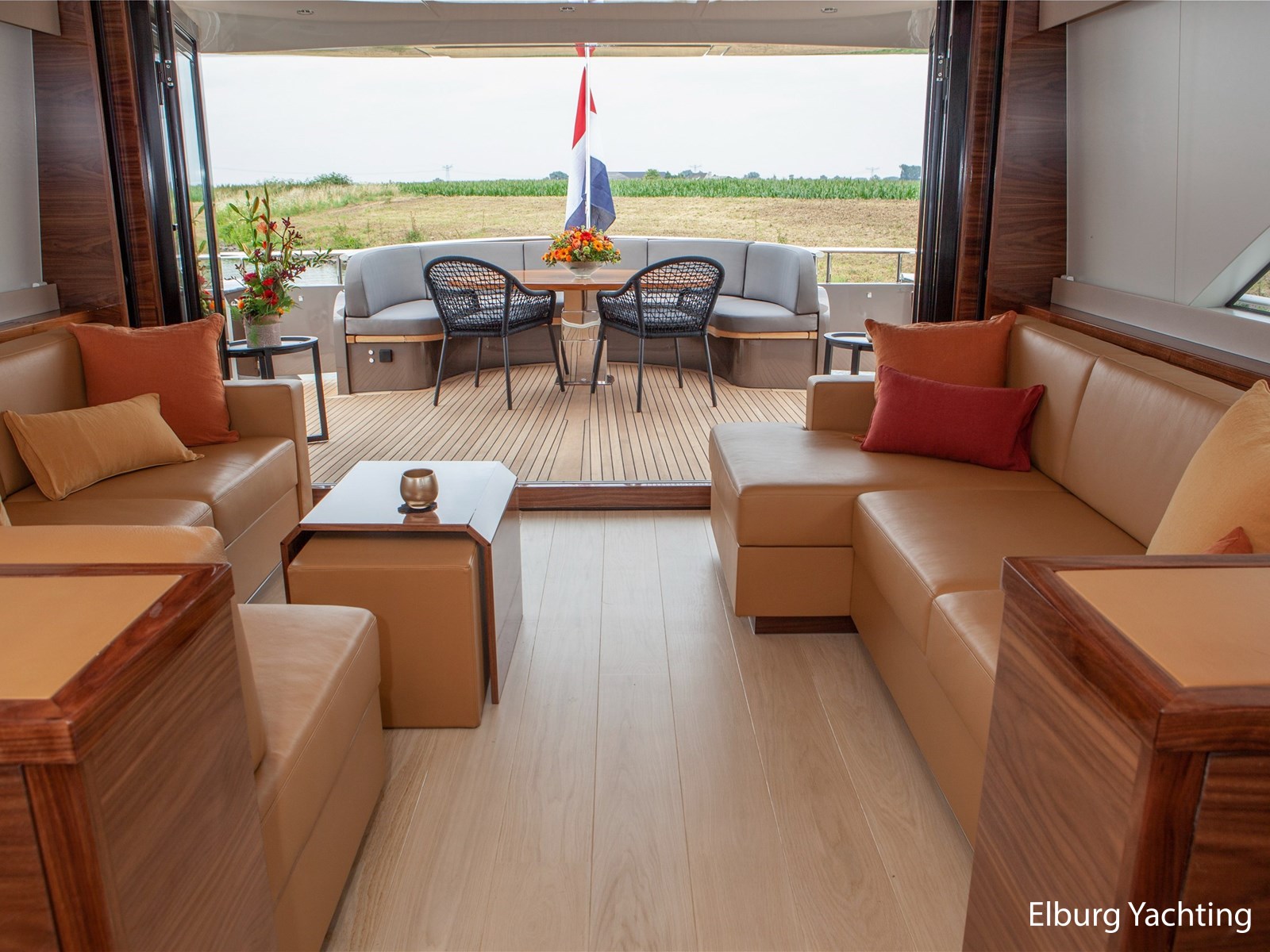De salon op dekniveau biedt een spectaculair 360-graden uitzicht, wat het gevoel van ruimte en licht versterkt doormiddel van de grote raampartijen. De brede gangboorden rondom maken het veilig en gemakkelijk om gelijkvloers rondom het dek te bewegen. Het voordek biedt volop ruimte om te loungen, compleet met een comfortabele bank om in alle rust van het uitzicht te genieten. Ook het achterdek is royaal opgezet, met een halfronde bank voor vijf personen en een overkapping die schaduw biedt tijdens zonnige dagen. Aan beide zijden van het jacht leiden stijlvolle trappen naar het ruime zwemplateau, dat tevens toegang biedt tot de professioneel ingerichte machinekamer met stahoogte. Met plezier maak je hier een dagelijks inspectie rondje en ziet in een oogopslag dat alle techniek in orde is. Dit schip beschikt over een geldig CVO certificaat.