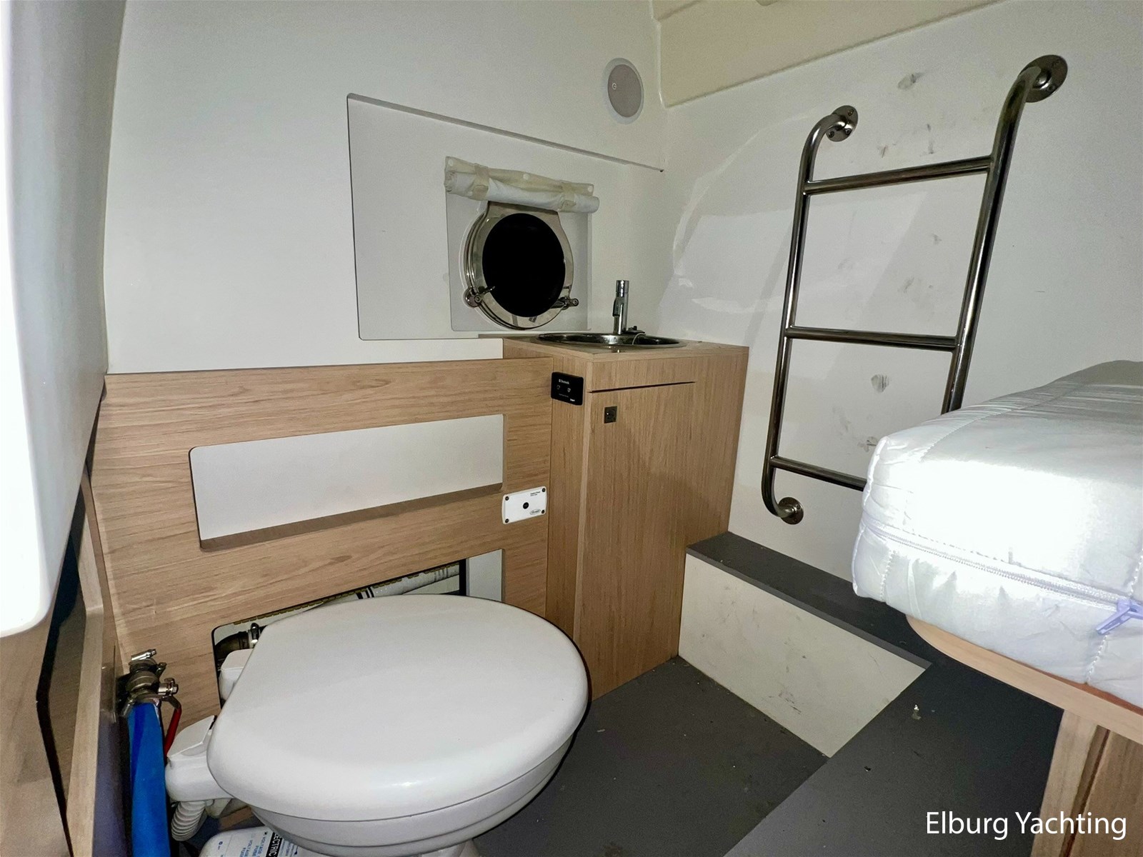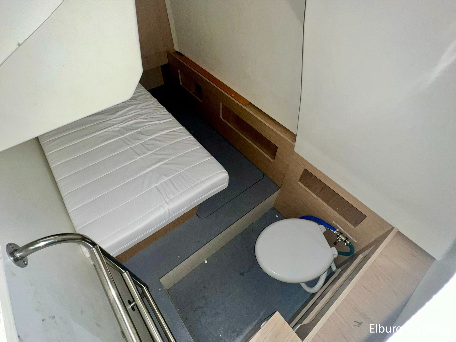 Zeer compleet uitgevoerde Monte Carlo 5S. De 5S-serie onderscheidt zich door stoere en sportieve looks en een hardtop met een buitenlounge op het dak. Vanaf het hydraulisch beweegbare zwemplateau wordt de open kuip betreden. De kuip heeft een geïntegreerde bank met bijbehorende kussens en vaste tafel. Aan SB zijde in de kuip bevindt zich de toegang tot de extra hut (crew cabin) in het achterschip, deze hut is tevens te gebruiken als extra opbergruimte. Via de open kuip stap je eenvoudig op naar het gangboord met goede houvast rondom voor een veilige loop over het dek. Op het voordek zijn twee geïntegreerde klapbare zonnebedden aanwezig. Via een geïntegreerde trap vanuit de kuip betreed je de buitenlounge op het dak. Deze buitenlounge heeft een in hoogte verstelbare tafel waarmee er ook een groot zonnebed gecreëerd kan worden. De salon en de kuip laten zich verbinden door drie grote glazen wegklapbare deuren. De kombuis is gesitueerd bij de ingang van de salon. Door het openen van de salondeuren wordt de kombuis volledig betrokken bij de kuip. De salon gecombineerd met de stuurstand bevindt zich op dekniveau. Via de de grote ramen rondom (getint) is er goed zicht en komt er veel licht binnen. Het buitengevoel naar binnen brengen kan door het openen van het grote elektrisch bedienbare schuifdak en twee zijruiten. Benedendeks bevinden zich drie hutten voor in totaal zes personen. De 2-persoons eigenaarshut bevindt zich midscheeps over de volledige breedte van het schip. Deze hut is voorzien van eigen sanitair en-suite. Aan stuurboordzijde bevindt zich een 1 x 2 persoons stapelbed en in de voorhut een 2-persoons Frans bed. Centraal is er een tweede badkamer met douche en toilet gesitueerd. Deze Monte Carlo 5S is verder voorzien van: achteruitkijk camera via plotterscherm, elektrisch bedienbare gangway, kuip afsluitbaar met deur naar zwemplateau, TV op lift in salon, Volvo ship/motormanagement display bij stuurstand, Fusion audiosysteem, trimtabs, Yachtcontroller afstandsbediening om te manoeuvreren middels de IPS aandrijving + boegschroef. Voor vragen en/of het maken van een afspraak bent u 7 dagen per week van harte welkom bij Elburg Yachting.
