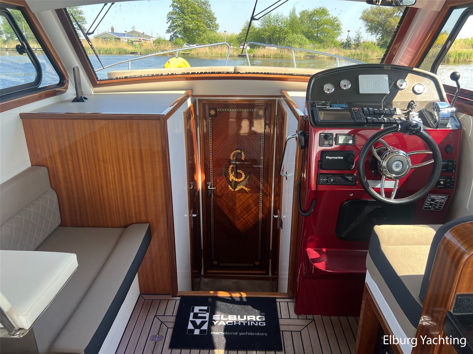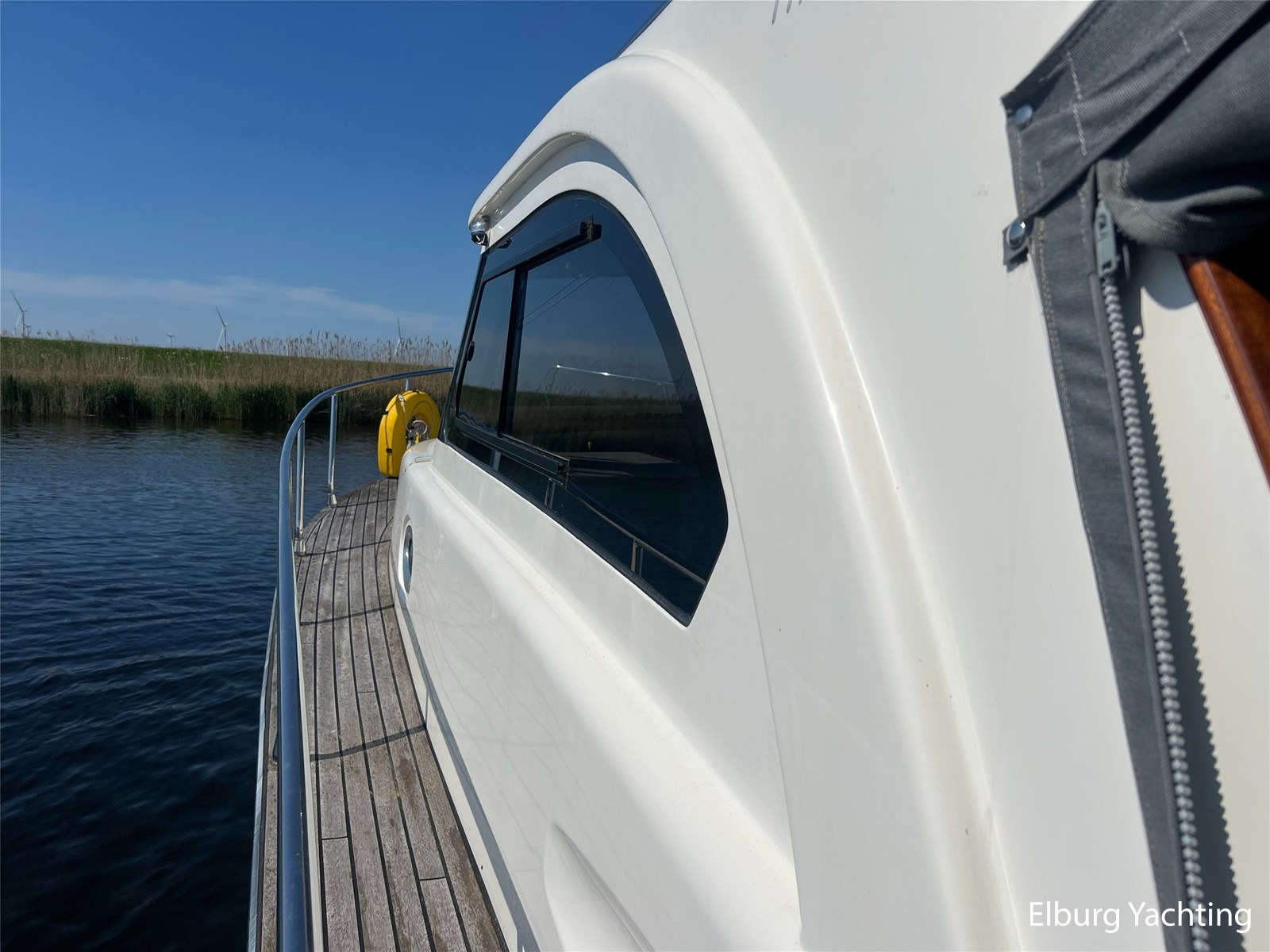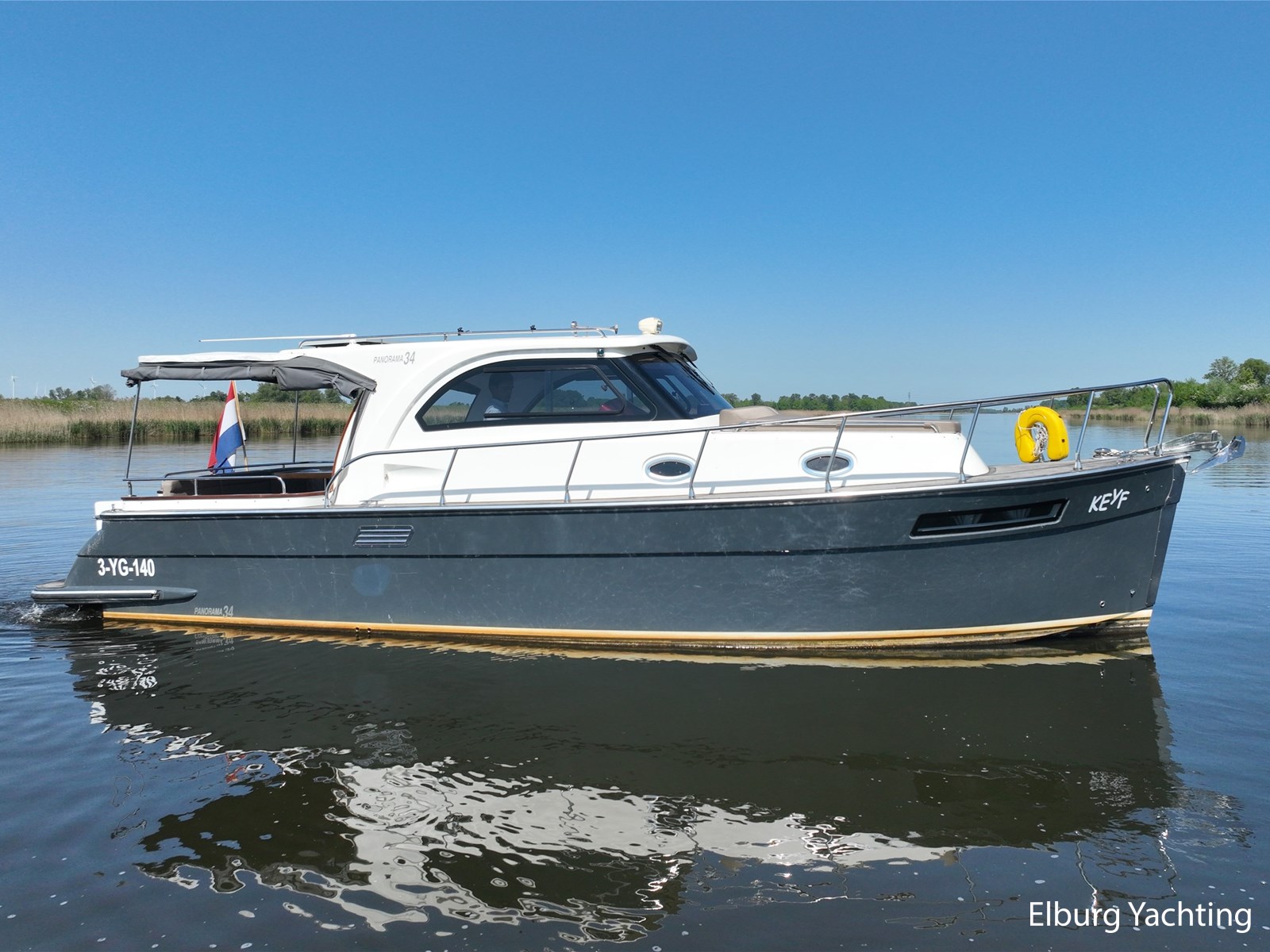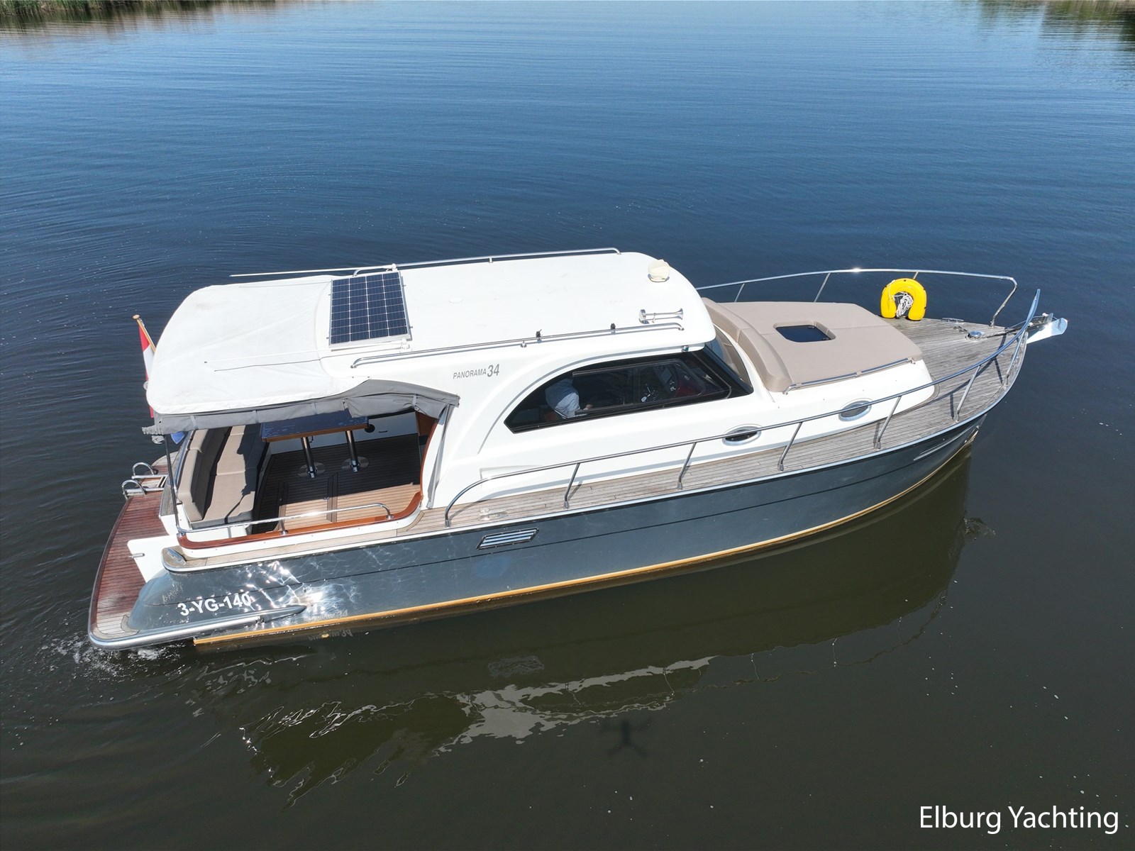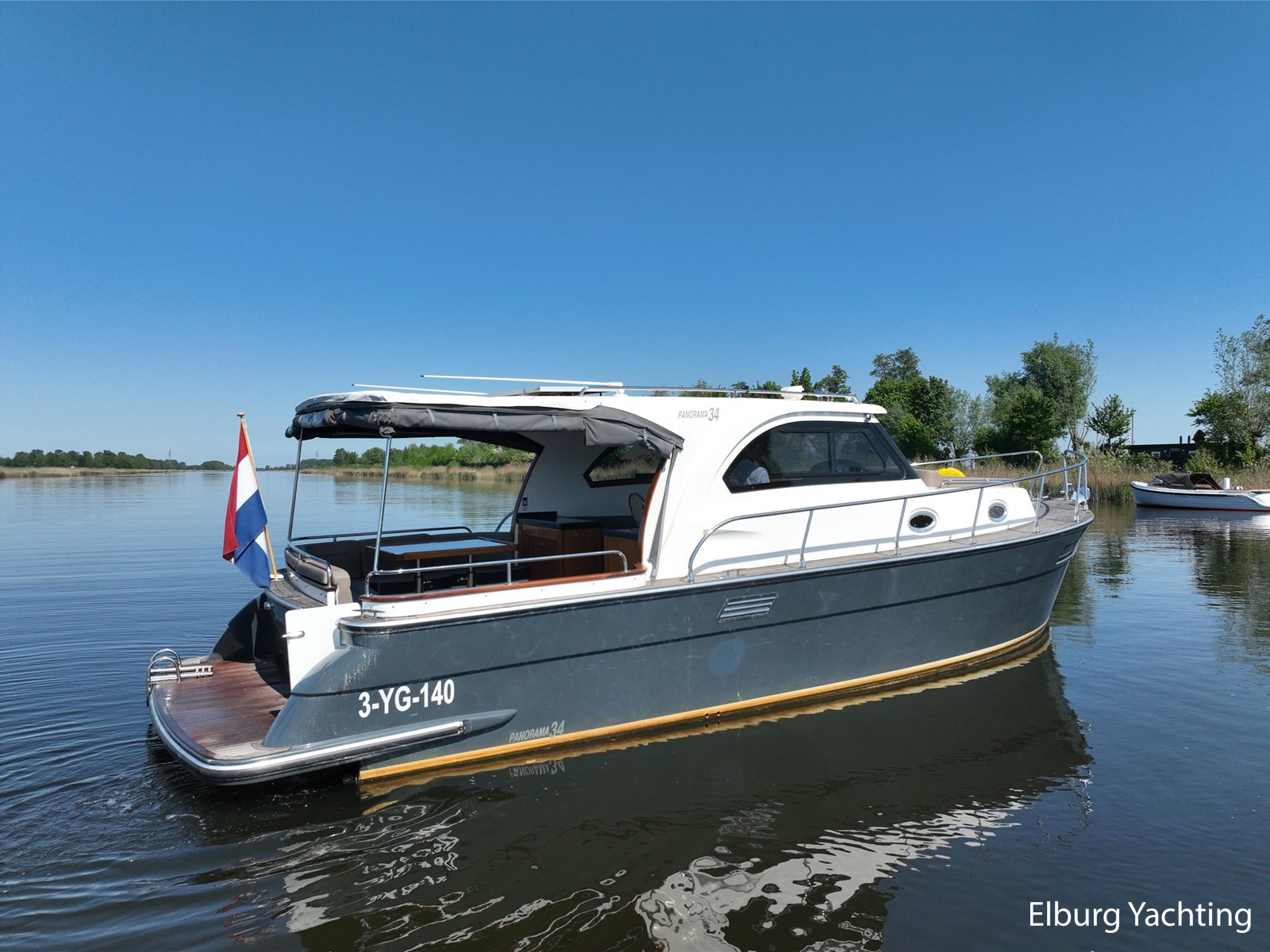 Deze mooie Panorama 34 is een heerlijk schip met een grote leefruimte buiten. De ruime zit op het achterdek is volledig overdekt, via een deur in de spiegel komt u direct op het zwemplatform welke zich op hetzelfde niveau bevindt. Op het voordek bevindt zich een zonnedek met gevormde kussens. Verder wordt dit schip geleverd met o.a: ruime open kuip met stuurstand/keuken/zithoek/zwemplatform op hetzelfde niveau, 2 x schuifraam in opbouw, complete wintertent om het gehele schip af te dekken, luxe bekleding, wegneembare meevaarstoel, kookeiland, volledig afsluitbare kuip door middel van een tent rondom het achterdek, Webasto kachel om kuip te verwarmen, luxe matrassen, r.v.s. ankerketting, elektrisch anker, zonnepaneel, r.v.s. zwemtrap, r.v.s. opklapbare kikkers, gemakkelijke opstap vanuit de kuip naar het stuurboord gangboord, r.v.s. zeereling.