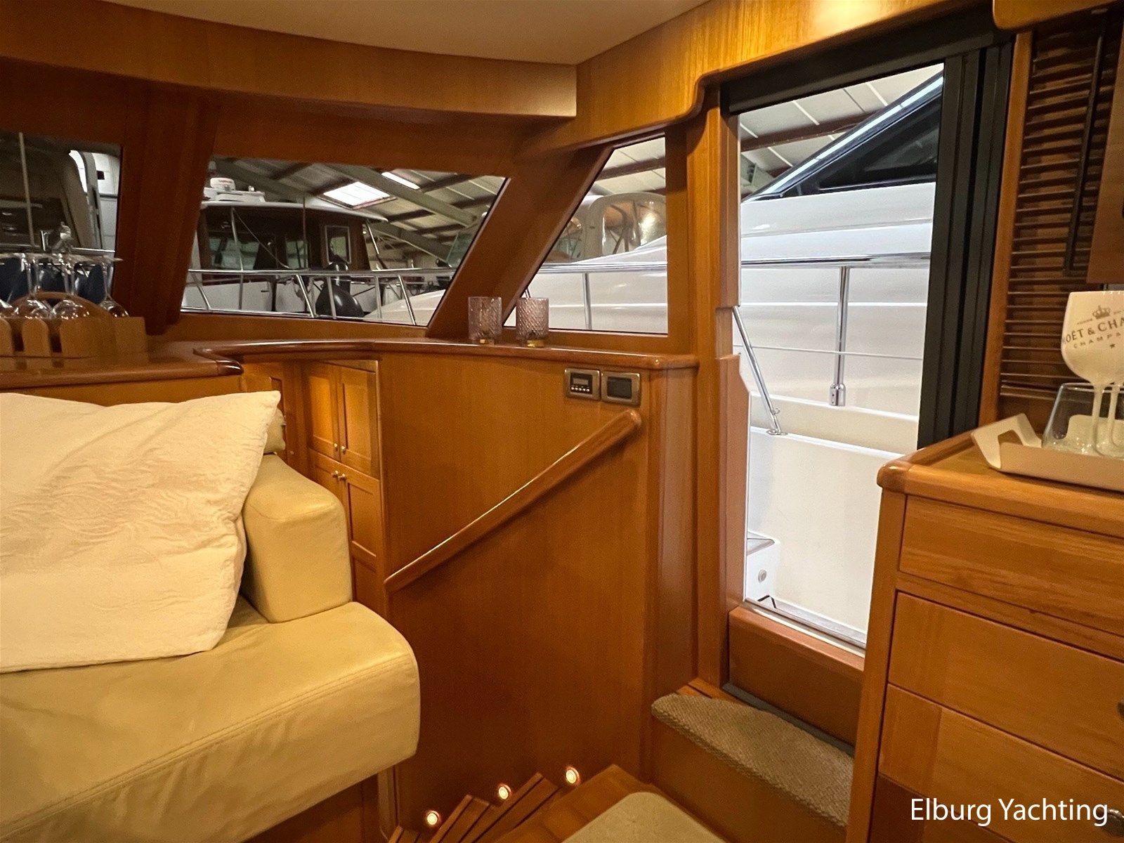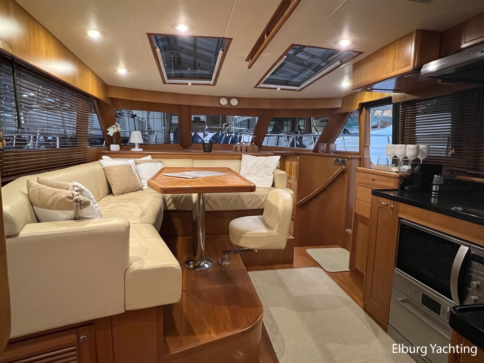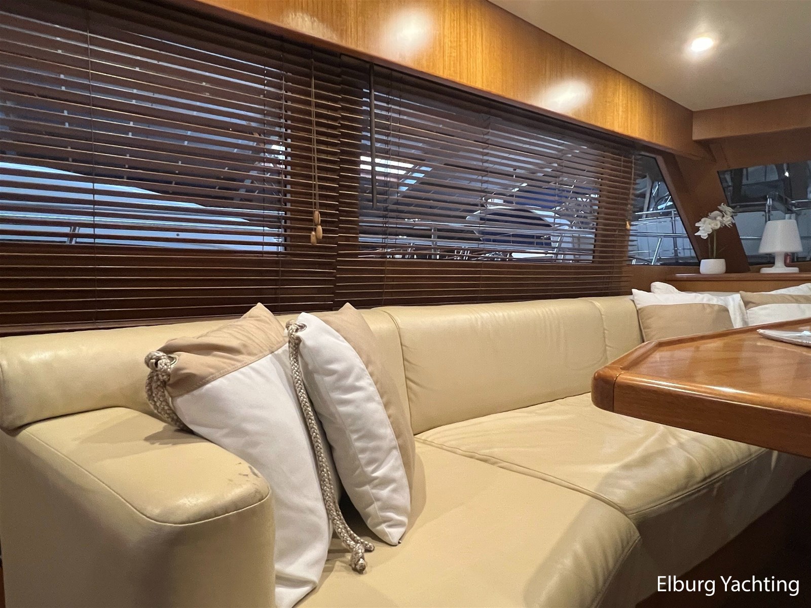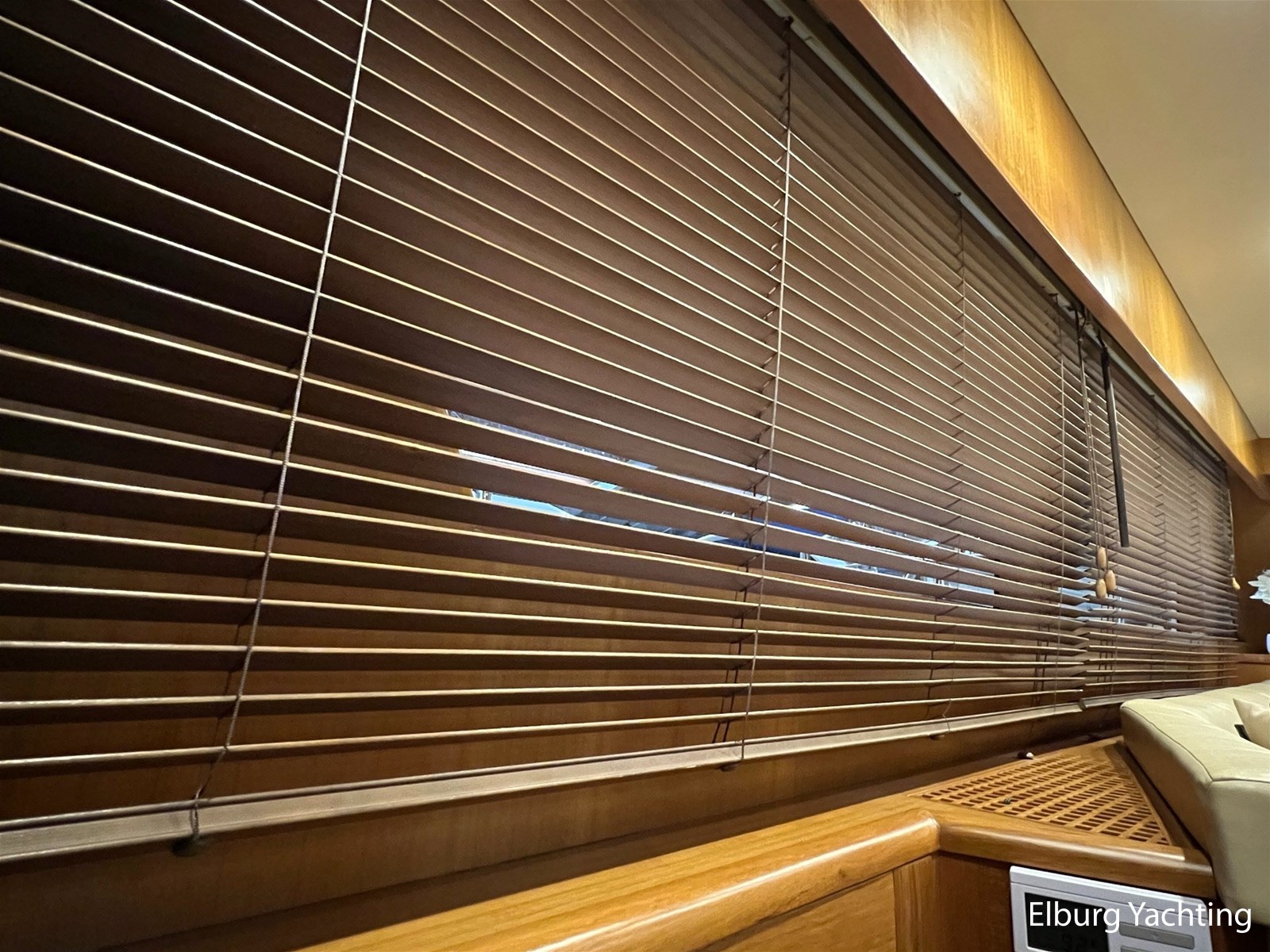 Licht teakhout scheepsinterieur + crème lederen bekleding