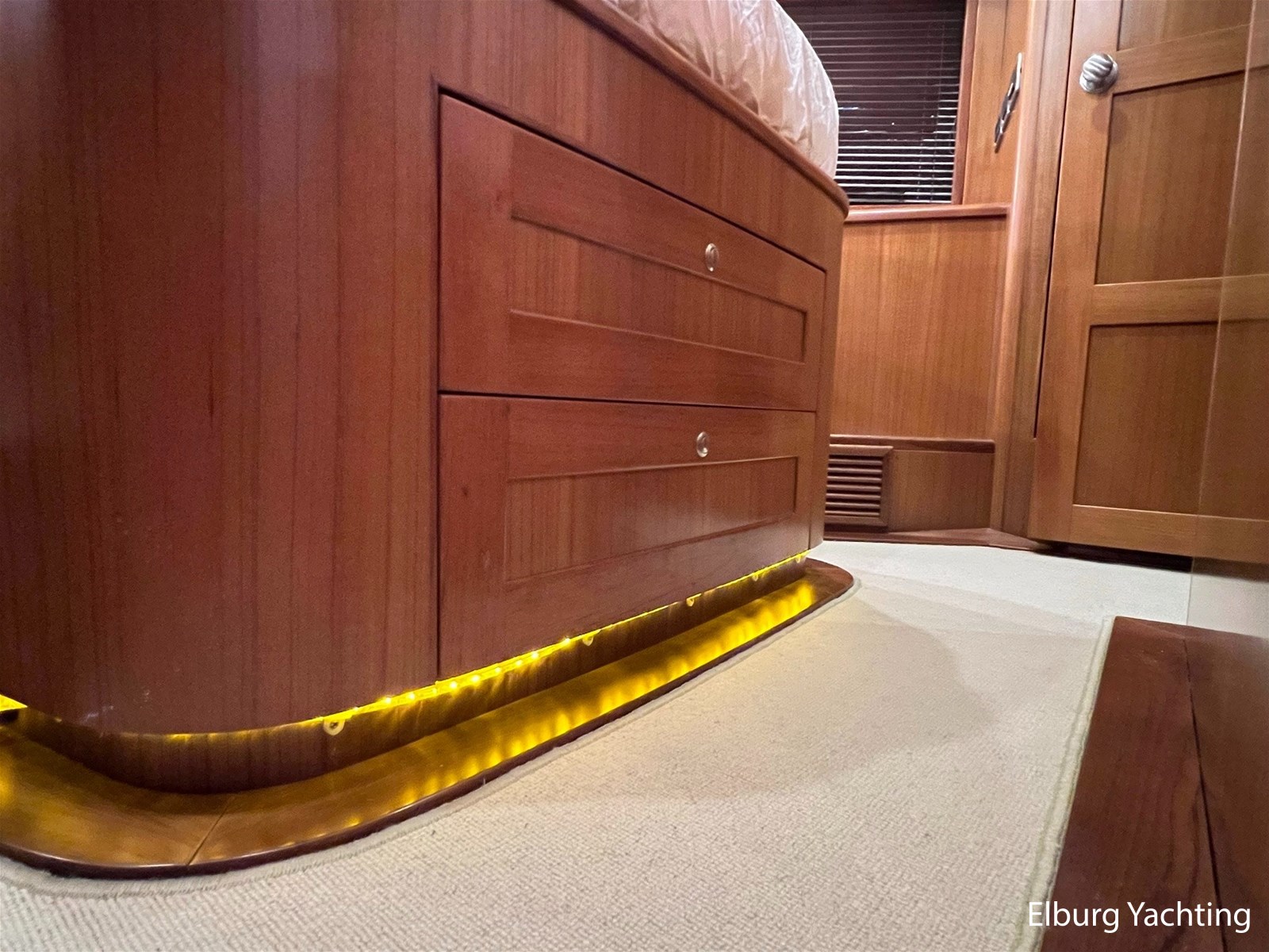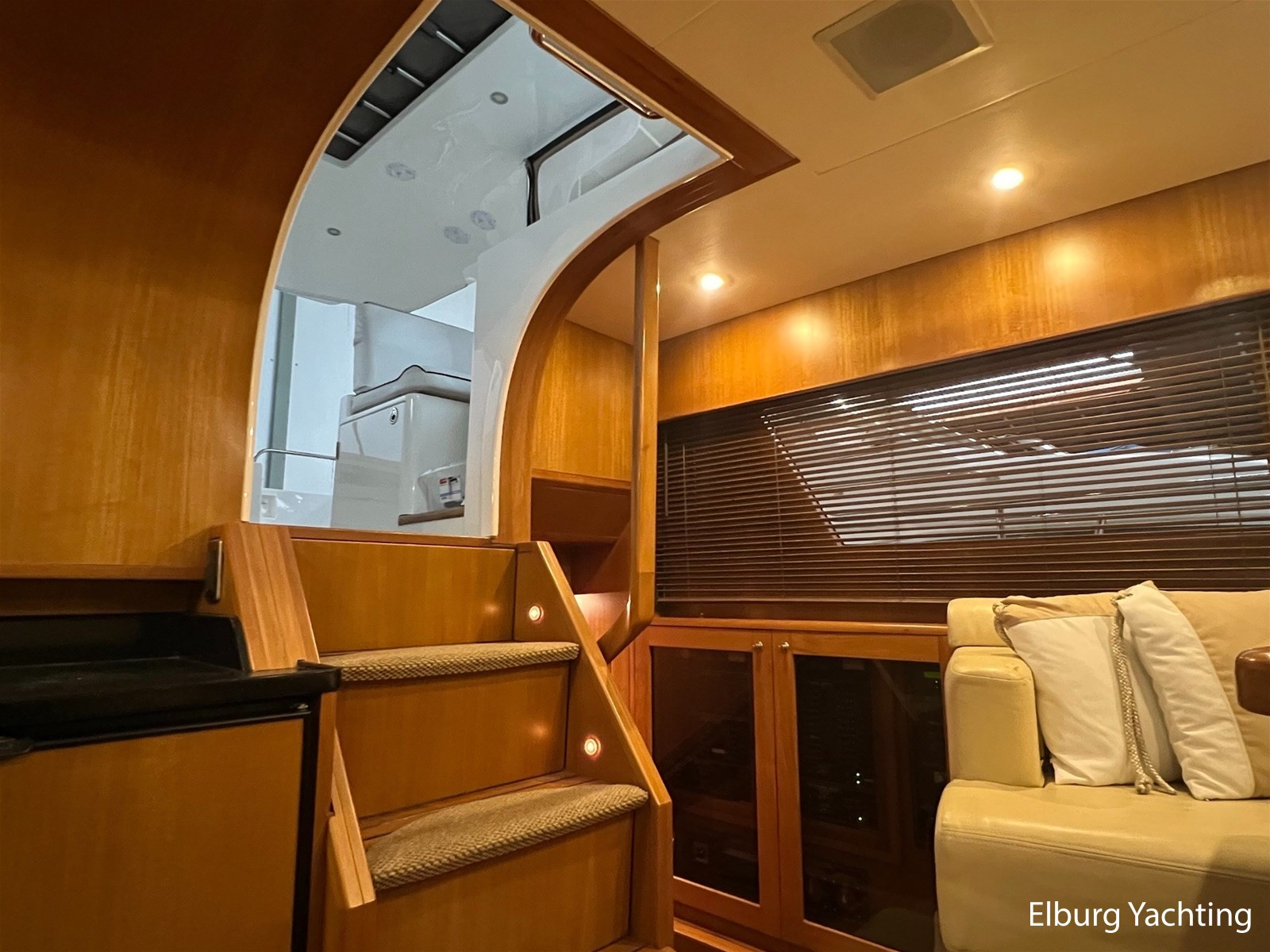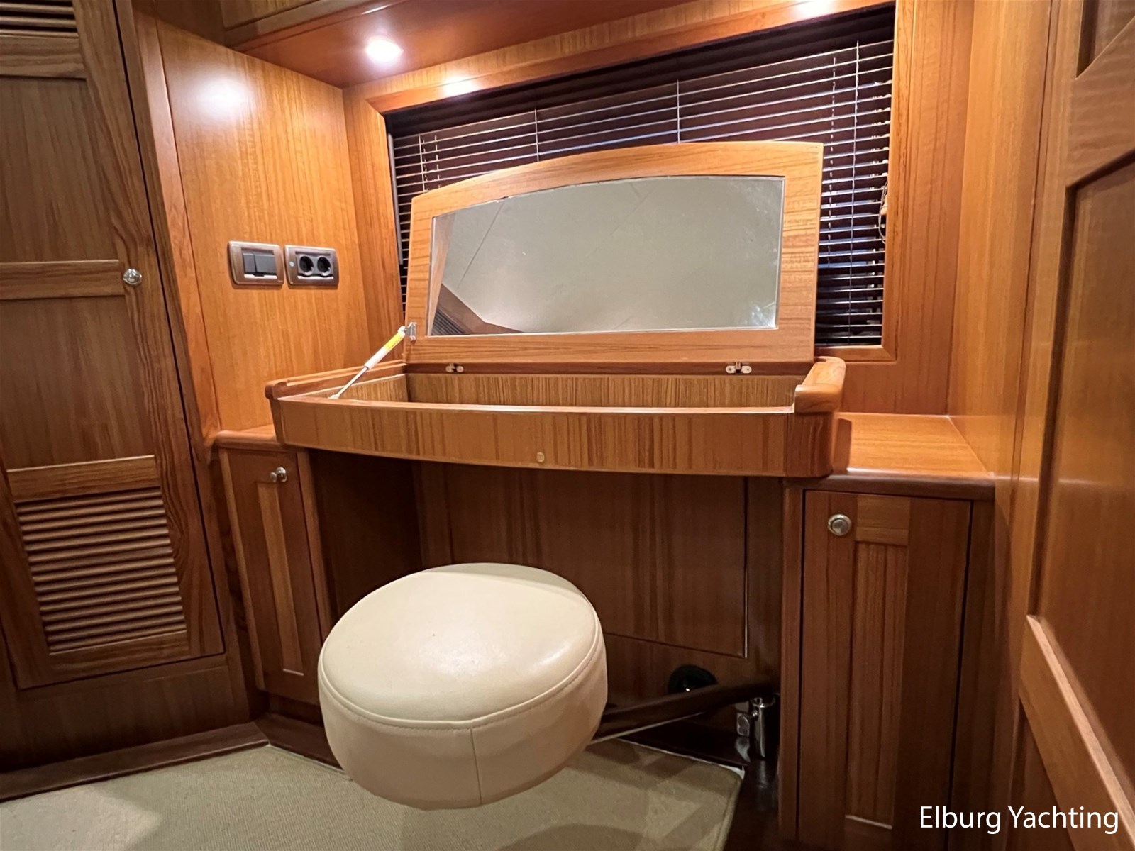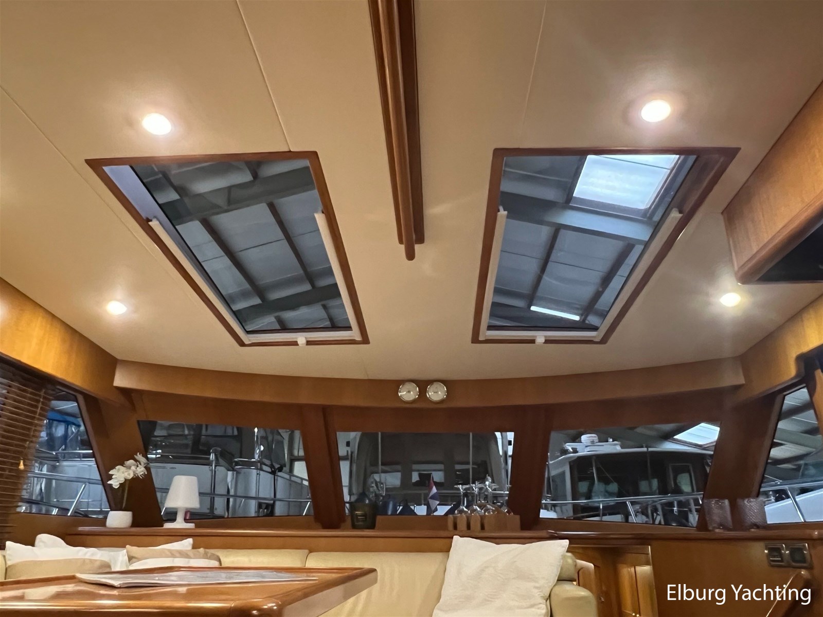 Licht teakhout scheepsinterieur + crème lederen bekleding