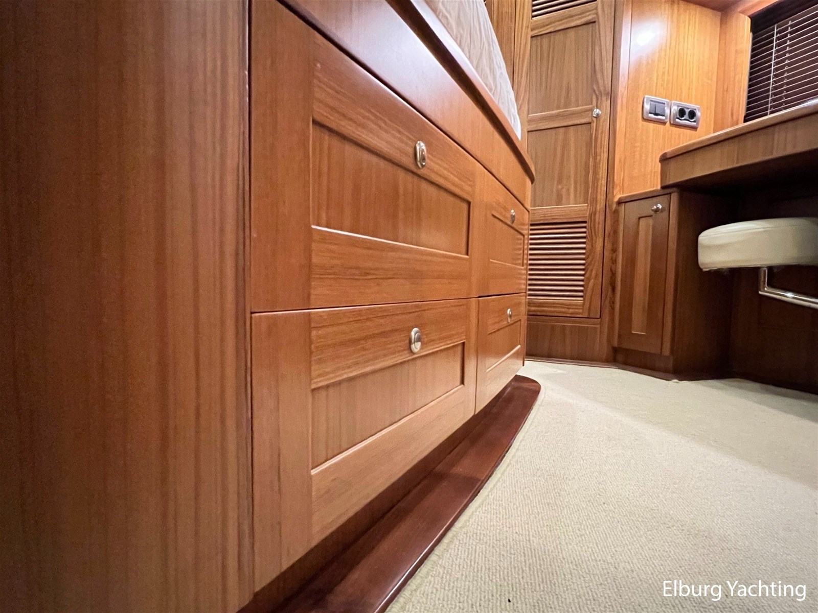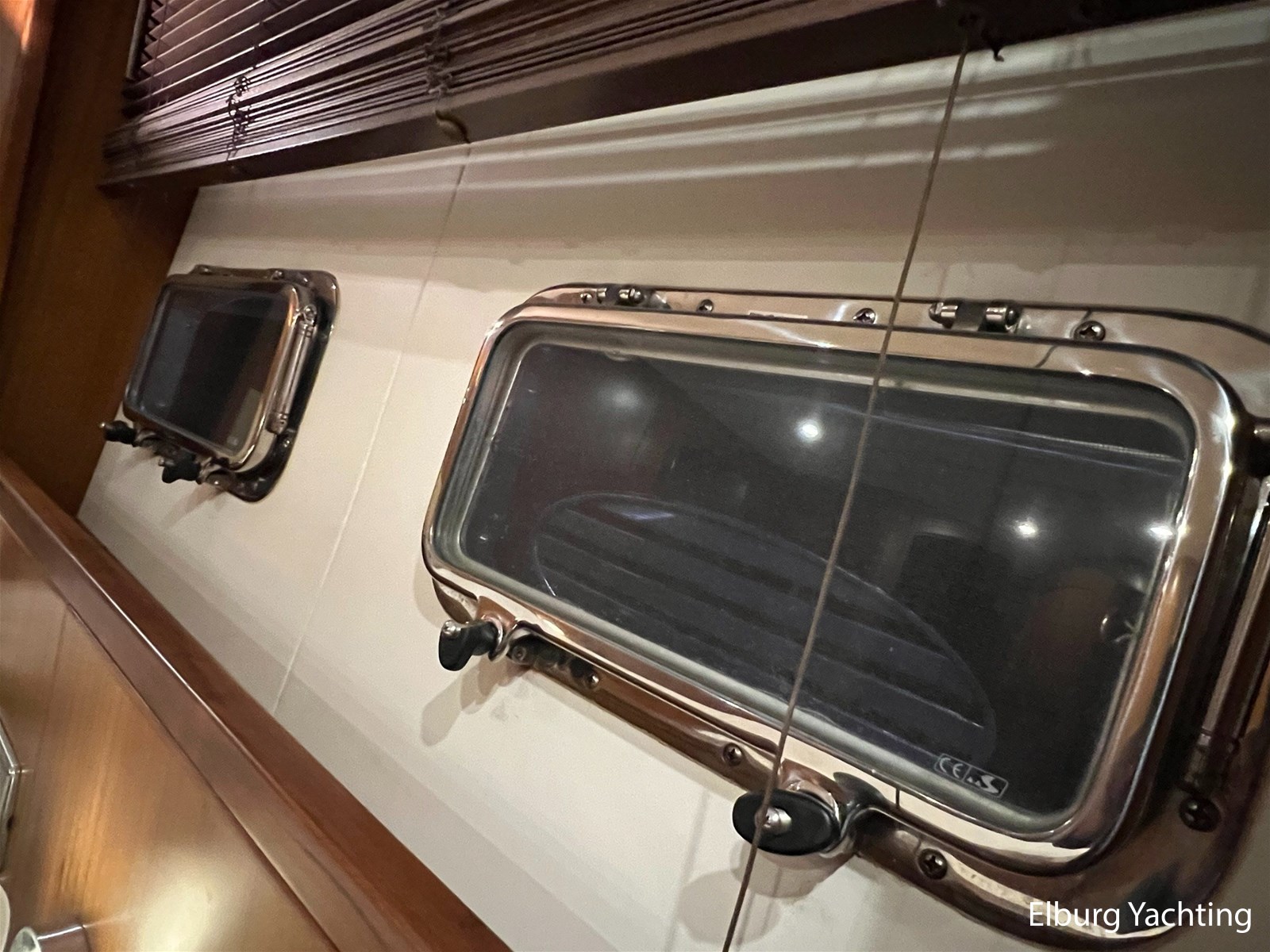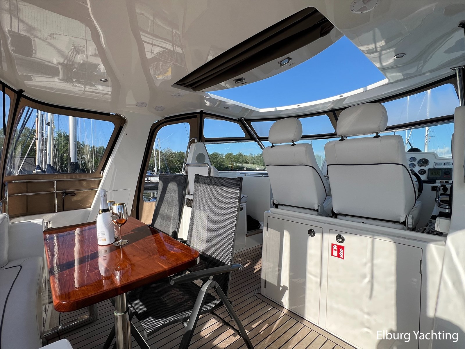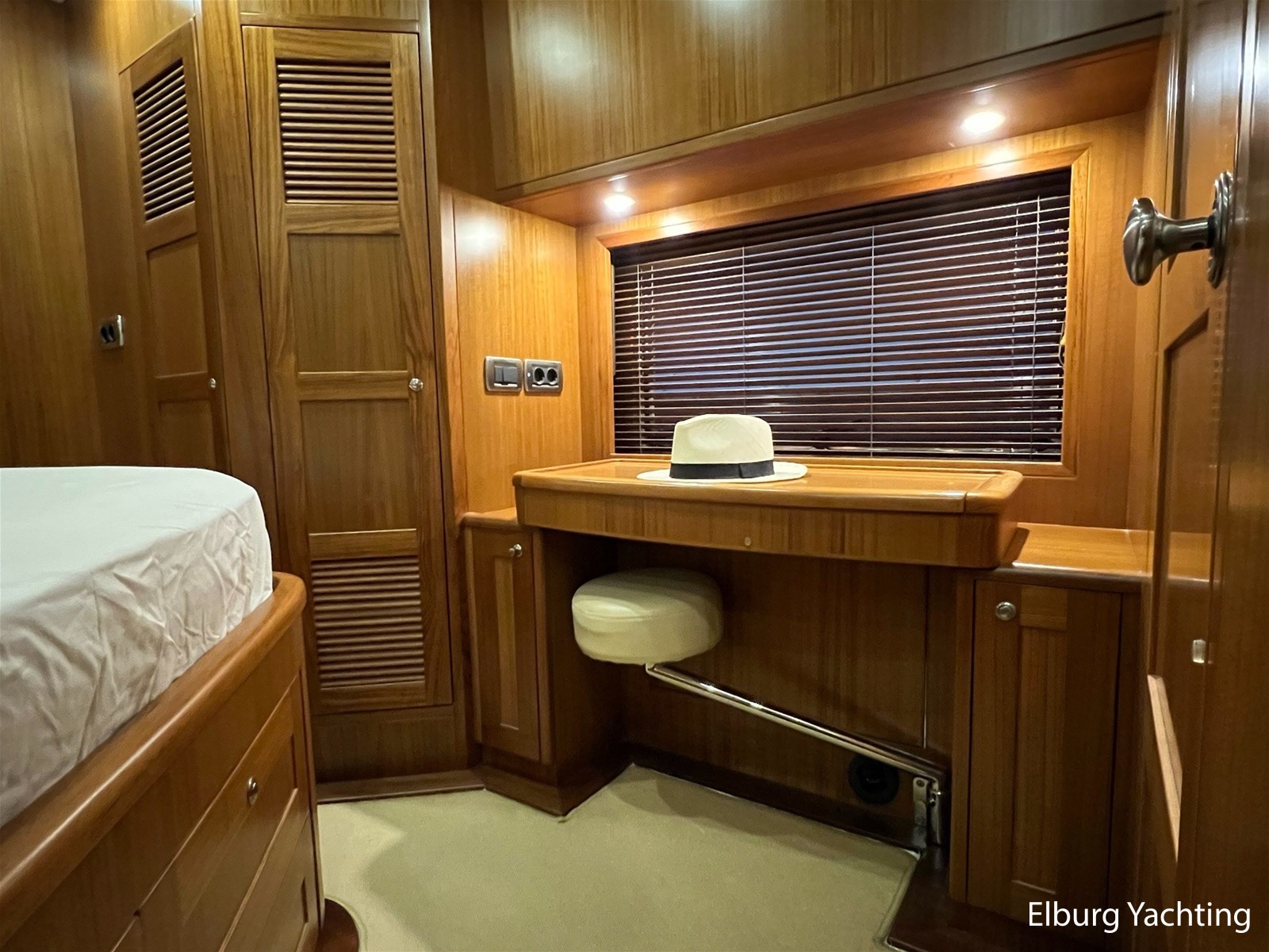 Licht teakhout scheepsinterieur + crème lederen bekleding