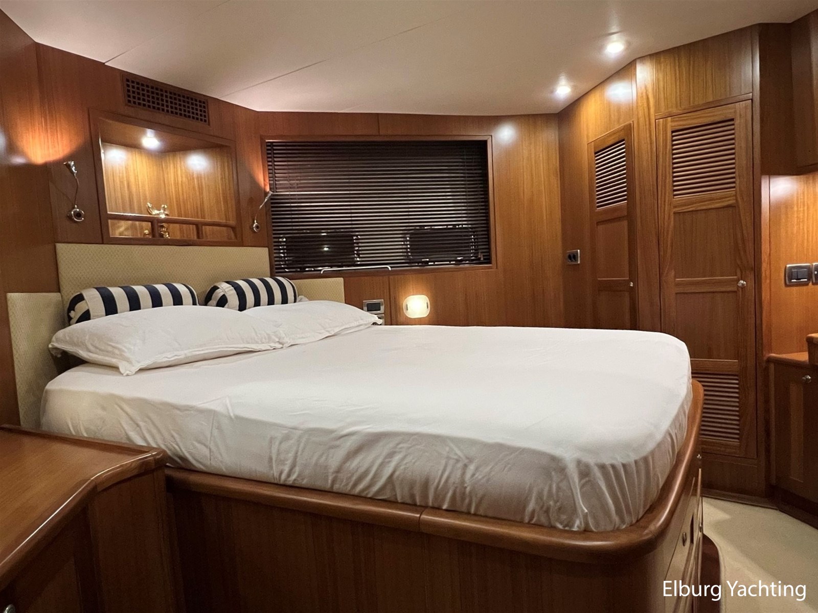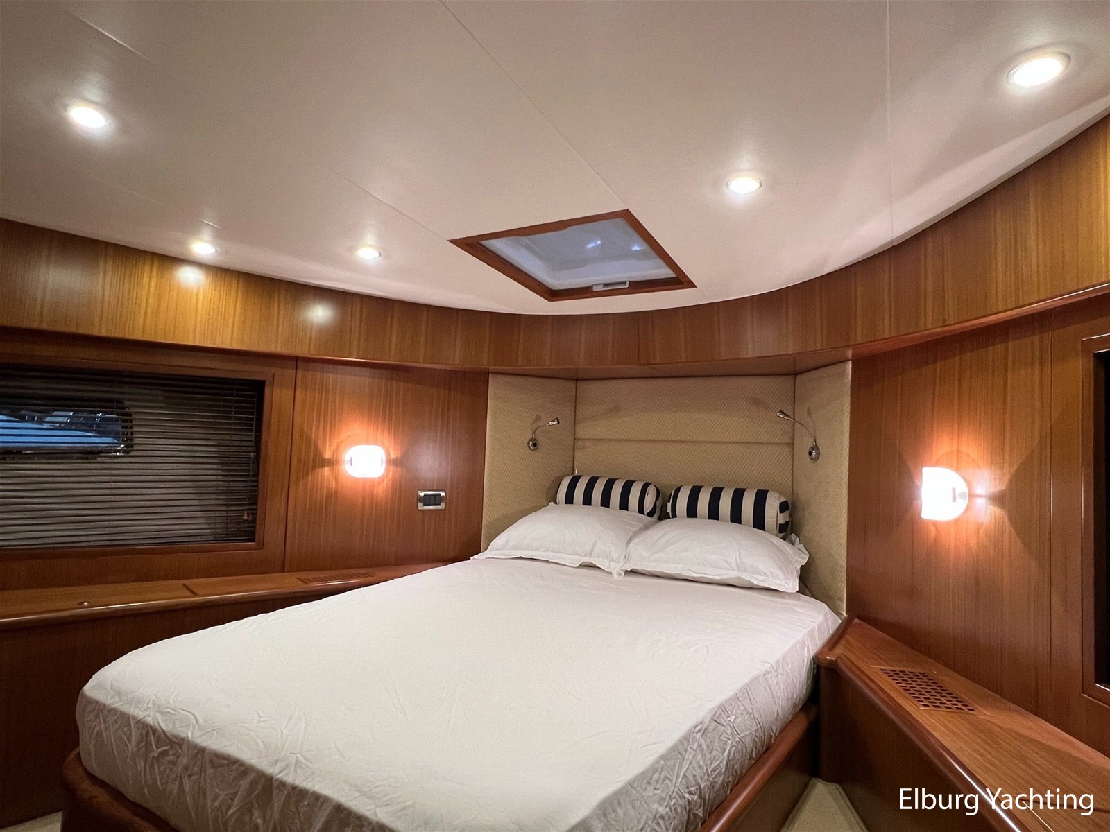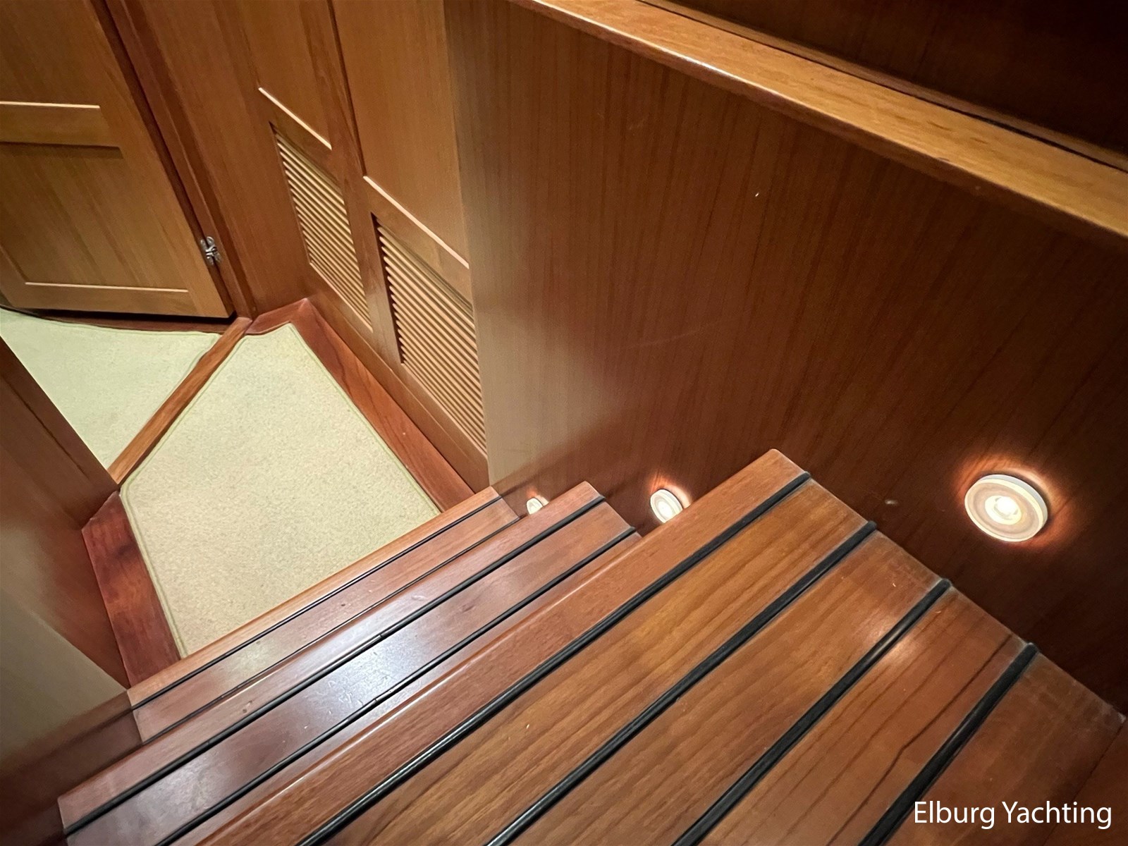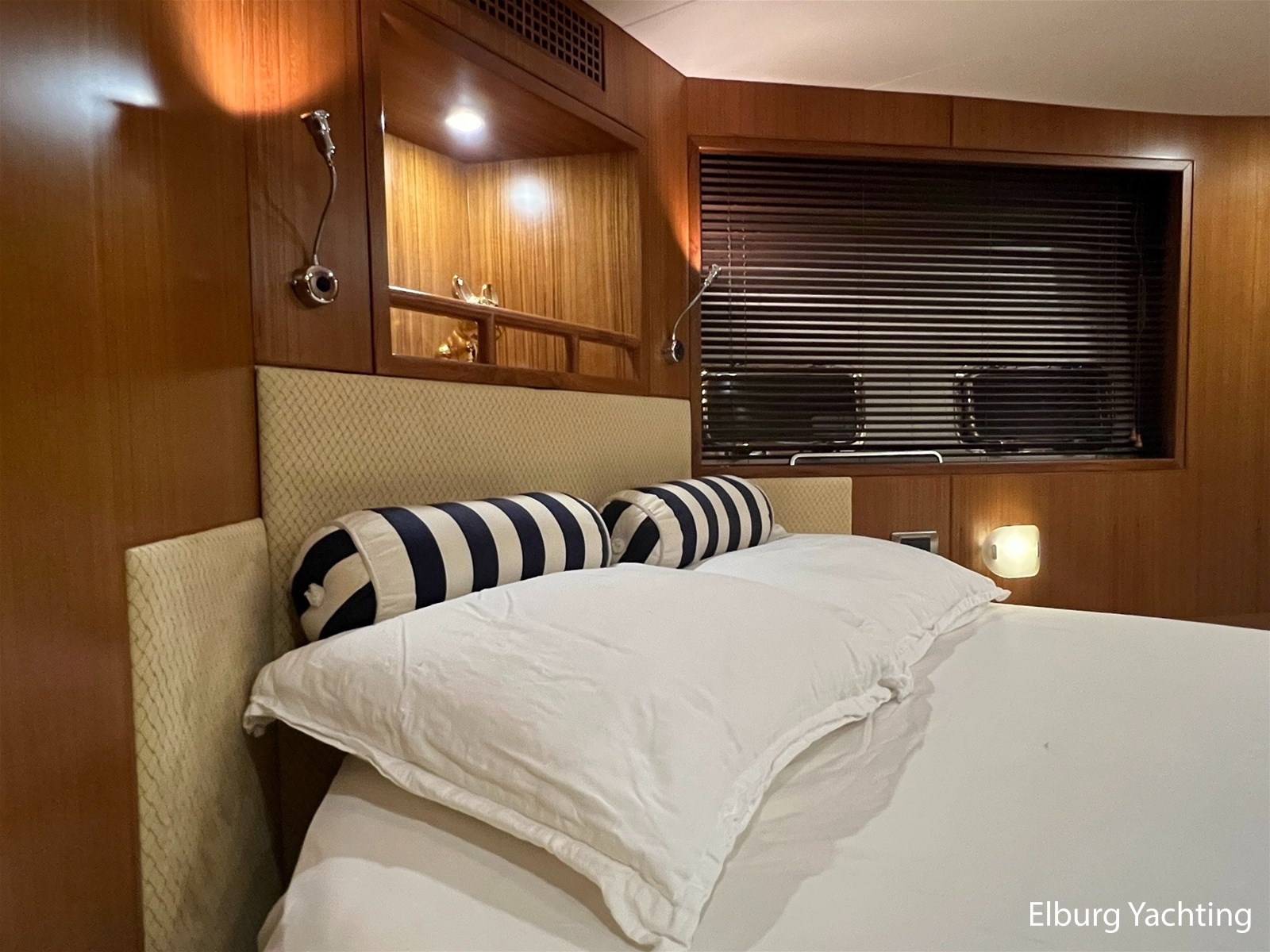 Licht teakhout scheepsinterieur + crème lederen bekleding