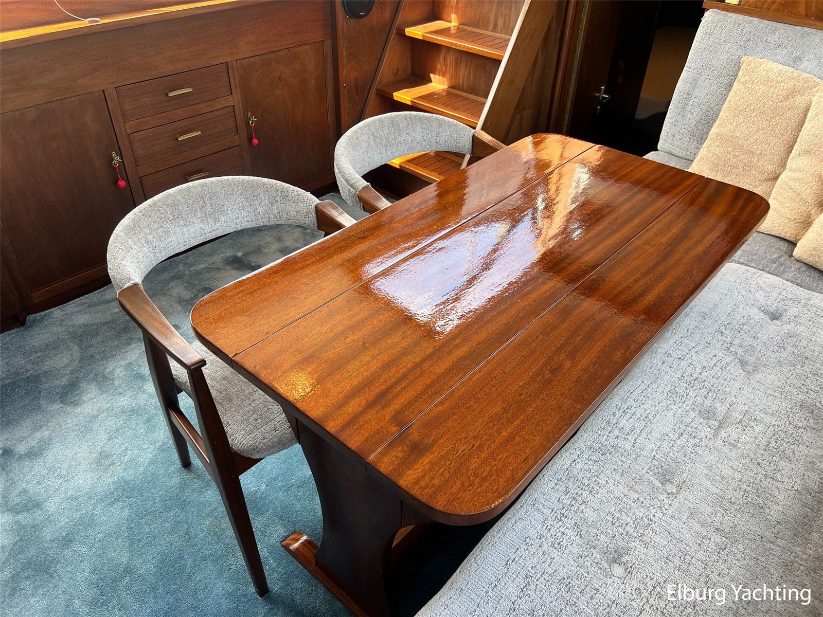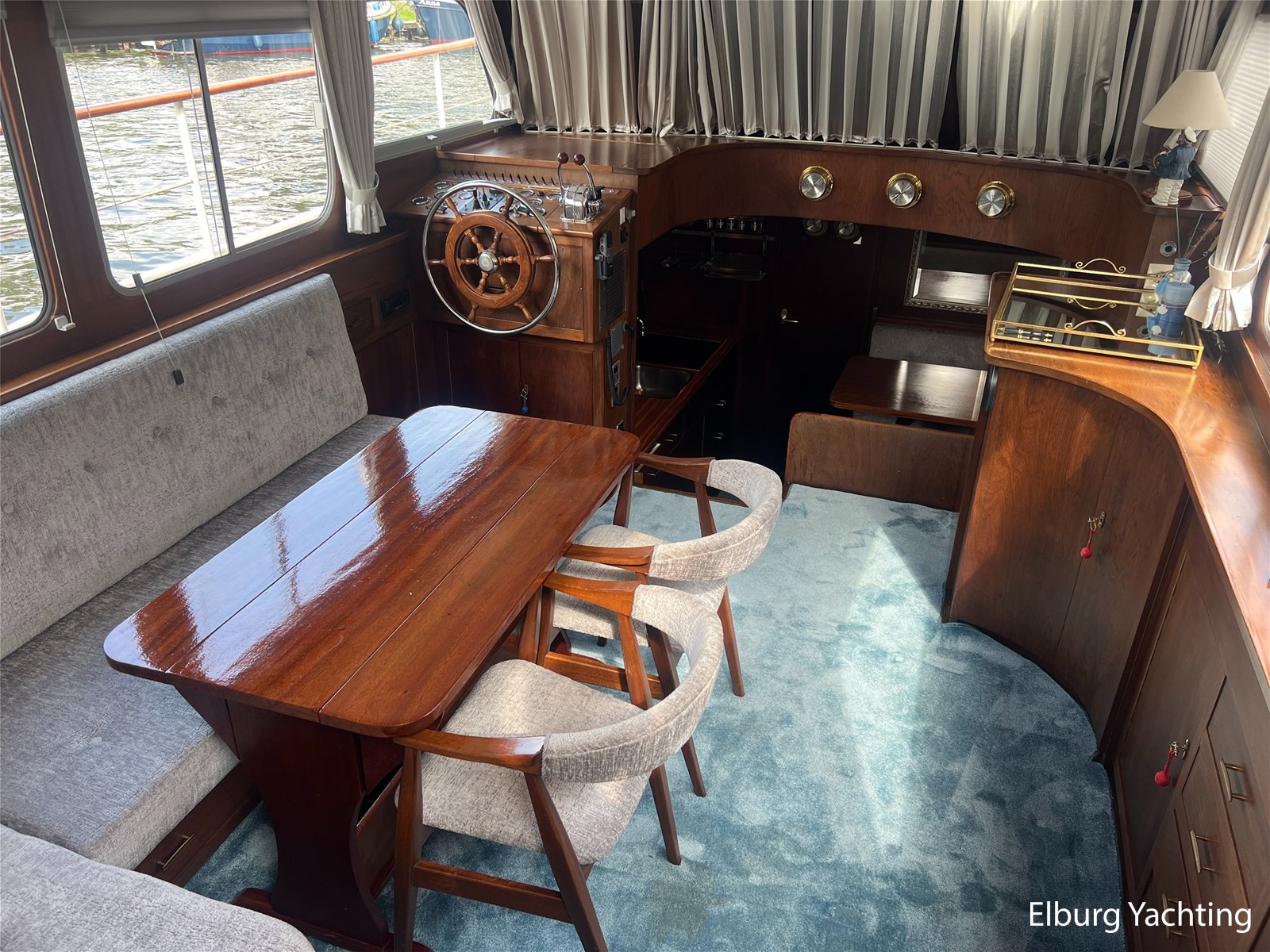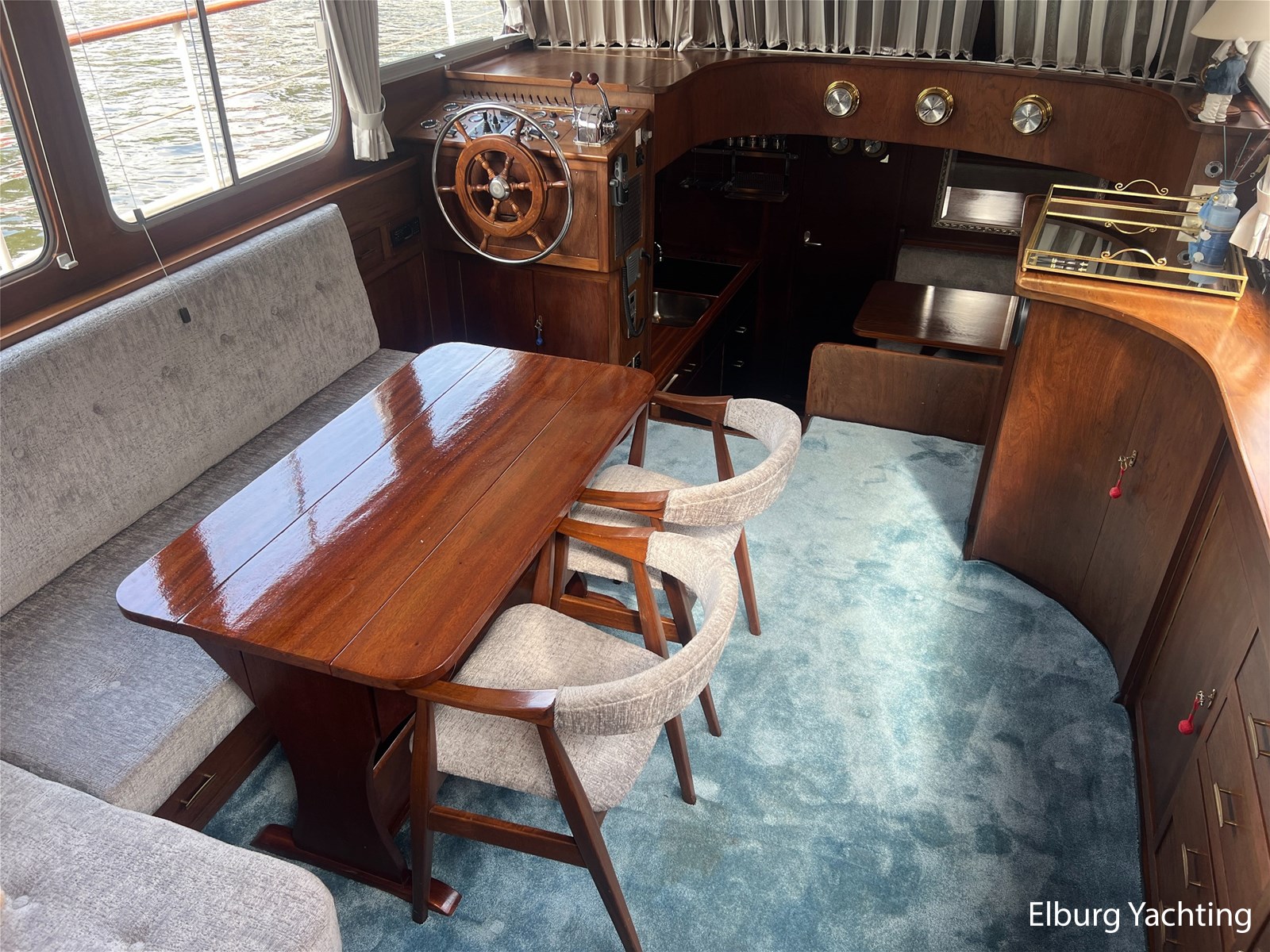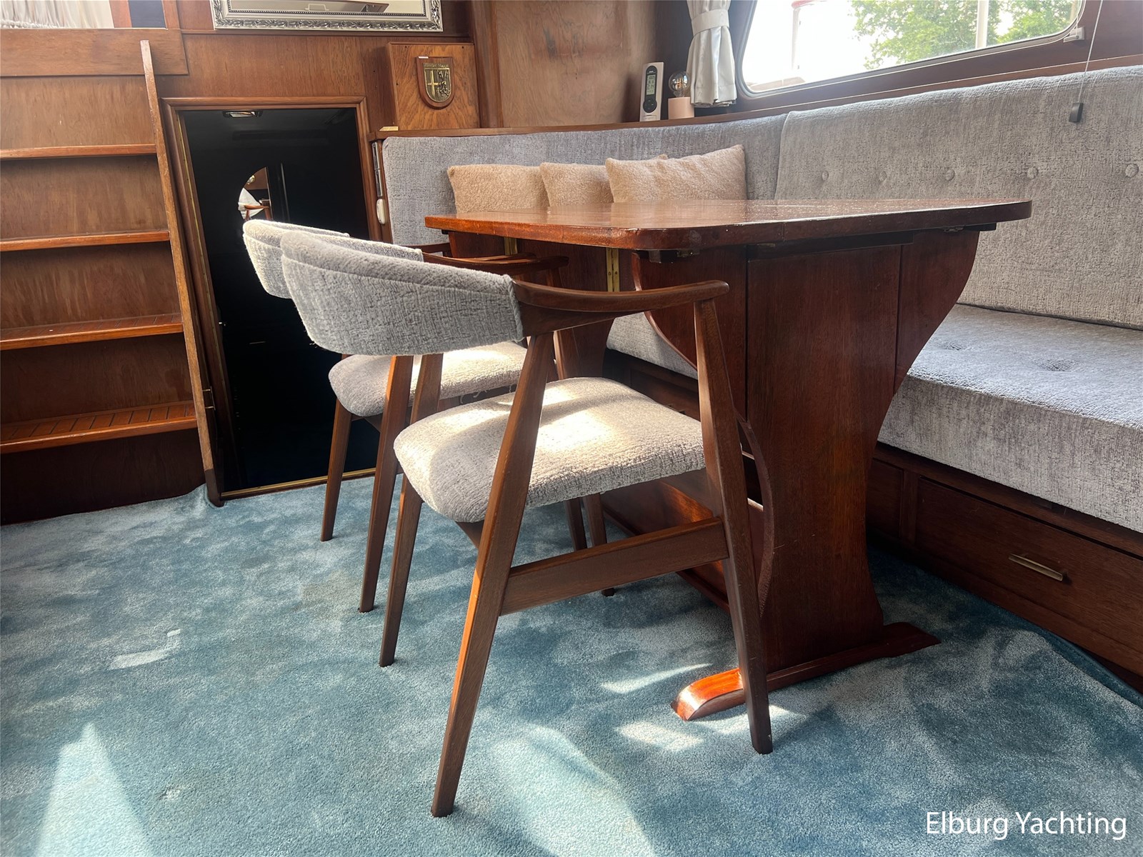 - Teak interieur met tapijt door het gehele schip