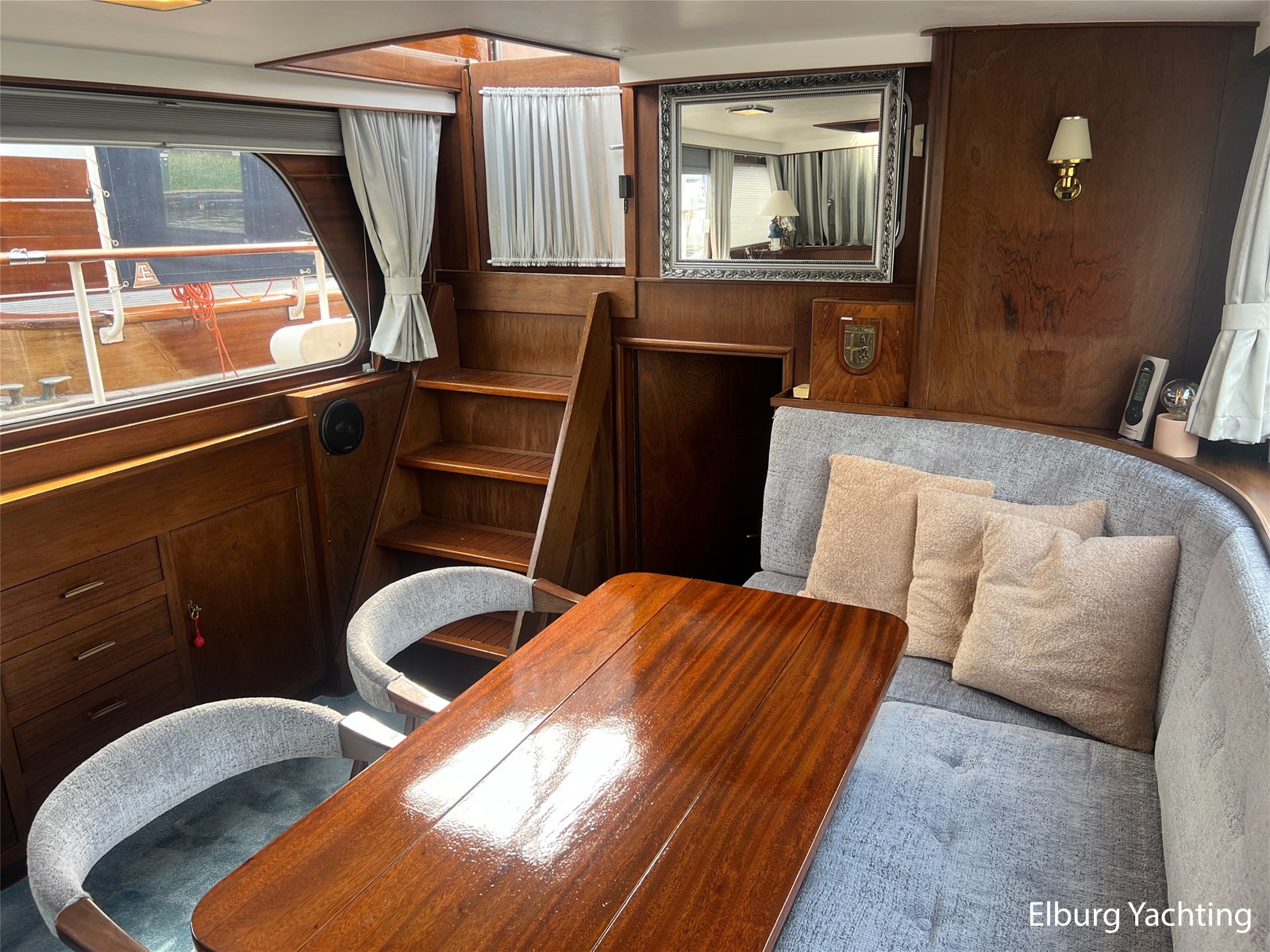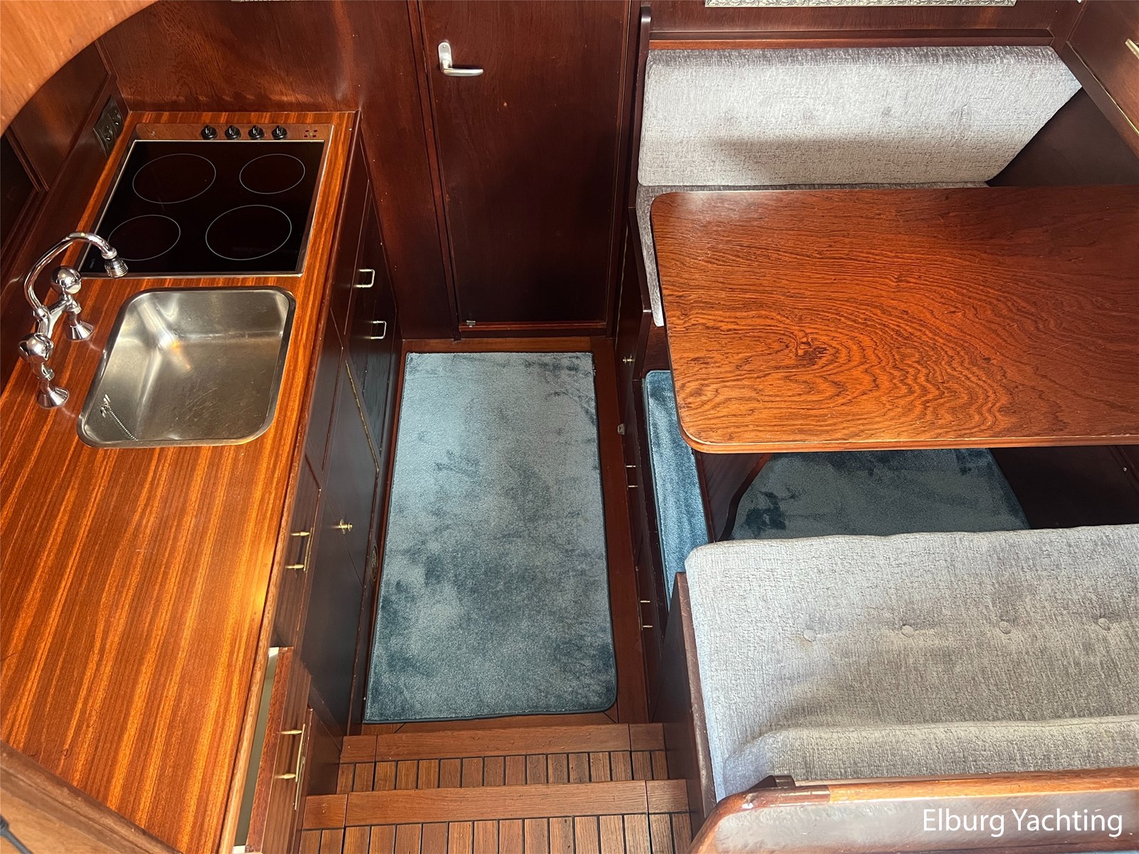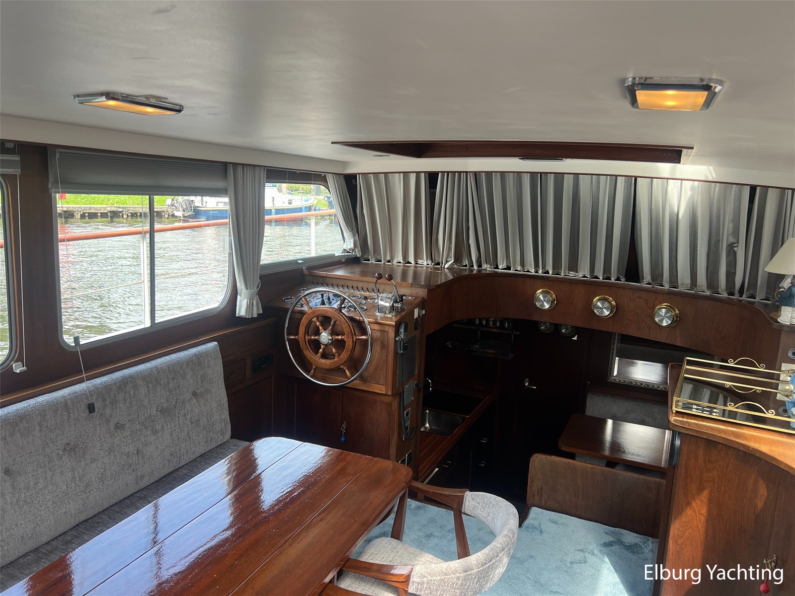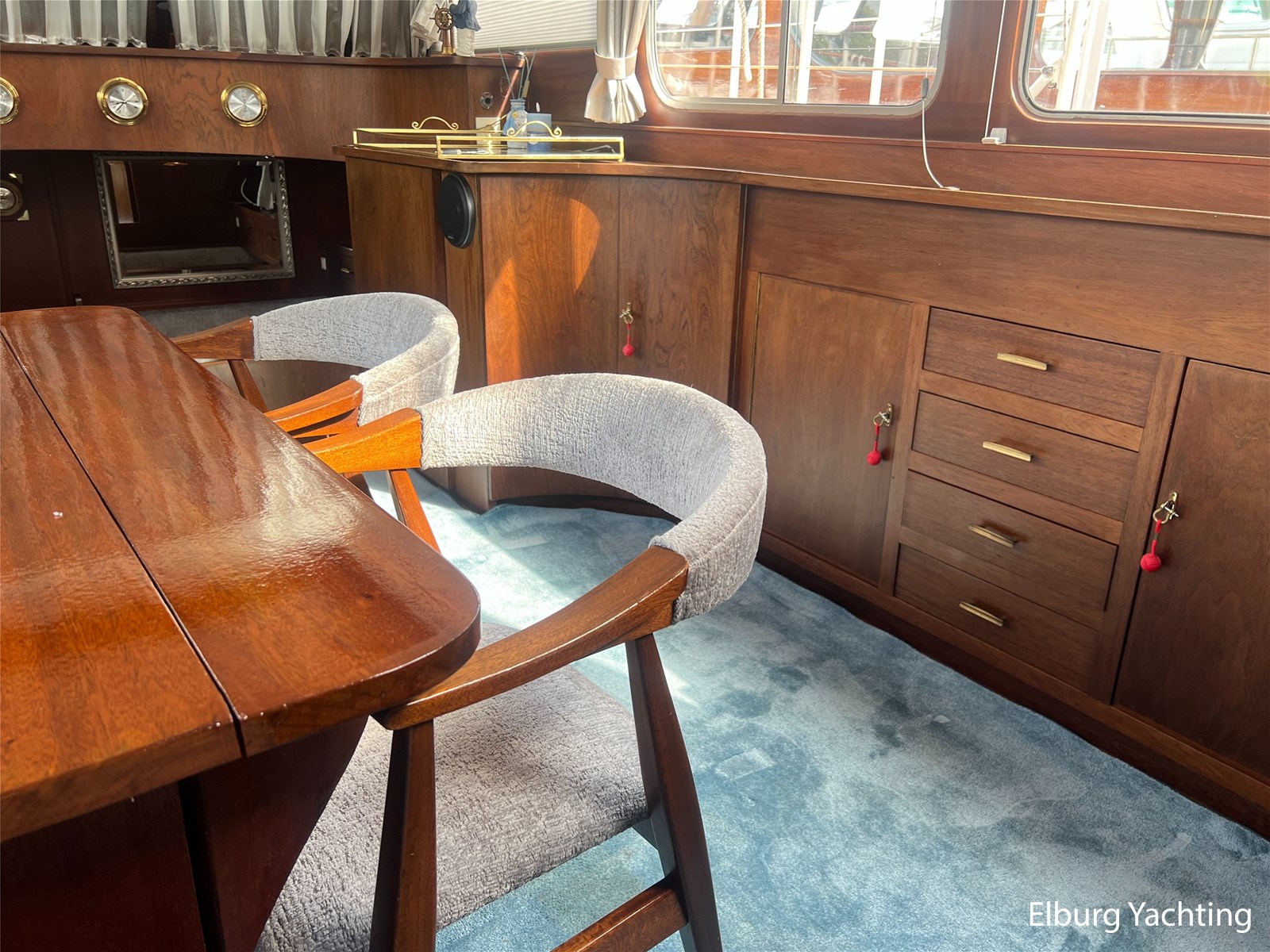 - Teak interieur met tapijt door het gehele schip