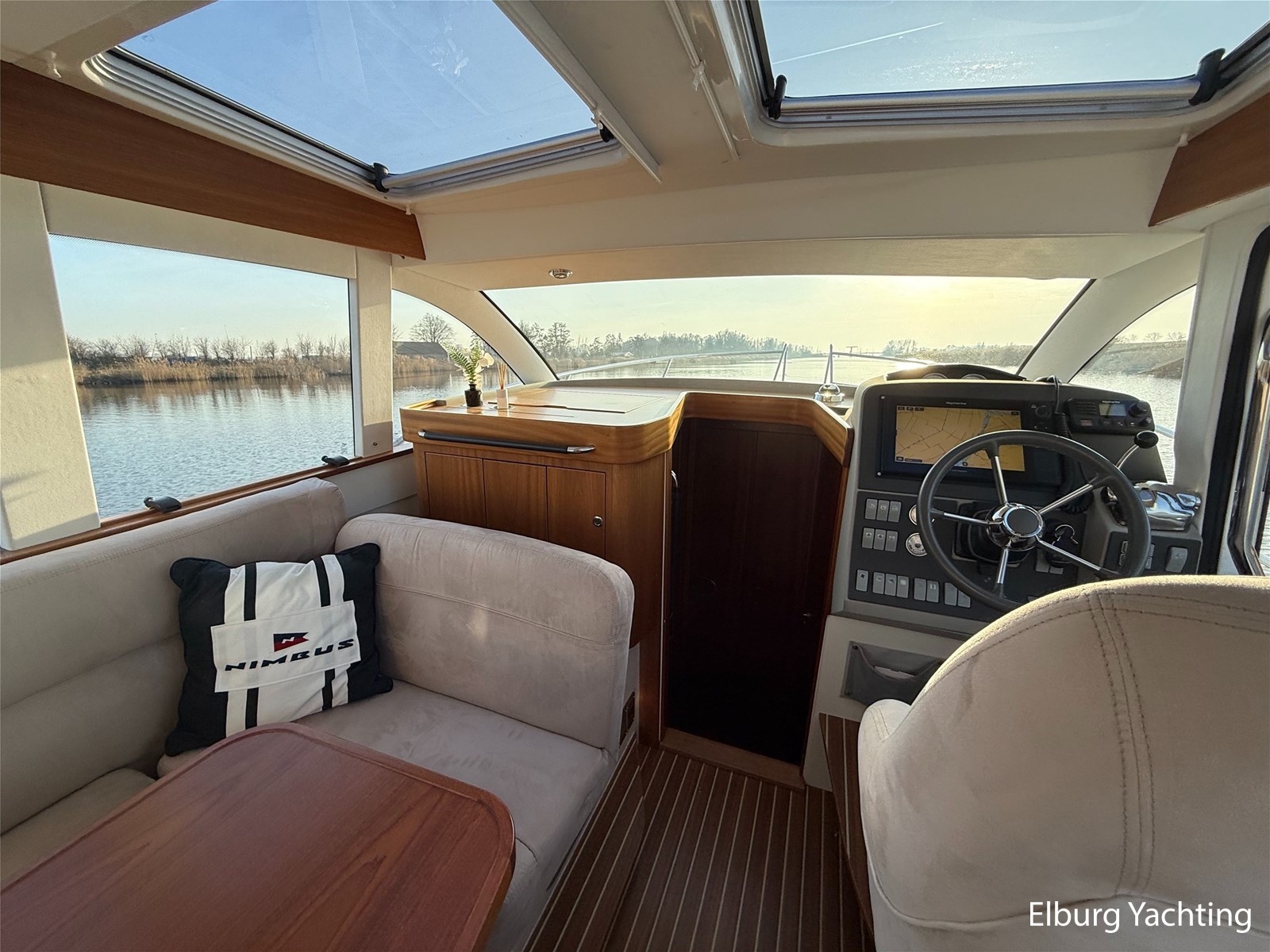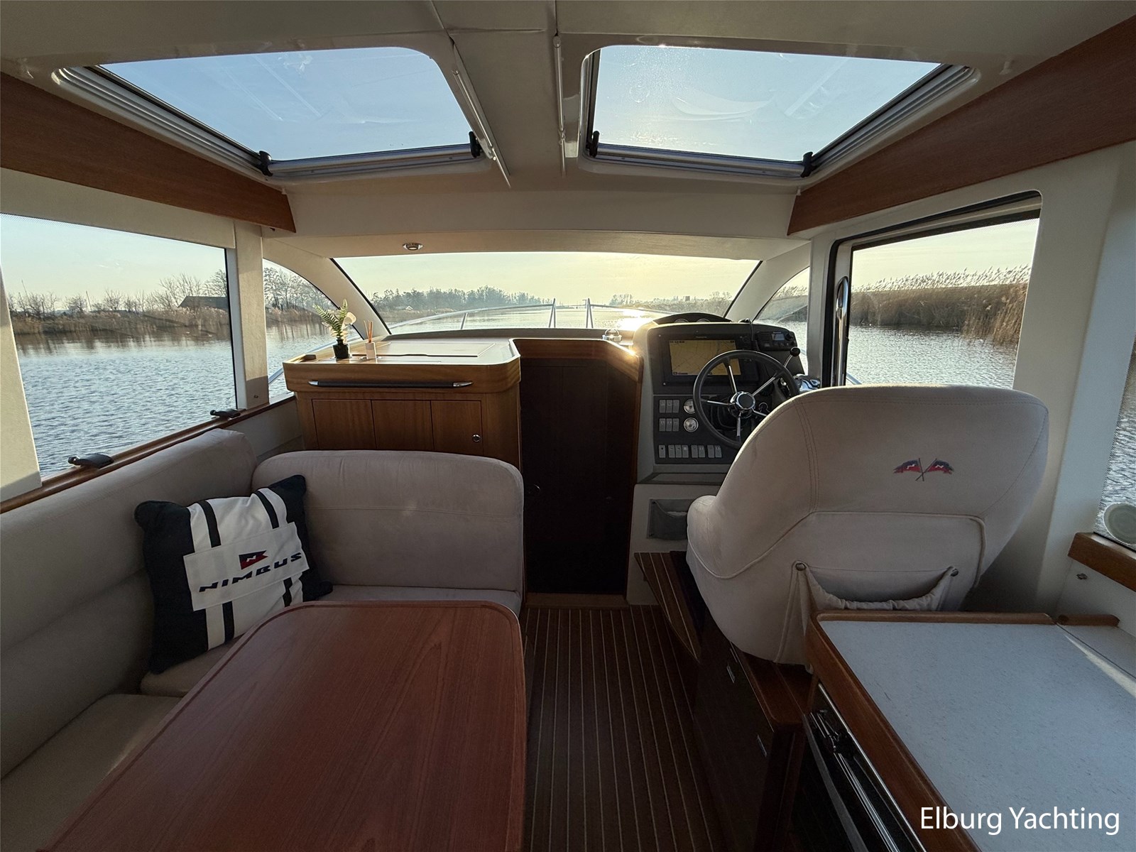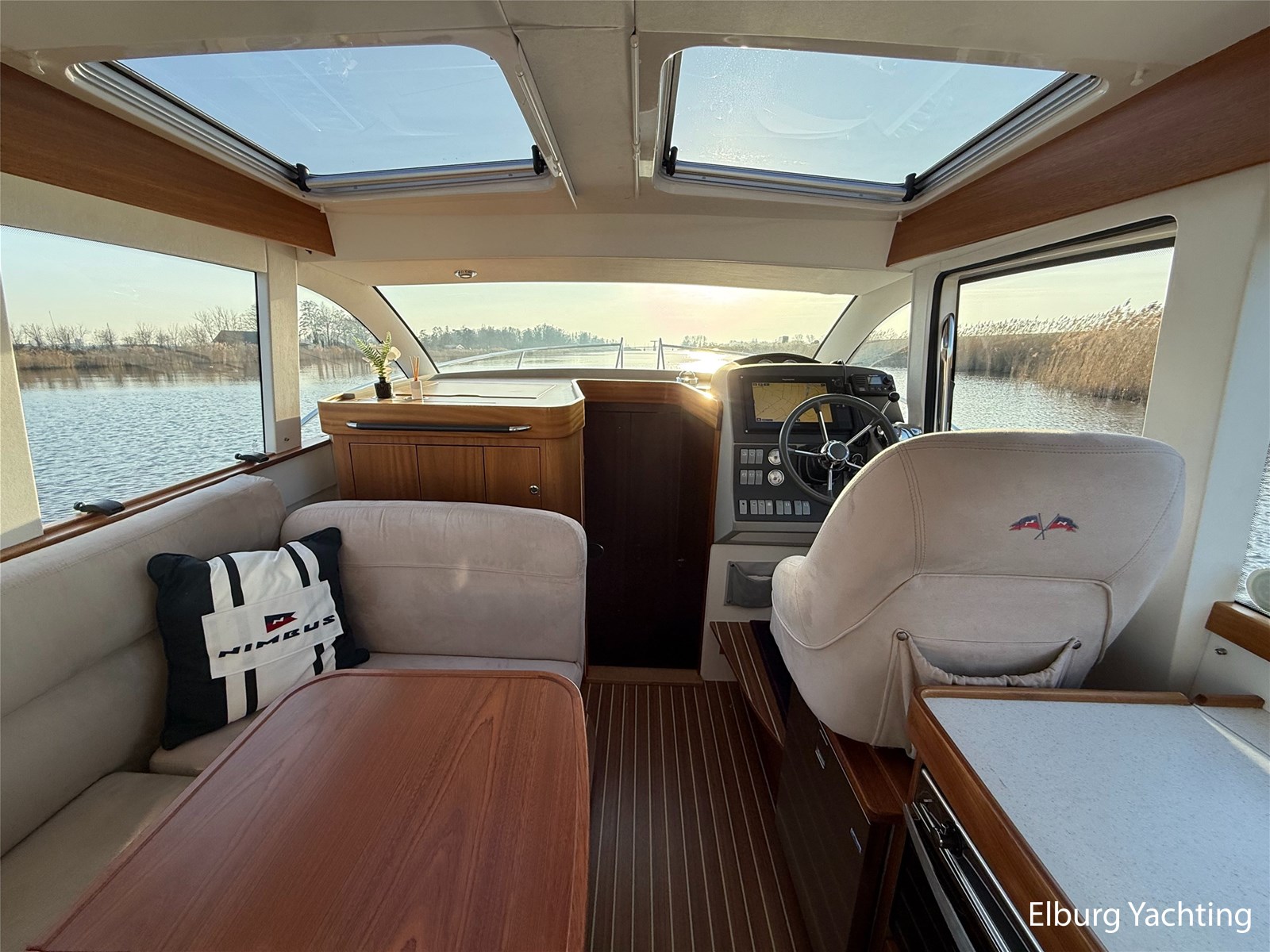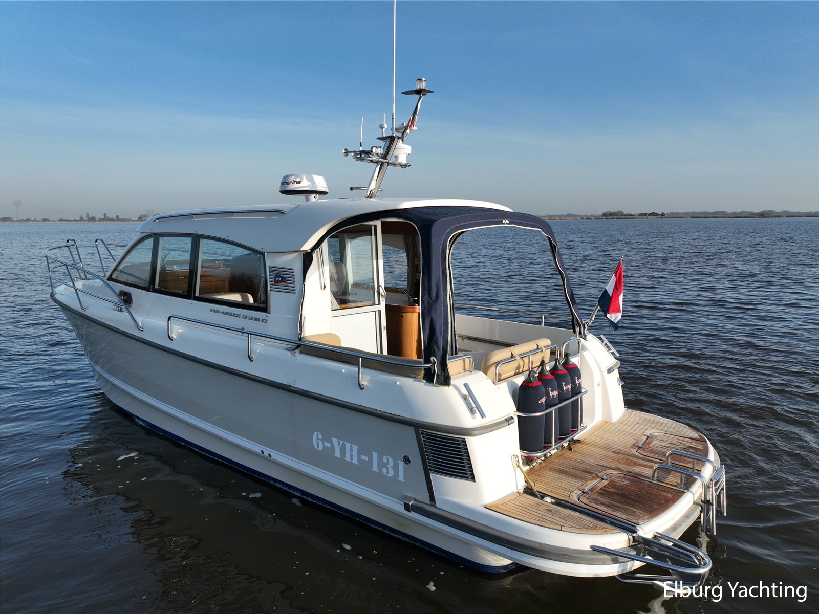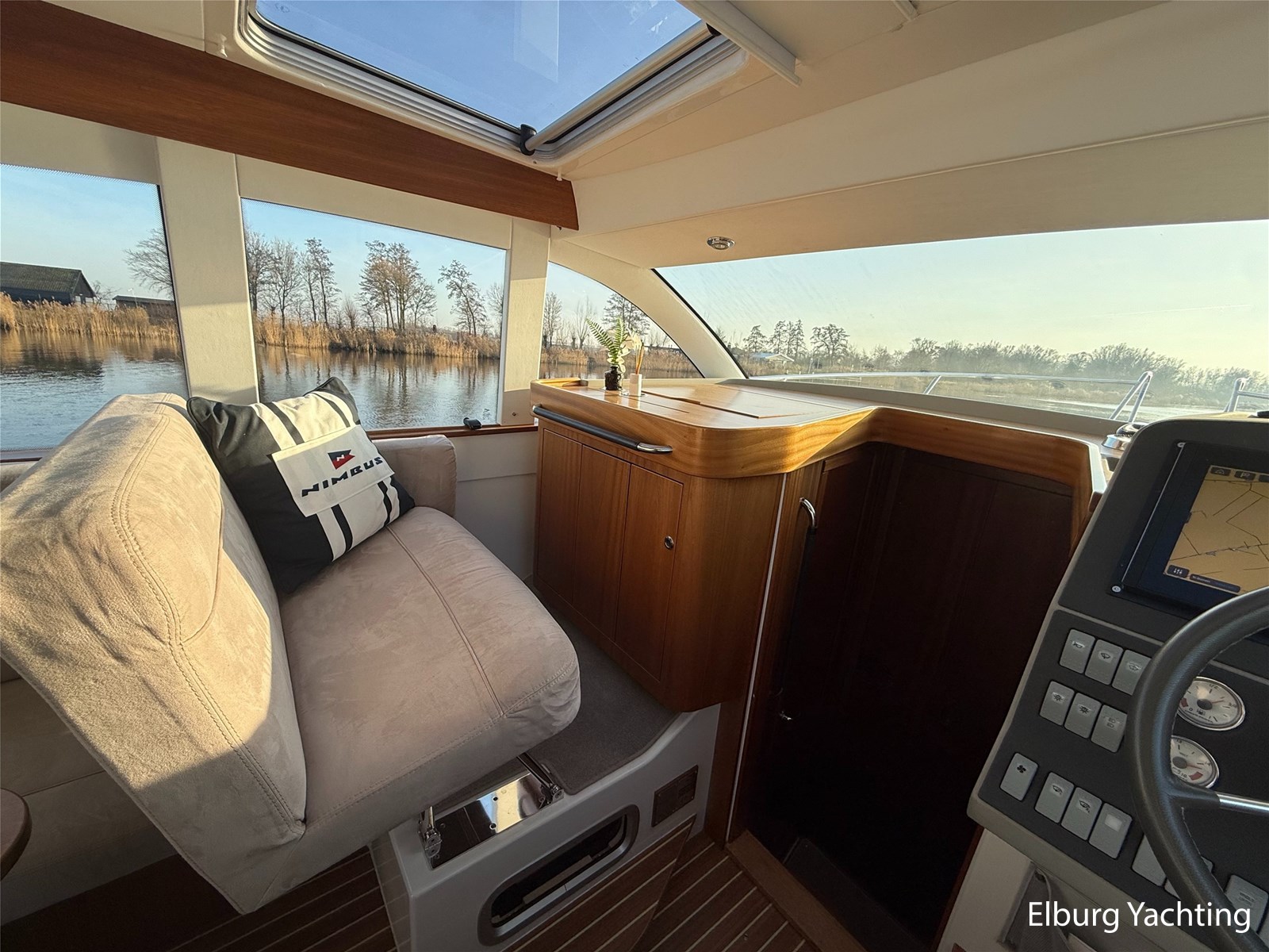 De Nimbus 335 beschikt over een ruime en verzorgde kuip, waarin comfort en functionaliteit mooi samenkomen. De zitbank met kussens nodigt uit tot ontspannen momenten aan boord, terwijl de diepe opbergbak praktische bergruimte biedt. Dankzij de volledig afsluitbare kuiptent is deze buitenruimte ook bij minder weer een prettige plek om te verblijven. Via een gemakkelijke doorgang bereikt u het zwemplatform. De salon is bereikbaar via een schuifdeur en biedt aan stuurboordzijde de kombuis en de stuurstand. De stuurstand is voorzien van een handige deur naar het gangboord. Aan bakboord bevindt zich een comfortabele dinette met in hoogte verstelbare tafel. Voorin, tegenover de stuurstand, is een klapbare meevaarbank aanwezig met een uitschuifbare tv. De combinatie van mahoniehouten betimmering en lichte bekleding geeft het interieur een warme, stijlvolle Scandinavische uitstraling. In 2025 zijn onder andere het toilet, de radar, omvormer, marifoon, Fusion-radio en de matrassen vernieuwd. De warmtewisselaar is gereviseerd. In 2025 is het schip voorzien van nieuwe antifouling en is er een uitgebreide poets- en polijstbeurt uitgevoerd. De motor kreeg in 2025 een onderhoudsbeurt en de plotter werd vervangen in 2023. Grote luiken in de kuipvloer zorgen voor uitstekende toegang tot de motorruimte, bergruimte en technische installaties. Het gemiddeld brandstofverbruik (5-6 knopen varen) bedroeg circa 3 liter per uur. Met originele Nimbus-details zoals het servies, een chique dubbele RVS zeerailing en een doordachte indeling is dit jacht een compleet geheel. Volledige documentatie beschikbaar.