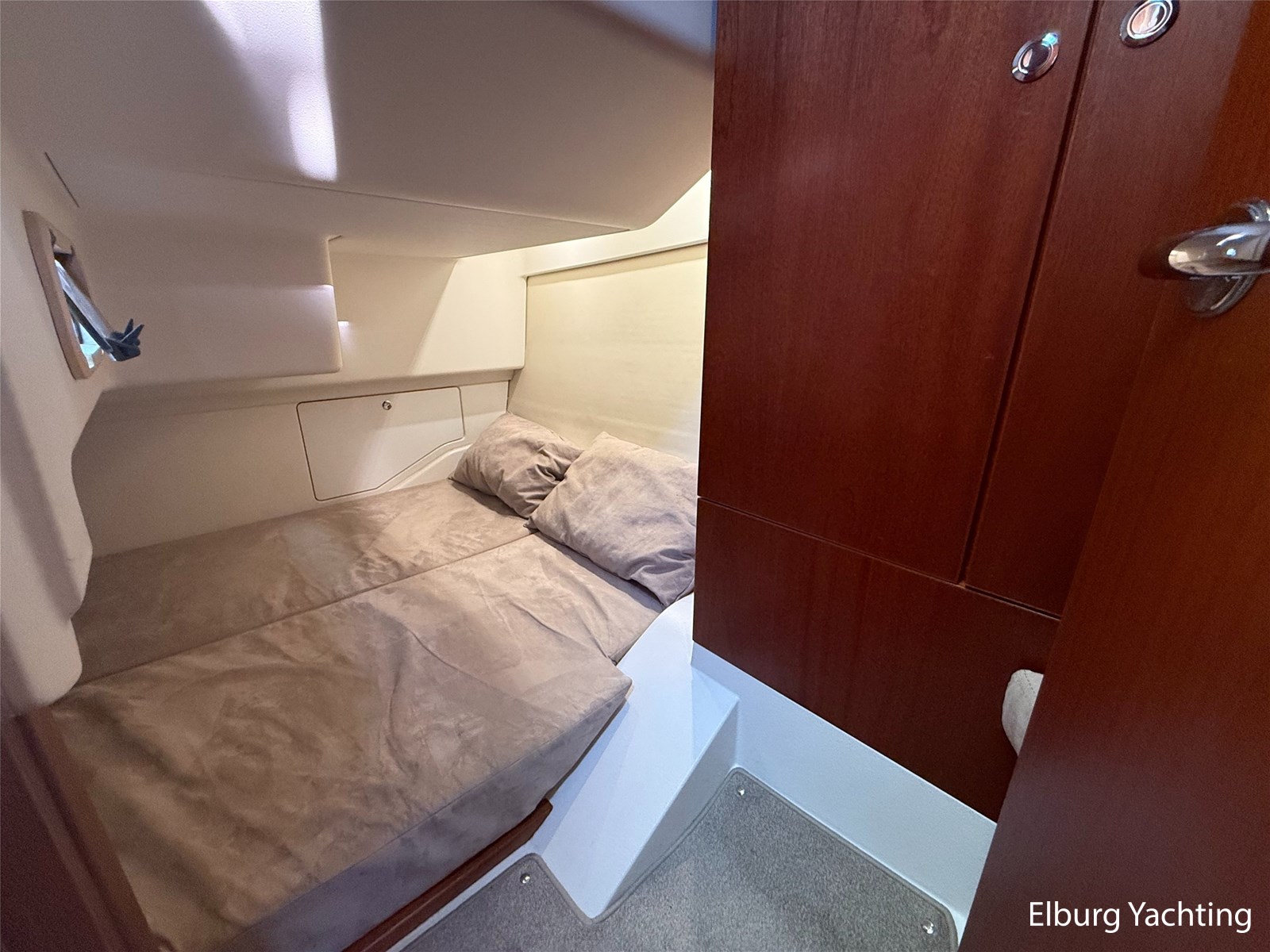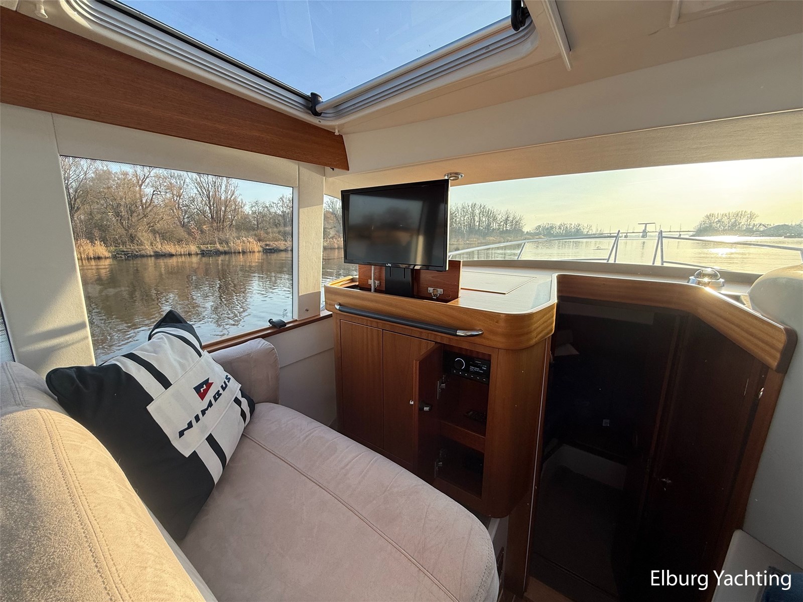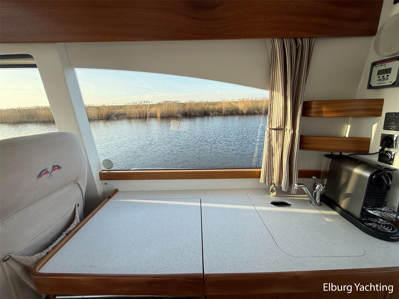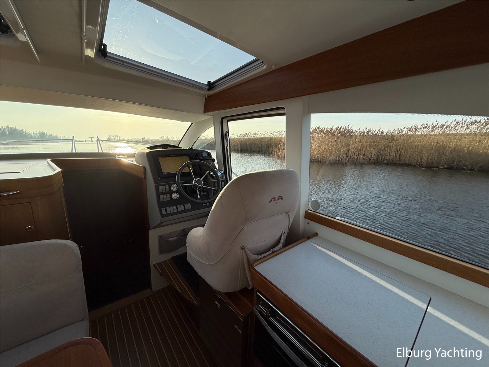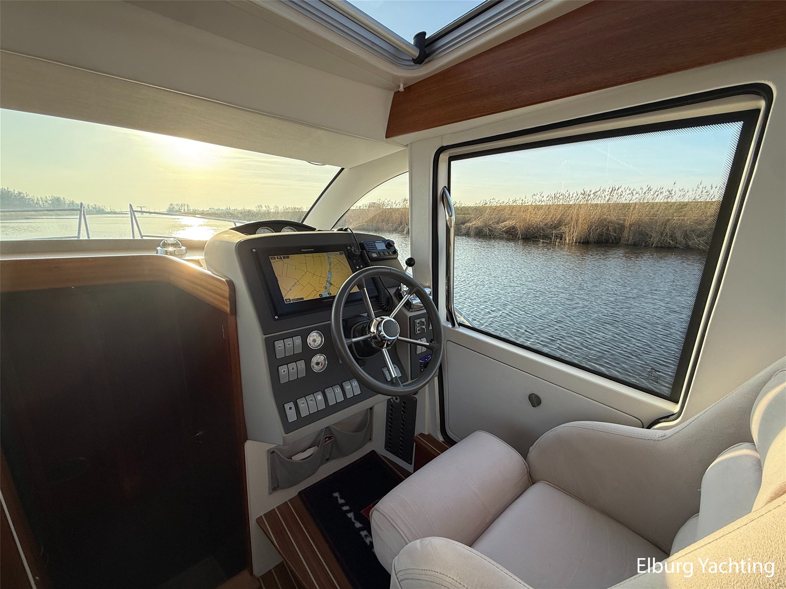 De Nimbus 335 beschikt over een ruime en verzorgde kuip, waarin comfort en functionaliteit mooi samenkomen. De zitbank met kussens nodigt uit tot ontspannen momenten aan boord, terwijl de diepe opbergbak praktische bergruimte biedt. Dankzij de volledig afsluitbare kuiptent is deze buitenruimte ook bij minder weer een prettige plek om te verblijven. Via een gemakkelijke doorgang bereikt u het zwemplatform. De salon is bereikbaar via een schuifdeur en biedt aan stuurboordzijde de kombuis en de stuurstand. De stuurstand is voorzien van een handige deur naar het gangboord. Aan bakboord bevindt zich een comfortabele dinette met in hoogte verstelbare tafel. Voorin, tegenover de stuurstand, is een klapbare meevaarbank aanwezig met een uitschuifbare tv. De combinatie van mahoniehouten betimmering en lichte bekleding geeft het interieur een warme, stijlvolle Scandinavische uitstraling. In 2025 zijn onder andere het toilet, de radar, omvormer, marifoon, Fusion-radio en de matrassen vernieuwd. De warmtewisselaar is gereviseerd. In 2025 is het schip voorzien van nieuwe antifouling en is er een uitgebreide poets- en polijstbeurt uitgevoerd. De motor kreeg in 2025 een onderhoudsbeurt en de plotter werd vervangen in 2023. Grote luiken in de kuipvloer zorgen voor uitstekende toegang tot de motorruimte, bergruimte en technische installaties. Het gemiddeld brandstofverbruik (5-6 knopen varen) bedroeg circa 3 liter per uur. Met originele Nimbus-details zoals het servies, een chique dubbele RVS zeerailing en een doordachte indeling is dit jacht een compleet geheel. Volledige documentatie beschikbaar.
