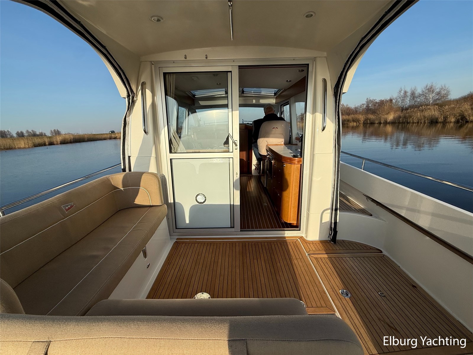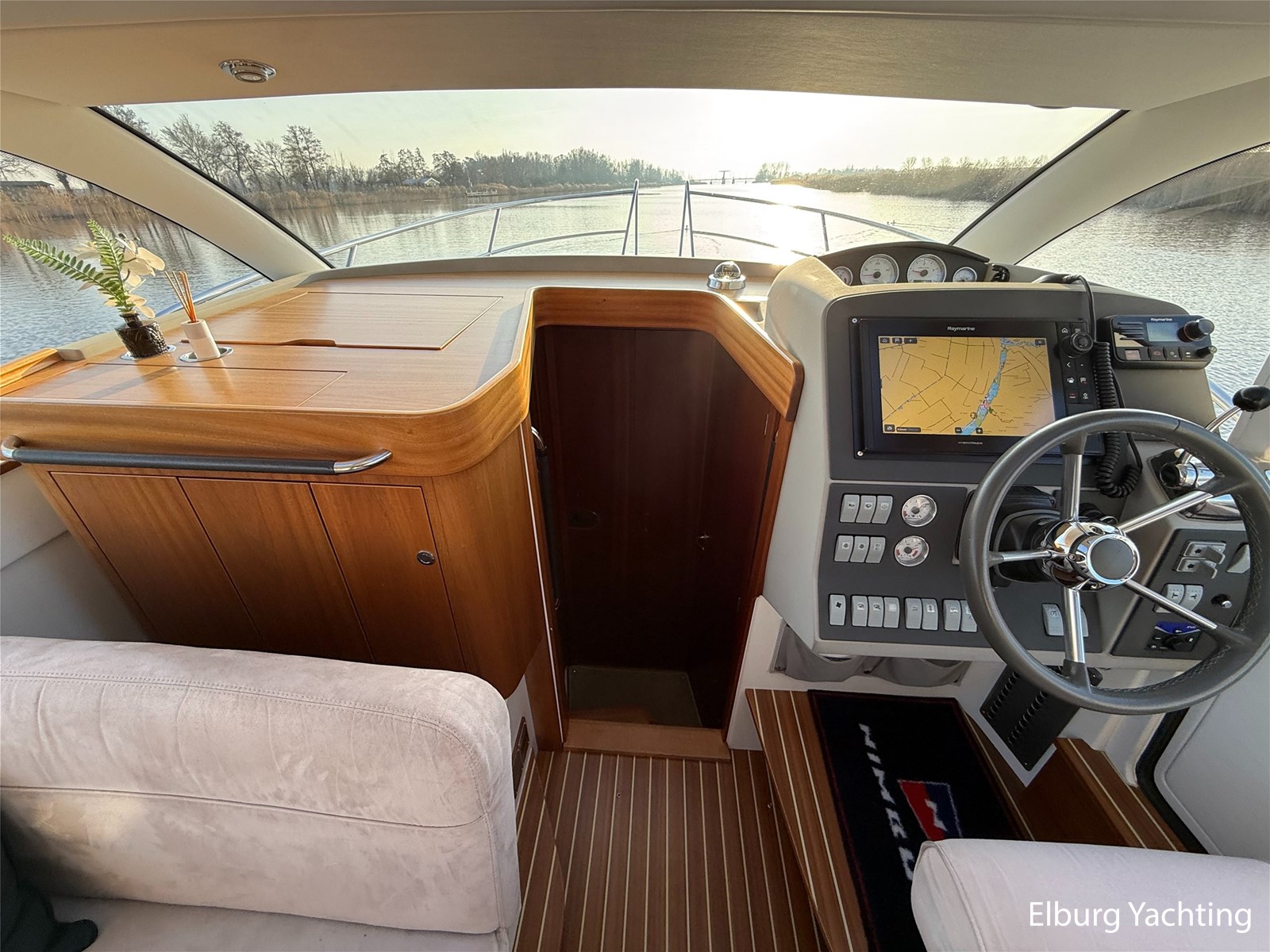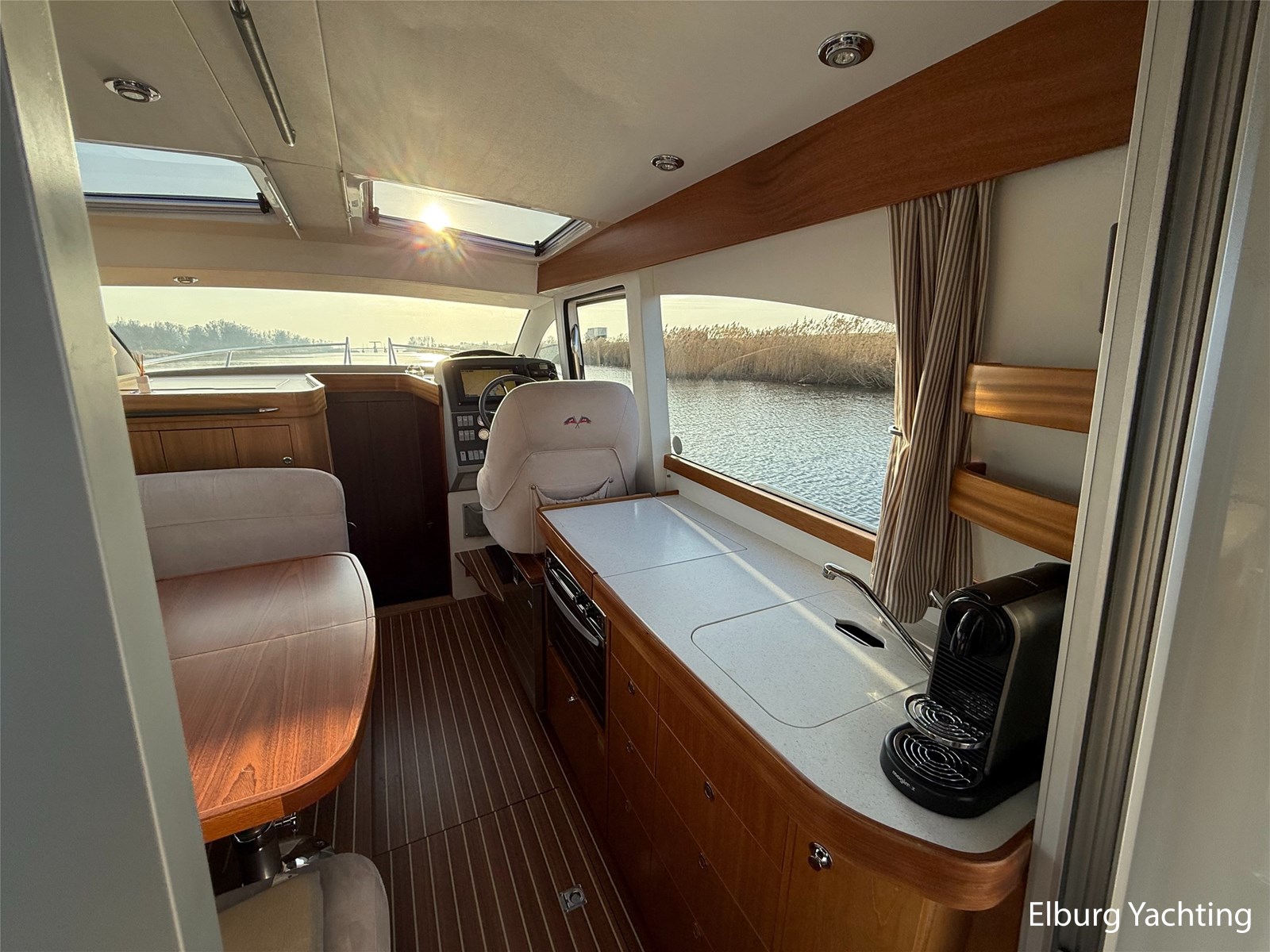 - Mahoniehouten interieur + teak vloer + lichte stoffen bekleding