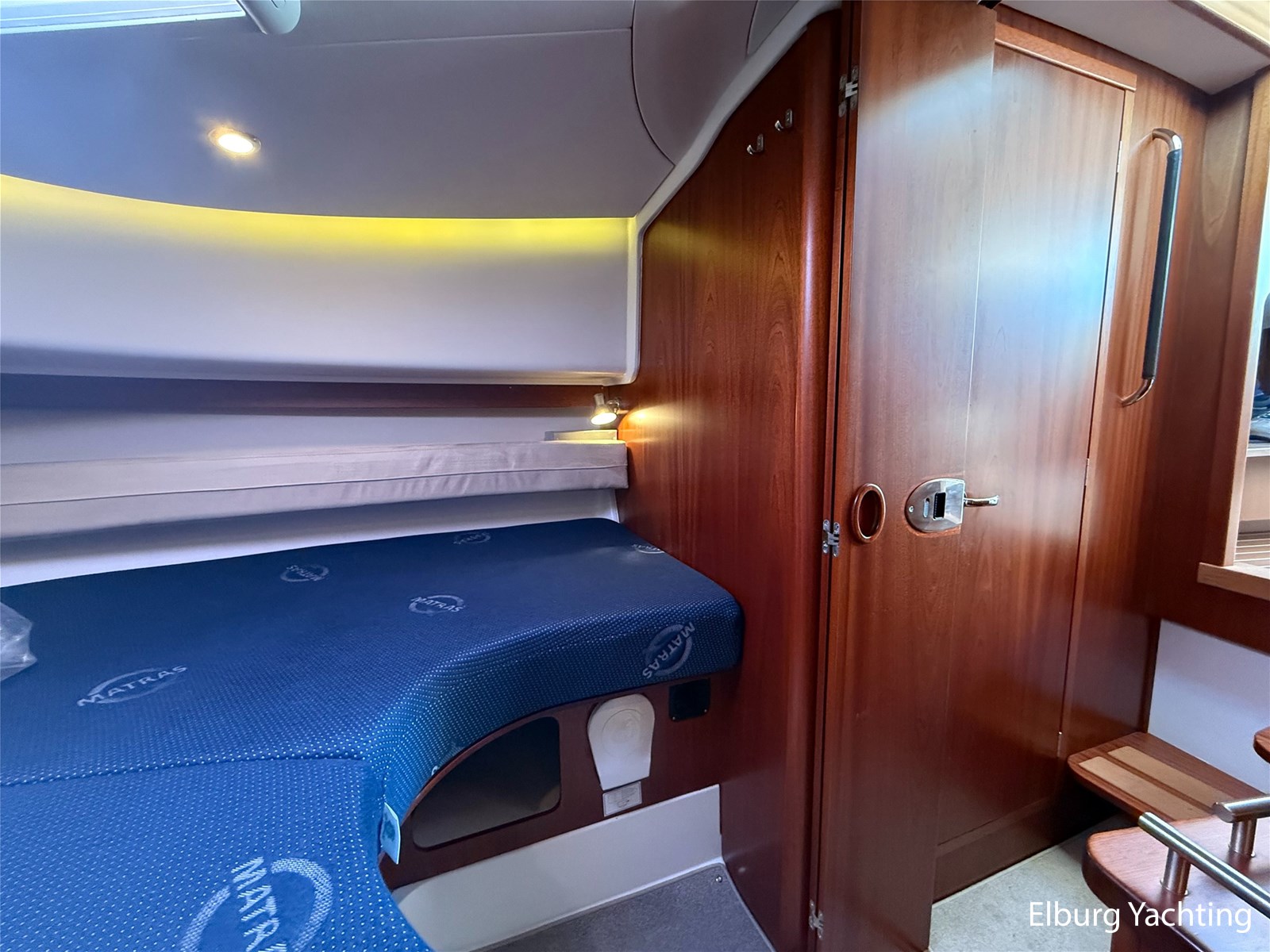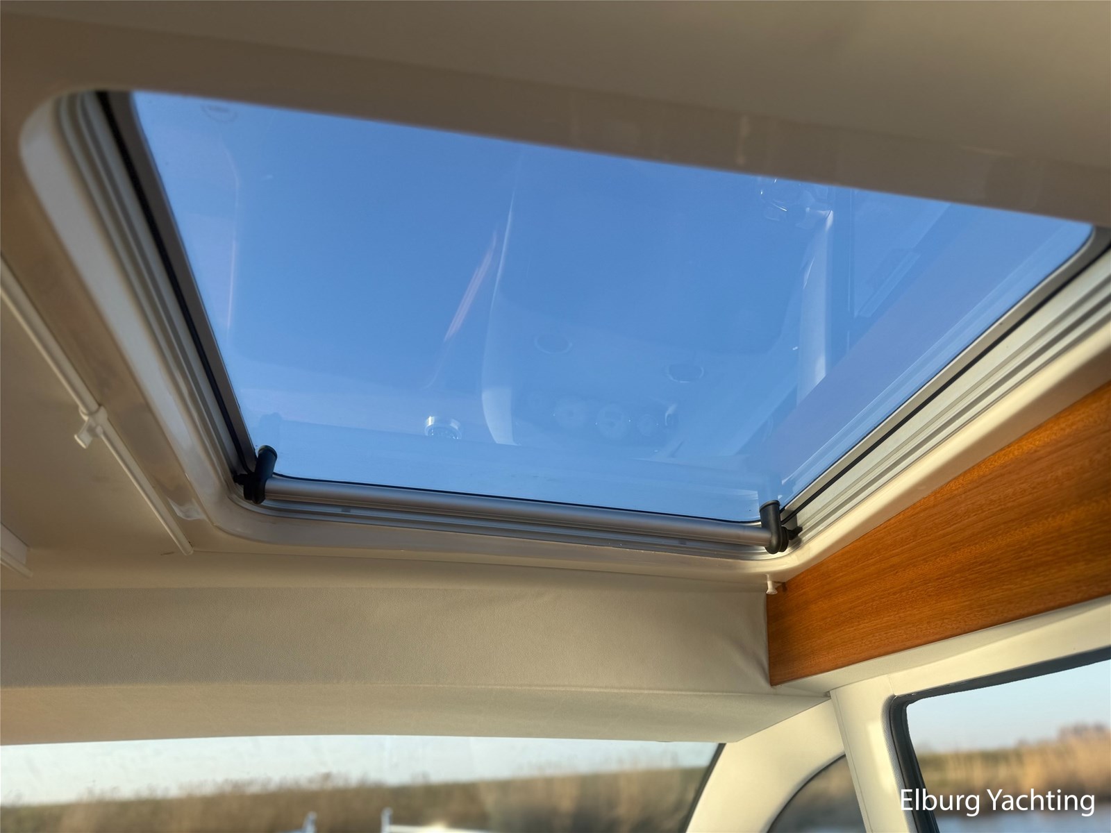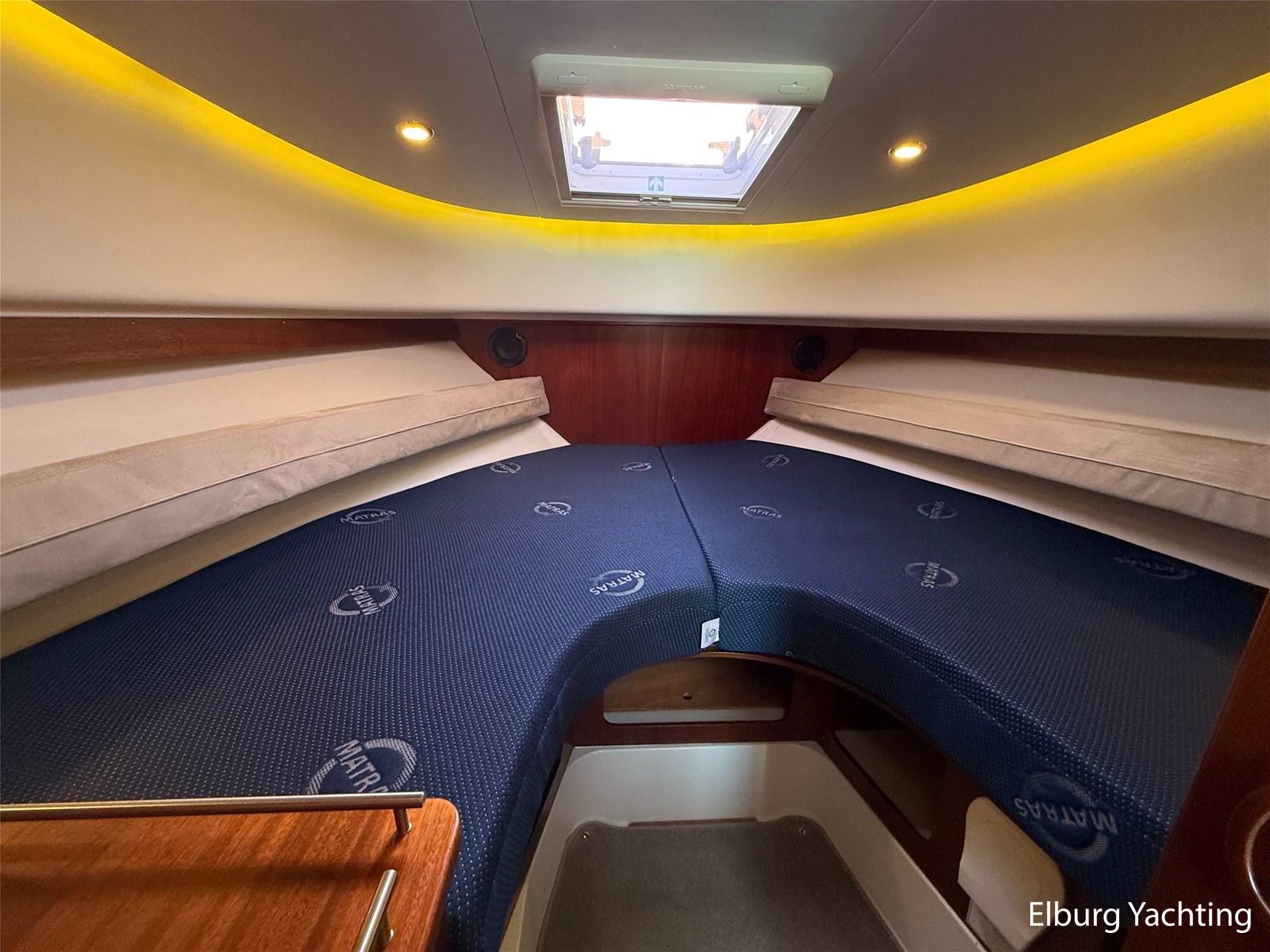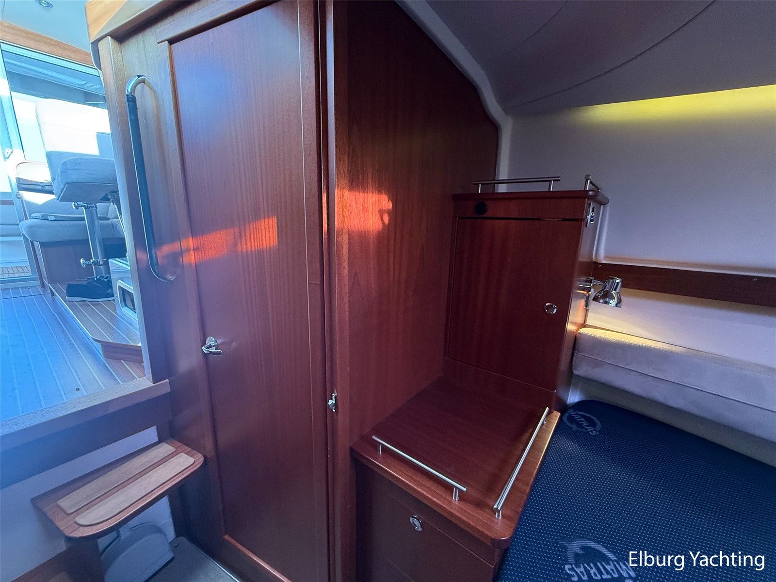 - Mahoniehouten interieur + teak vloer + lichte stoffen bekleding
