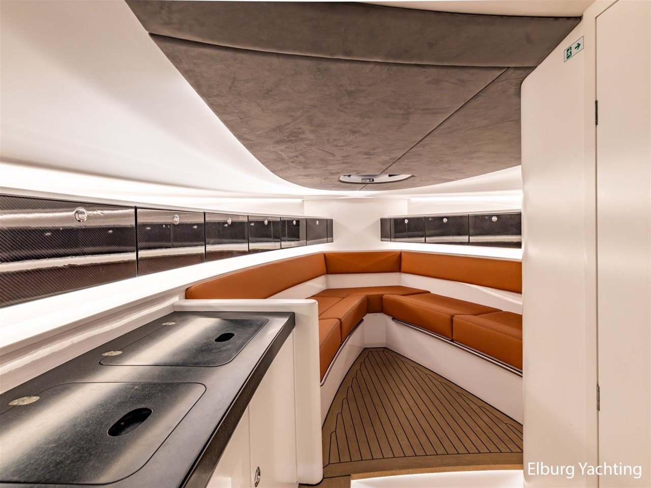- Wit gelakt met alcantara plafond bekleding en kunstteak vloeren
