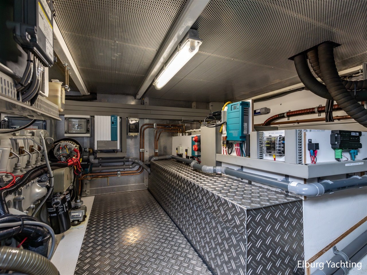De keuken, stuurstand, 4-persoons eettafel en salonbank zijn opgenomen in een en dezelfde ruimte waardoor er veel contact mogelijk is. De aandrijving wordt verzorgd door een enkele 170 pk Vetus Deutz motor, dit zorgt voor een soepele toch krachtige manoeuvreerbaarheid in combinatie met een boeg- en hekschroef.