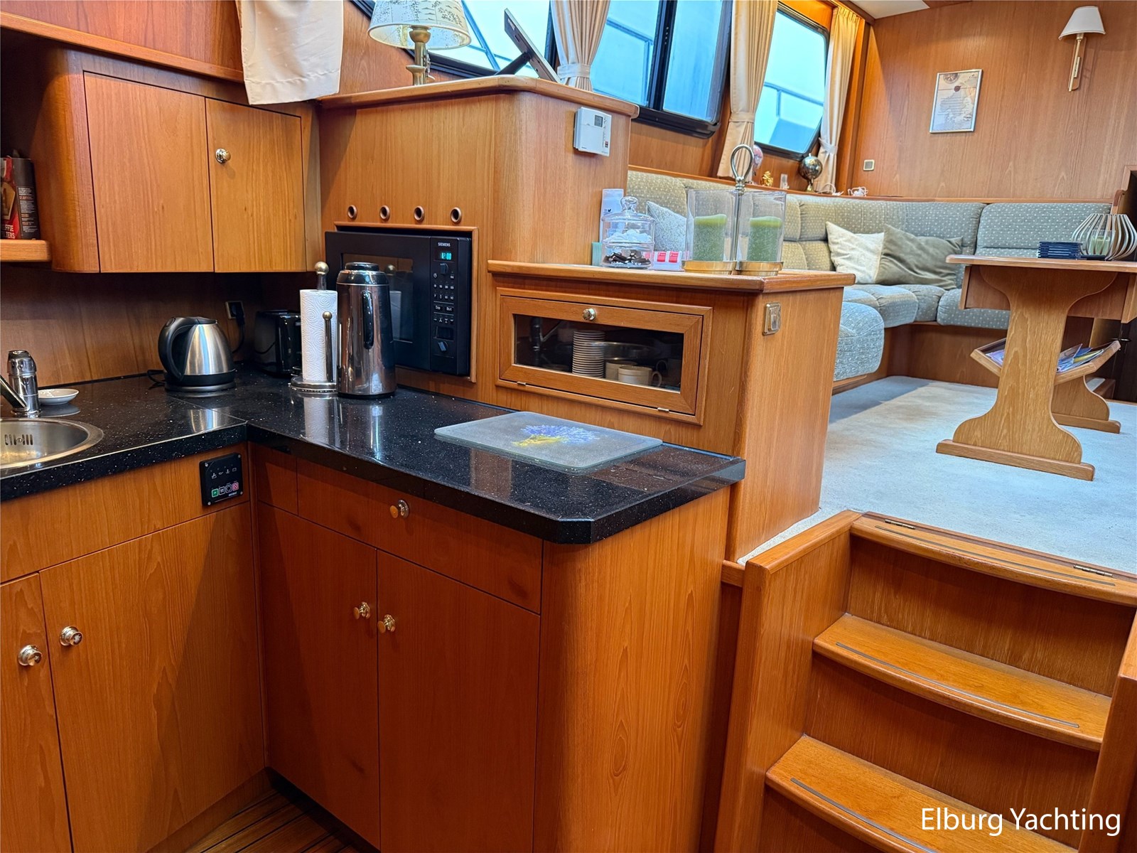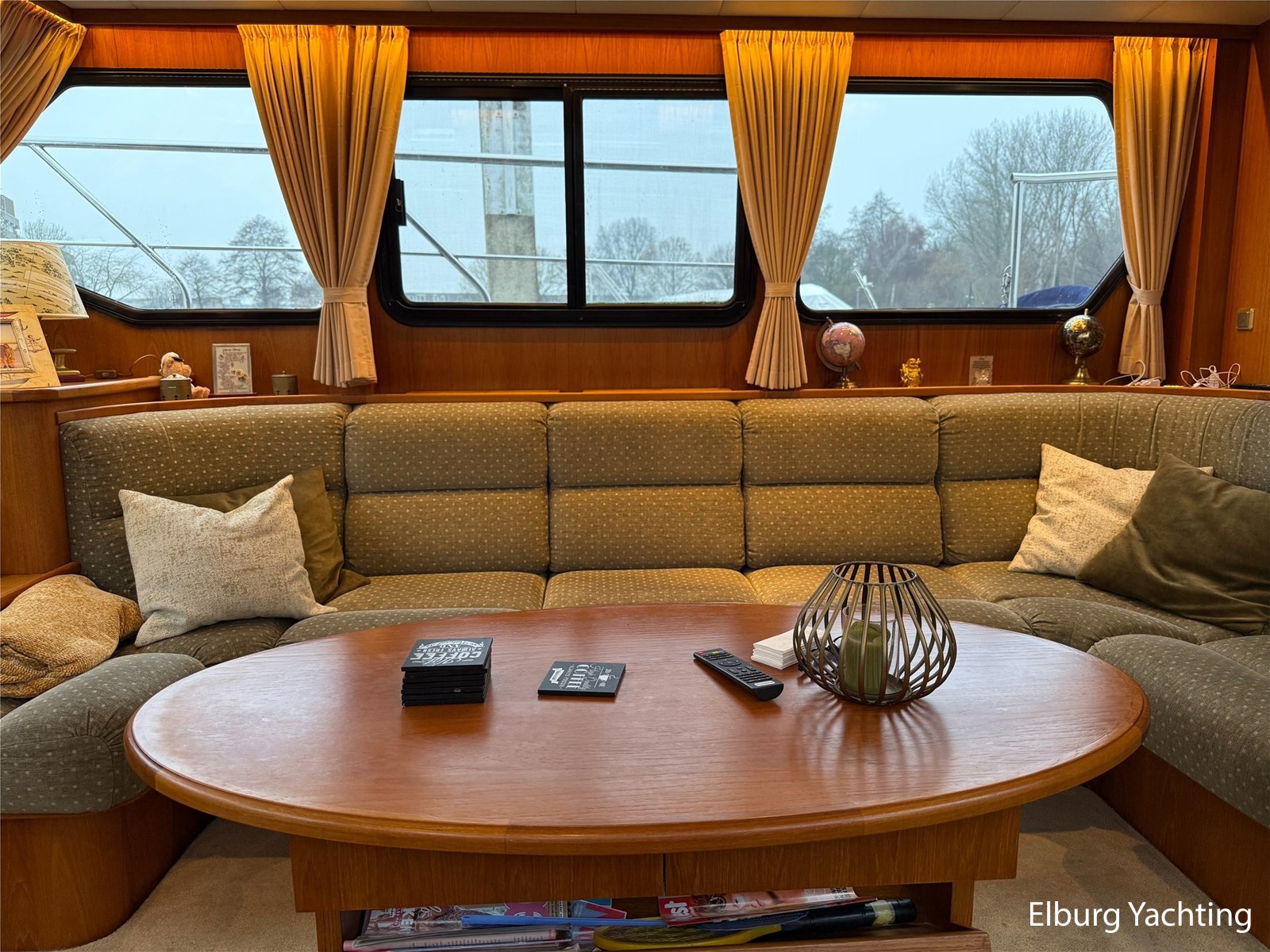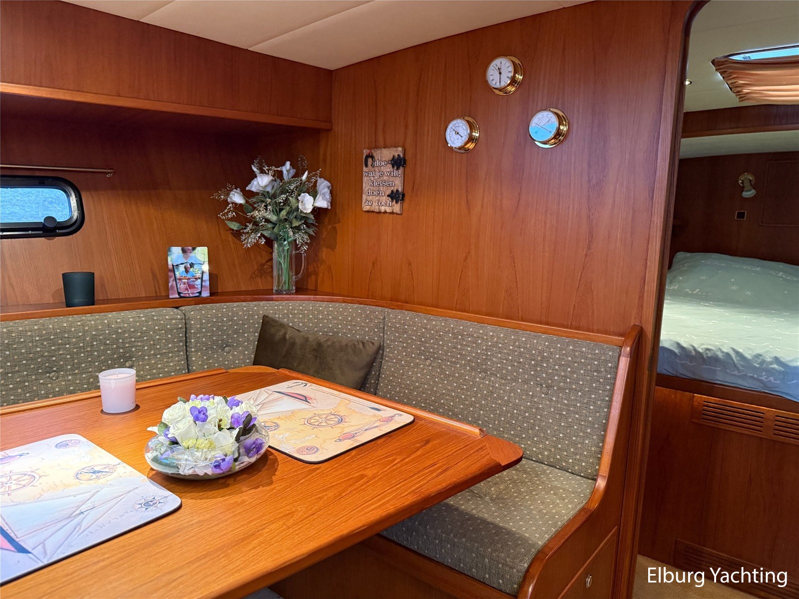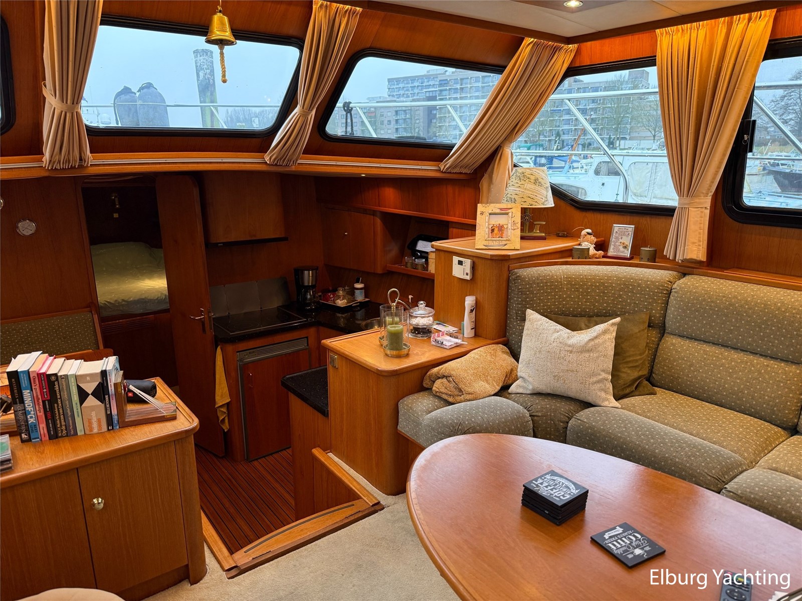 Binnen is het interieur van prachtig scheeps Teakhout in combinatie met bruine stoffen bekleding. Dit creëert een rustige ruimtelijke omgeving waar men heerlijk tot rust komt. Het jacht heeft een grote salon met comfortabele bank met tv en vloerbedekking. Verder naar voren de kombuis met daartegenover de dinette. Helemaal voorin is de voorhut met dubbel vrijstaand bed. Achter de salon via de luie trap naar beneden zijn de derde hut met stapelbed en daar tegenover de badkamer met elektrisch toilet, douche en wastafel gesitueerd en helemaal achterin zit de eigenaarshut met vrijstaand tweepersoons bed.
