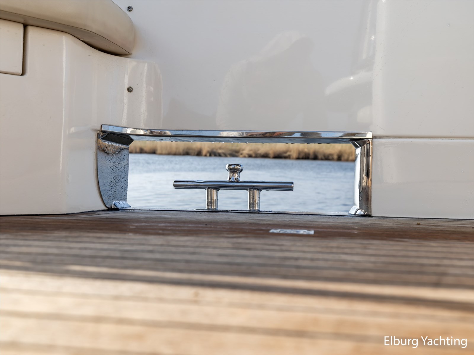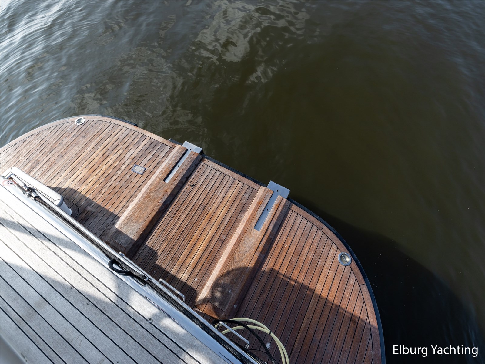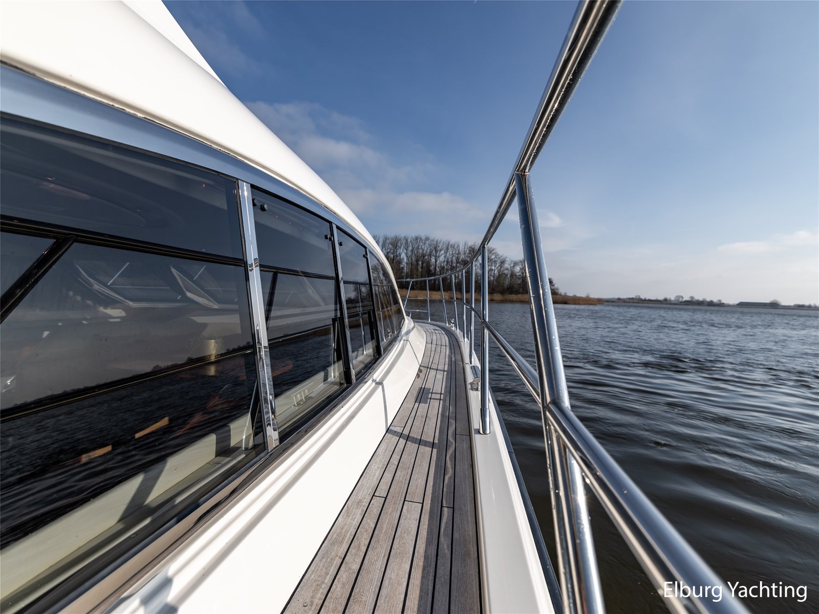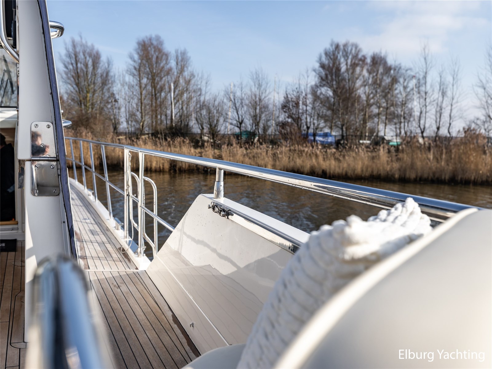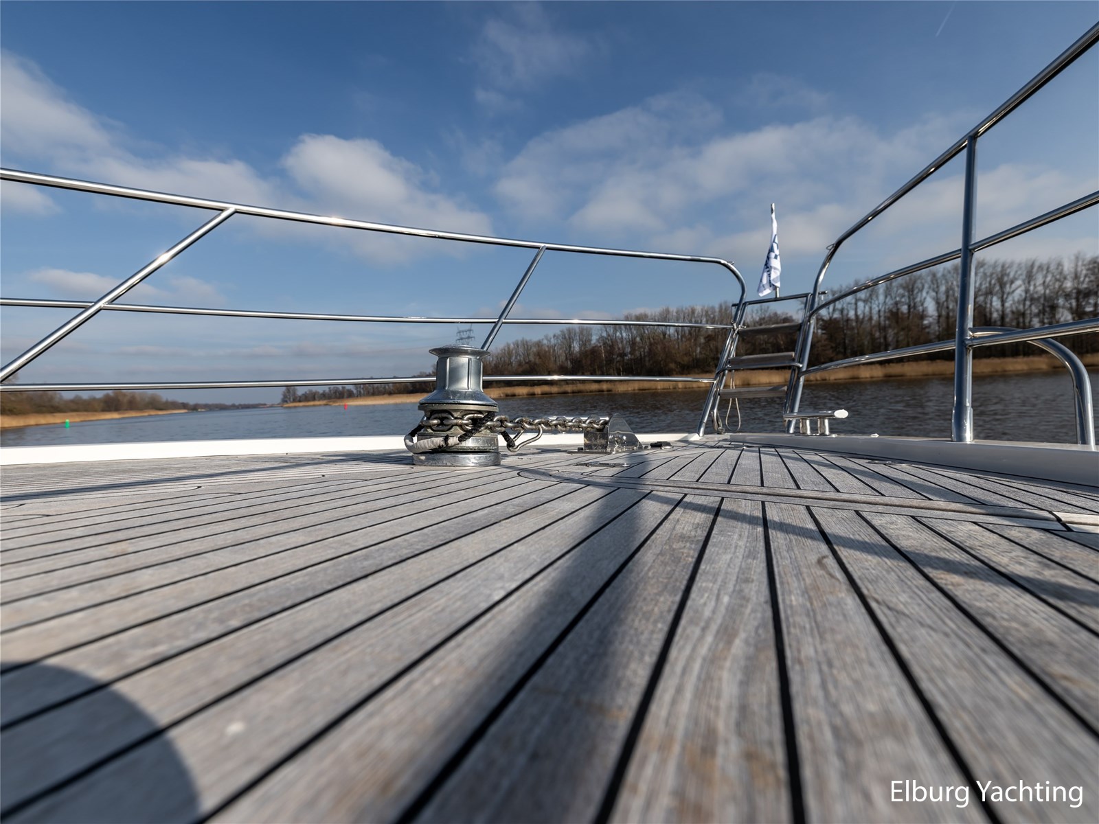 Rondom is het jacht voorzien van een prachtig Teakdek in combinatie met een driedubbel uitgevoerde r.v.s. zeerailing. Aan beide zijden zijn railingpoortjes aangebracht met een comfortabele boegopstap waardoor het jacht ook bij de lagere steigers eenvoudig te betreden is. Het zwemplateau is eenvoudig te bereiken via de luie trap aan stuurboordzijde en een hydraulische gangway tevens is het zwemplateau voorzien van een Teakdek met steunen voor de bijboot, welke eenvoudig met de uitschuifbare gangway kunt kranen. Binnen is het jacht voorzien van een warm luxe Kersenhouten interieur met granieten werkbladen. De Kombuis is voorzien van Miele kwaliteitsapparatuur, het is aangenaam op temperatuur te krijgen via de Kabola centrale verwarming. Dimbare verlichting en 3 volwaardige hutten met 3 maal sanitair (3 x elektrische toiletten met 3 douches). Aan boord is de kastruimte goed doordacht en het interieur is prachtig afgewerkt.