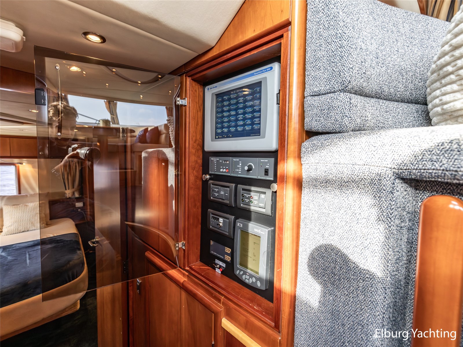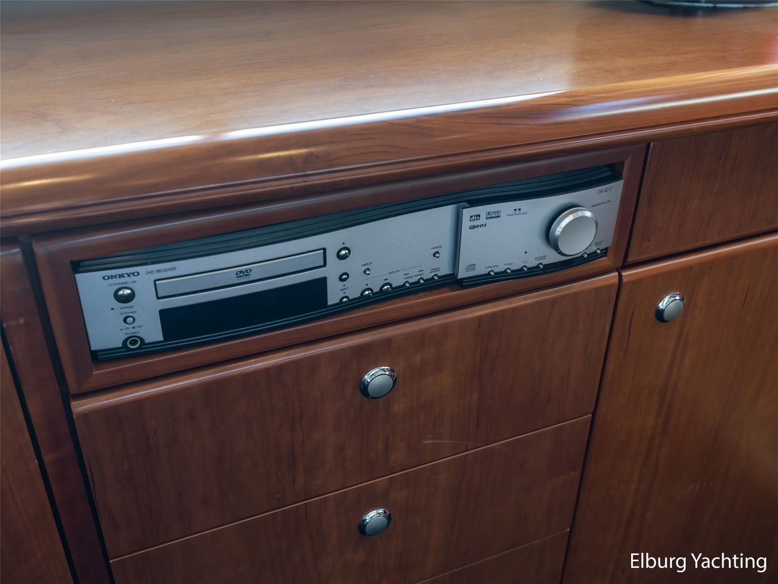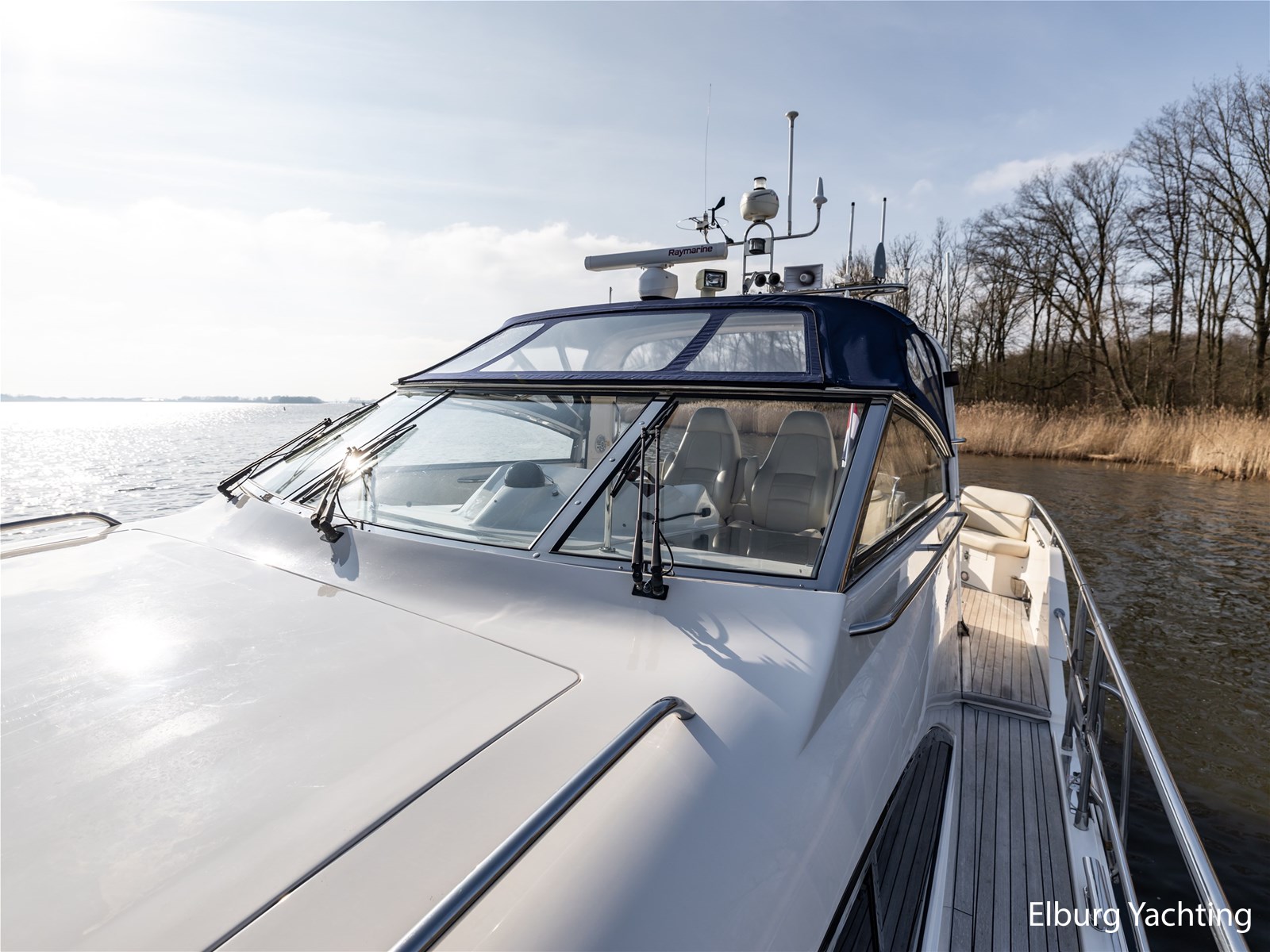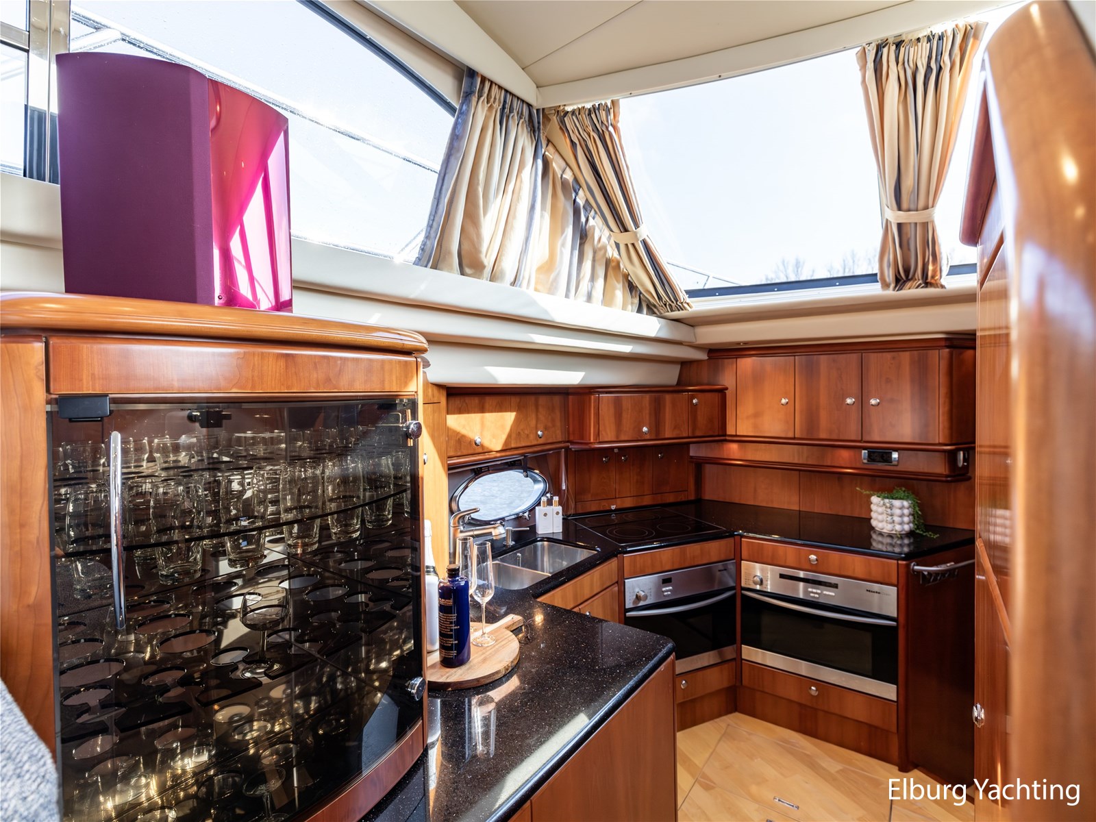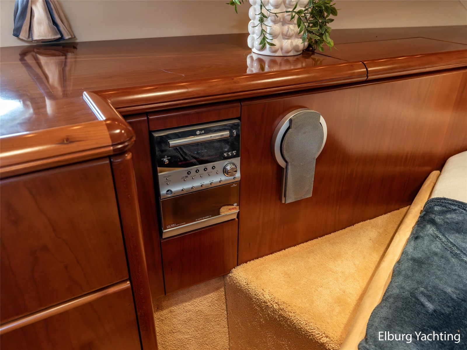 Rondom is het jacht voorzien van een prachtig Teakdek in combinatie met een driedubbel uitgevoerde r.v.s. zeerailing. Aan beide zijden zijn railingpoortjes aangebracht met een comfortabele boegopstap waardoor het jacht ook bij de lagere steigers eenvoudig te betreden is. Het zwemplateau is eenvoudig te bereiken via de luie trap aan stuurboordzijde en een hydraulische gangway tevens is het zwemplateau voorzien van een Teakdek met steunen voor de bijboot, welke eenvoudig met de uitschuifbare gangway kunt kranen. Binnen is het jacht voorzien van een warm luxe Kersenhouten interieur met granieten werkbladen. De Kombuis is voorzien van Miele kwaliteitsapparatuur, het is aangenaam op temperatuur te krijgen via de Kabola centrale verwarming. Dimbare verlichting en 3 volwaardige hutten met 3 maal sanitair (3 x elektrische toiletten met 3 douches). Aan boord is de kastruimte goed doordacht en het interieur is prachtig afgewerkt.