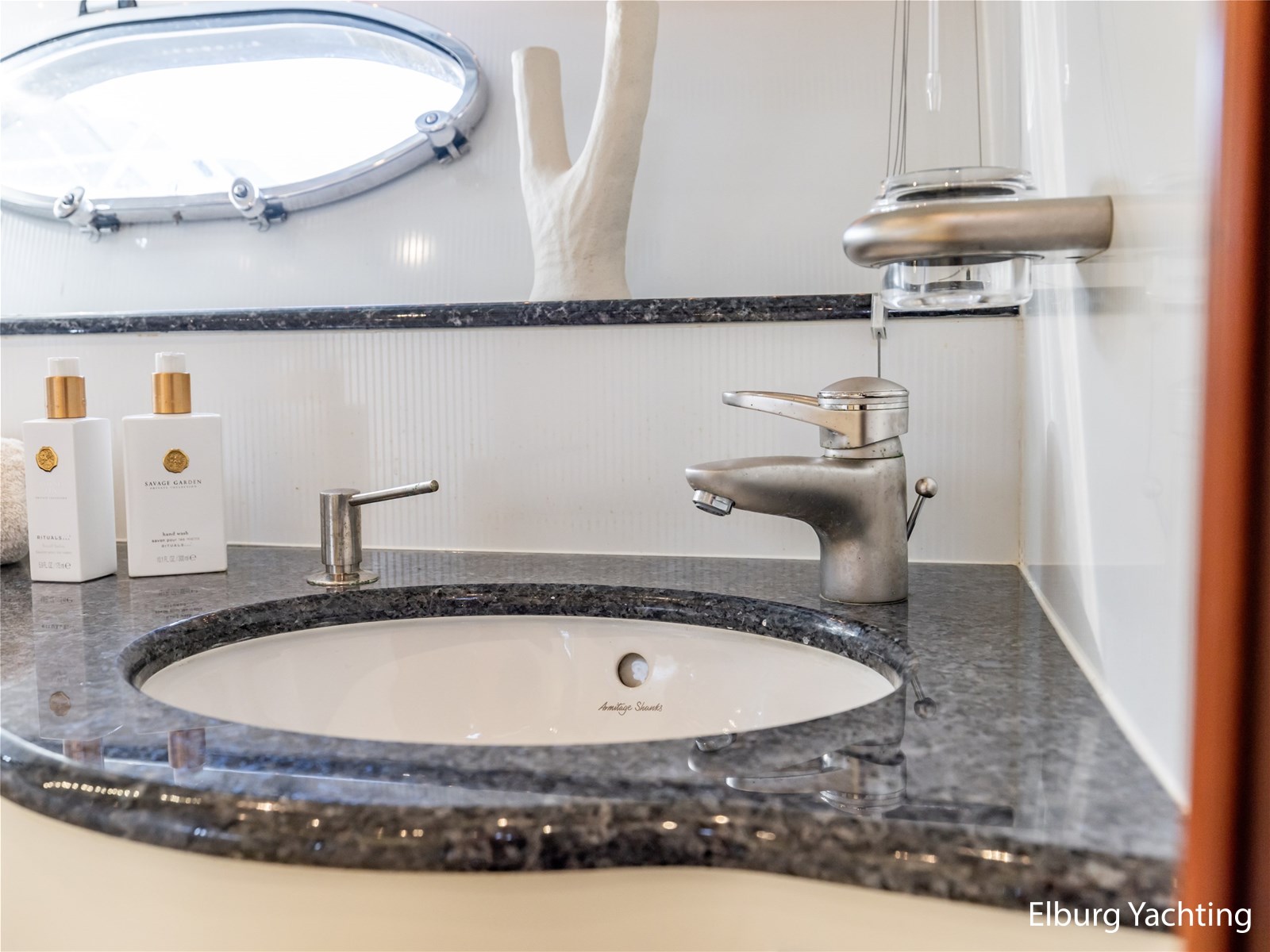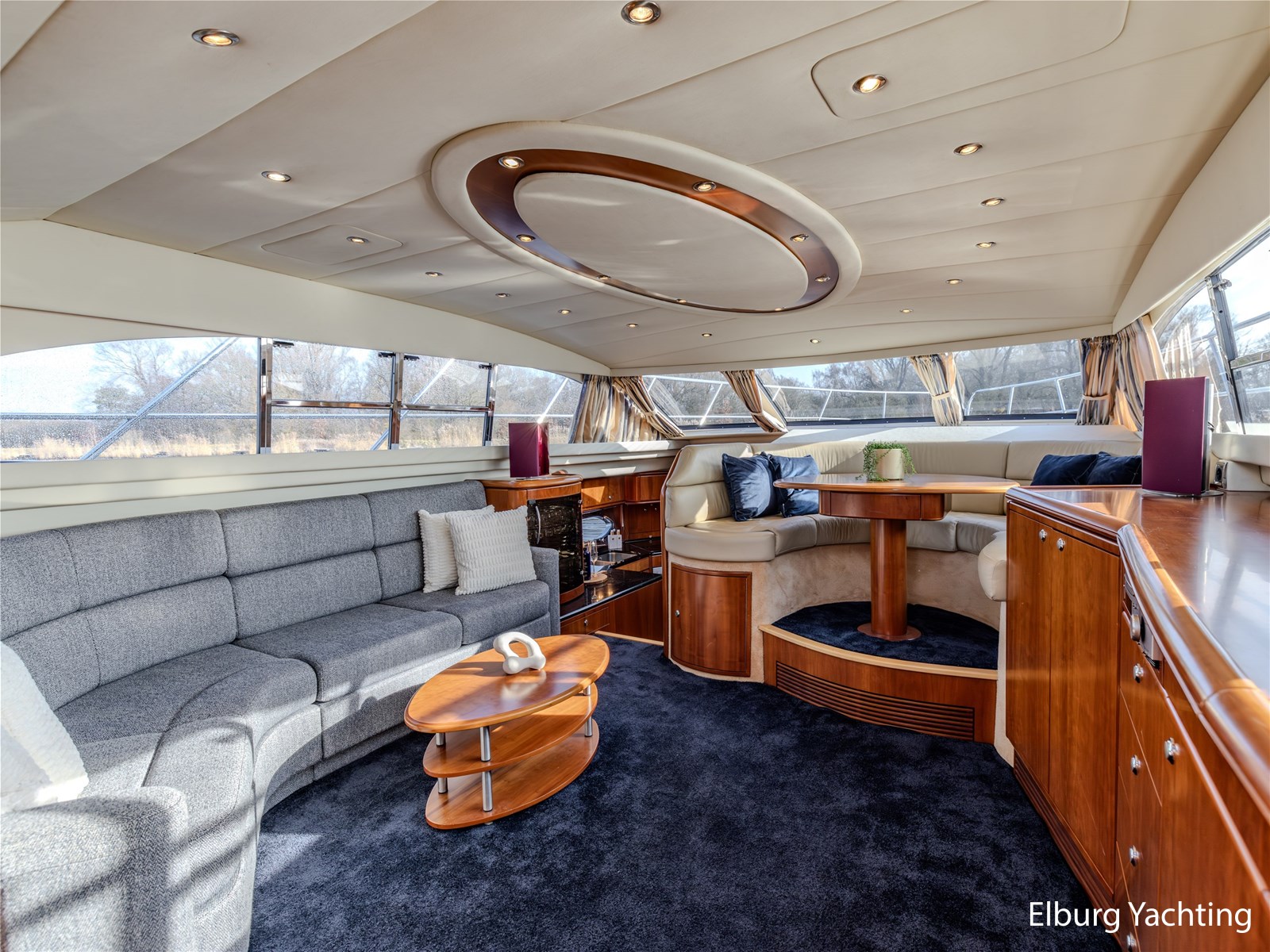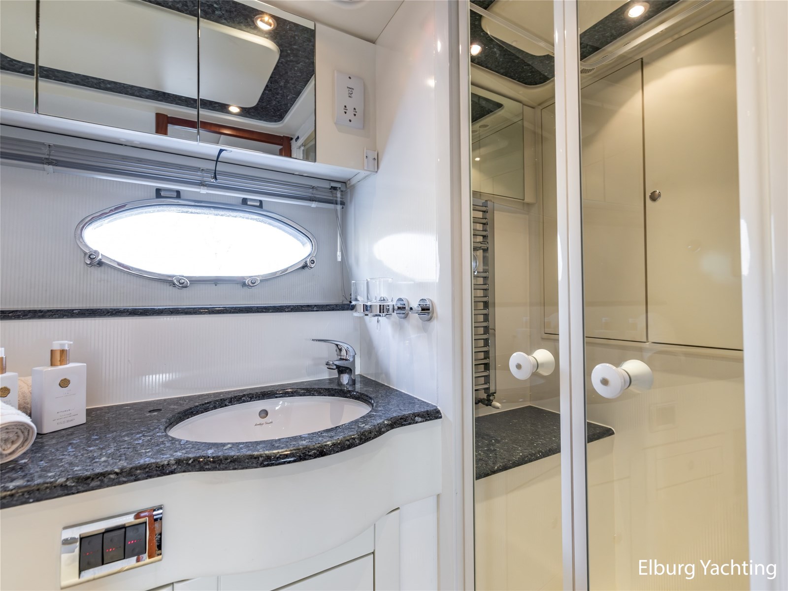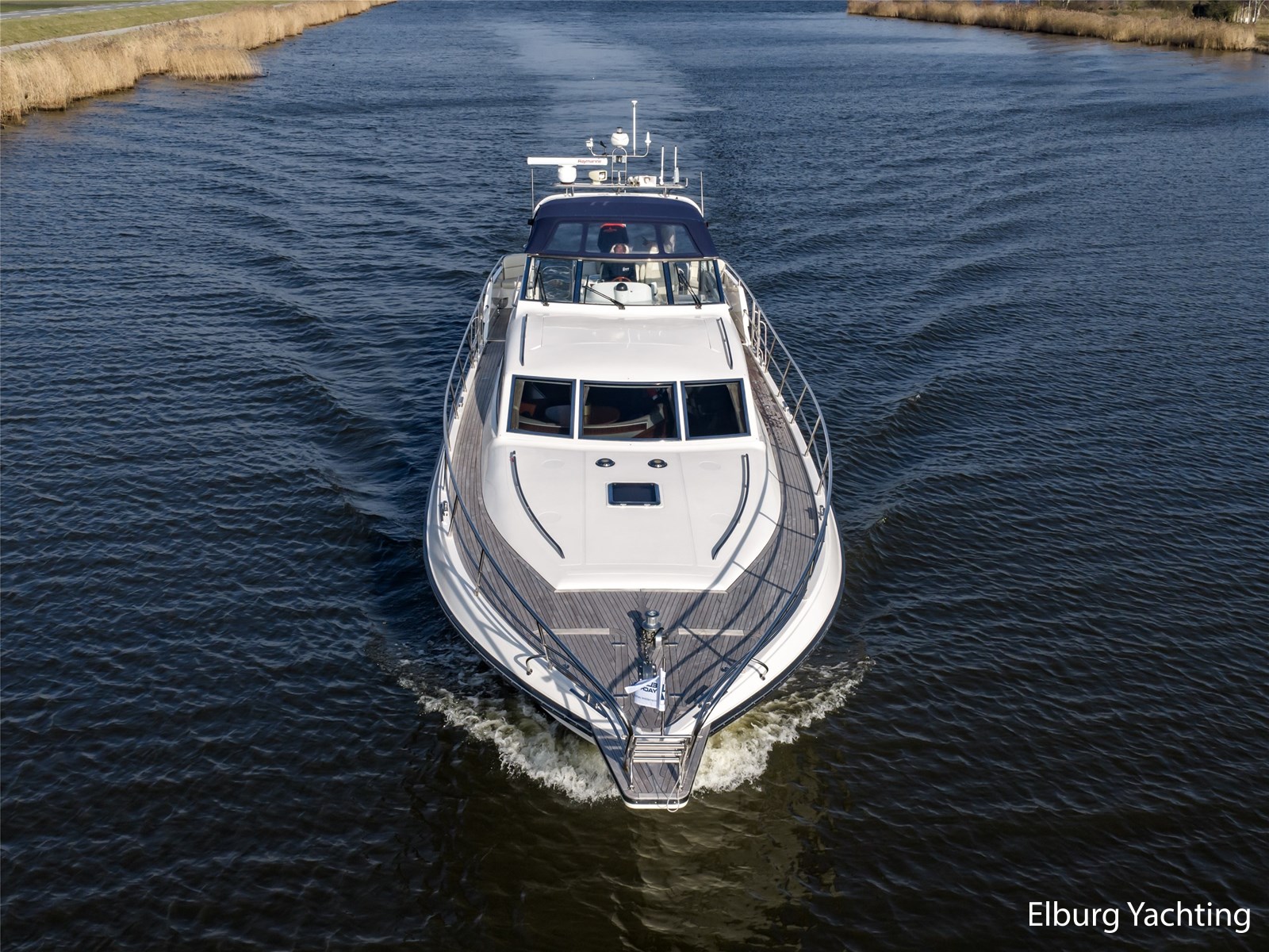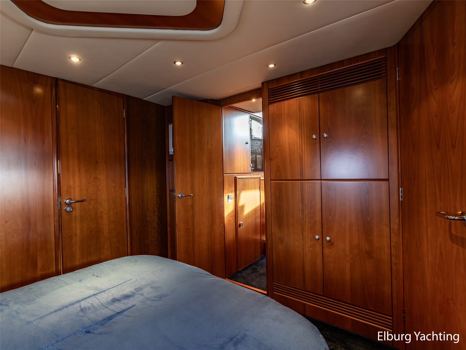 Rondom is het jacht voorzien van een prachtig Teakdek in combinatie met een driedubbel uitgevoerde r.v.s. zeerailing. Aan beide zijden zijn railingpoortjes aangebracht met een comfortabele boegopstap waardoor het jacht ook bij de lagere steigers eenvoudig te betreden is. Het zwemplateau is eenvoudig te bereiken via de luie trap aan stuurboordzijde en een hydraulische gangway tevens is het zwemplateau voorzien van een Teakdek met steunen voor de bijboot, welke eenvoudig met de uitschuifbare gangway kunt kranen. Binnen is het jacht voorzien van een warm luxe Kersenhouten interieur met granieten werkbladen. De Kombuis is voorzien van Miele kwaliteitsapparatuur, het is aangenaam op temperatuur te krijgen via de Kabola centrale verwarming. Dimbare verlichting en 3 volwaardige hutten met 3 maal sanitair (3 x elektrische toiletten met 3 douches). Aan boord is de kastruimte goed doordacht en het interieur is prachtig afgewerkt.