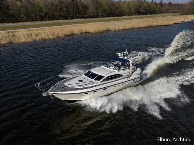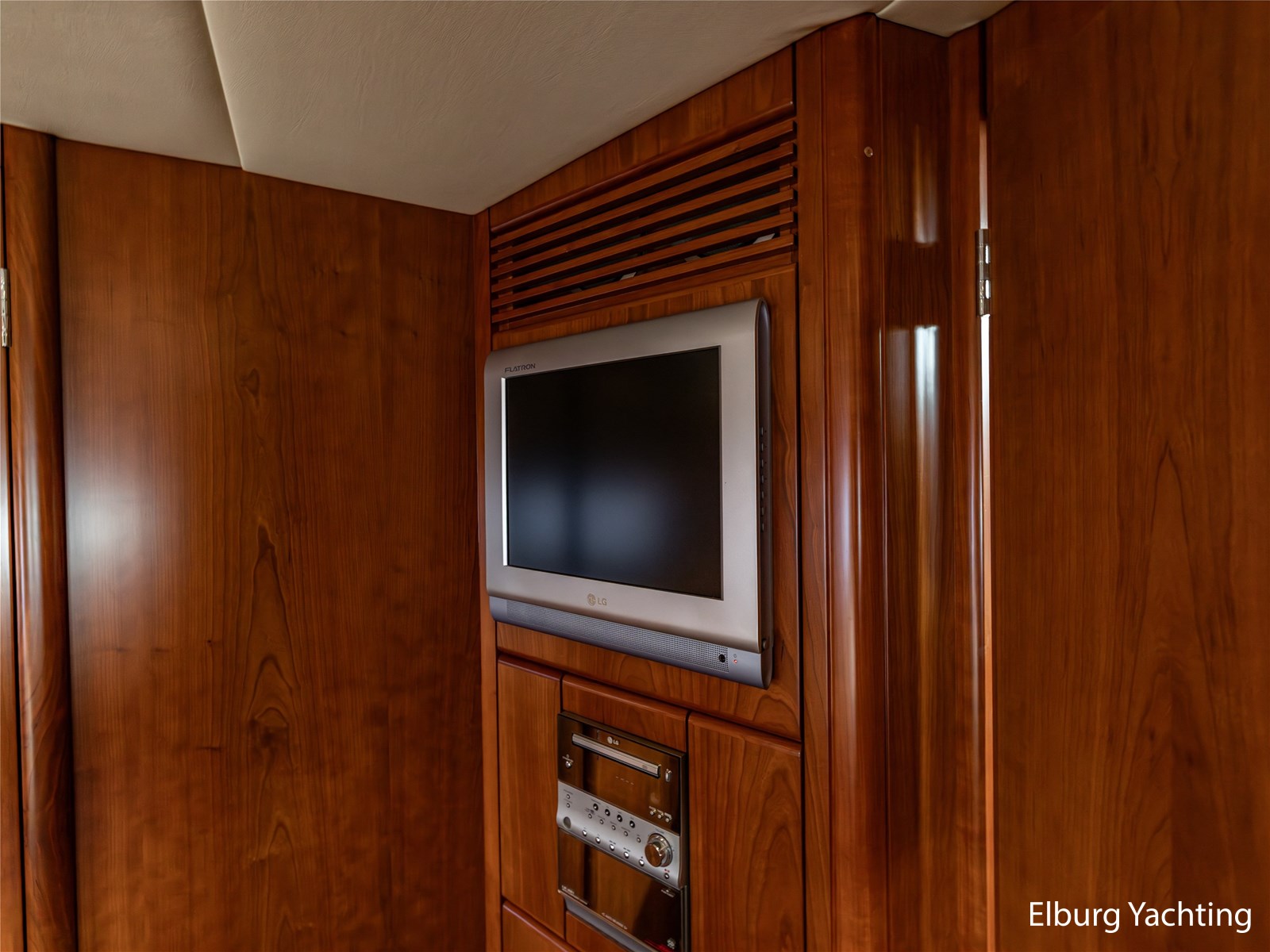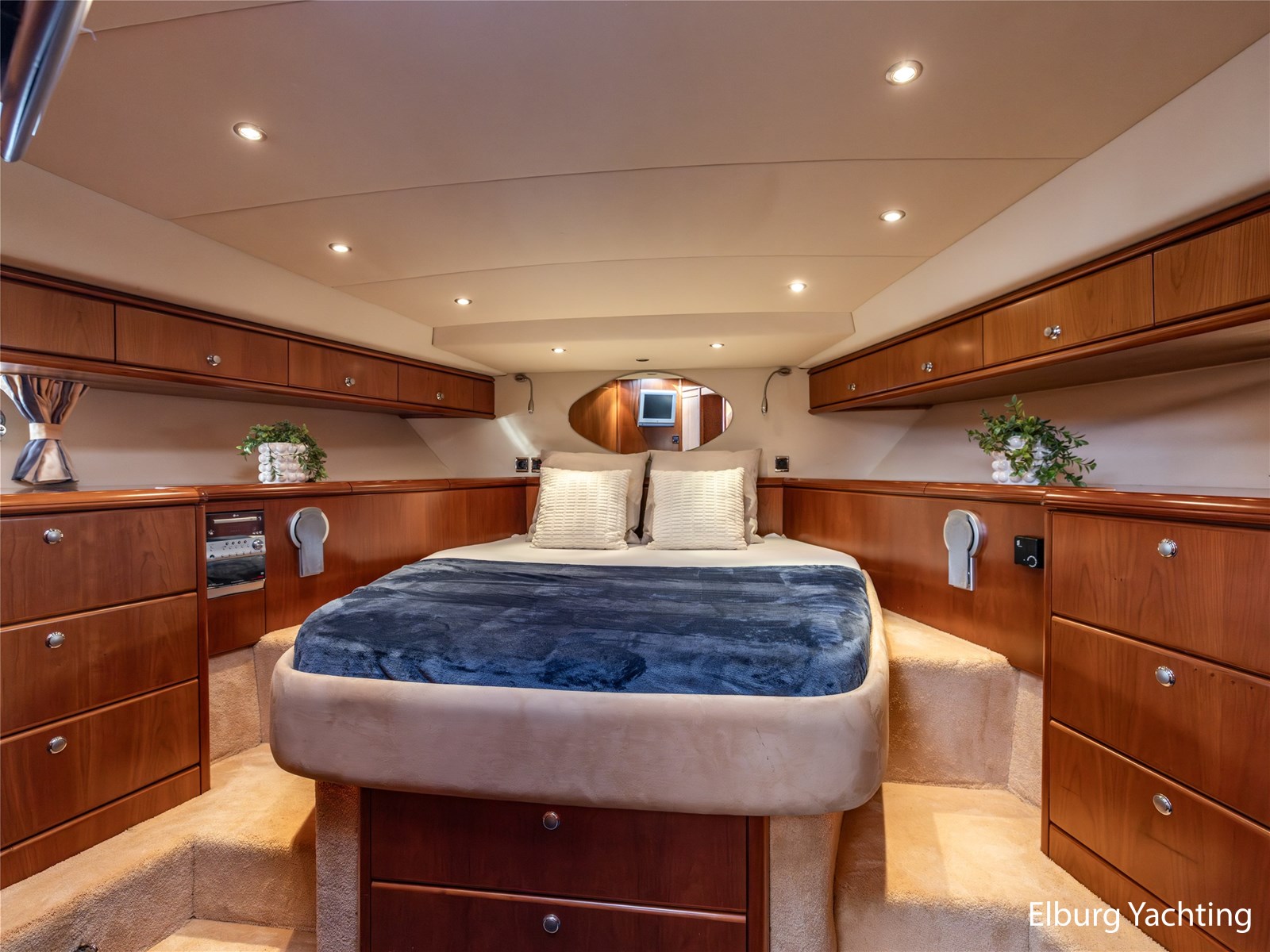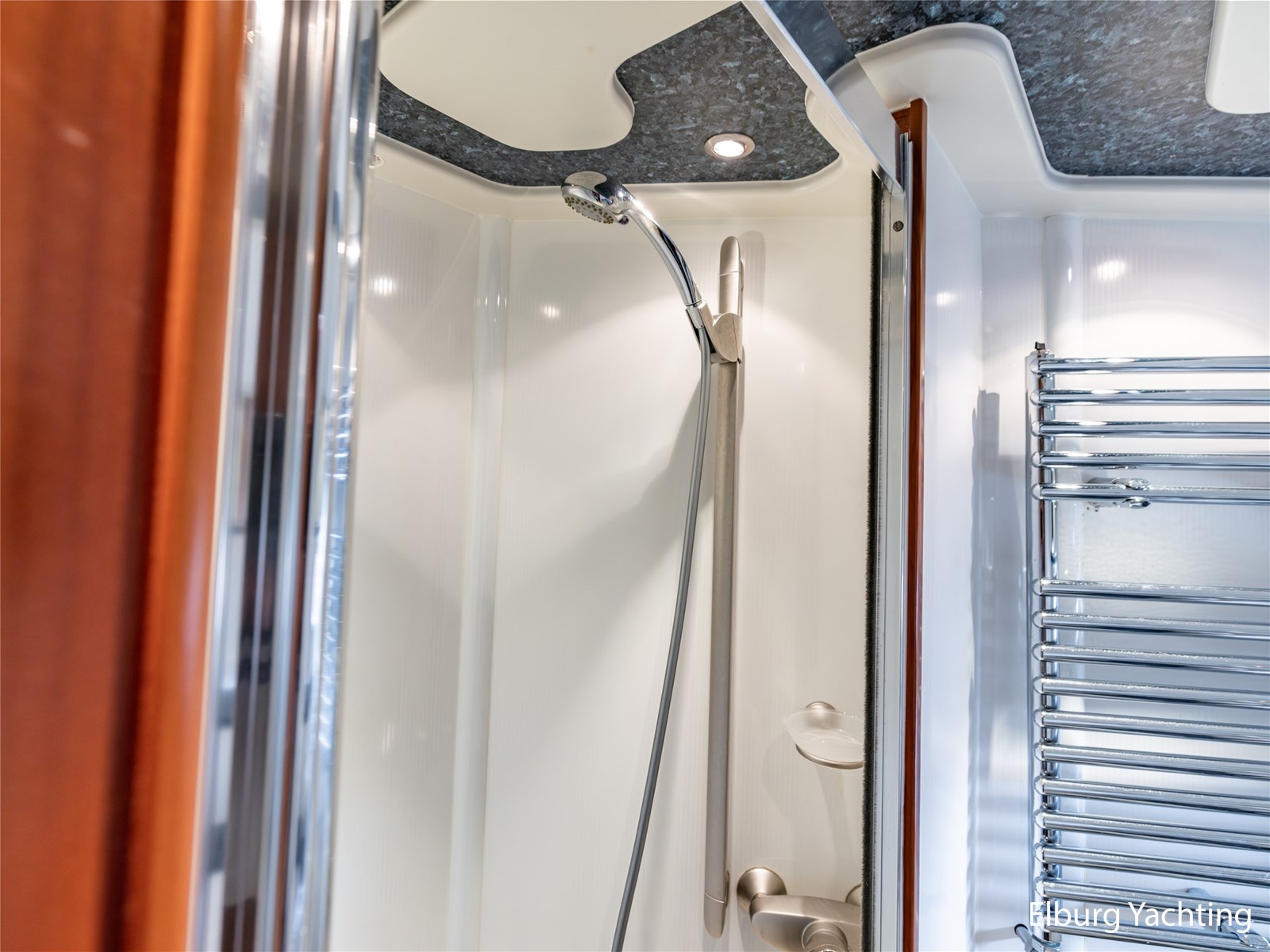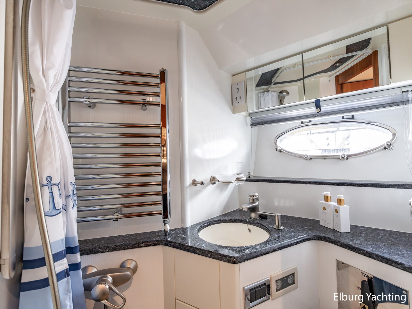Rondom is het jacht voorzien van een prachtig Teakdek in combinatie met een driedubbel uitgevoerde r.v.s. zeerailing. Aan beide zijden zijn railingpoortjes aangebracht met een comfortabele boegopstap waardoor het jacht ook bij de lagere steigers eenvoudig te betreden is. Het zwemplateau is eenvoudig te bereiken via de luie trap aan stuurboordzijde en een hydraulische gangway tevens is het zwemplateau voorzien van een Teakdek met steunen voor de bijboot, welke eenvoudig met de uitschuifbare gangway kunt kranen. Binnen is het jacht voorzien van een warm luxe Kersenhouten interieur met granieten werkbladen. De Kombuis is voorzien van Miele kwaliteitsapparatuur, het is aangenaam op temperatuur te krijgen via de Kabola centrale verwarming. Dimbare verlichting en 3 volwaardige hutten met 3 maal sanitair (3 x elektrische toiletten met 3 douches). Aan boord is de kastruimte goed doordacht en het interieur is prachtig afgewerkt.