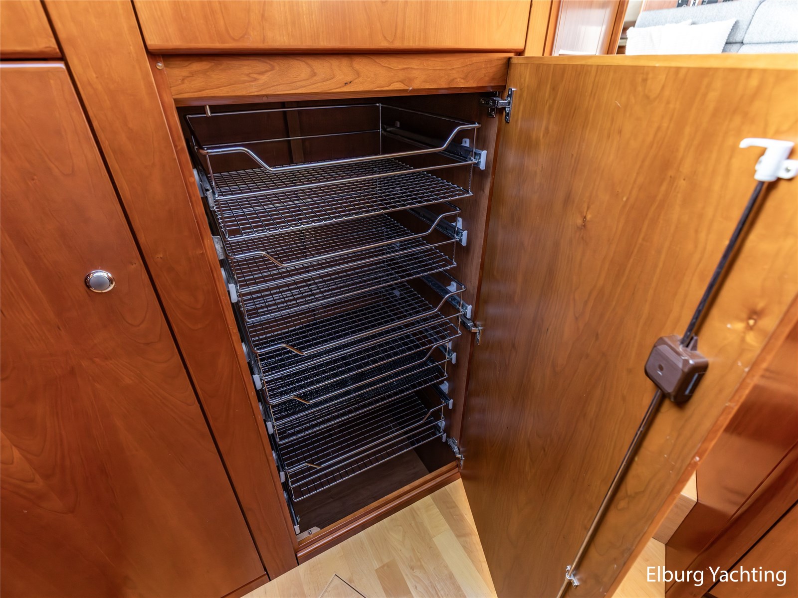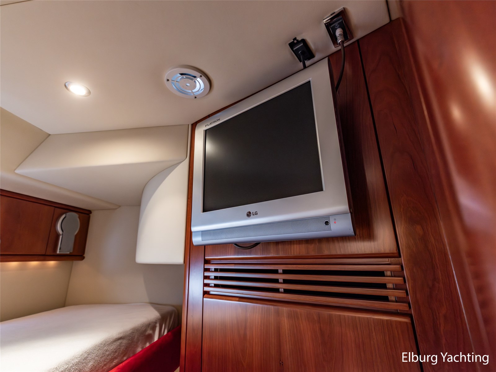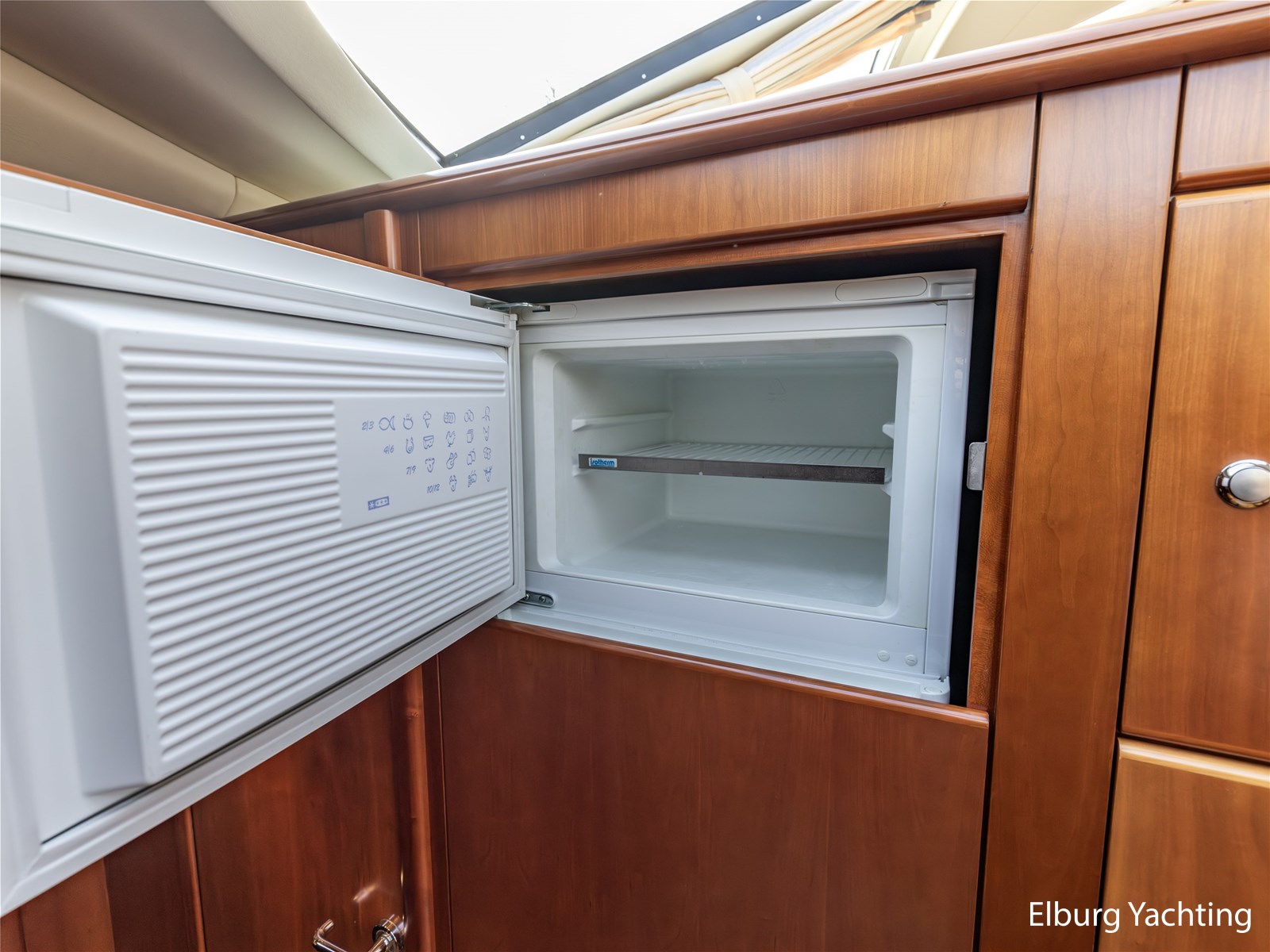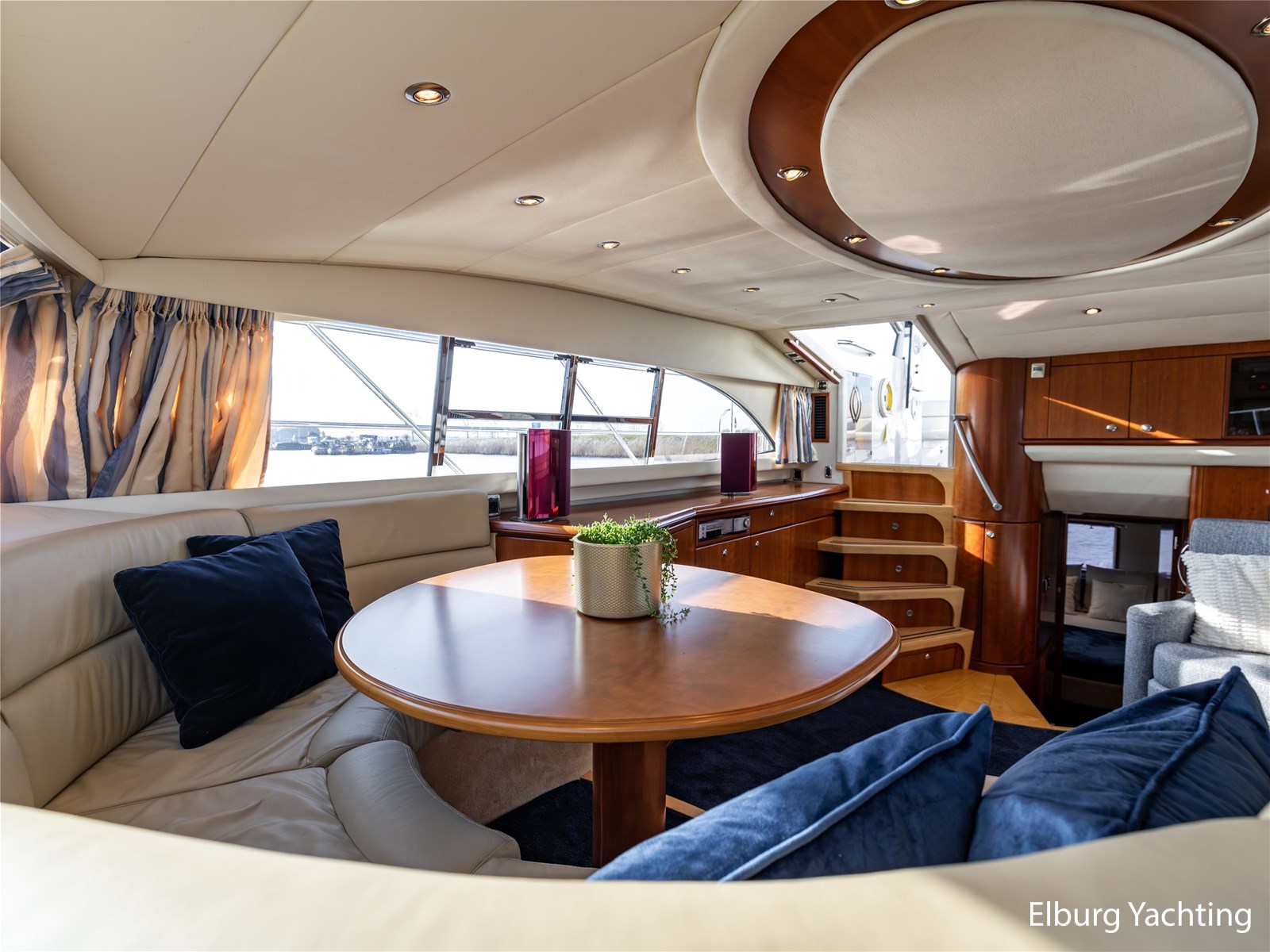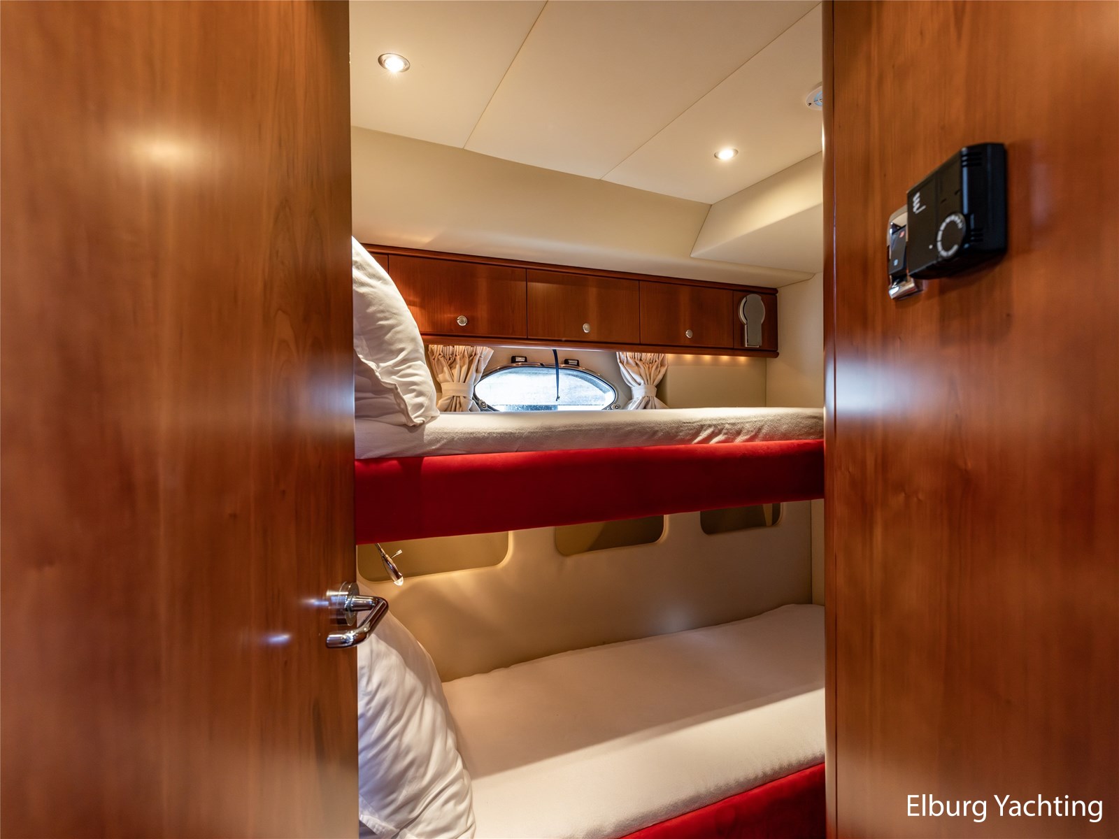 Rondom is het jacht voorzien van een prachtig Teakdek in combinatie met een driedubbel uitgevoerde r.v.s. zeerailing. Aan beide zijden zijn railingpoortjes aangebracht met een comfortabele boegopstap waardoor het jacht ook bij de lagere steigers eenvoudig te betreden is. Het zwemplateau is eenvoudig te bereiken via de luie trap aan stuurboordzijde en een hydraulische gangway tevens is het zwemplateau voorzien van een Teakdek met steunen voor de bijboot, welke eenvoudig met de uitschuifbare gangway kunt kranen. Binnen is het jacht voorzien van een warm luxe Kersenhouten interieur met granieten werkbladen. De Kombuis is voorzien van Miele kwaliteitsapparatuur, het is aangenaam op temperatuur te krijgen via de Kabola centrale verwarming. Dimbare verlichting en 3 volwaardige hutten met 3 maal sanitair (3 x elektrische toiletten met 3 douches). Aan boord is de kastruimte goed doordacht en het interieur is prachtig afgewerkt.