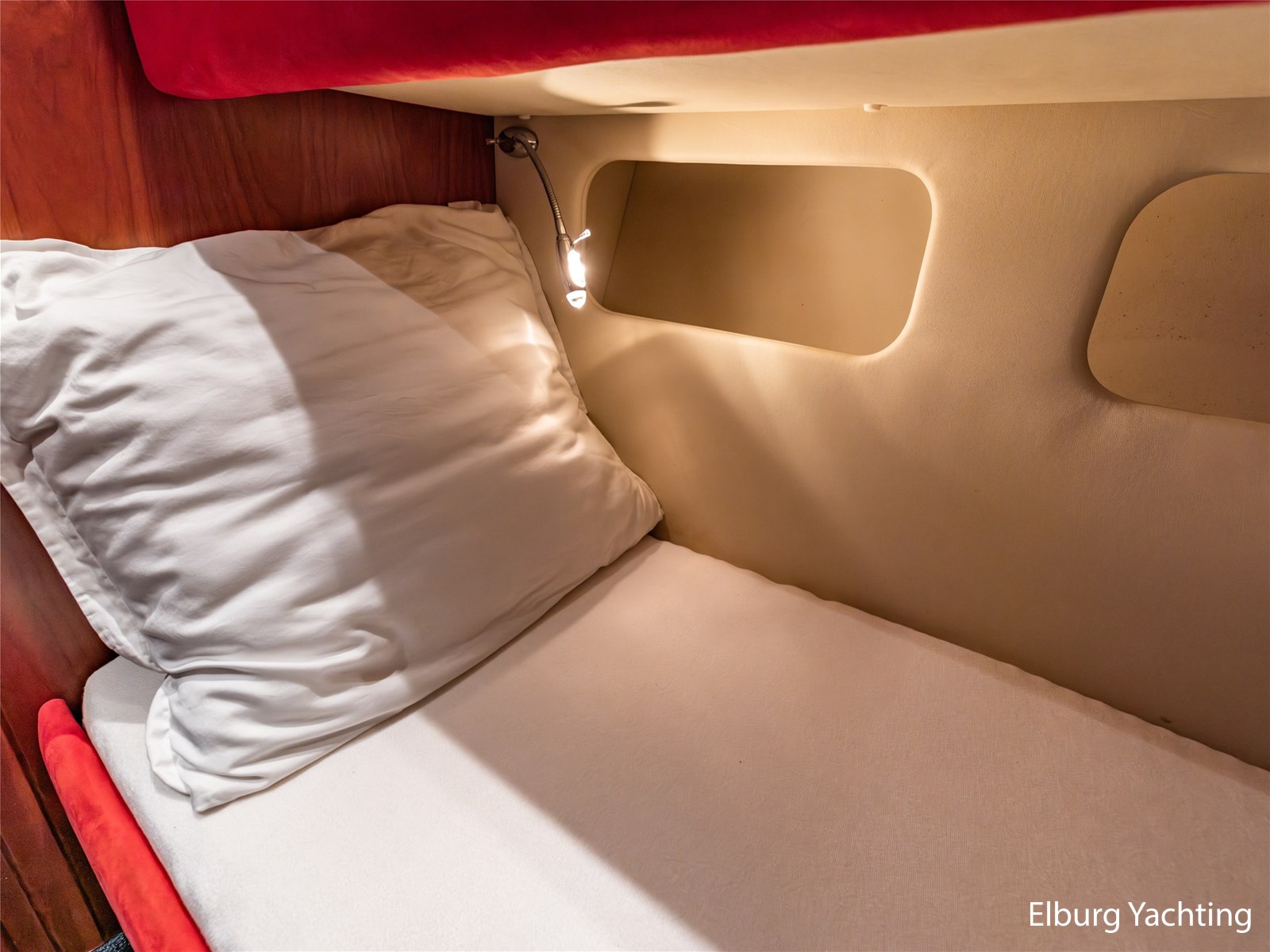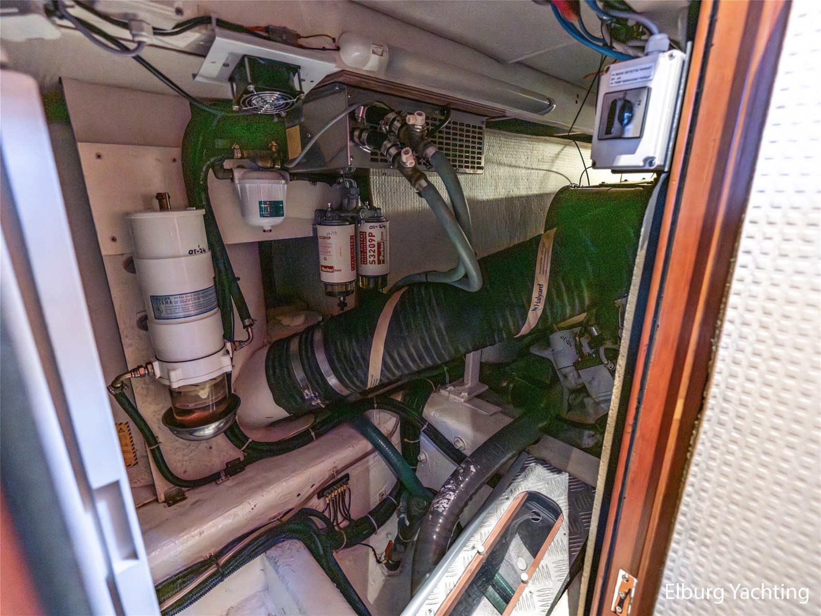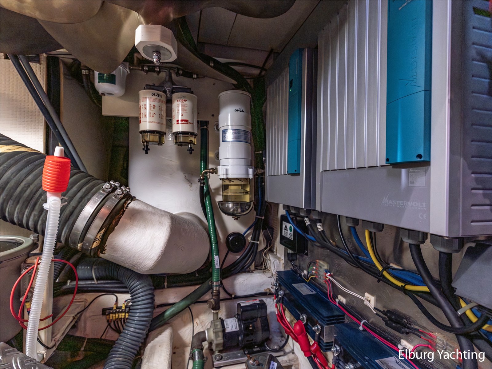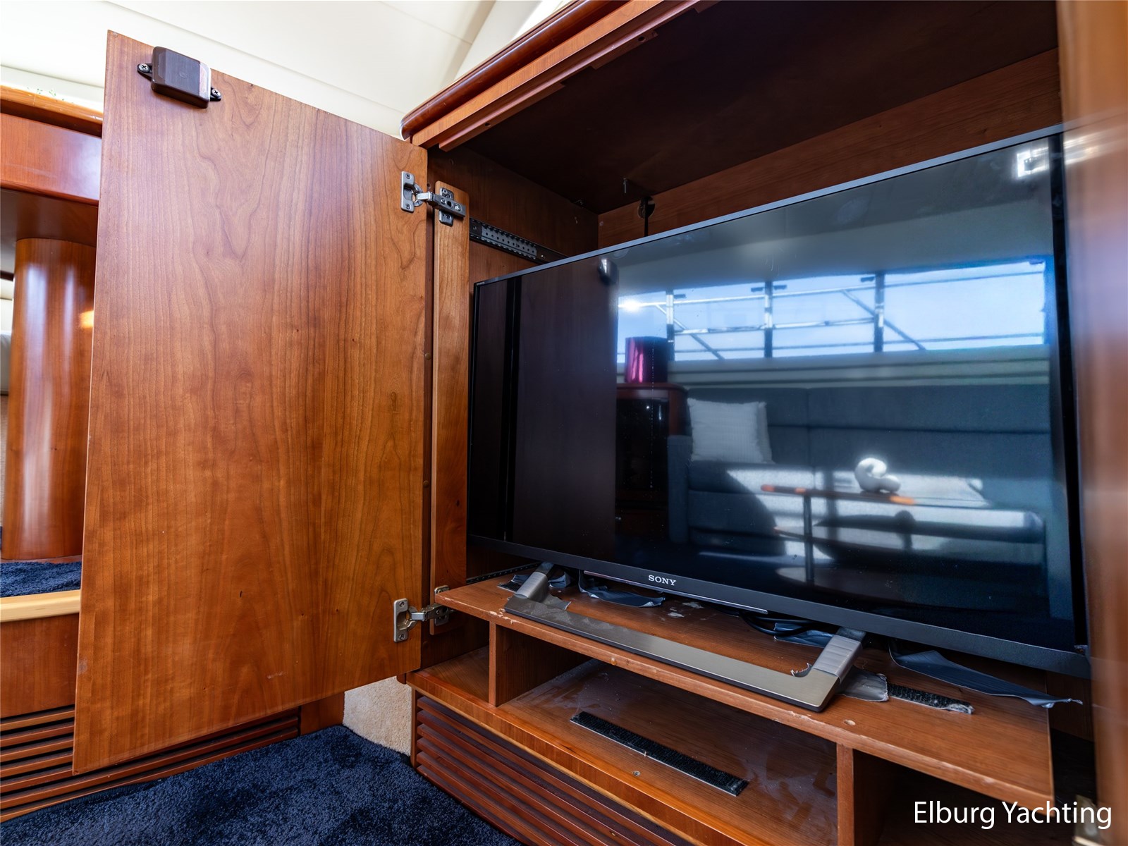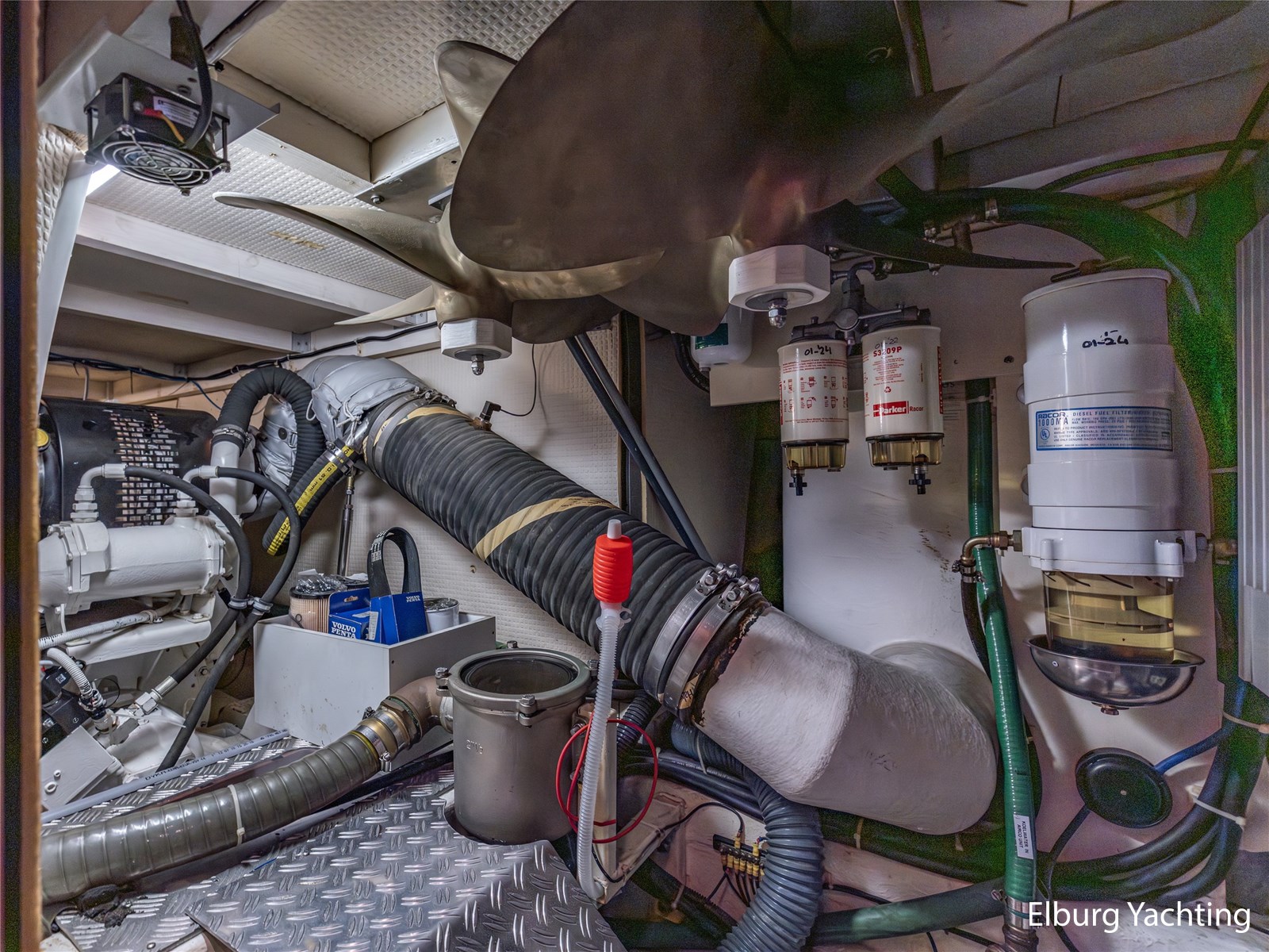 Rondom is het jacht voorzien van een prachtig Teakdek in combinatie met een driedubbel uitgevoerde r.v.s. zeerailing. Aan beide zijden zijn railingpoortjes aangebracht met een comfortabele boegopstap waardoor het jacht ook bij de lagere steigers eenvoudig te betreden is. Het zwemplateau is eenvoudig te bereiken via de luie trap aan stuurboordzijde en een hydraulische gangway tevens is het zwemplateau voorzien van een Teakdek met steunen voor de bijboot, welke eenvoudig met de uitschuifbare gangway kunt kranen. Binnen is het jacht voorzien van een warm luxe Kersenhouten interieur met granieten werkbladen. De Kombuis is voorzien van Miele kwaliteitsapparatuur, het is aangenaam op temperatuur te krijgen via de Kabola centrale verwarming. Dimbare verlichting en 3 volwaardige hutten met 3 maal sanitair (3 x elektrische toiletten met 3 douches). Aan boord is de kastruimte goed doordacht en het interieur is prachtig afgewerkt.