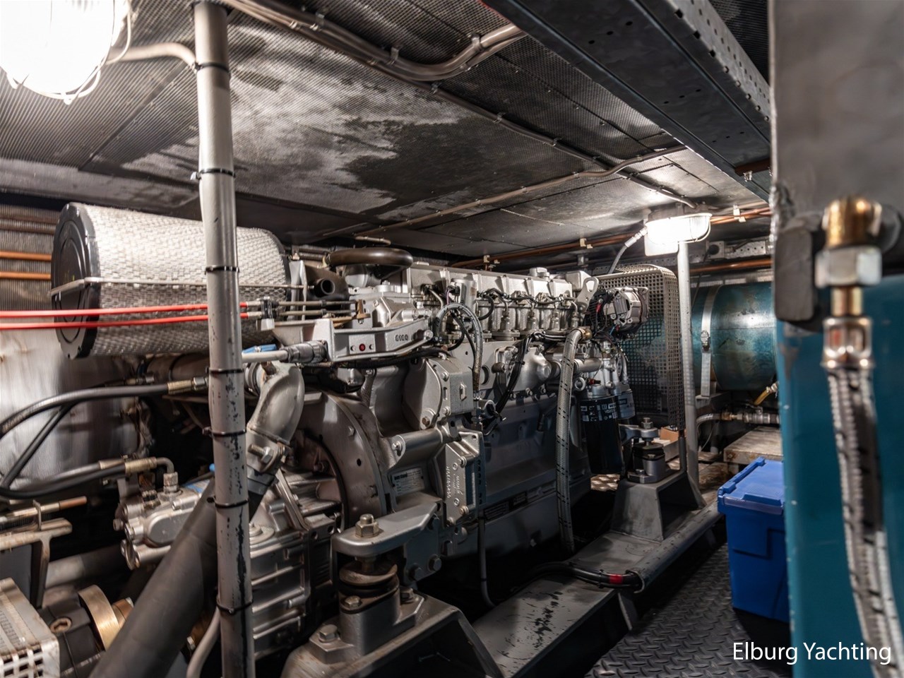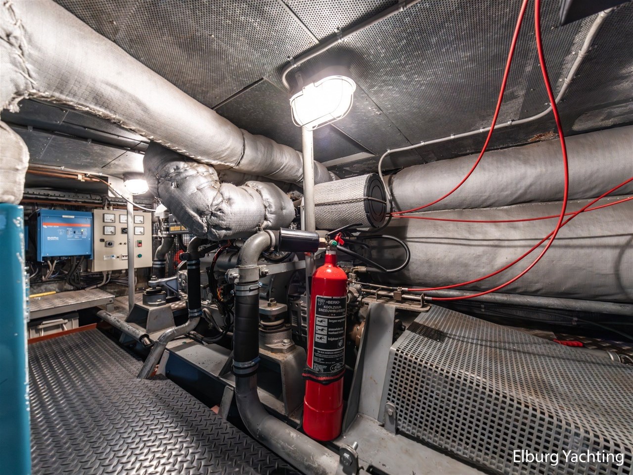 The engine room is generously sized and provides good access to all technical systems. The engines are indirectly cooled via a Blokland vlak-/beunkoeler and the ship is equipped with a VDO rudder position indicator. In addition, she has five deck hatches in the superstructure for ventilation. She can be steered both, from the saloon and from the aft deck. The side decks run level all around, ensuring safe passage on deck. In both the bow and stern, there is a steel collision bulkhead, and she is equipped with two new propellers as spares on board.