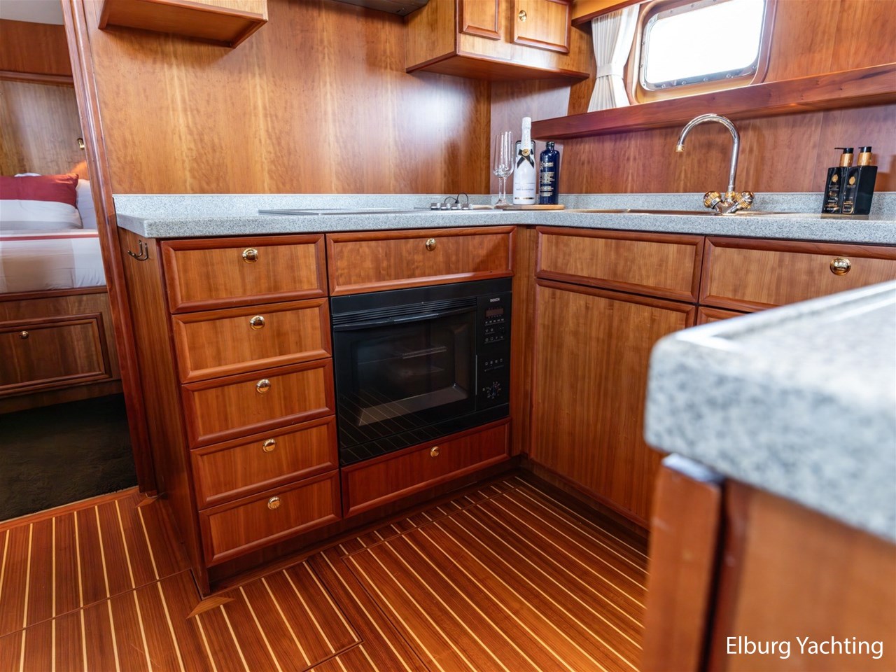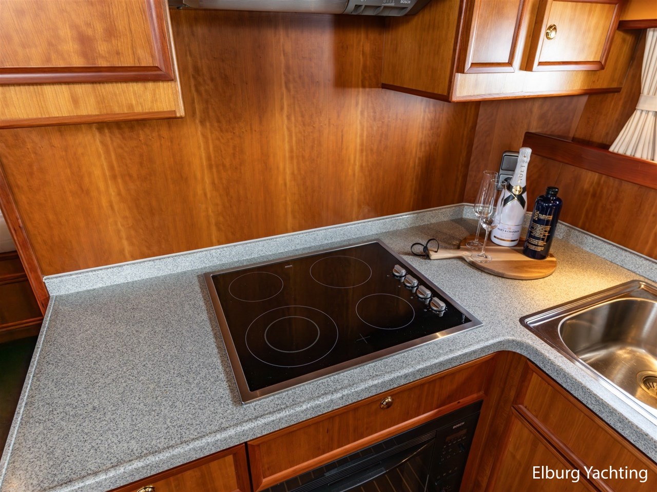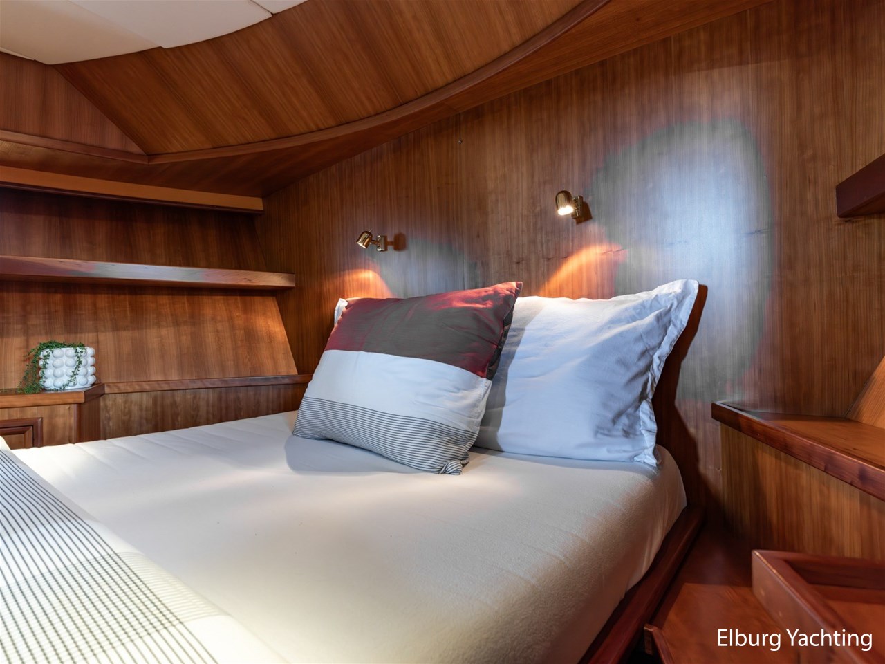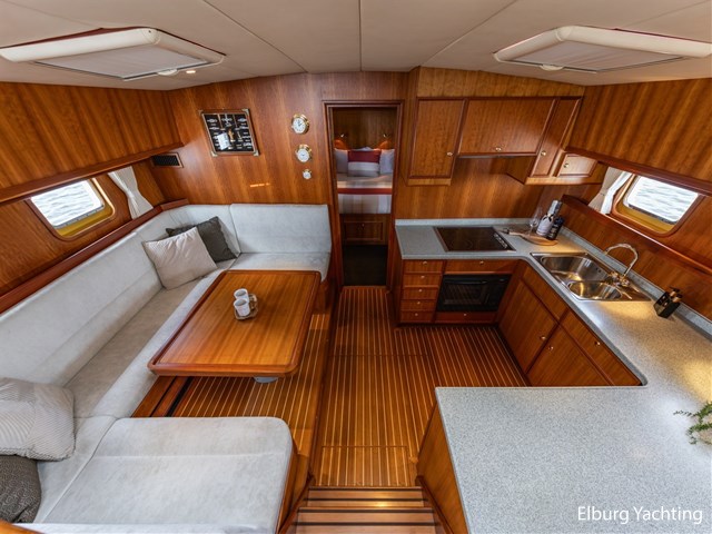 This ship has two spacious double cabins, both equipped with private en-suite bathrooms. The saloon and the galley are openly connected, creating a spacious feeling and pleasant interaction. The interior is richly finished with great attention to detail.