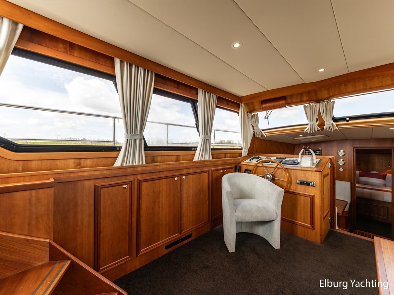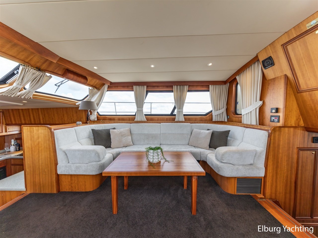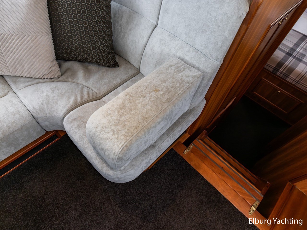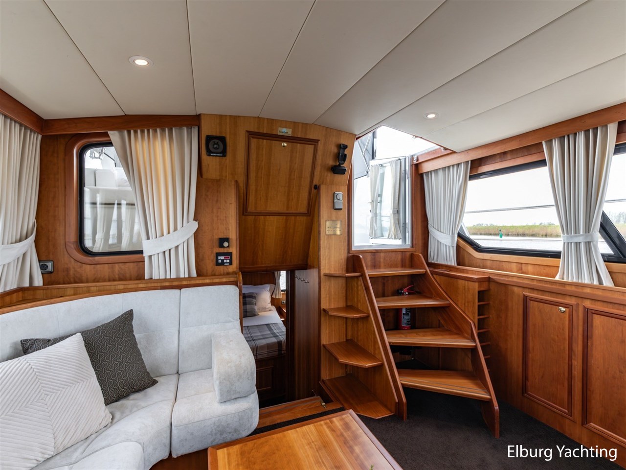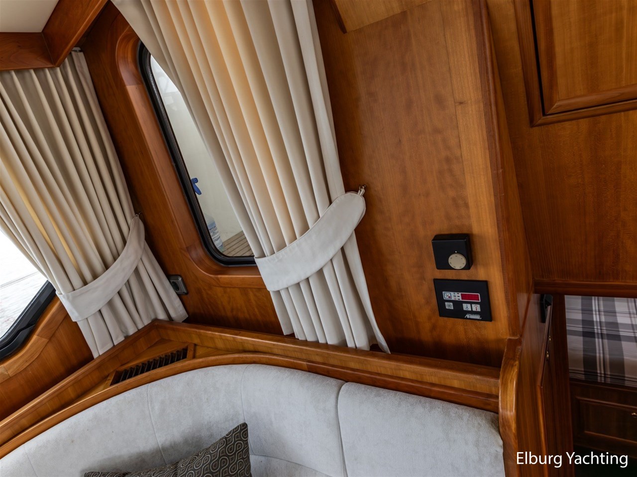 - Luxurious teak ship interior with light-colored fabric upholstery