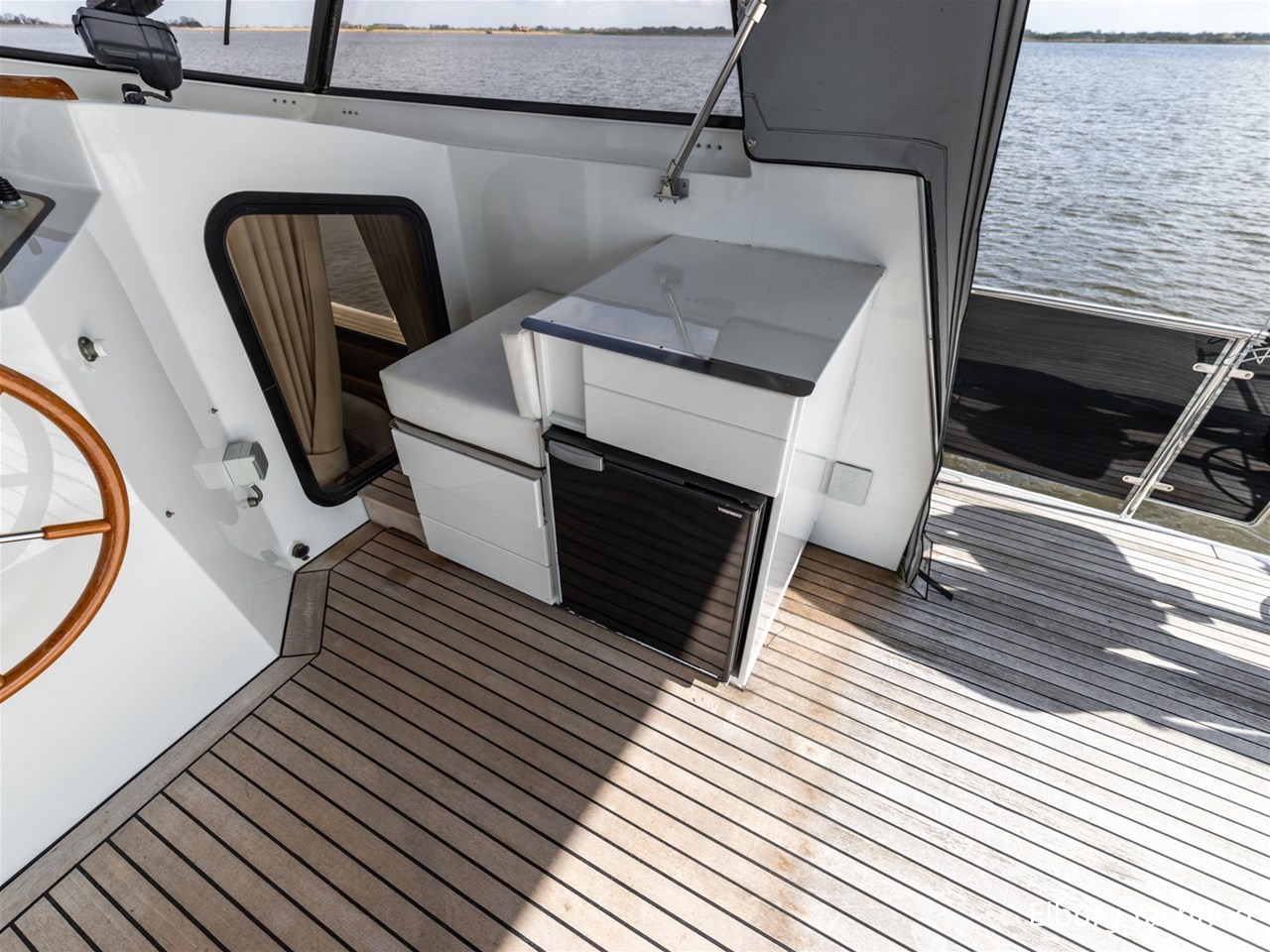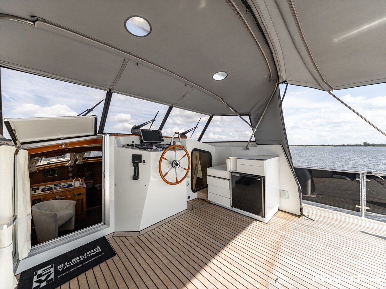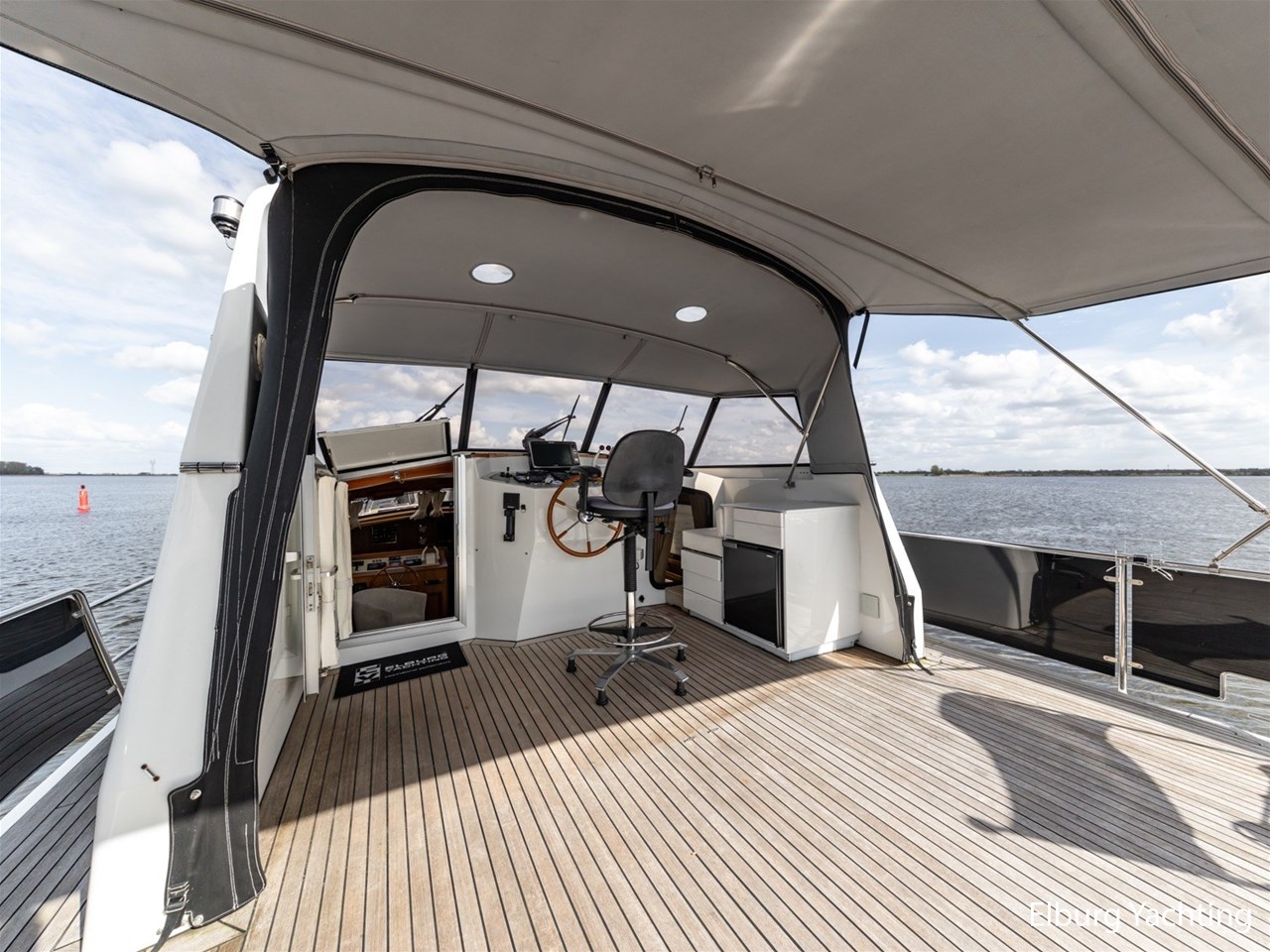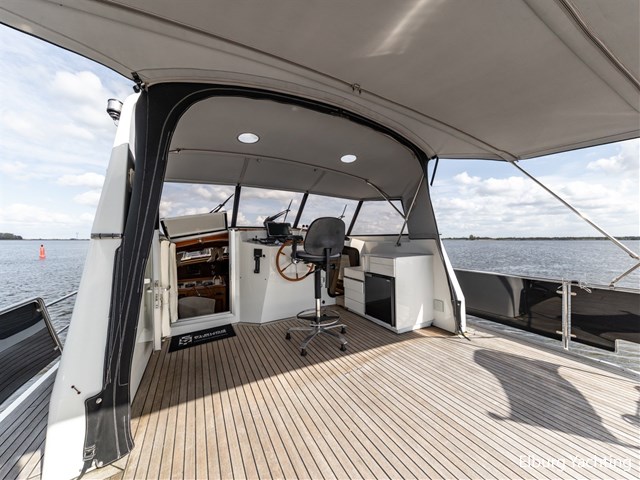 This ship, named “Lieneke”, is equipped with, among other things, a lockable enclosure around the helm position and a foldable bimini over the aft deck. The aft deck features transparent bulwark panels in the railing, a foldable radar arch, and a removable stainless-steel side ladder with good handholds, as well as a cover for the exterior steering position, a companion bench, a removable helm chair, and stainless-steel fender holders on the railing suitable for 10 fenders.