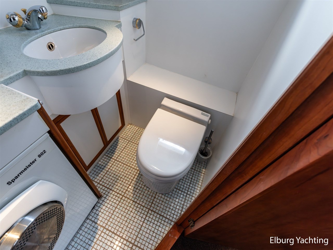 The saloon is spacious and features two sliding windows, a tilt window, and a Pioneer radio. The galley includes a Bosch dishwasher, and in the aft bathroom there is a washing machine, although its working condition is unknown.