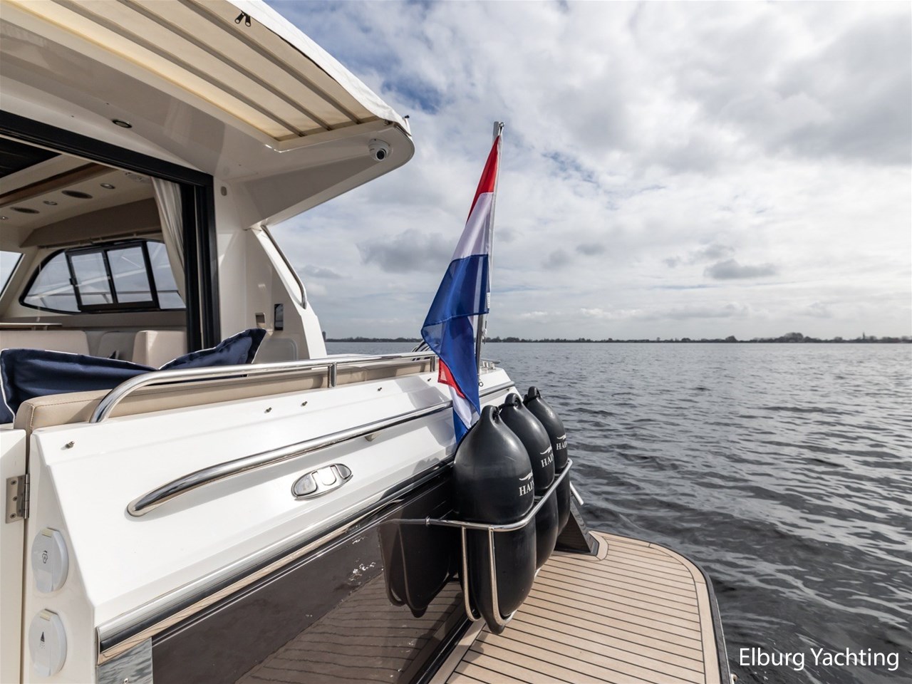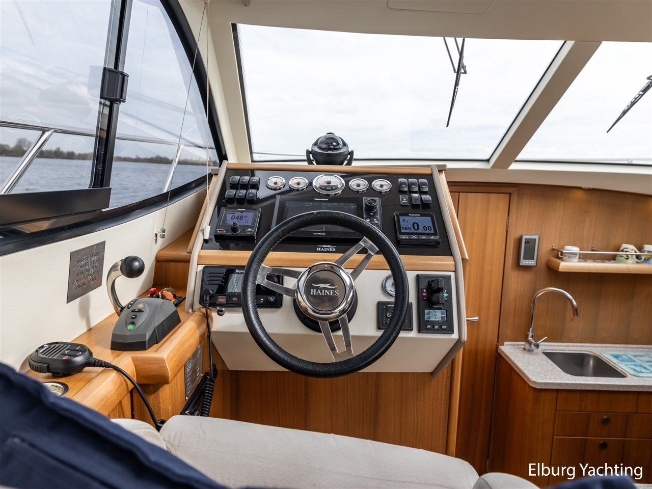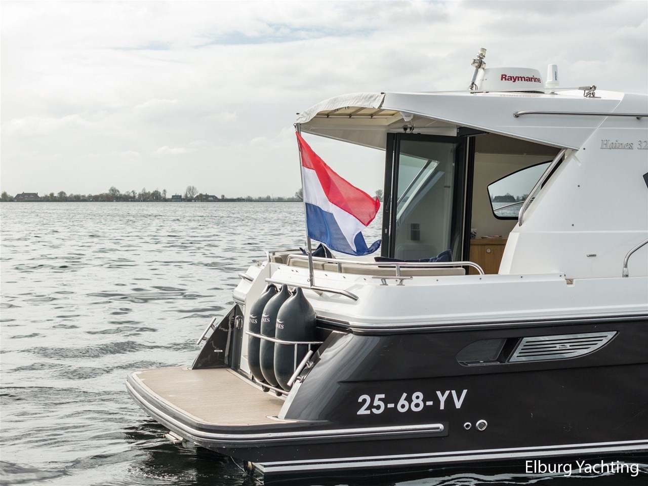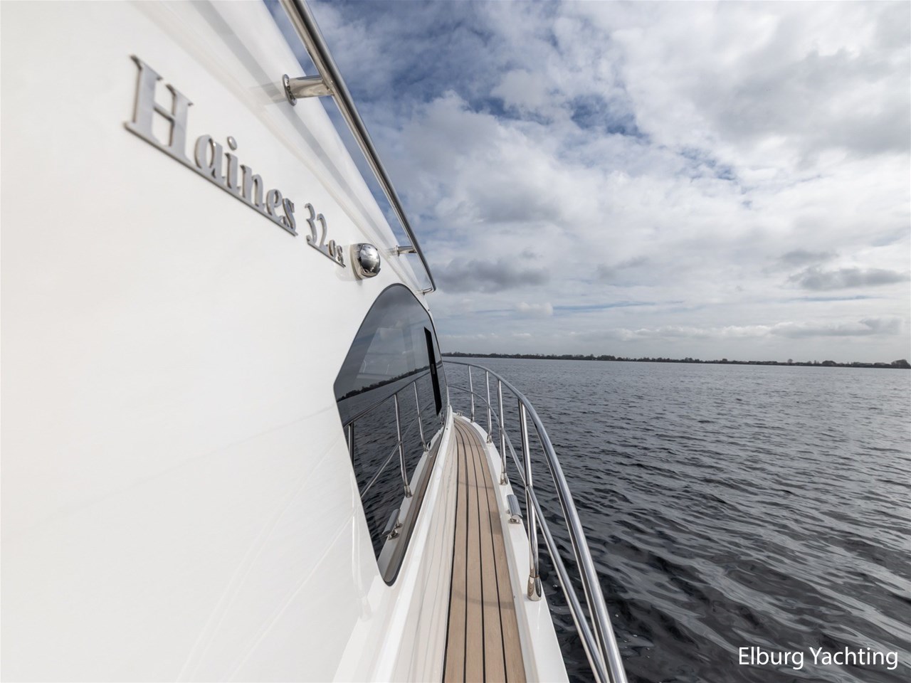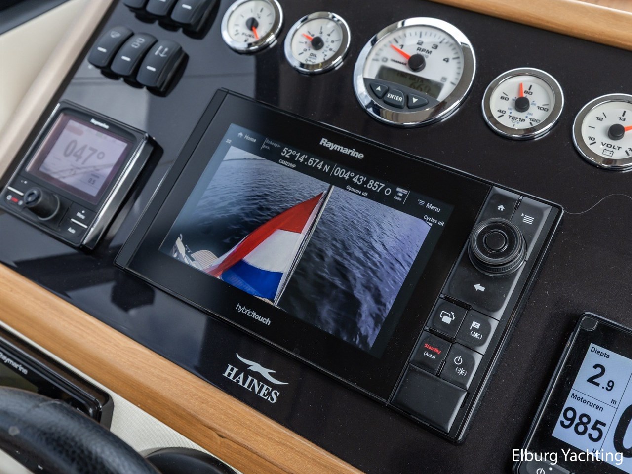 The Haines 32 Offshore is goanywhere open-cockpit motor yacht from the renowned Haines Offshore range in excellent maintained condition. This Haines 32 Offshore is designed for both leisurely cruises and sporty sailing on inland waterways, rivers, and the open sea. Thanks to its specially designed hull and powerful 260 hp Yanmar engine, the boat offers comfort at both low speeds and high speeds up to 17 knots. The yacht makes optimal use of the available space thanks to a smart layout. The open cockpit creates a direct connection to the water for an optimal boating experience. The three folding doors are equipped with screens and curtains, which enhance the connection between the outside and inside. The cockpit can be fully enclosed with a cockpit cover, making it comfortable to use in all weather conditions. There are two large storage compartments under the rear bench, and additional storage space is available in the port and starboard side compartments, for example for mooring lines, jackets, or other accessories. The saloon features high-quality woodwork and is equipped with a comfortable U-shaped bench, providing a panoramic view of the sailing area. An electrically adjustable bench can easily be converted into an additional passenger seat facing the direction of travel. Additionally, the saloon features an electrically operated sliding roof, equipped with both a sunshade and a mosquito net screen. The boat is equipped with forced-air heating in all areas. The floor in the salon, galley, and bedroom features high-quality PVC flooring. The lockable owner’s cabin offers a freestanding double bed, and the salon sofa can be converted into two additional berths. The galley is luxuriously and practically appointed, featuring Avonite countertops, convenient storage drawers, and a 3-burner induction cooktop. There is no gas on board, so everything is electrically powered for added safety. The head is equipped with an electrically operated Tecma toilet, mounted on a raised platform and connected to a holding tank, with the option to discharge directly into surface water via a bypass valve through the hull. In addition, the space features a washing machine (Daewoo DWD-CV702WP, 2022) with a 3 kg capacity. For added convenience and storage, there are spacious shelves, two drawers under the sink, and a large storage compartment under the washing machine. Equipment and extras include: water tanks replaced with plastic ones in 2021, new Whisper Power 8kW generator installed in 2021, electrically operated aft hatch for added convenience, Navionics Raymarine chart update in 2024, TV on a lift in the saloon, onboard Wi-Fi router for internet (SIM card not included), 4 x solar panels with control unit (2x 39W + 2x 54W), rearview camera via chartplotter screen, searchlight, dimmers for saloon lighting, Radio/CD with USB, rudder position indicator, 12-volt power supply, shore power alarm and “Where is my boat?” system, remote control for lighting upon arrival, deck wash pump, frost-proof Gardena hose reel, also for refueling. Clearance height approx. 2.75 m. Want to experience this Haines 32 Offshore for yourself? This Haines is currently available for viewing by appointment in Aalsmeer. For questions and/or to schedule a viewing, you are welcome at Elburg Yachting 7 days a week.