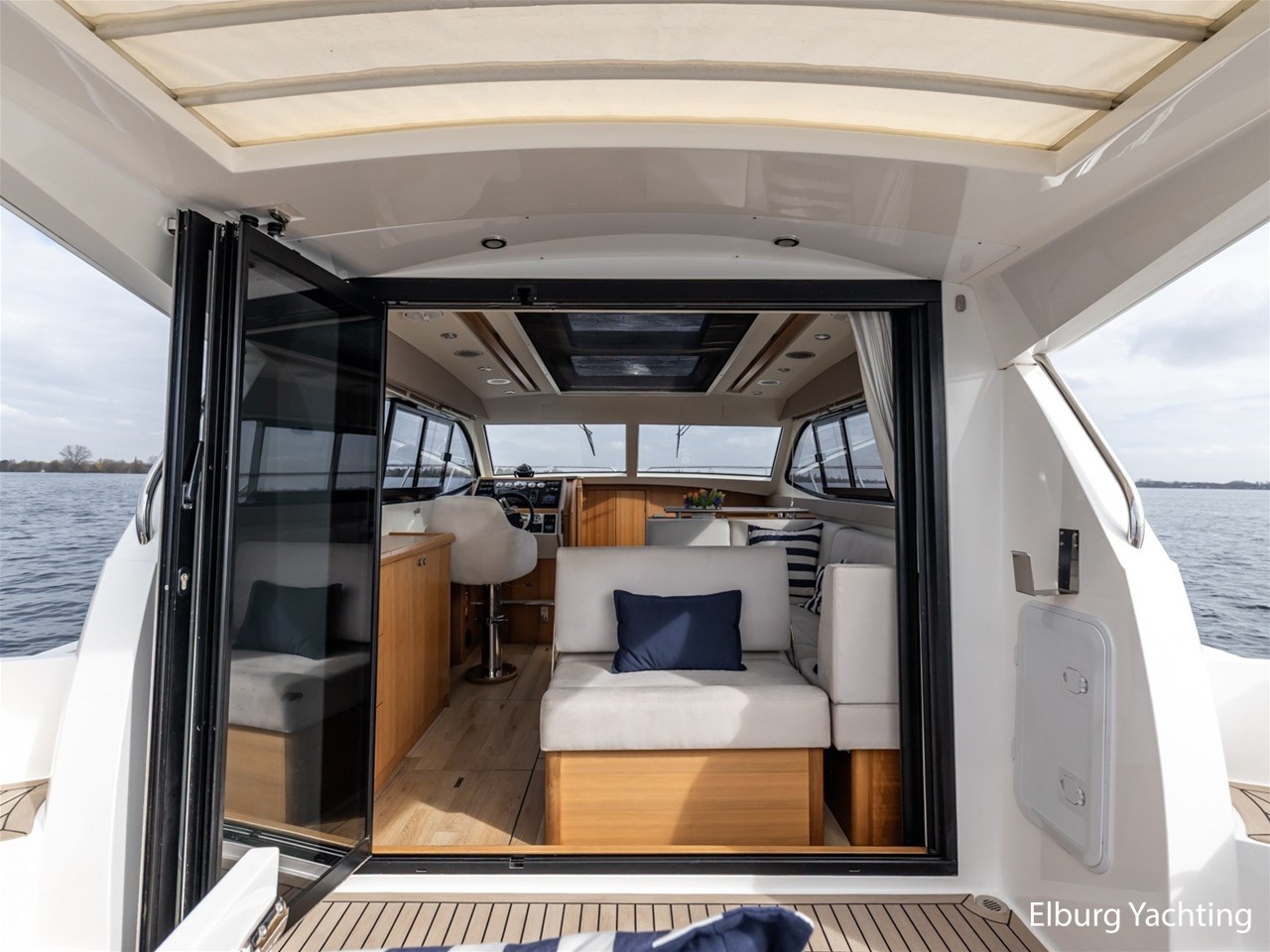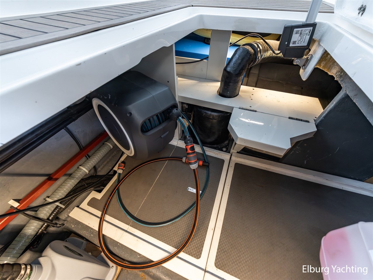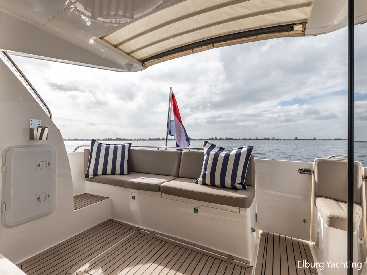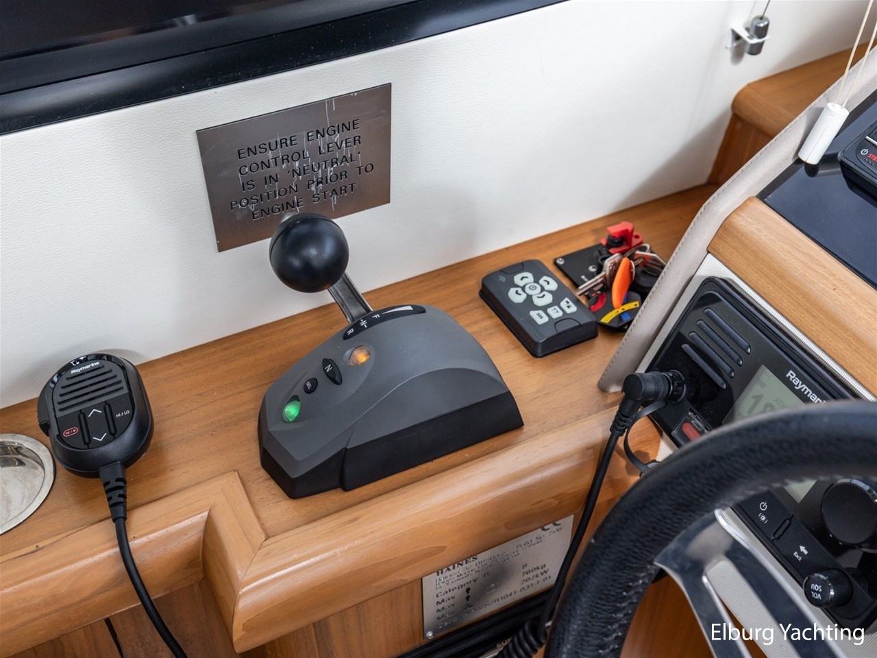 The Haines 32 Offshore is goanywhere open-cockpit motor yacht from the renowned Haines Offshore range in excellent maintained condition. This Haines 32 Offshore is designed for both leisurely cruises and sporty sailing on inland waterways, rivers, and the open sea. Thanks to its specially designed hull and powerful 260 hp Yanmar engine, the boat offers comfort at both low speeds and high speeds up to 17 knots. The yacht makes optimal use of the available space thanks to a smart layout. The open cockpit creates a direct connection to the water for an optimal boating experience. The three folding doors are equipped with screens and curtains, which enhance the connection between the outside and inside. The cockpit can be fully enclosed with a cockpit cover, making it comfortable to use in all weather conditions. There are two large storage compartments under the rear bench, and additional storage space is available in the port and starboard side compartments, for example for mooring lines, jackets, or other accessories. The saloon features high-quality woodwork and is equipped with a comfortable U-shaped bench, providing a panoramic view of the sailing area. An electrically adjustable bench can easily be converted into an additional passenger seat facing the direction of travel. Additionally, the saloon features an electrically operated sliding roof, equipped with both a sunshade and a mosquito net screen. The boat is equipped with forced-air heating in all areas. The floor in the salon, galley, and bedroom features high-quality PVC flooring. The lockable owner’s cabin offers a freestanding double bed, and the salon sofa can be converted into two additional berths. The galley is luxuriously and practically appointed, featuring Avonite countertops, convenient storage drawers, and a 3-burner induction cooktop. There is no gas on board, so everything is electrically powered for added safety. The head is equipped with an electrically operated Tecma toilet, mounted on a raised platform and connected to a holding tank, with the option to discharge directly into surface water via a bypass valve through the hull. In addition, the space features a washing machine (Daewoo DWD-CV702WP, 2022) with a 3 kg capacity. For added convenience and storage, there are spacious shelves, two drawers under the sink, and a large storage compartment under the washing machine. Equipment and extras include: water tanks replaced with plastic ones in 2021, new Whisper Power 8kW generator installed in 2021, electrically operated aft hatch for added convenience, Navionics Raymarine chart update in 2024, TV on a lift in the saloon, onboard Wi-Fi router for internet (SIM card not included), 4 x solar panels with control unit (2x 39W + 2x 54W), rearview camera via chartplotter screen, searchlight, dimmers for saloon lighting, Radio/CD with USB, rudder position indicator, 12-volt power supply, shore power alarm and “Where is my boat?” system, remote control for lighting upon arrival, deck wash pump, frost-proof Gardena hose reel, also for refueling. Clearance height approx. 2.75 m. Want to experience this Haines 32 Offshore for yourself? This Haines is currently available for viewing by appointment in Aalsmeer. For questions and/or to schedule a viewing, you are welcome at Elburg Yachting 7 days a week.