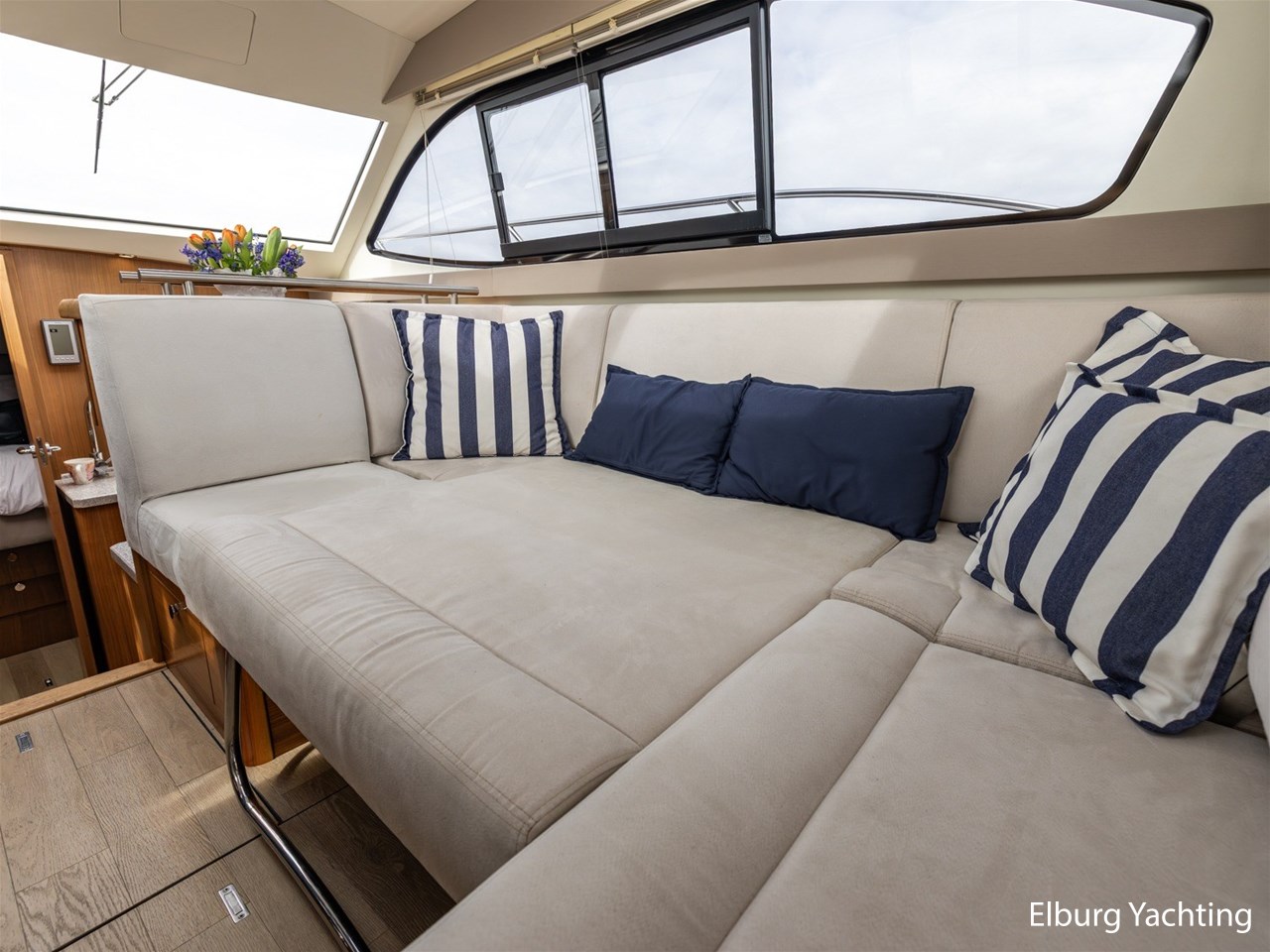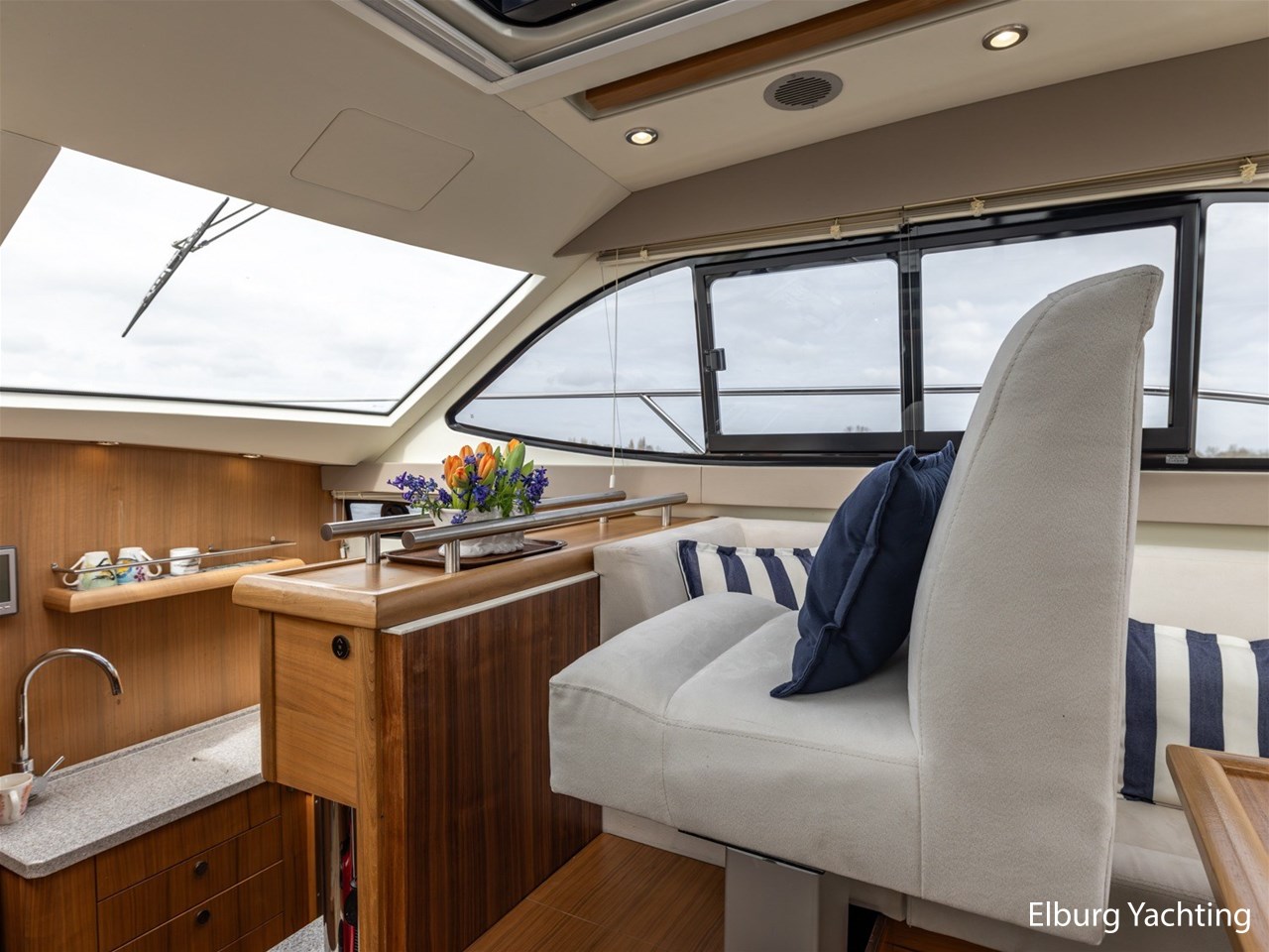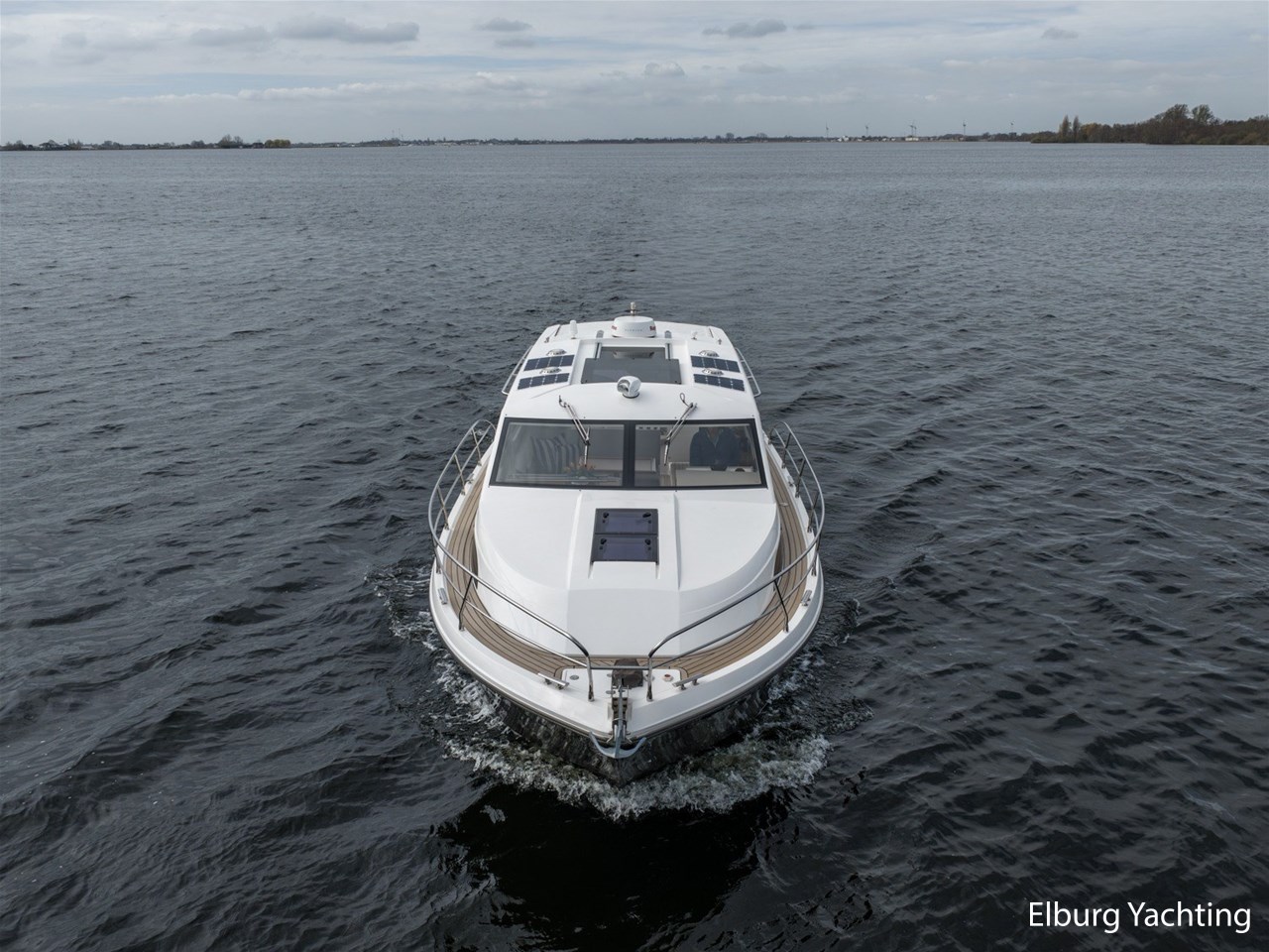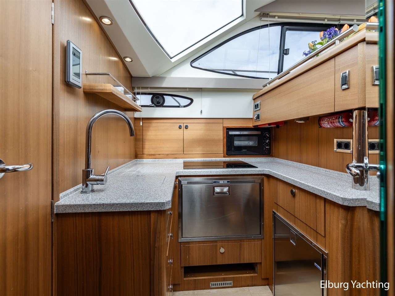 The Haines 32 Offshore is goanywhere open-cockpit motor yacht from the renowned Haines Offshore range in excellent maintained condition. This Haines 32 Offshore is designed for both leisurely cruises and sporty sailing on inland waterways, rivers, and the open sea. Thanks to its specially designed hull and powerful 260 hp Yanmar engine, the boat offers comfort at both low speeds and high speeds up to 17 knots. The yacht makes optimal use of the available space thanks to a smart layout. The open cockpit creates a direct connection to the water for an optimal boating experience. The three folding doors are equipped with screens and curtains, which enhance the connection between the outside and inside. The cockpit can be fully enclosed with a cockpit cover, making it comfortable to use in all weather conditions. There are two large storage compartments under the rear bench, and additional storage space is available in the port and starboard side compartments, for example for mooring lines, jackets, or other accessories. The saloon features high-quality woodwork and is equipped with a comfortable U-shaped bench, providing a panoramic view of the sailing area. An electrically adjustable bench can easily be converted into an additional passenger seat facing the direction of travel. Additionally, the saloon features an electrically operated sliding roof, equipped with both a sunshade and a mosquito net screen. The boat is equipped with forced-air heating in all areas. The floor in the salon, galley, and bedroom features high-quality PVC flooring. The lockable owner’s cabin offers a freestanding double bed, and the salon sofa can be converted into two additional berths. The galley is luxuriously and practically appointed, featuring Avonite countertops, convenient storage drawers, and a 3-burner induction cooktop. There is no gas on board, so everything is electrically powered for added safety. The head is equipped with an electrically operated Tecma toilet, mounted on a raised platform and connected to a holding tank, with the option to discharge directly into surface water via a bypass valve through the hull. In addition, the space features a washing machine (Daewoo DWD-CV702WP, 2022) with a 3 kg capacity. For added convenience and storage, there are spacious shelves, two drawers under the sink, and a large storage compartment under the washing machine. Equipment and extras include: water tanks replaced with plastic ones in 2021, new Whisper Power 8kW generator installed in 2021, electrically operated aft hatch for added convenience, Navionics Raymarine chart update in 2024, TV on a lift in the saloon, onboard Wi-Fi router for internet (SIM card not included), 4 x solar panels with control unit (2x 39W + 2x 54W), rearview camera via chartplotter screen, searchlight, dimmers for saloon lighting, Radio/CD with USB, rudder position indicator, 12-volt power supply, shore power alarm and “Where is my boat?” system, remote control for lighting upon arrival, deck wash pump, frost-proof Gardena hose reel, also for refueling. Clearance height approx. 2.75 m. Want to experience this Haines 32 Offshore for yourself? This Haines is currently available for viewing by appointment in Aalsmeer. For questions and/or to schedule a viewing, you are welcome at Elburg Yachting 7 days a week.