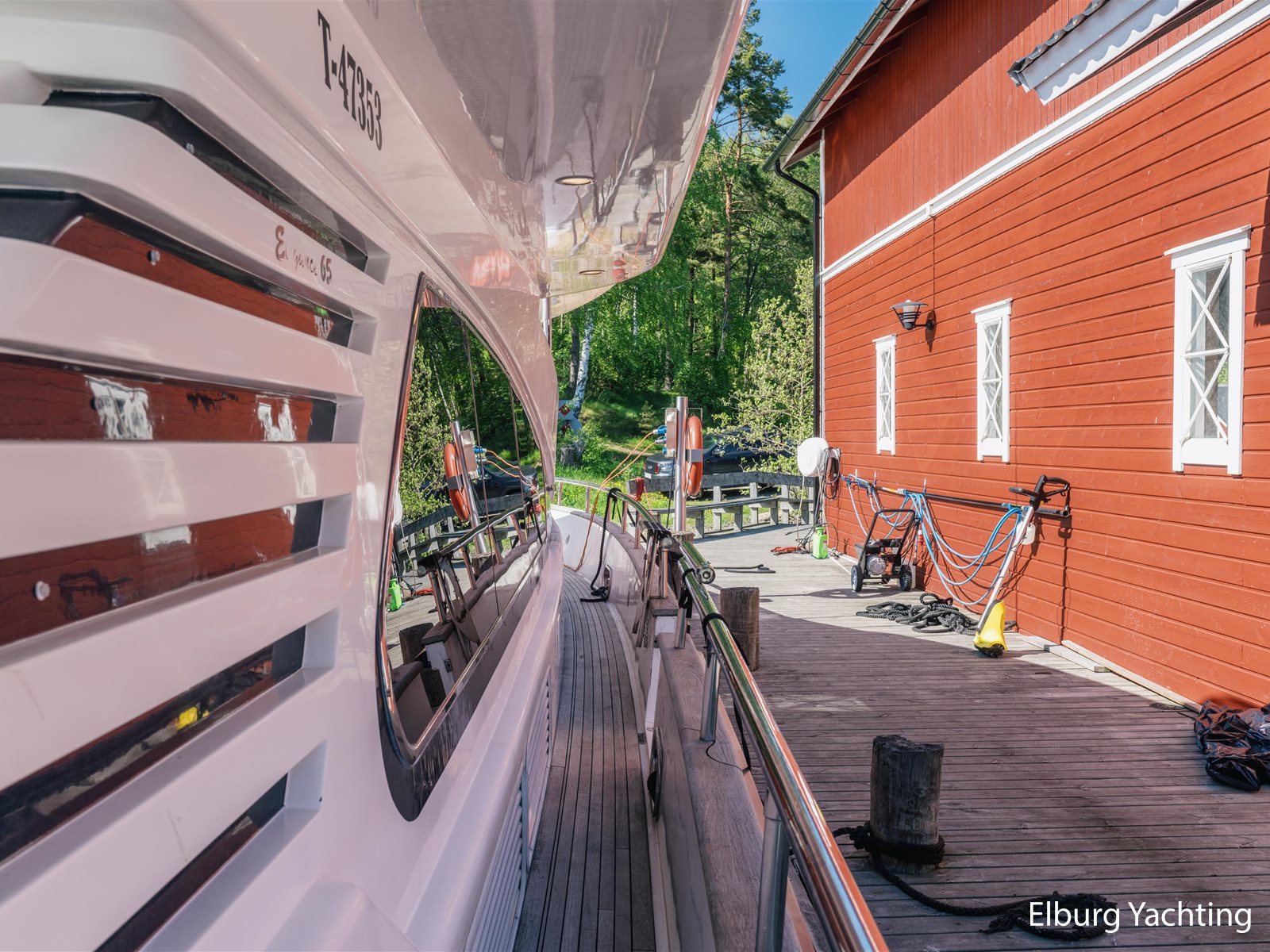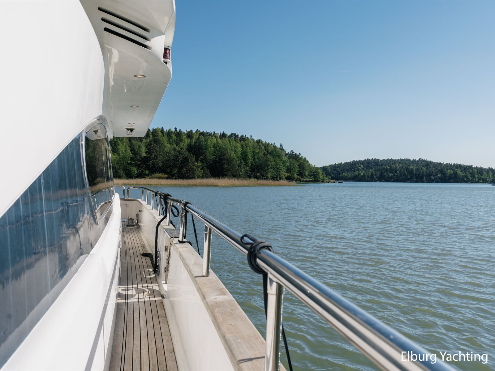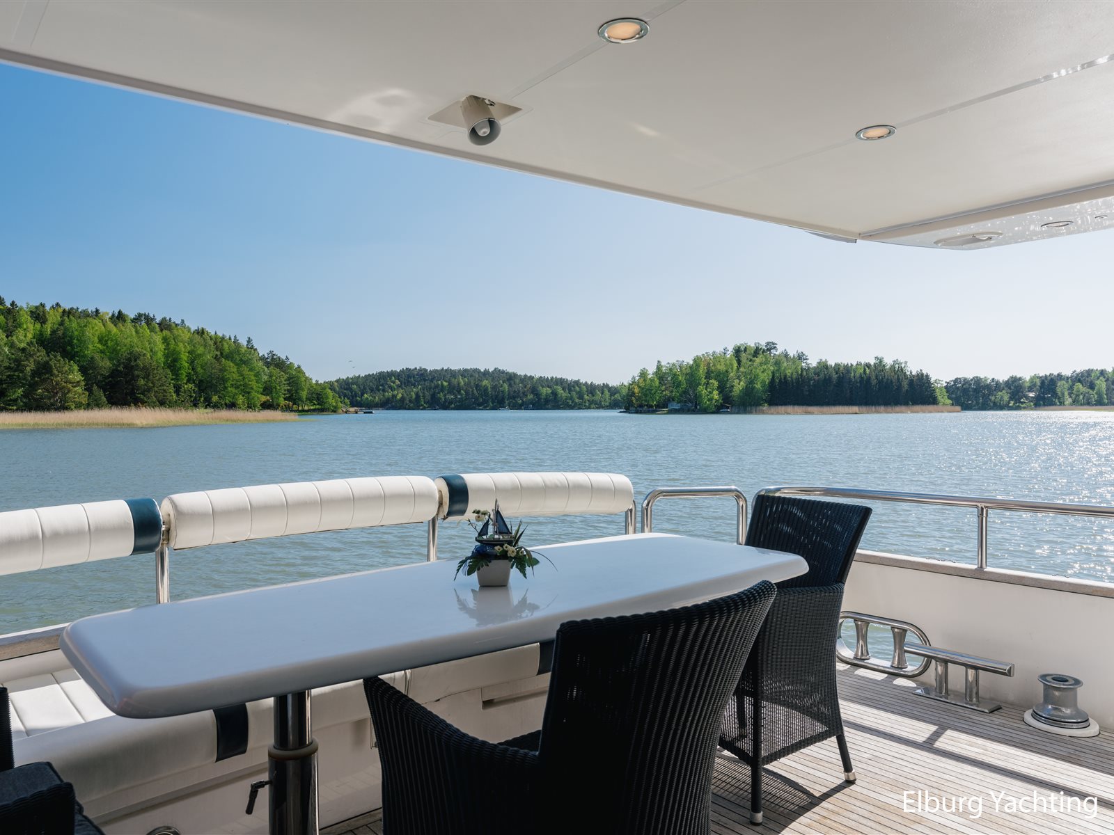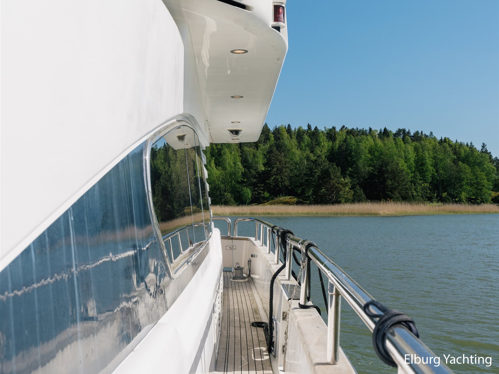 Deze Elegance 65 is voorzien van: Teakhouten potdeksel rondom, vaste zitbank in op achterdek met bijbehorende kussens, achterdek en salon gelijkvloers, fraaie r.v.s. halfronde schuifpui naar salon, 'luie' buitentrap naar flybridge, kussens voor buitenzit flybridge, buitenentree naar lazarette en machinekamer tevens ook via binnendoor bereikbaar, 4 blads schroeven, Maxwell verhaallier op achterdek, halogeenverlichting + dimmers, zijdeur aan SB zijde bij stuurstand, luxe vaarstoel, alle granieten vloeren zijn verwarmd, intern + extern camera systeem, Raytheon loudhailer, VDO logic windmeter, Besenzoni gangway, Miele was-/droogcombinatie, Miele vaatwasser, groot zonnedek op voorschip, wijnkoelinstallatie in achterschip, dekwaspomp, volledige buitenkeuken op flybridge, deels overdekte en brede gangboorden, B&O geluidsinstallatie, klapbare radarbeugel, veel bergruimte, zeer uitgebreid + luxueus afgewerkt schip. Het jacht is op afspraak te bezichtigen in Finland. 3D interieur impressie: https://my.matterport.com/show/?m=2QNkpAVueRm Voor vragen en/of het maken van een afspraak bent u van harte welkom 7 dagen in de week bij Elburg Yachting