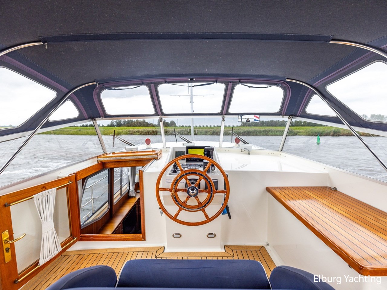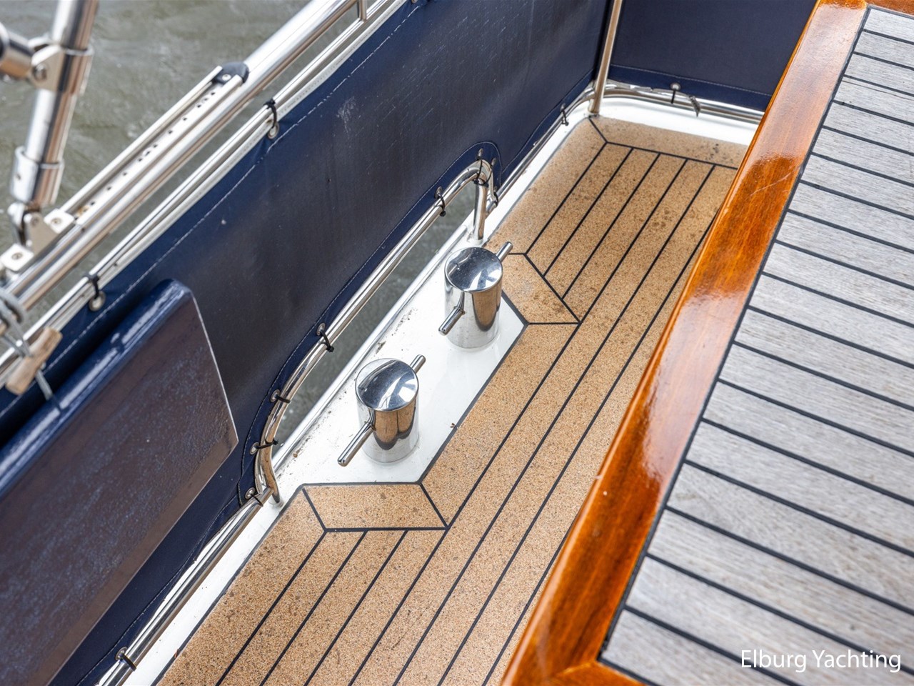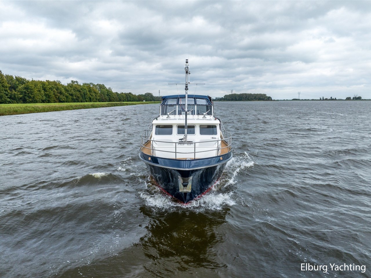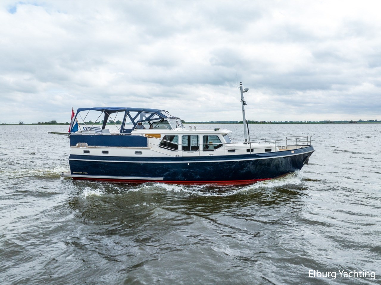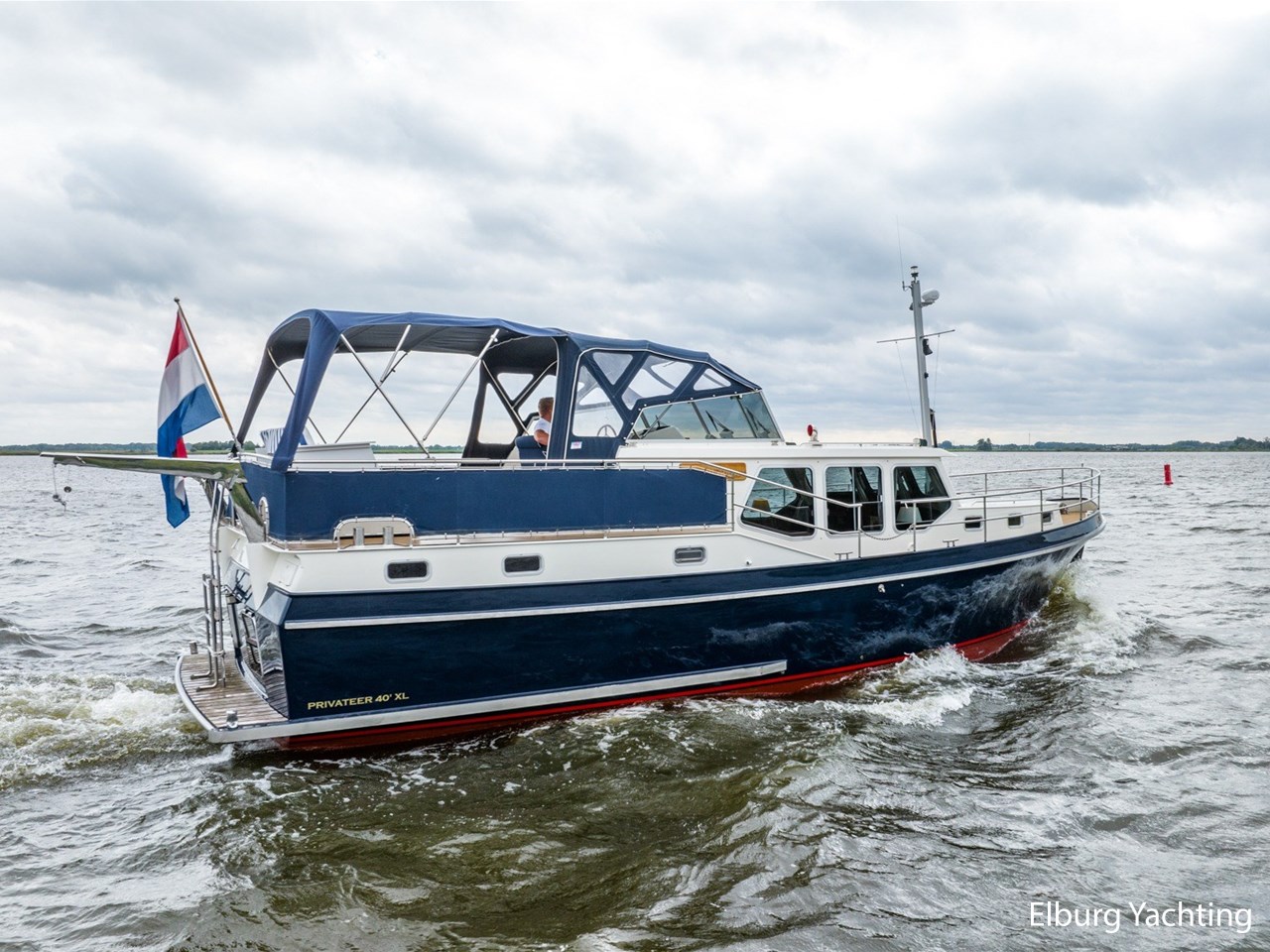 Strakke, goed verzorgde en degelijk gebouwde Privateer 40 XL gebouwd te Privateer Yachts in Uitwellingerga. Rondom is de Privateer 40 XL voorzien van een degelijk dek gemaakt van kurk. Rondom is er niet bezuinigd op de Privateer. Zo valt onder andere de dubbel uitgevoerde r.v.s. zeerailing op alsook de r.v.s. potdeksels. De gangboorden zijn zeer royaal waardoor u zich gemakkelijk verplaatst aan boord. De Privateer 40 XL beschikt over een zeer ruime open kuip, waar zich ook de vaste stuurstand bevindt. De open kuip verbindt zich met de salon via een riante trap. De salon bestaat uit prachtig mahony houten interieur met nette blauwe kussens, te openen ramen aan bak- en stuurboord en een het middelste raam aan de voorzijde kan ook opengeklapt worden. De eigenaarshut is erg royaal uitgevoerd en beschikt over een riant Frans bed, veel opbergruimte, airconditioning en meerdere te openen ramen met muggenhorren. De Privateer 40 XL beschikt over een ruime natte cel met eigen douchecabine en twee aparte elektrische toiletten, luxe 2 persoons vaarstoel bij stuurstand, veel opbergmogelijkheden aan dek in de verschillende bakskisten, volledig afluitbare tent rondom gehele achterdek, klapbare ramen voor lage kruiphoogte, dekwaspomp, 2 x raam in spiegel, Candy wasmachine 120ES.