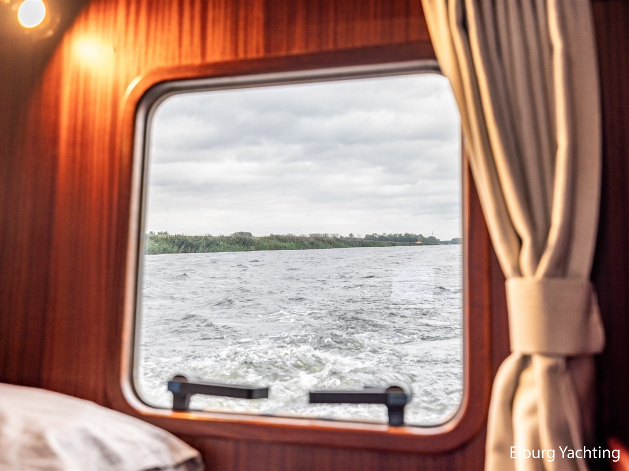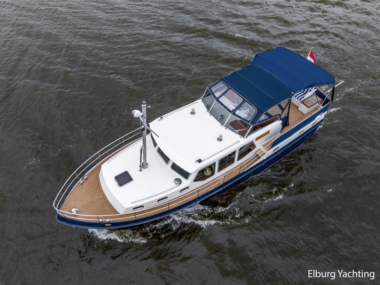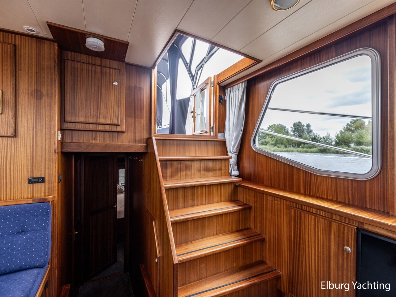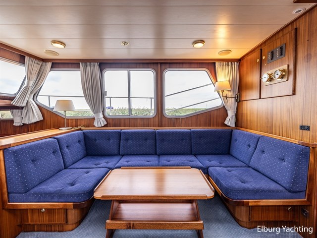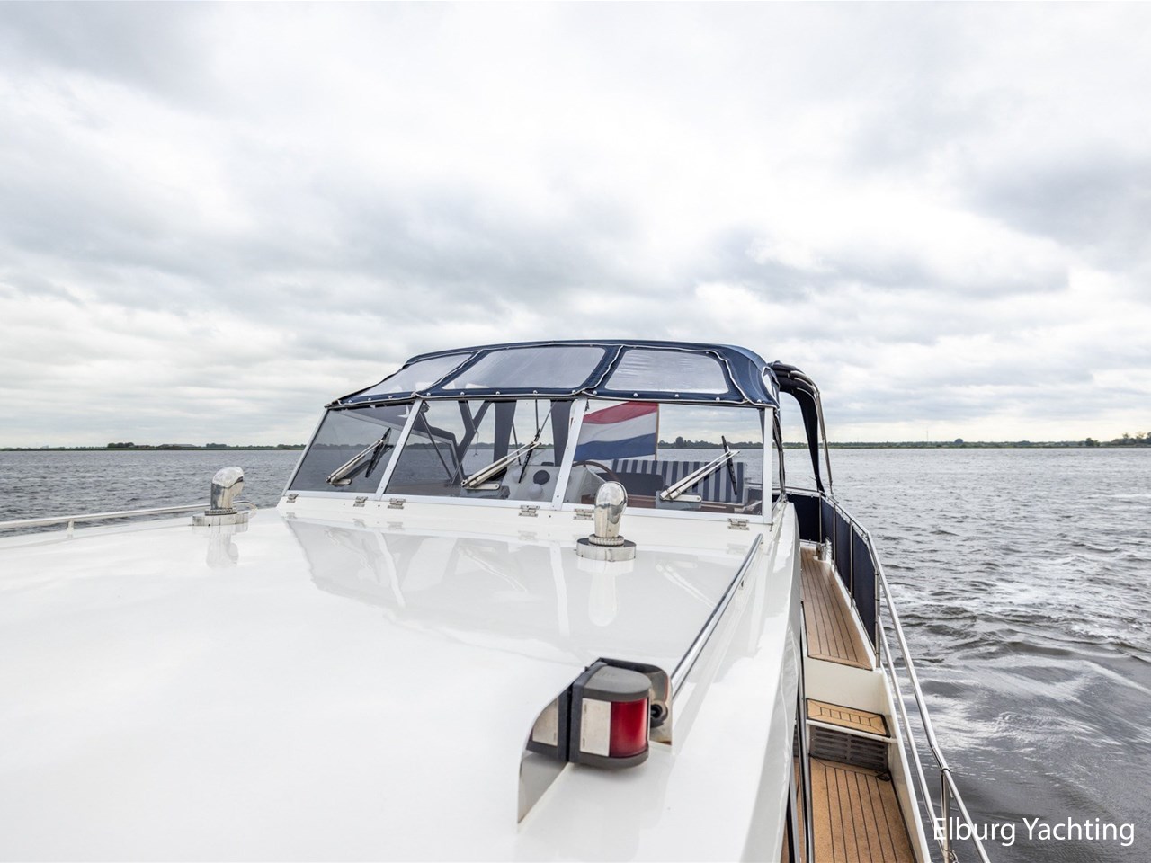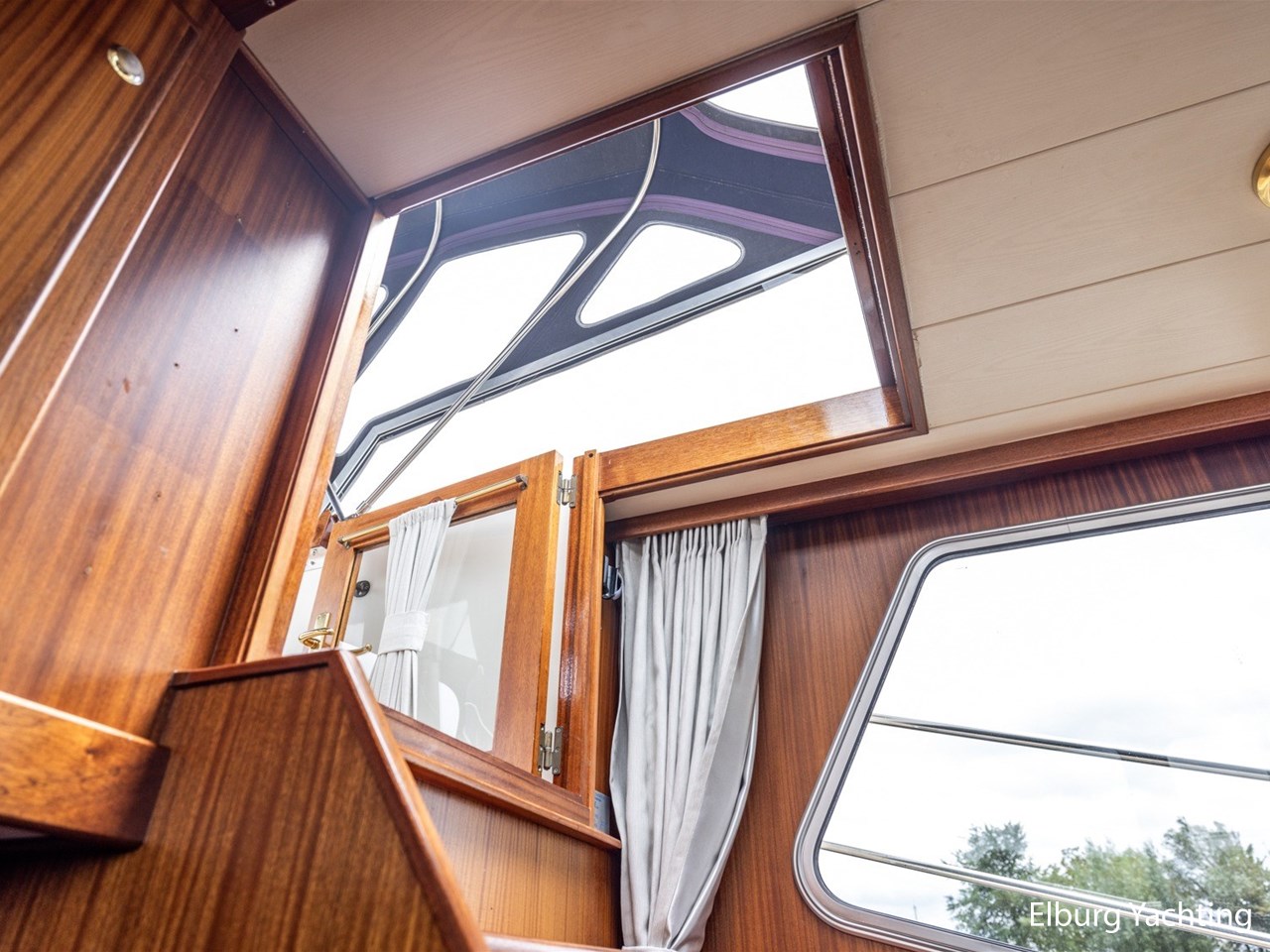 Strakke, goed verzorgde en degelijk gebouwde Privateer 40 XL gebouwd te Privateer Yachts in Uitwellingerga. Rondom is de Privateer 40 XL voorzien van een degelijk dek gemaakt van kurk. Rondom is er niet bezuinigd op de Privateer. Zo valt onder andere de dubbel uitgevoerde r.v.s. zeerailing op alsook de r.v.s. potdeksels. De gangboorden zijn zeer royaal waardoor u zich gemakkelijk verplaatst aan boord. De Privateer 40 XL beschikt over een zeer ruime open kuip, waar zich ook de vaste stuurstand bevindt. De open kuip verbindt zich met de salon via een riante trap. De salon bestaat uit prachtig mahony houten interieur met nette blauwe kussens, te openen ramen aan bak- en stuurboord en een het middelste raam aan de voorzijde kan ook opengeklapt worden. De eigenaarshut is erg royaal uitgevoerd en beschikt over een riant Frans bed, veel opbergruimte, airconditioning en meerdere te openen ramen met muggenhorren. De Privateer 40 XL beschikt over een ruime natte cel met eigen douchecabine en twee aparte elektrische toiletten, luxe 2 persoons vaarstoel bij stuurstand, veel opbergmogelijkheden aan dek in de verschillende bakskisten, volledig afluitbare tent rondom gehele achterdek, klapbare ramen voor lage kruiphoogte, dekwaspomp, 2 x raam in spiegel, Candy wasmachine 120ES.