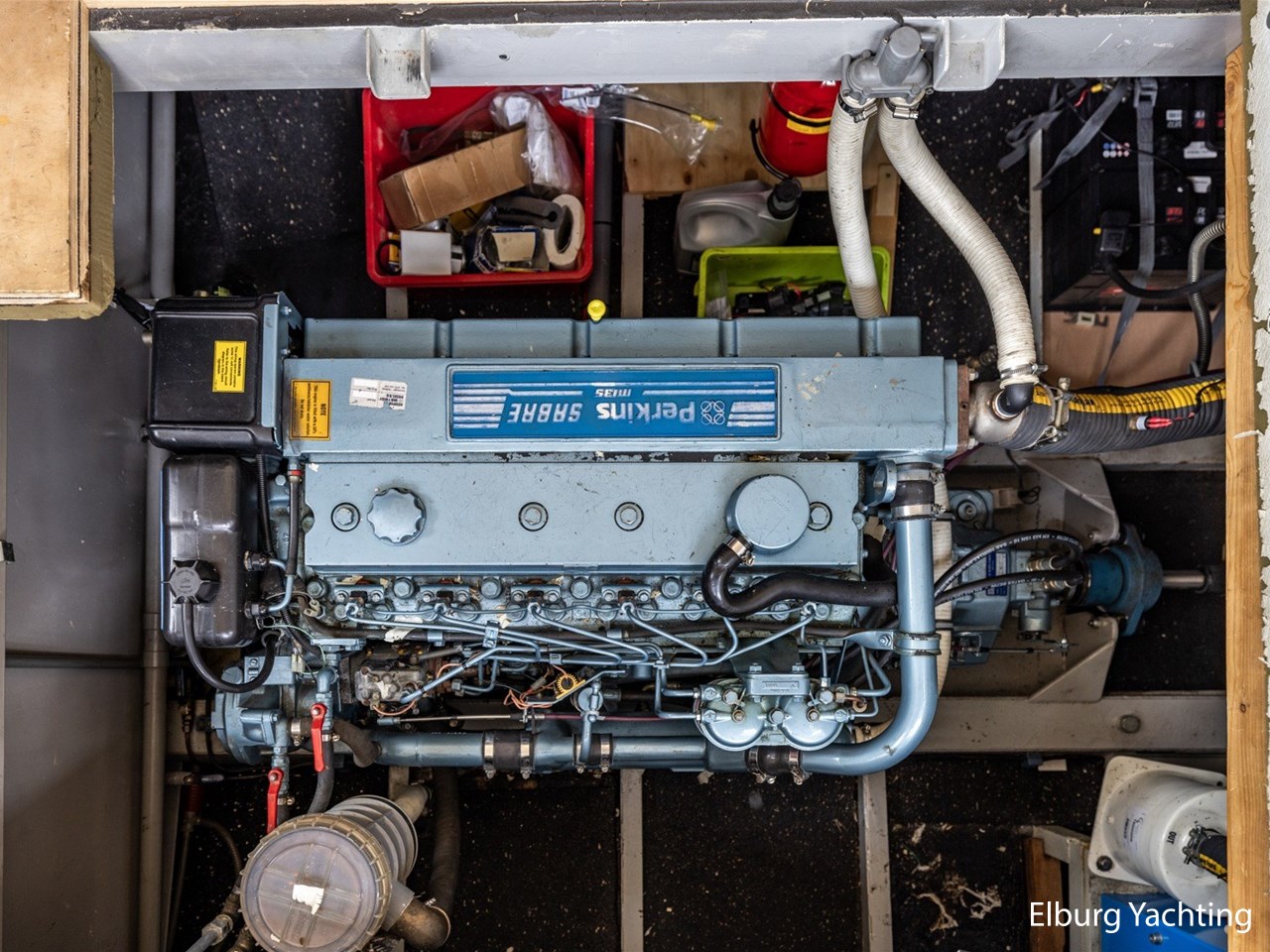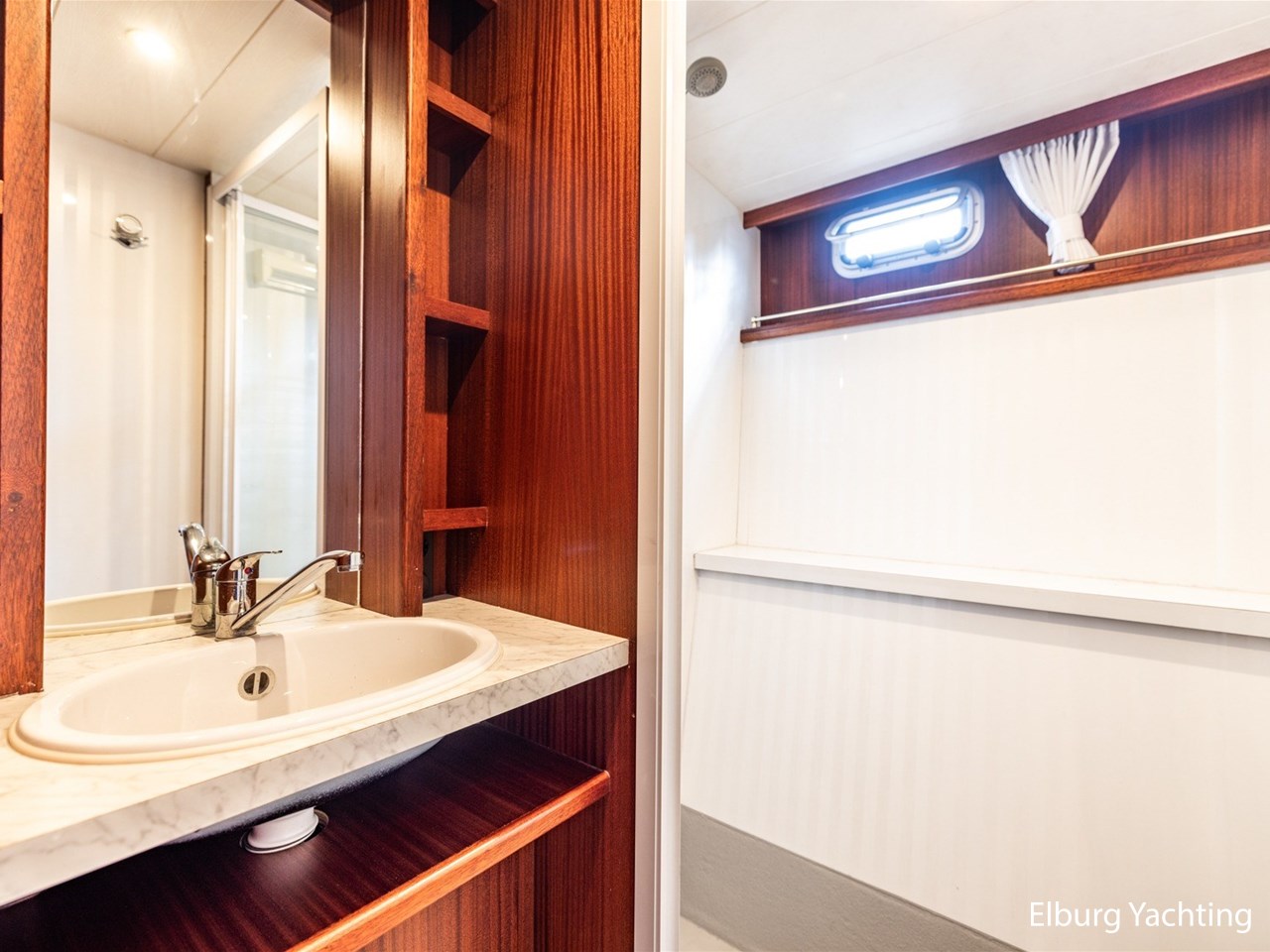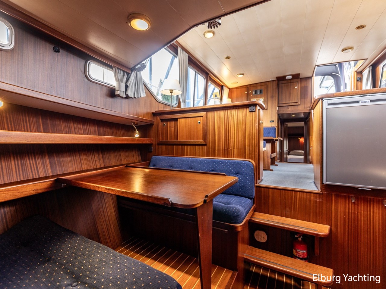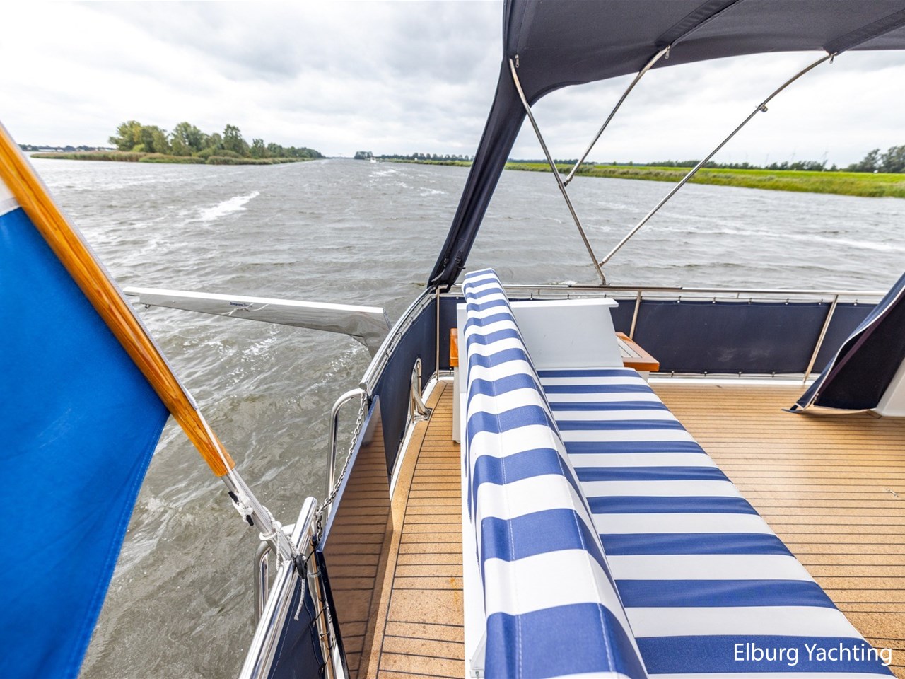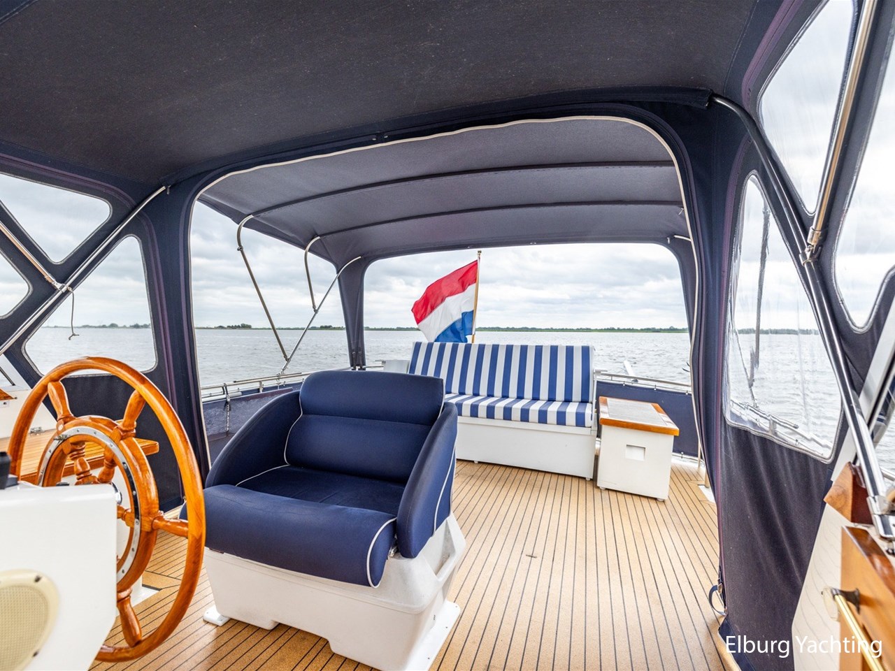 Strakke, goed verzorgde en degelijk gebouwde Privateer 40 XL gebouwd te Privateer Yachts in Uitwellingerga. Rondom is de Privateer 40 XL voorzien van een degelijk dek gemaakt van kurk. Rondom is er niet bezuinigd op de Privateer. Zo valt onder andere de dubbel uitgevoerde r.v.s. zeerailing op alsook de r.v.s. potdeksels. De gangboorden zijn zeer royaal waardoor u zich gemakkelijk verplaatst aan boord. De Privateer 40 XL beschikt over een zeer ruime open kuip, waar zich ook de vaste stuurstand bevindt. De open kuip verbindt zich met de salon via een riante trap. De salon bestaat uit prachtig mahony houten interieur met nette blauwe kussens, te openen ramen aan bak- en stuurboord en een het middelste raam aan de voorzijde kan ook opengeklapt worden. De eigenaarshut is erg royaal uitgevoerd en beschikt over een riant Frans bed, veel opbergruimte, airconditioning en meerdere te openen ramen met muggenhorren. De Privateer 40 XL beschikt over een ruime natte cel met eigen douchecabine en twee aparte elektrische toiletten, luxe 2 persoons vaarstoel bij stuurstand, veel opbergmogelijkheden aan dek in de verschillende bakskisten, volledig afluitbare tent rondom gehele achterdek, klapbare ramen voor lage kruiphoogte, dekwaspomp, 2 x raam in spiegel, Candy wasmachine 120ES.