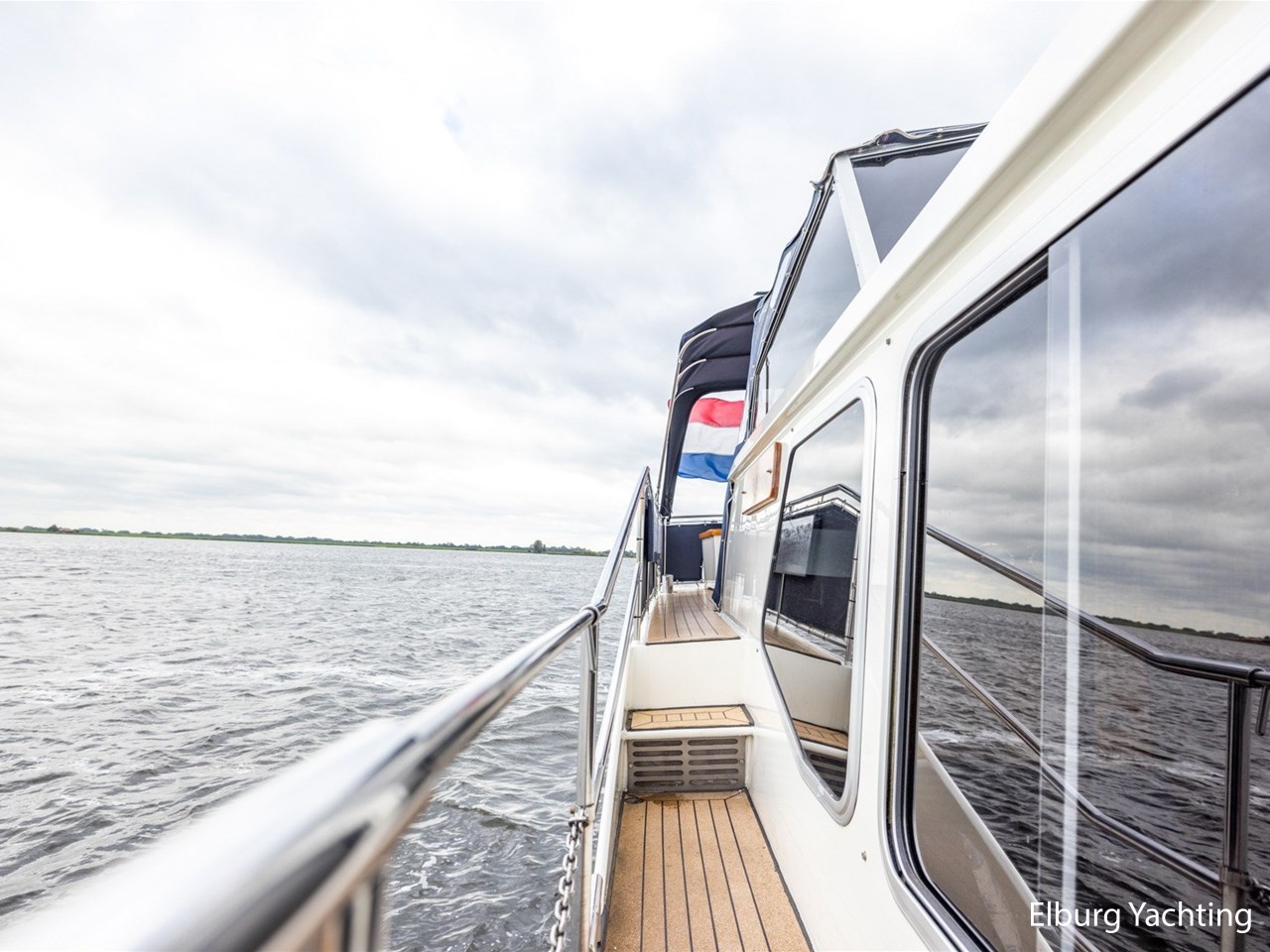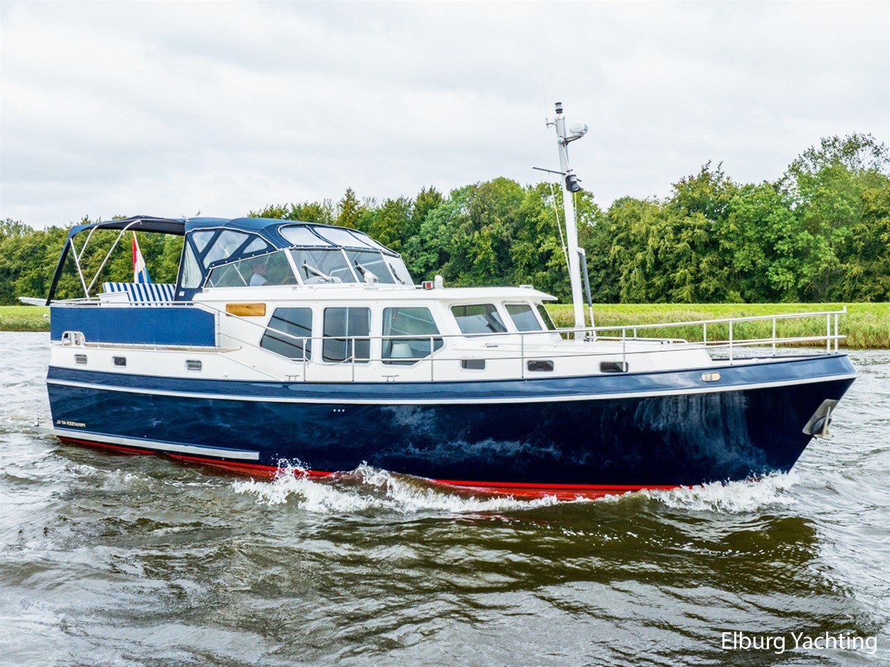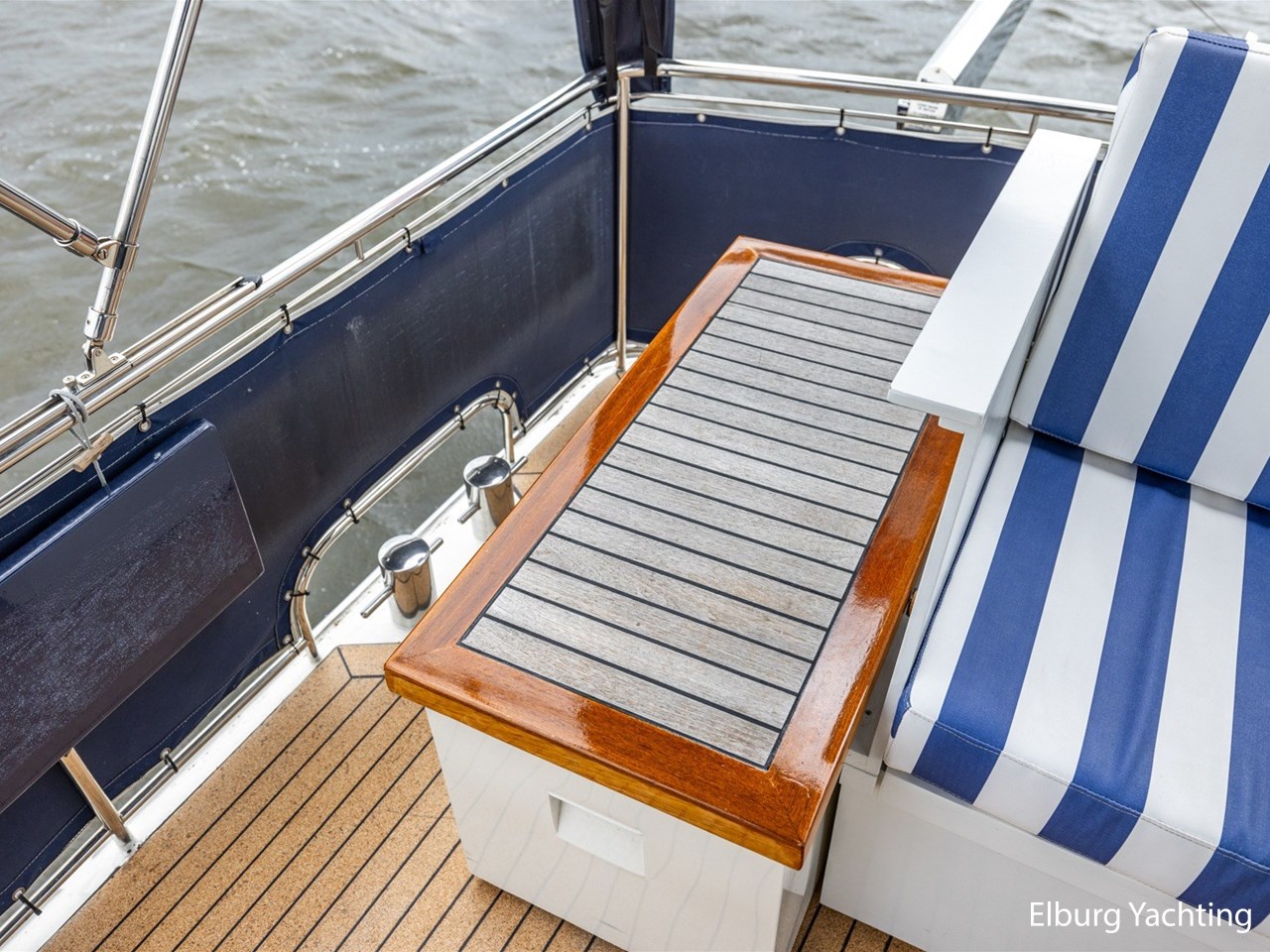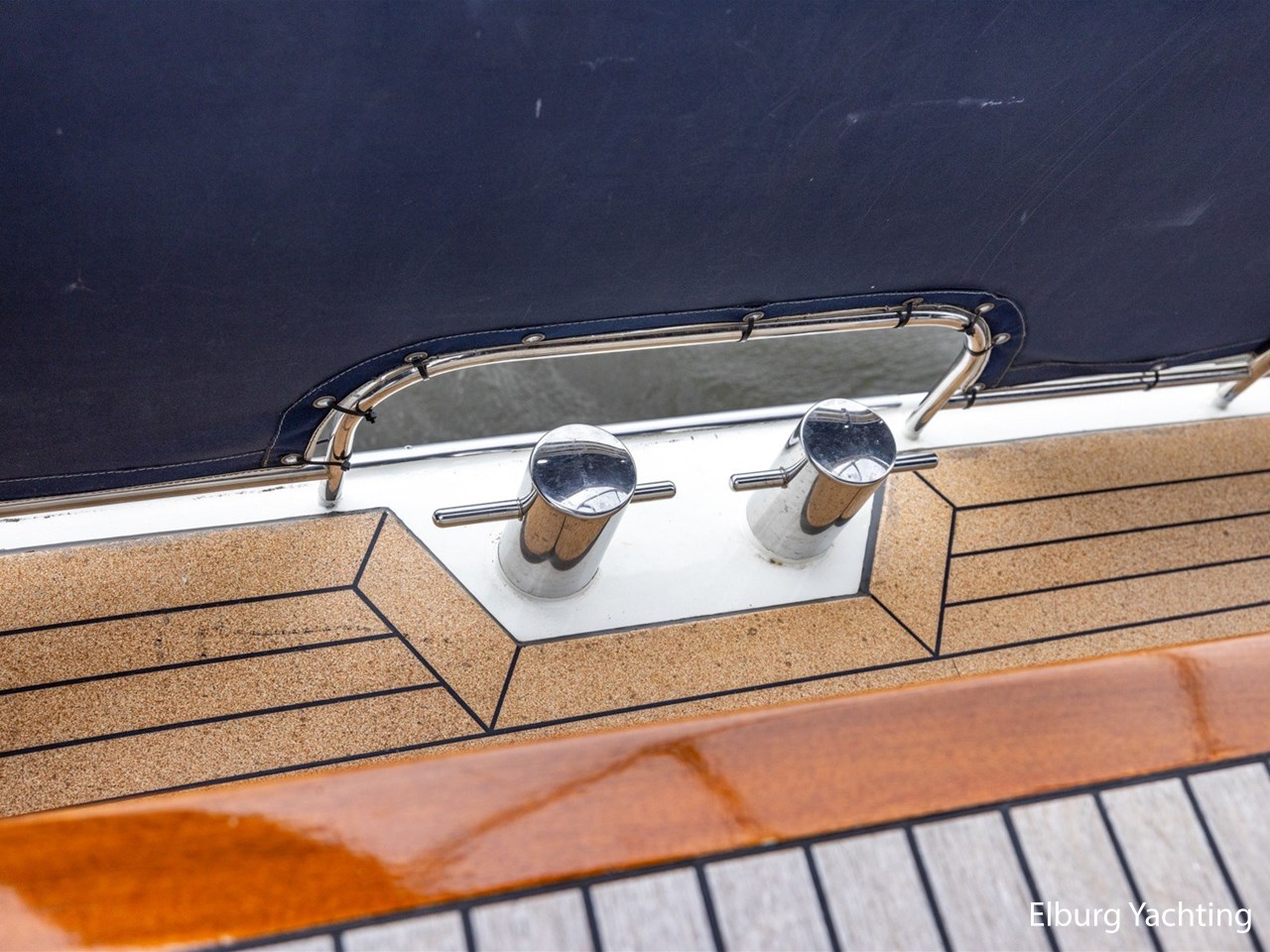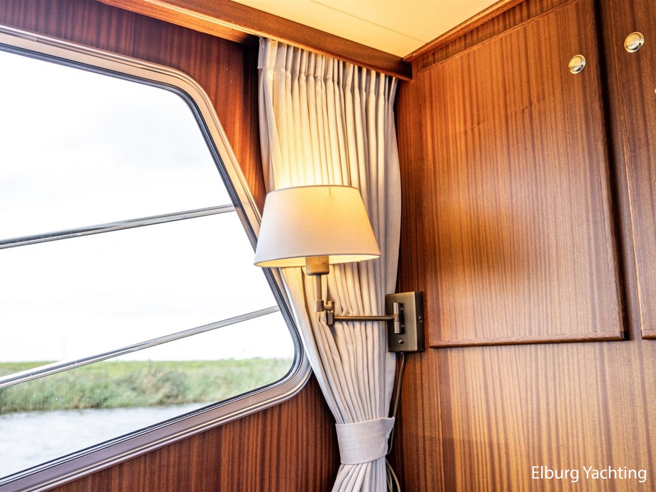 Strakke, goed verzorgde en degelijk gebouwde Privateer 40 XL gebouwd te Privateer Yachts in Uitwellingerga. Rondom is de Privateer 40 XL voorzien van een degelijk dek gemaakt van kurk. Rondom is er niet bezuinigd op de Privateer. Zo valt onder andere de dubbel uitgevoerde r.v.s. zeerailing op alsook de r.v.s. potdeksels. De gangboorden zijn zeer royaal waardoor u zich gemakkelijk verplaatst aan boord. De Privateer 40 XL beschikt over een zeer ruime open kuip, waar zich ook de vaste stuurstand bevindt. De open kuip verbindt zich met de salon via een riante trap. De salon bestaat uit prachtig mahony houten interieur met nette blauwe kussens, te openen ramen aan bak- en stuurboord en een het middelste raam aan de voorzijde kan ook opengeklapt worden. De eigenaarshut is erg royaal uitgevoerd en beschikt over een riant Frans bed, veel opbergruimte, airconditioning en meerdere te openen ramen met muggenhorren. De Privateer 40 XL beschikt over een ruime natte cel met eigen douchecabine en twee aparte elektrische toiletten, luxe 2 persoons vaarstoel bij stuurstand, veel opbergmogelijkheden aan dek in de verschillende bakskisten, volledig afluitbare tent rondom gehele achterdek, klapbare ramen voor lage kruiphoogte, dekwaspomp, 2 x raam in spiegel, Candy wasmachine 120ES.