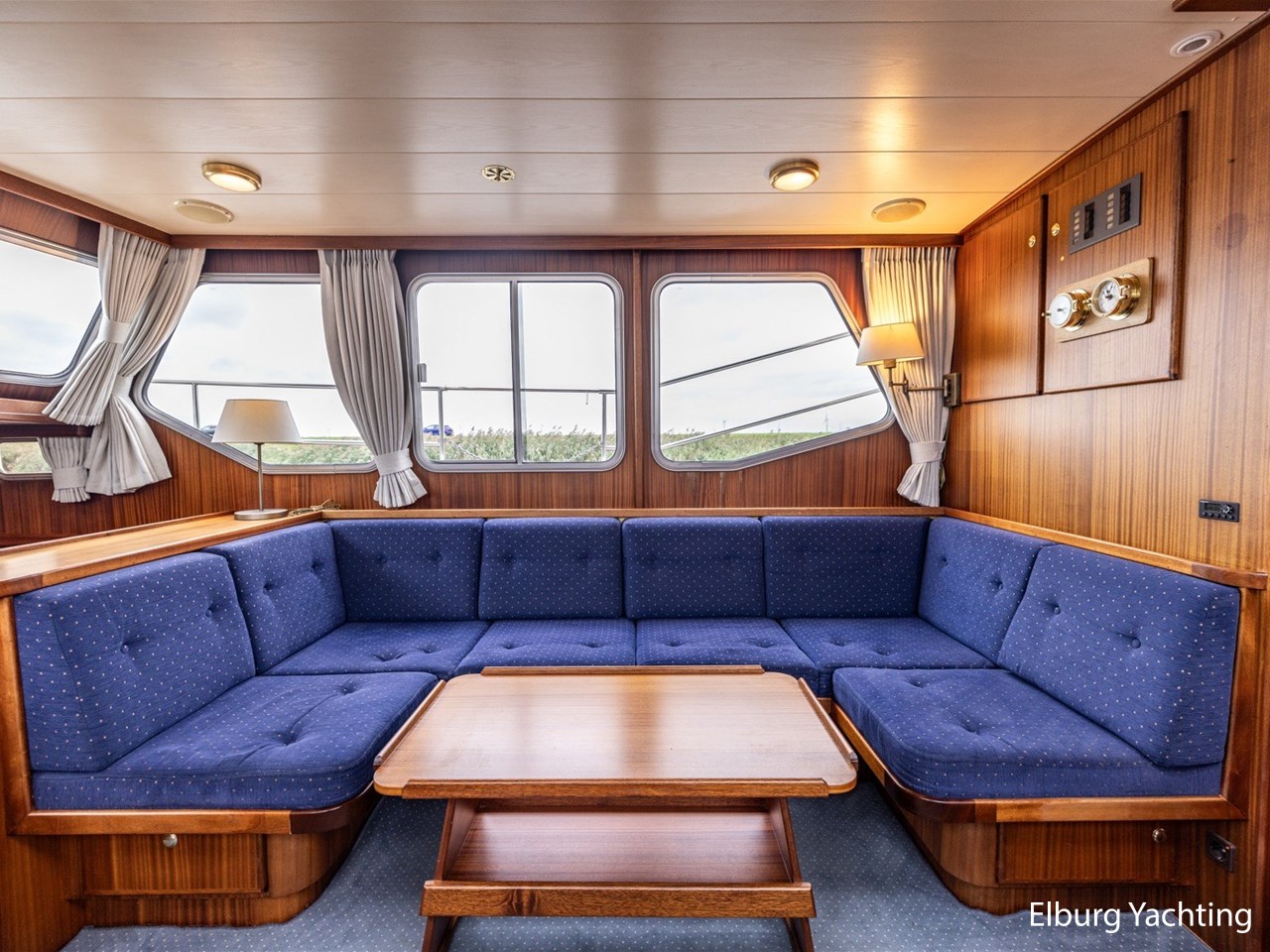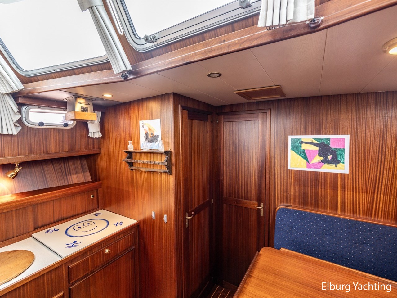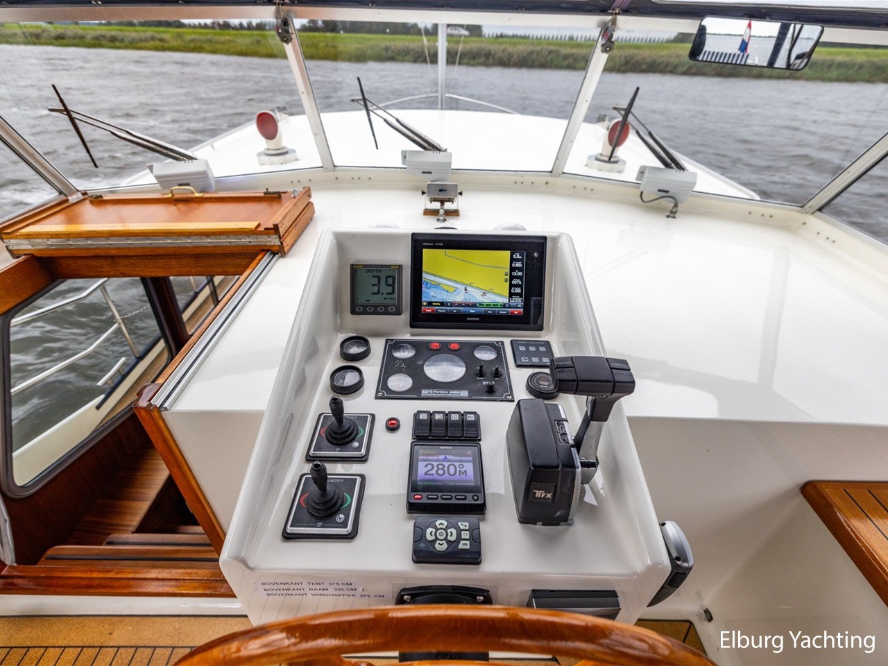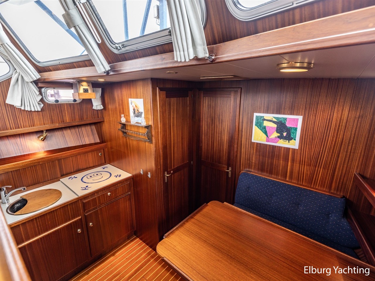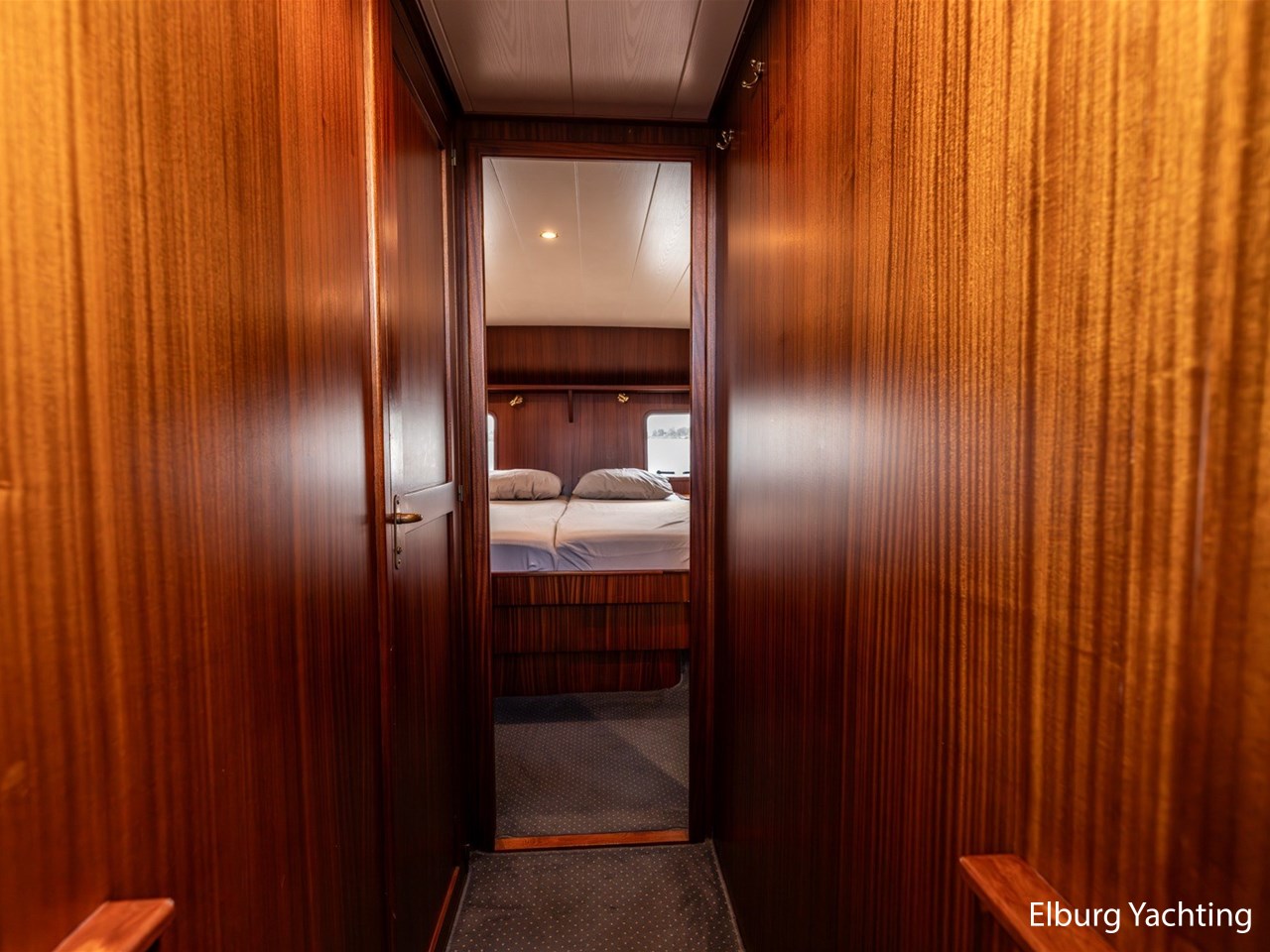 Strakke, goed verzorgde en degelijk gebouwde Privateer 40 XL gebouwd te Privateer Yachts in Uitwellingerga. Rondom is de Privateer 40 XL voorzien van een degelijk dek gemaakt van kurk. Rondom is er niet bezuinigd op de Privateer. Zo valt onder andere de dubbel uitgevoerde r.v.s. zeerailing op alsook de r.v.s. potdeksels. De gangboorden zijn zeer royaal waardoor u zich gemakkelijk verplaatst aan boord. De Privateer 40 XL beschikt over een zeer ruime open kuip, waar zich ook de vaste stuurstand bevindt. De open kuip verbindt zich met de salon via een riante trap. De salon bestaat uit prachtig mahony houten interieur met nette blauwe kussens, te openen ramen aan bak- en stuurboord en een het middelste raam aan de voorzijde kan ook opengeklapt worden. De eigenaarshut is erg royaal uitgevoerd en beschikt over een riant Frans bed, veel opbergruimte, airconditioning en meerdere te openen ramen met muggenhorren. De Privateer 40 XL beschikt over een ruime natte cel met eigen douchecabine en twee aparte elektrische toiletten, luxe 2 persoons vaarstoel bij stuurstand, veel opbergmogelijkheden aan dek in de verschillende bakskisten, volledig afluitbare tent rondom gehele achterdek, klapbare ramen voor lage kruiphoogte, dekwaspomp, 2 x raam in spiegel, Candy wasmachine 120ES.