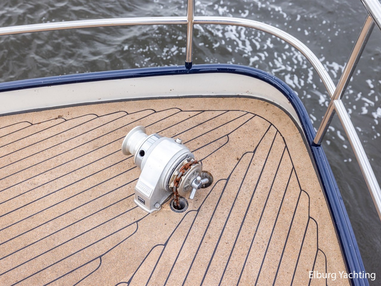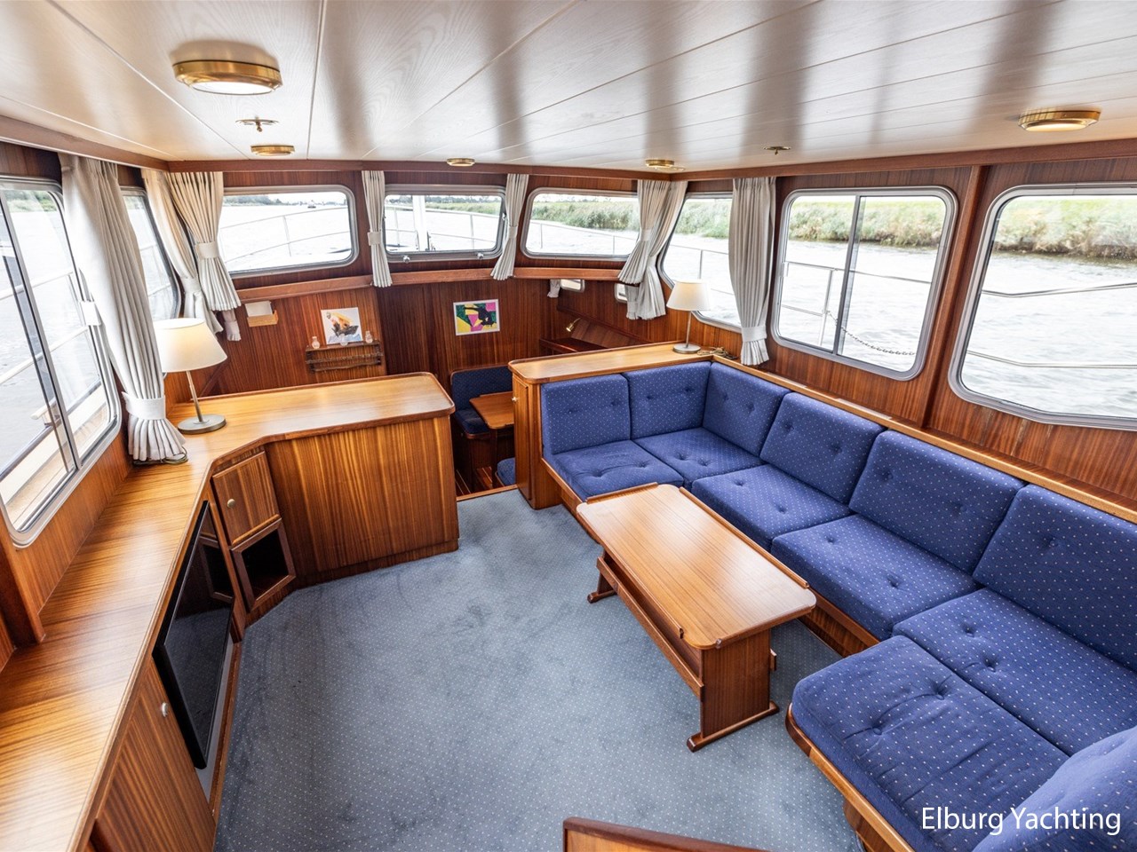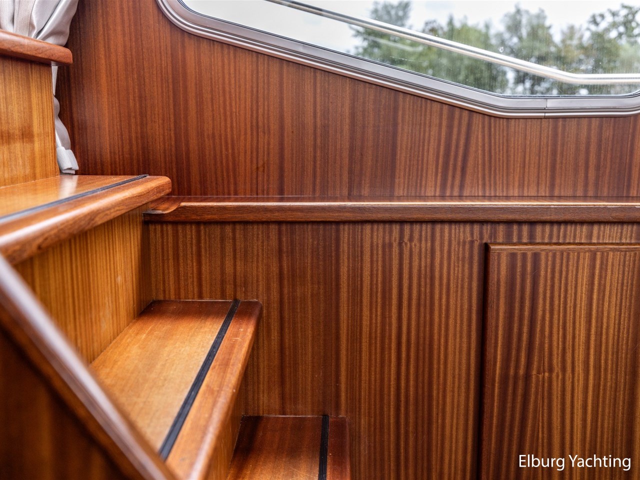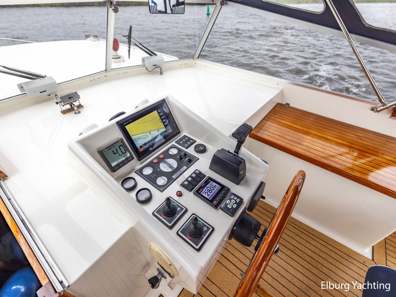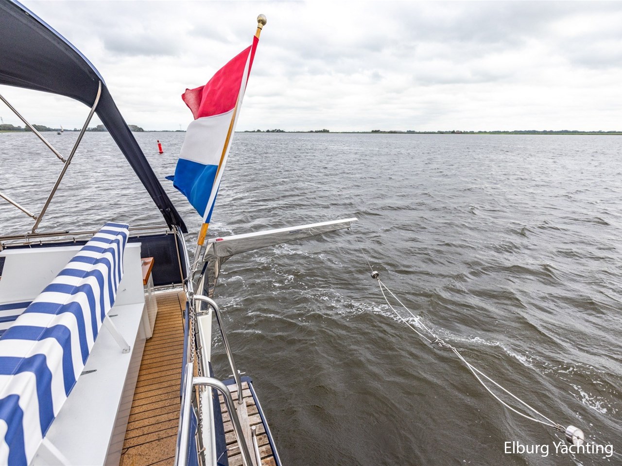 Strakke, goed verzorgde en degelijk gebouwde Privateer 40 XL gebouwd te Privateer Yachts in Uitwellingerga. Rondom is de Privateer 40 XL voorzien van een degelijk dek gemaakt van kurk. Rondom is er niet bezuinigd op de Privateer. Zo valt onder andere de dubbel uitgevoerde r.v.s. zeerailing op alsook de r.v.s. potdeksels. De gangboorden zijn zeer royaal waardoor u zich gemakkelijk verplaatst aan boord. De Privateer 40 XL beschikt over een zeer ruime open kuip, waar zich ook de vaste stuurstand bevindt. De open kuip verbindt zich met de salon via een riante trap. De salon bestaat uit prachtig mahony houten interieur met nette blauwe kussens, te openen ramen aan bak- en stuurboord en een het middelste raam aan de voorzijde kan ook opengeklapt worden. De eigenaarshut is erg royaal uitgevoerd en beschikt over een riant Frans bed, veel opbergruimte, airconditioning en meerdere te openen ramen met muggenhorren. De Privateer 40 XL beschikt over een ruime natte cel met eigen douchecabine en twee aparte elektrische toiletten, luxe 2 persoons vaarstoel bij stuurstand, veel opbergmogelijkheden aan dek in de verschillende bakskisten, volledig afluitbare tent rondom gehele achterdek, klapbare ramen voor lage kruiphoogte, dekwaspomp, 2 x raam in spiegel, Candy wasmachine 120ES.