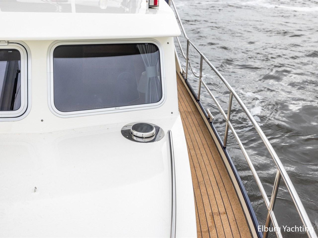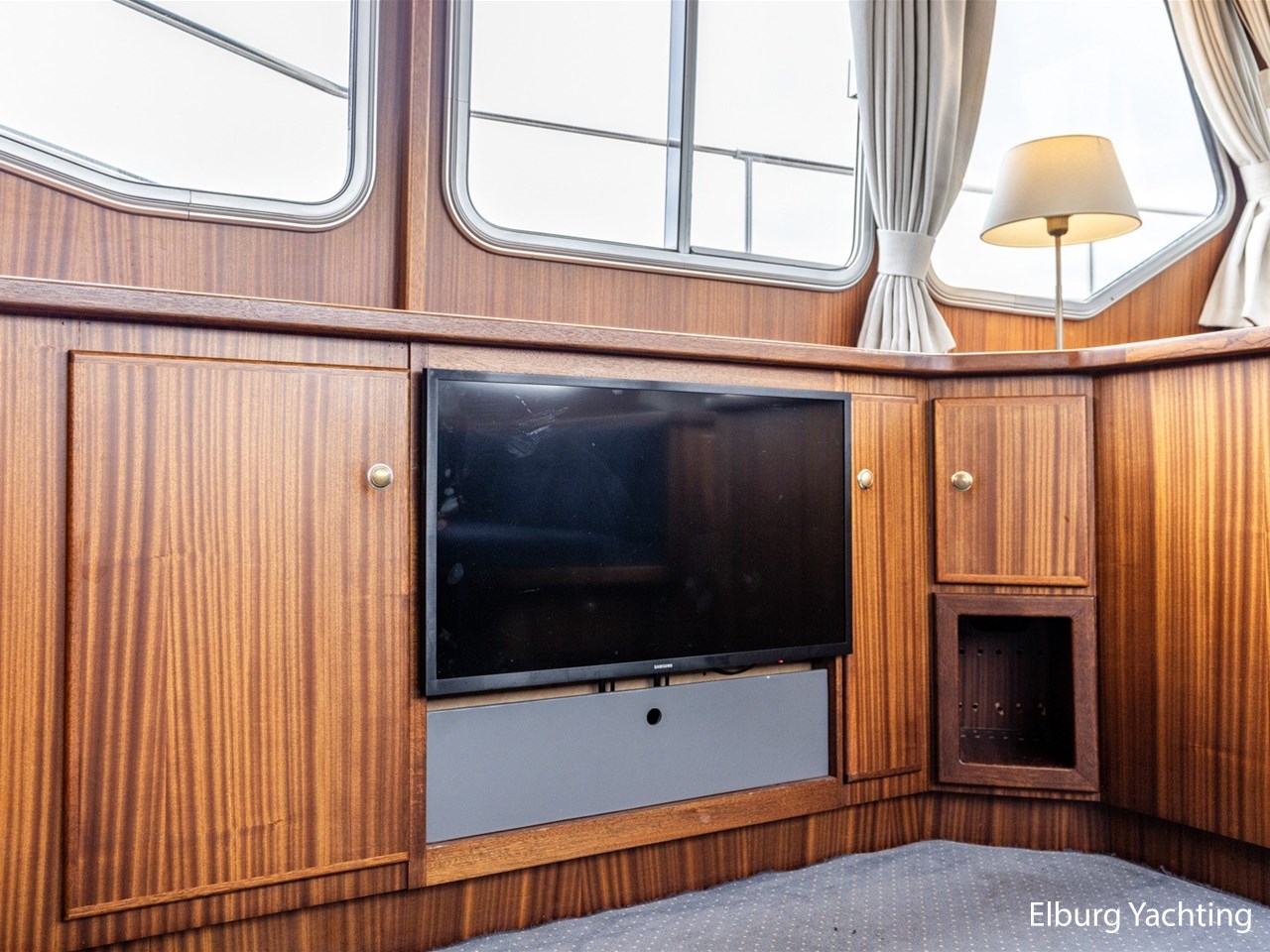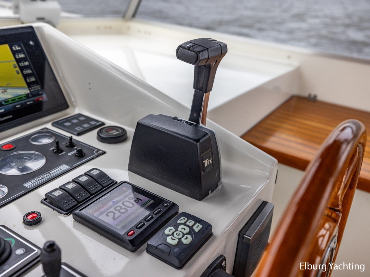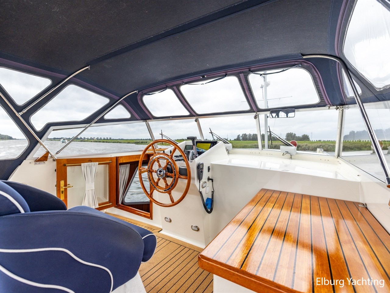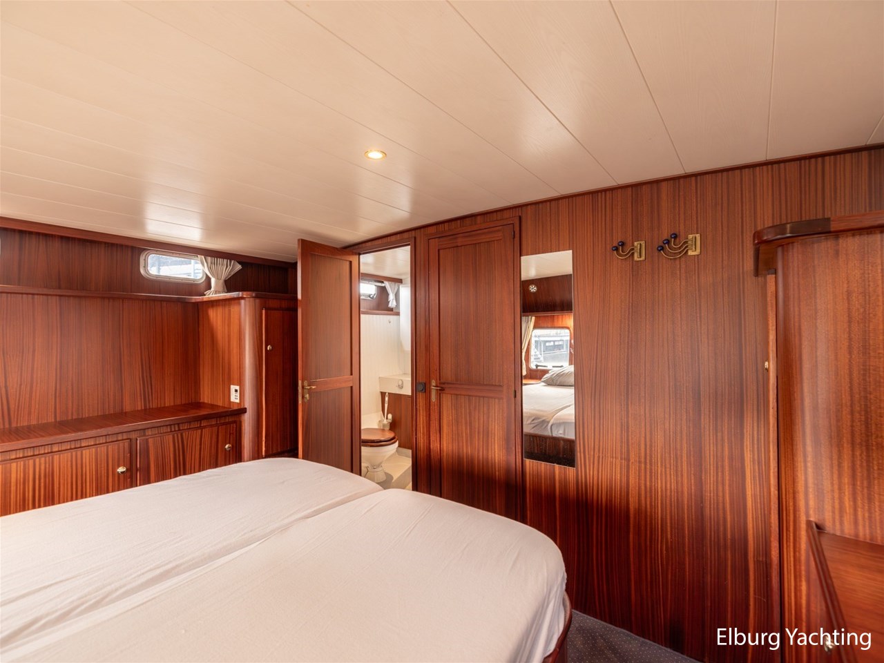 Strakke, goed verzorgde en degelijk gebouwde Privateer 40 XL gebouwd te Privateer Yachts in Uitwellingerga. Rondom is de Privateer 40 XL voorzien van een degelijk dek gemaakt van kurk. Rondom is er niet bezuinigd op de Privateer. Zo valt onder andere de dubbel uitgevoerde r.v.s. zeerailing op alsook de r.v.s. potdeksels. De gangboorden zijn zeer royaal waardoor u zich gemakkelijk verplaatst aan boord. De Privateer 40 XL beschikt over een zeer ruime open kuip, waar zich ook de vaste stuurstand bevindt. De open kuip verbindt zich met de salon via een riante trap. De salon bestaat uit prachtig mahony houten interieur met nette blauwe kussens, te openen ramen aan bak- en stuurboord en een het middelste raam aan de voorzijde kan ook opengeklapt worden. De eigenaarshut is erg royaal uitgevoerd en beschikt over een riant Frans bed, veel opbergruimte, airconditioning en meerdere te openen ramen met muggenhorren. De Privateer 40 XL beschikt over een ruime natte cel met eigen douchecabine en twee aparte elektrische toiletten, luxe 2 persoons vaarstoel bij stuurstand, veel opbergmogelijkheden aan dek in de verschillende bakskisten, volledig afluitbare tent rondom gehele achterdek, klapbare ramen voor lage kruiphoogte, dekwaspomp, 2 x raam in spiegel, Candy wasmachine 120ES.