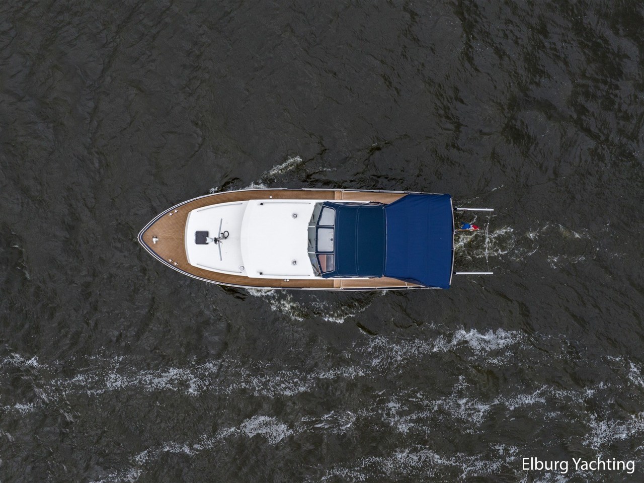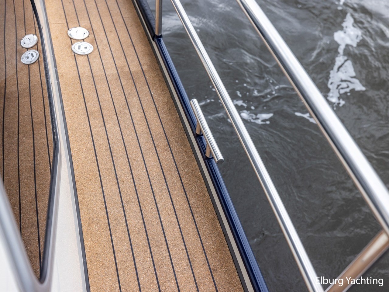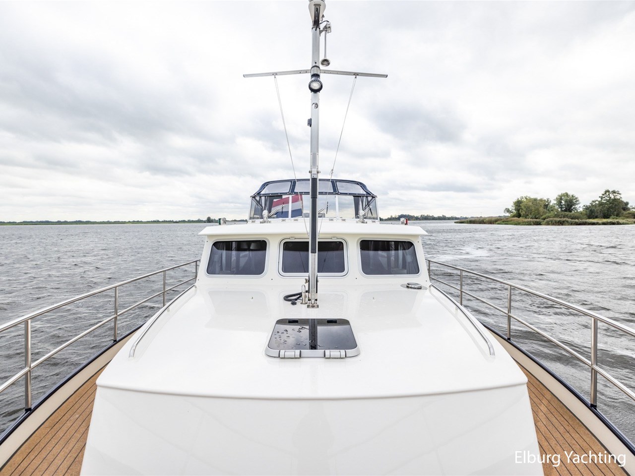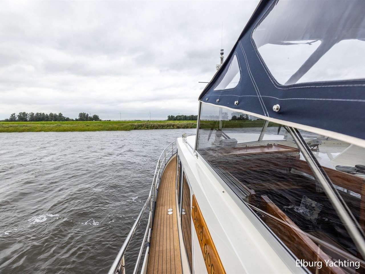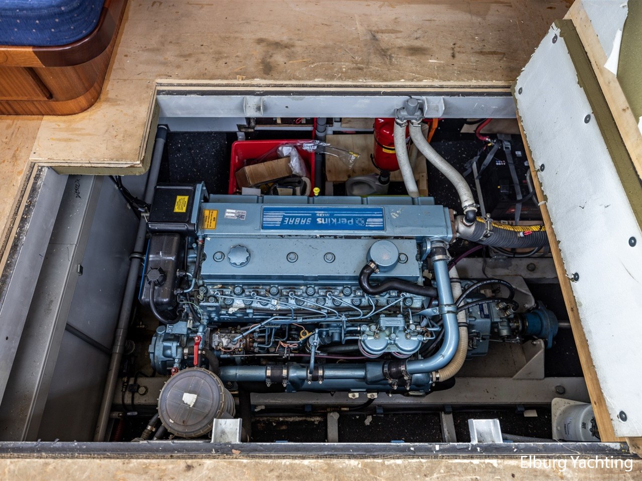 Strakke, goed verzorgde en degelijk gebouwde Privateer 40 XL gebouwd te Privateer Yachts in Uitwellingerga. Rondom is de Privateer 40 XL voorzien van een degelijk dek gemaakt van kurk. Rondom is er niet bezuinigd op de Privateer. Zo valt onder andere de dubbel uitgevoerde r.v.s. zeerailing op alsook de r.v.s. potdeksels. De gangboorden zijn zeer royaal waardoor u zich gemakkelijk verplaatst aan boord. De Privateer 40 XL beschikt over een zeer ruime open kuip, waar zich ook de vaste stuurstand bevindt. De open kuip verbindt zich met de salon via een riante trap. De salon bestaat uit prachtig mahony houten interieur met nette blauwe kussens, te openen ramen aan bak- en stuurboord en een het middelste raam aan de voorzijde kan ook opengeklapt worden. De eigenaarshut is erg royaal uitgevoerd en beschikt over een riant Frans bed, veel opbergruimte, airconditioning en meerdere te openen ramen met muggenhorren. De Privateer 40 XL beschikt over een ruime natte cel met eigen douchecabine en twee aparte elektrische toiletten, luxe 2 persoons vaarstoel bij stuurstand, veel opbergmogelijkheden aan dek in de verschillende bakskisten, volledig afluitbare tent rondom gehele achterdek, klapbare ramen voor lage kruiphoogte, dekwaspomp, 2 x raam in spiegel, Candy wasmachine 120ES.