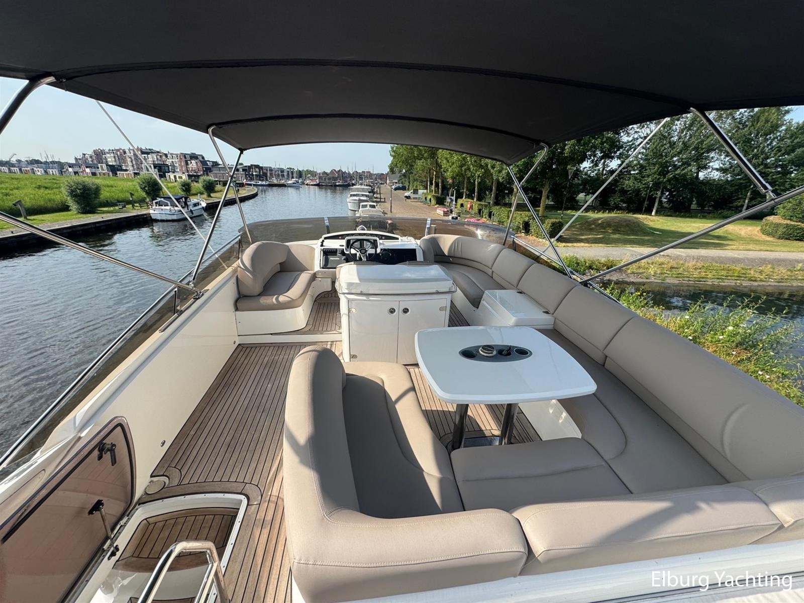 Luxueus interieur. Ruime open kuip die volledig af te sluiten is door middel van een tent en is voorzien van nieuwe bekleding (2024). Een grote r.v.s. schuifdeur naar ruime salon waardoor binnen- en buitenruimte verbonden worden. Bij binnenkomst in de salon treft u een ruime u-vormige bank aan met een TV op lift. De ruime dinette naast de stuurstand zorgt ervoor dat het mogelijk is dat de schipper in contact blijft met het gezelschap aan boord, de stuurstand beschikt over 2 luxe vaarstoelen, en een yachtcontroller afstandsbediening waardoor aan- en afmeren eenvoudig is.