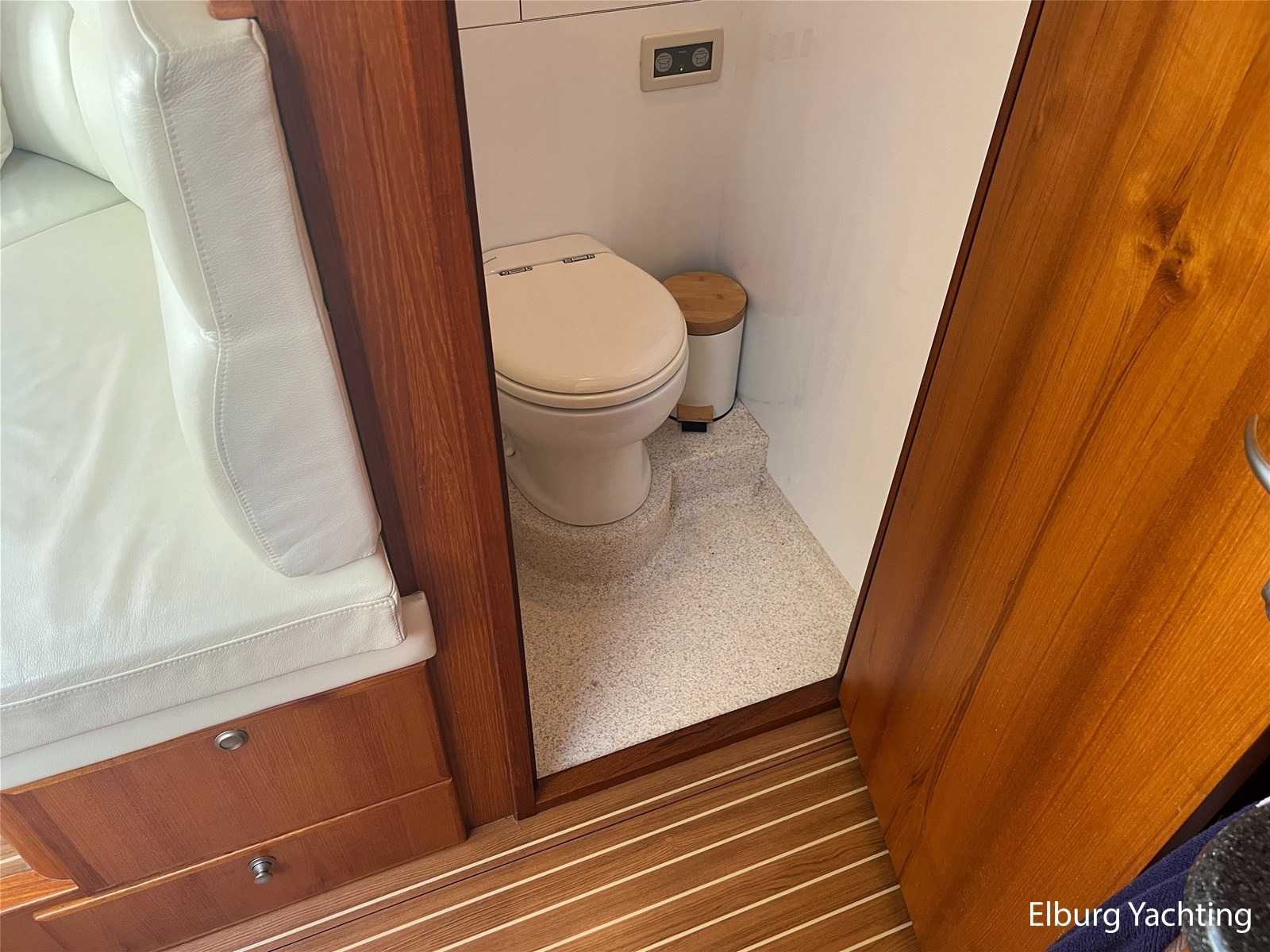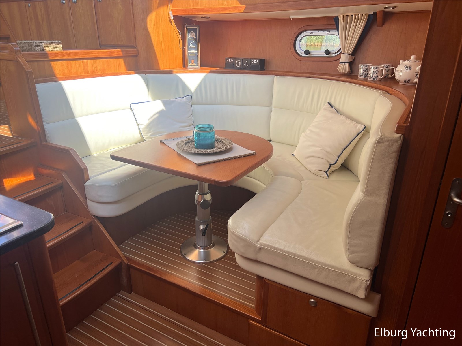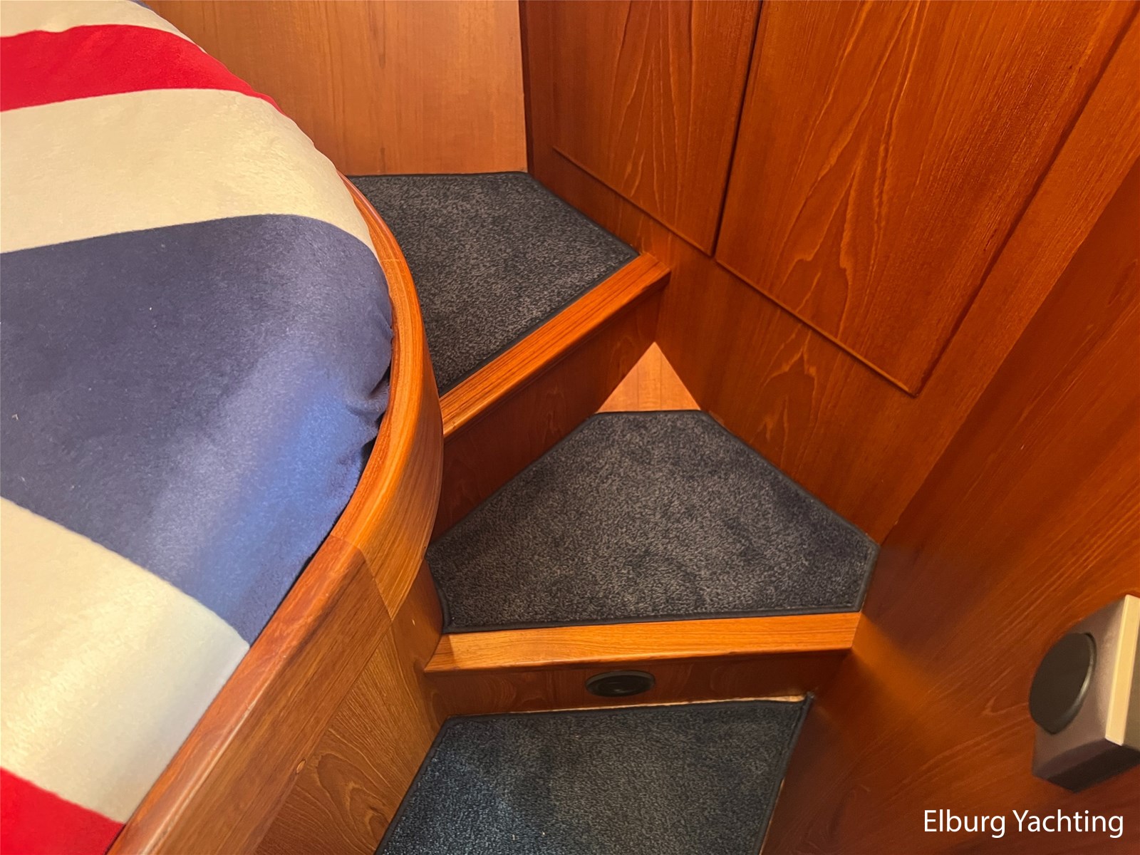 Geïntegreerd en ingelegd met teak + ruime dubbele ronde trappen + zwemtrap