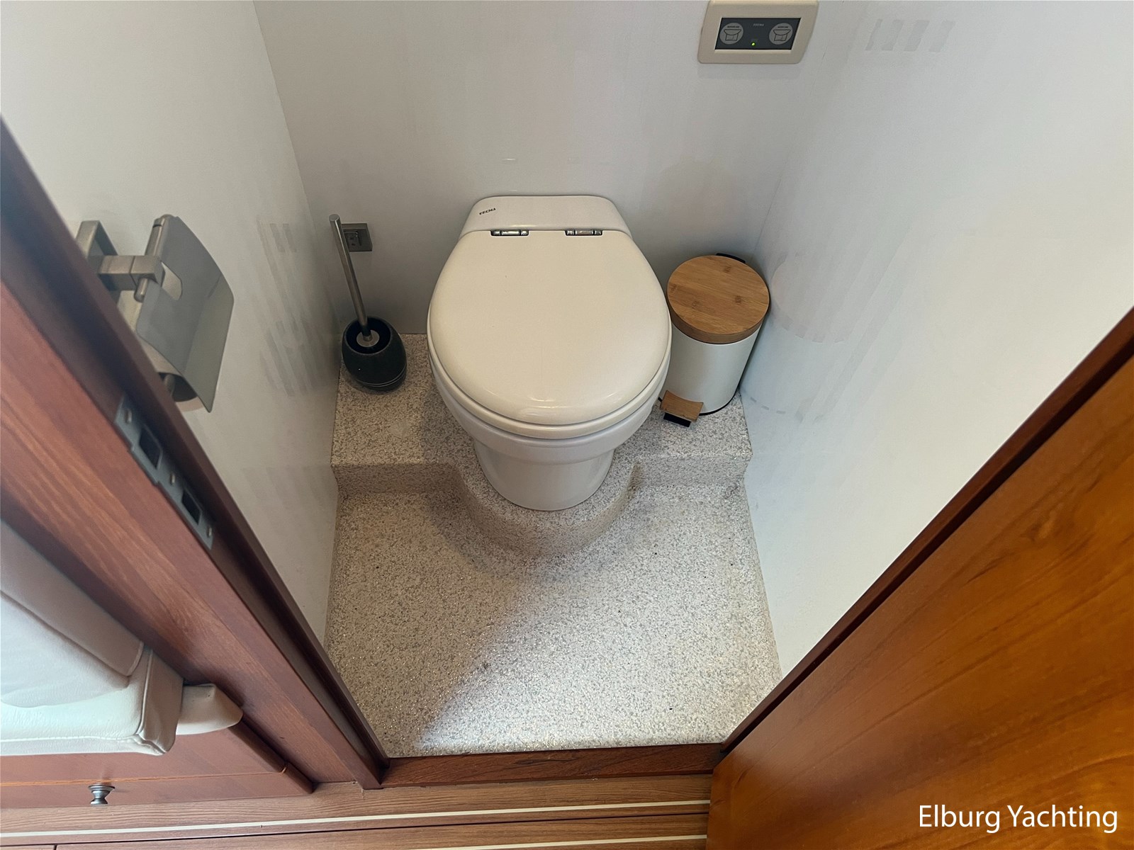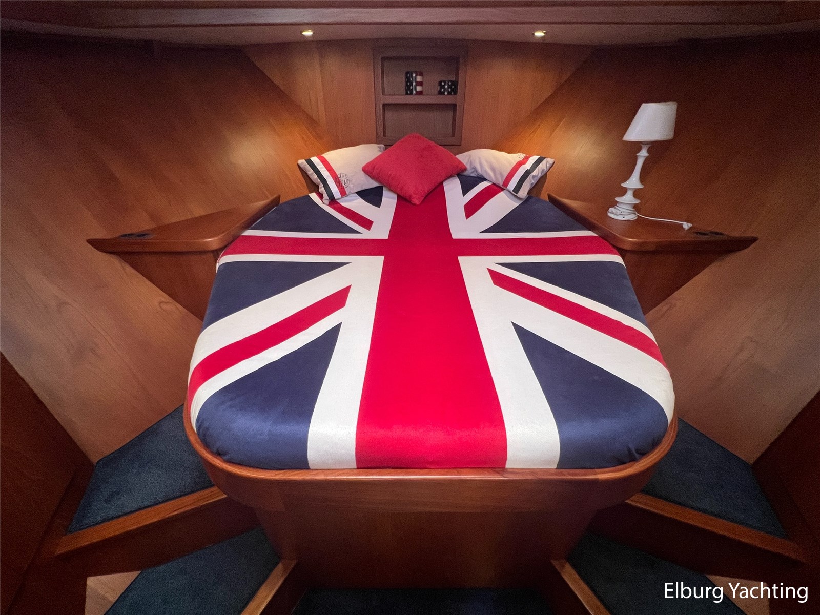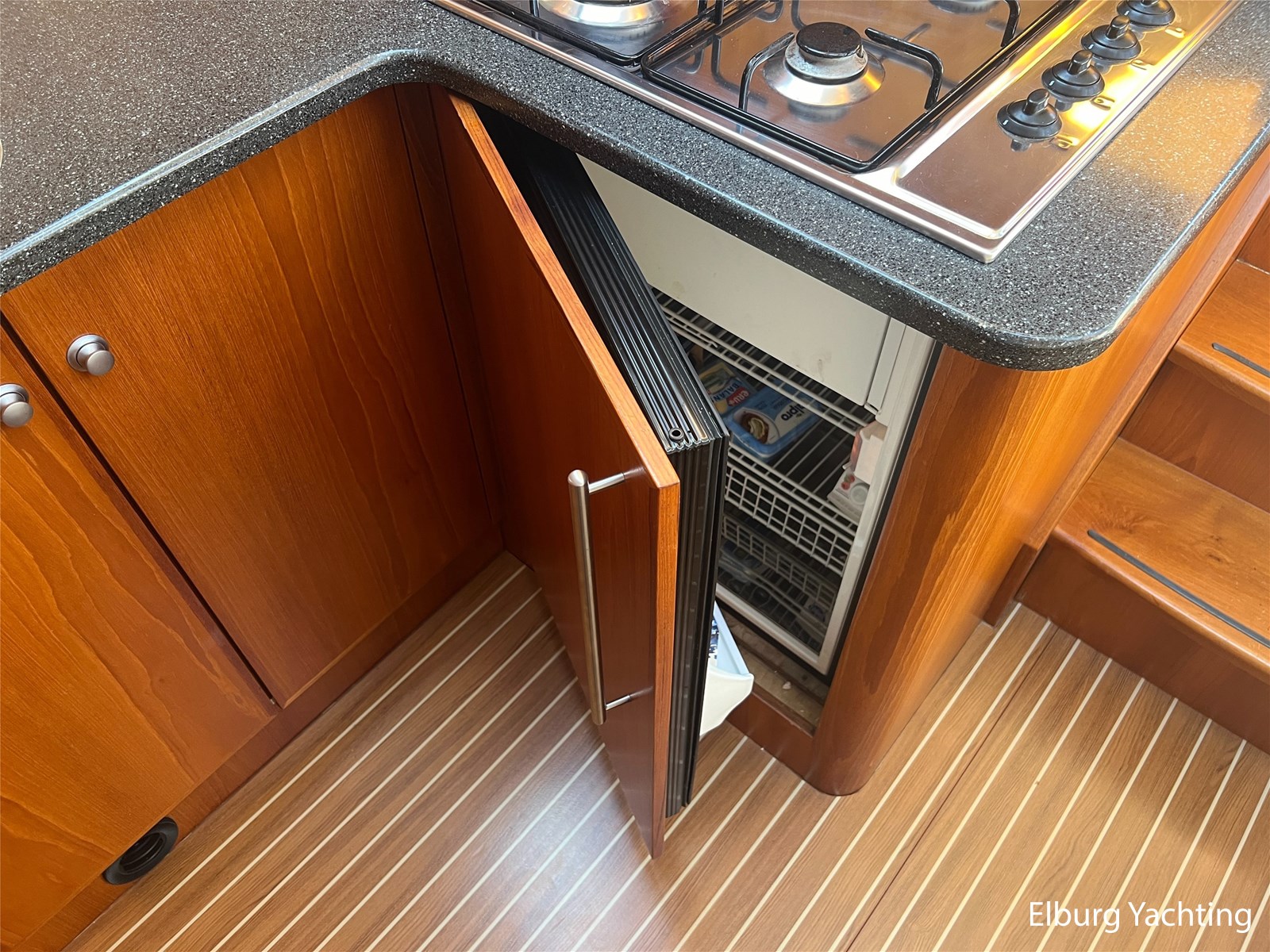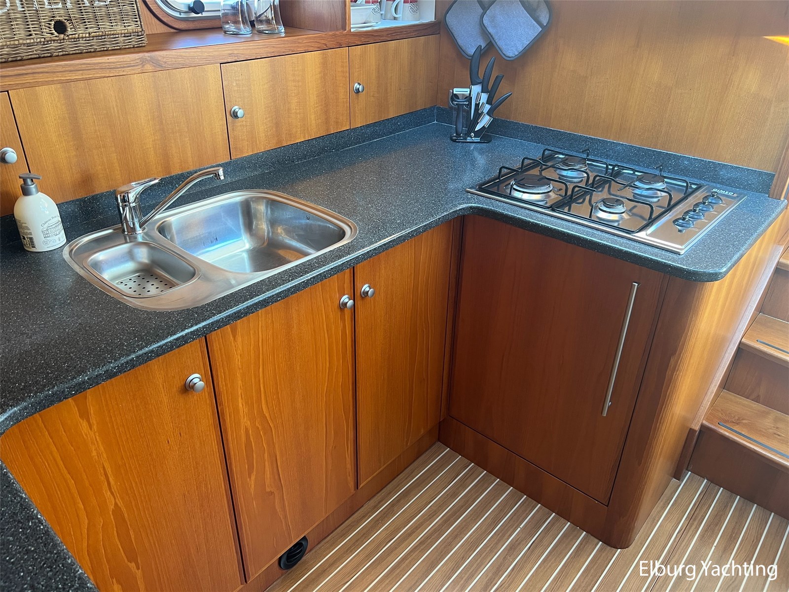 Geïntegreerd en ingelegd met teak + ruime dubbele ronde trappen + zwemtrap