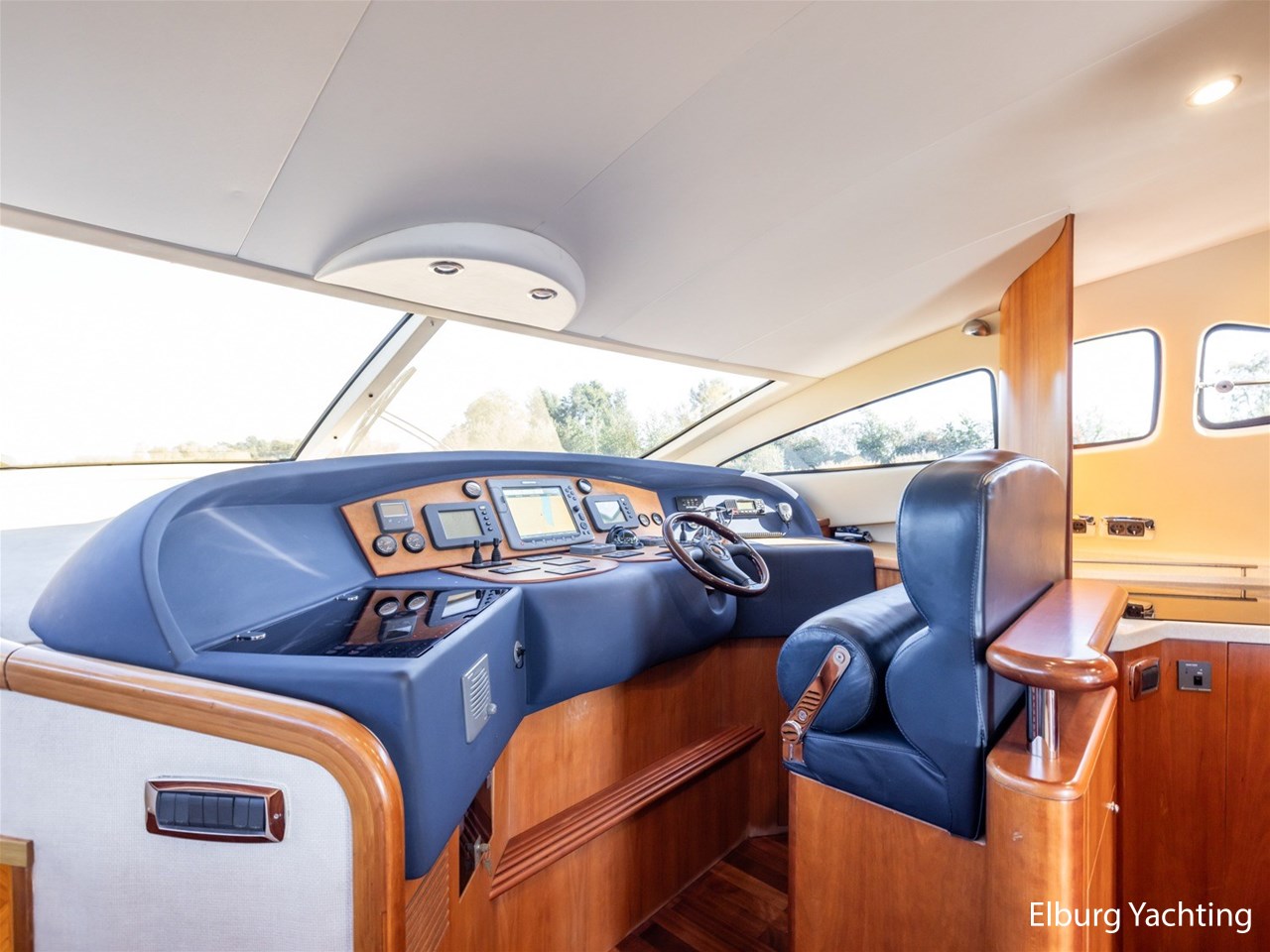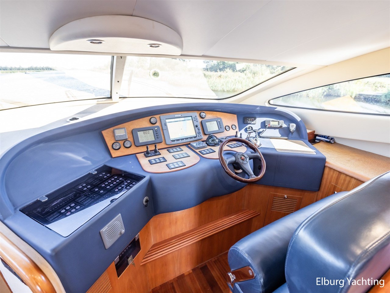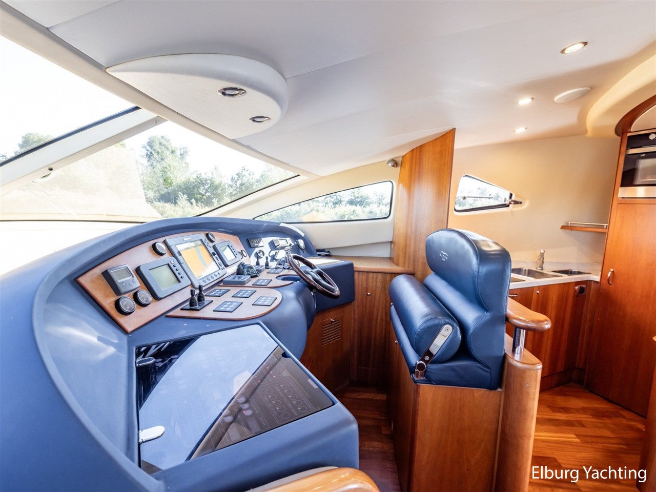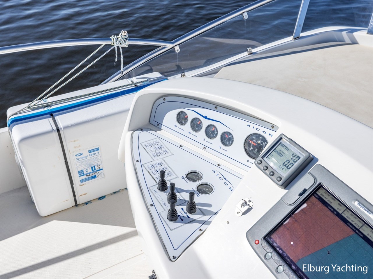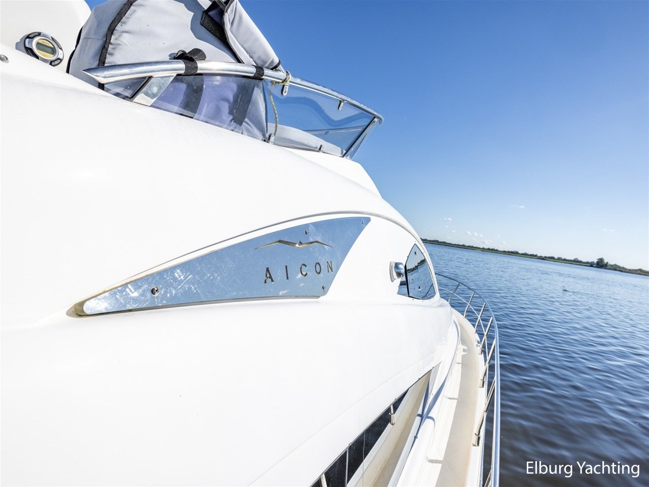 De Aicon 56 is een mooi gelijnd snelvarend polyester jacht. Het jacht beschikt over maar liefst 3 vaste hutten + crew cabin waarmee er plaats aan boord is voor minimaal 6 opvarenden. De salon is ruim opgezet met een aangesloten open keuken. Midscheeps bevind zich de 2-persoons eigenaarshut met eigen douche en toilet voorzieningen. In het voorschip zijn de twee gasten hutten gesitueerd met een 2-persoons frans bed in de voorpiek en een 2 x 1 persoons hut aan SB zijde. Via een vaste halfronde trap op het achterdek bereik je de flybridge. De flybridge heeft een vaste bank op het achterdek, wetbar met koelkast en grillplaat en voor de stuurstand een groot ligbed. De machinekamer is bereikbaar via de open kuip. Deze Aicon 56 is voorzien van: Royale open kuip met geïntegreerde banken met bijbehorende afneembare kussens, zonneschermen rondom kuip, r.v.s. schuifpui naar salon waardoor binnen en buiten met elkaar verbonden worden, TV in salon, koeling/verwarming per vertrek afzonderlijk regelbaar, Bosch vaatwasser, wasmachine, mooring winch in kuip aan SB + BB zijde, Caterpillar motormanagement displays, zonnebed op voordek en flybridge, volledige bimini over flybridge, 2-persoons stuurbank bij beide stuurstanden, afsluitbare kuip met spiegeldeur aan BB zijde, afneembare afdekhoezen voor buiten stuurstand, complete Raymarine navigatie apparatuur, de Yachtcontroller afstandsbediening maakt het aan- en afmeren kinderspel met een directe bediening voor de boeg-/hekschroef en motor(en) voor- en achteruit.