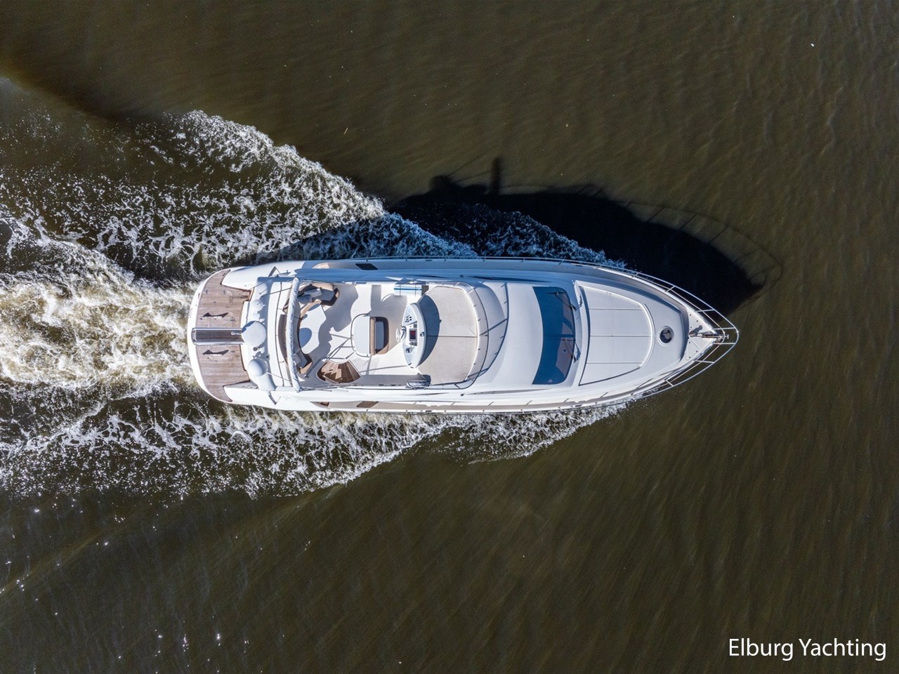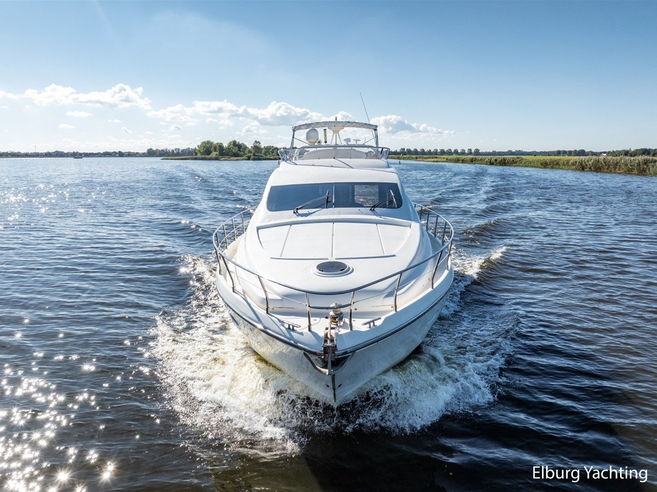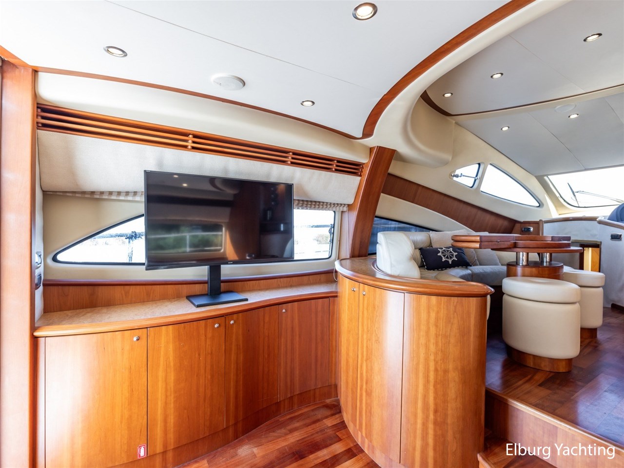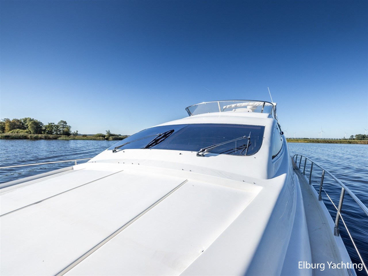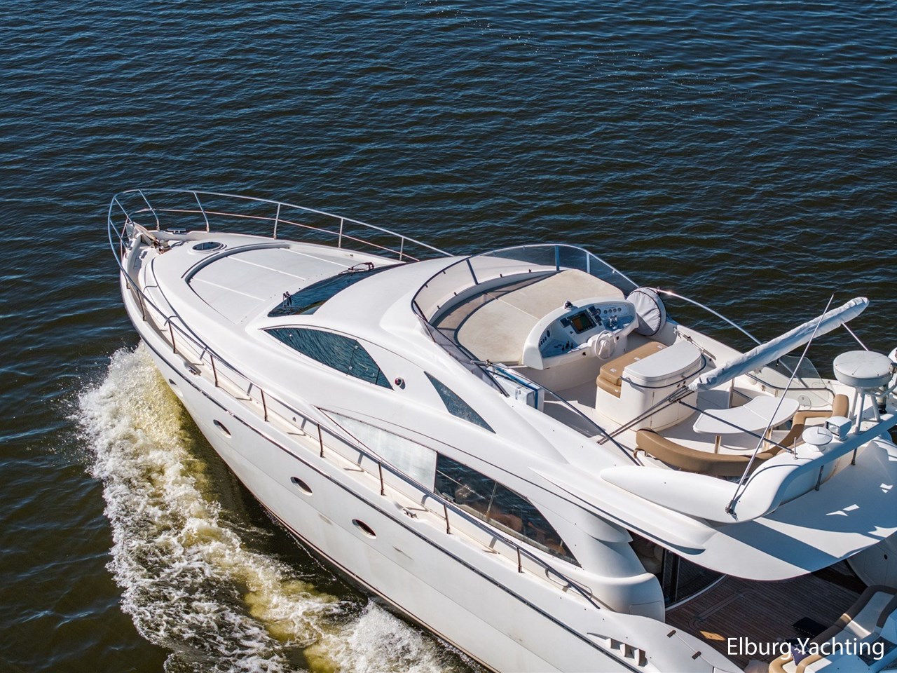 De Aicon 56 is een mooi gelijnd snelvarend polyester jacht. Het jacht beschikt over maar liefst 3 vaste hutten + crew cabin waarmee er plaats aan boord is voor minimaal 6 opvarenden. De salon is ruim opgezet met een aangesloten open keuken. Midscheeps bevind zich de 2-persoons eigenaarshut met eigen douche en toilet voorzieningen. In het voorschip zijn de twee gasten hutten gesitueerd met een 2-persoons frans bed in de voorpiek en een 2 x 1 persoons hut aan SB zijde. Via een vaste halfronde trap op het achterdek bereik je de flybridge. De flybridge heeft een vaste bank op het achterdek, wetbar met koelkast en grillplaat en voor de stuurstand een groot ligbed. De machinekamer is bereikbaar via de open kuip. Deze Aicon 56 is voorzien van: Royale open kuip met geïntegreerde banken met bijbehorende afneembare kussens, zonneschermen rondom kuip, r.v.s. schuifpui naar salon waardoor binnen en buiten met elkaar verbonden worden, TV in salon, koeling/verwarming per vertrek afzonderlijk regelbaar, Bosch vaatwasser, wasmachine, mooring winch in kuip aan SB + BB zijde, Caterpillar motormanagement displays, zonnebed op voordek en flybridge, volledige bimini over flybridge, 2-persoons stuurbank bij beide stuurstanden, afsluitbare kuip met spiegeldeur aan BB zijde, afneembare afdekhoezen voor buiten stuurstand, complete Raymarine navigatie apparatuur, de Yachtcontroller afstandsbediening maakt het aan- en afmeren kinderspel met een directe bediening voor de boeg-/hekschroef en motor(en) voor- en achteruit.