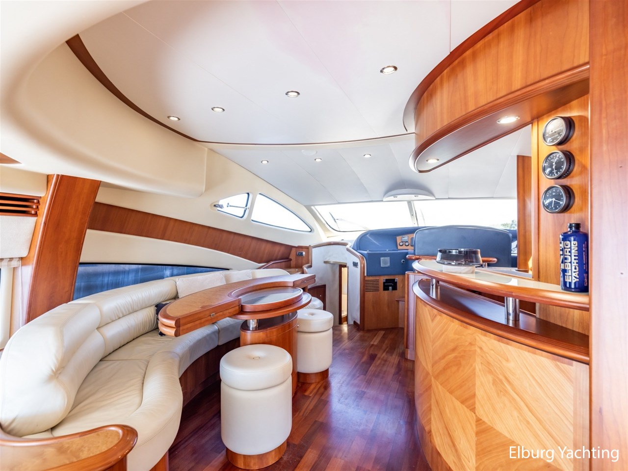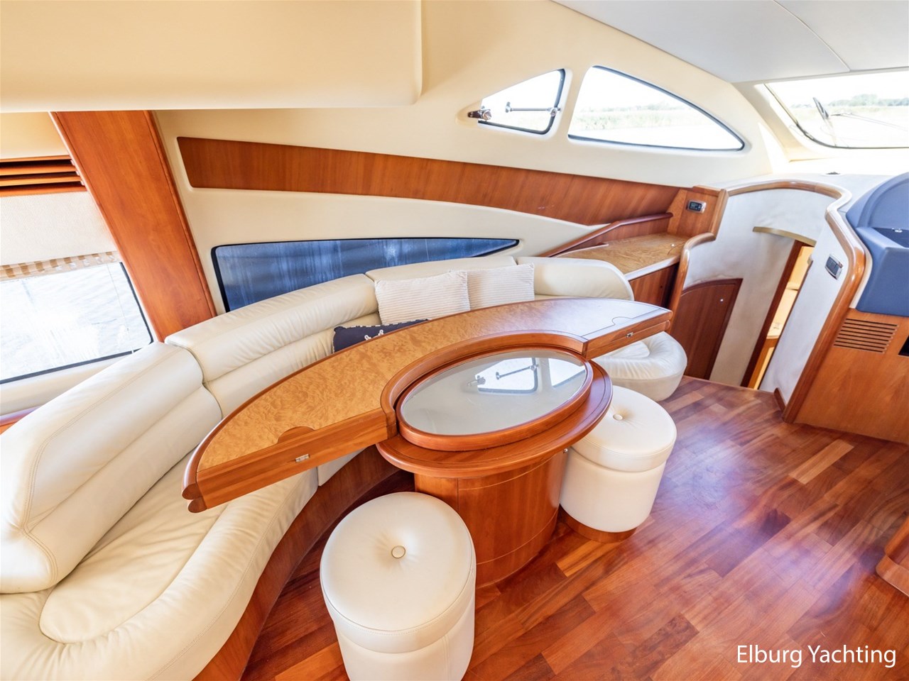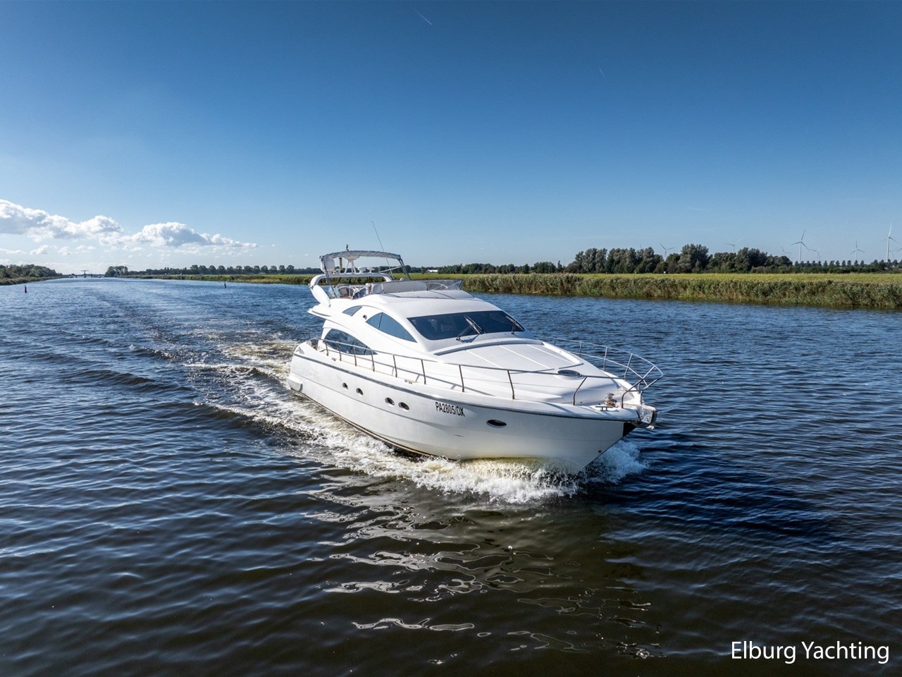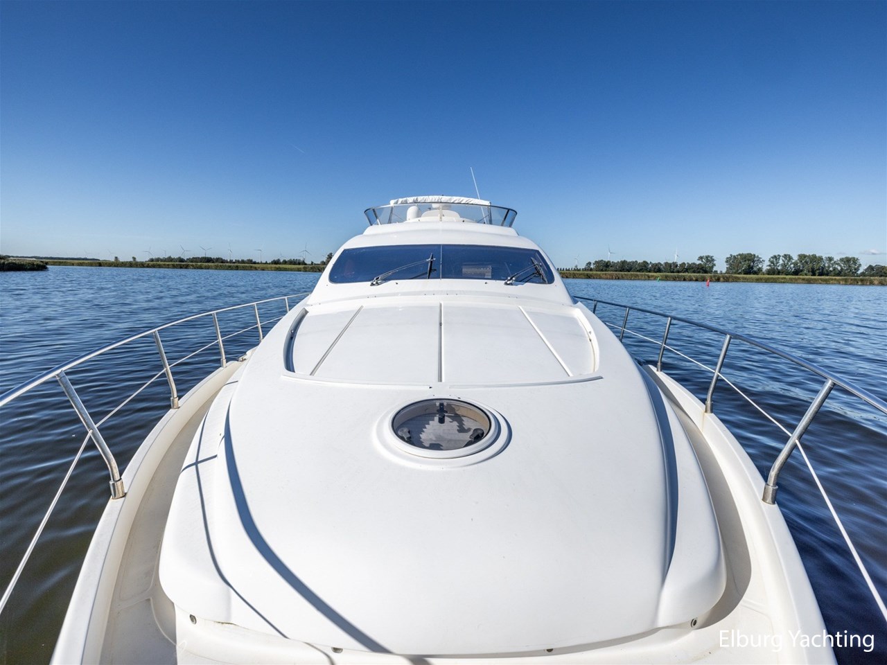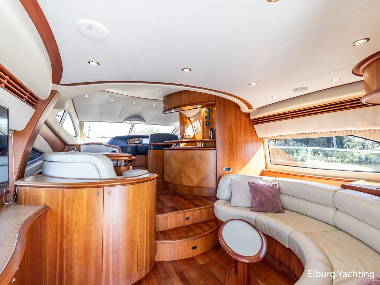 De Aicon 56 is een mooi gelijnd snelvarend polyester jacht. Het jacht beschikt over maar liefst 3 vaste hutten + crew cabin waarmee er plaats aan boord is voor minimaal 6 opvarenden. De salon is ruim opgezet met een aangesloten open keuken. Midscheeps bevind zich de 2-persoons eigenaarshut met eigen douche en toilet voorzieningen. In het voorschip zijn de twee gasten hutten gesitueerd met een 2-persoons frans bed in de voorpiek en een 2 x 1 persoons hut aan SB zijde. Via een vaste halfronde trap op het achterdek bereik je de flybridge. De flybridge heeft een vaste bank op het achterdek, wetbar met koelkast en grillplaat en voor de stuurstand een groot ligbed. De machinekamer is bereikbaar via de open kuip. Deze Aicon 56 is voorzien van: Royale open kuip met geïntegreerde banken met bijbehorende afneembare kussens, zonneschermen rondom kuip, r.v.s. schuifpui naar salon waardoor binnen en buiten met elkaar verbonden worden, TV in salon, koeling/verwarming per vertrek afzonderlijk regelbaar, Bosch vaatwasser, wasmachine, mooring winch in kuip aan SB + BB zijde, Caterpillar motormanagement displays, zonnebed op voordek en flybridge, volledige bimini over flybridge, 2-persoons stuurbank bij beide stuurstanden, afsluitbare kuip met spiegeldeur aan BB zijde, afneembare afdekhoezen voor buiten stuurstand, complete Raymarine navigatie apparatuur, de Yachtcontroller afstandsbediening maakt het aan- en afmeren kinderspel met een directe bediening voor de boeg-/hekschroef en motor(en) voor- en achteruit.