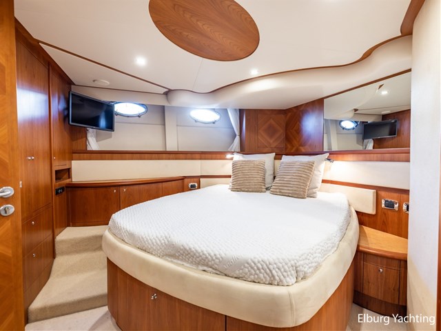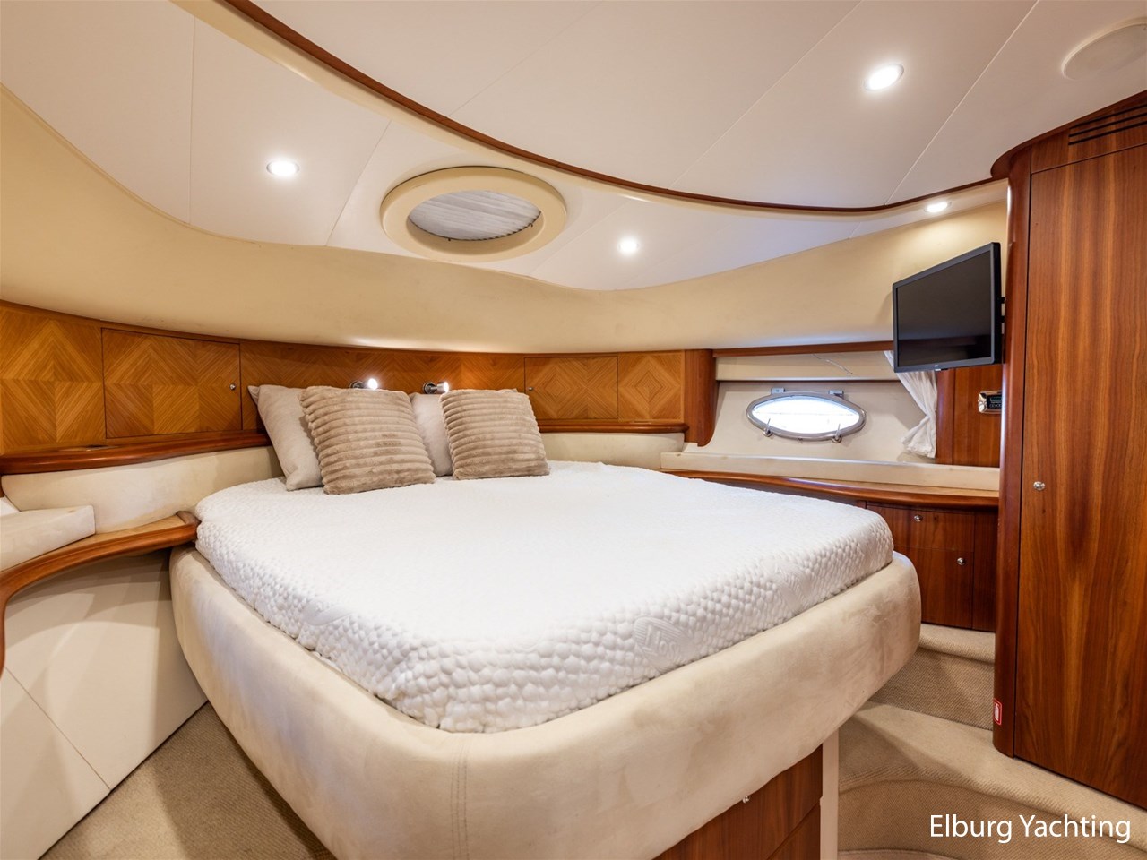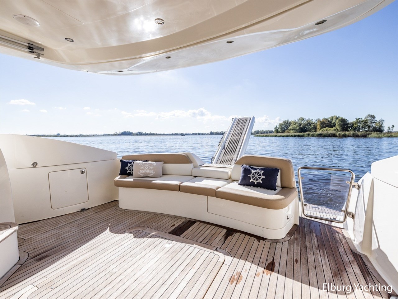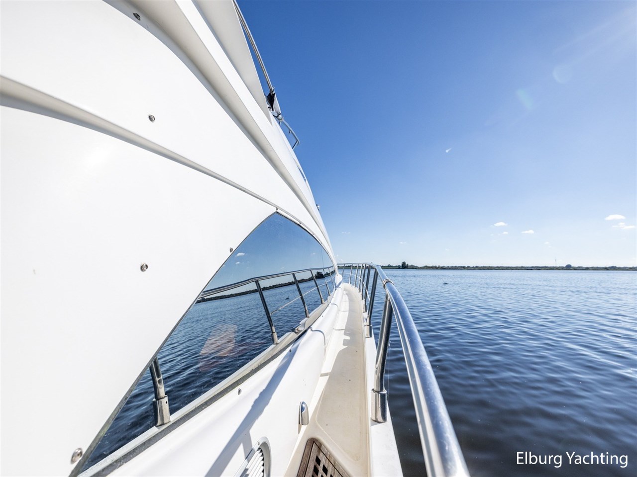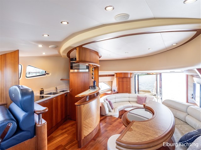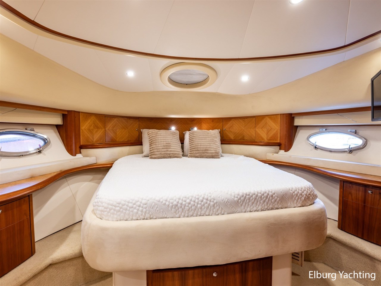 De Aicon 56 is een mooi gelijnd snelvarend polyester jacht. Het jacht beschikt over maar liefst 3 vaste hutten + crew cabin waarmee er plaats aan boord is voor minimaal 6 opvarenden. De salon is ruim opgezet met een aangesloten open keuken. Midscheeps bevind zich de 2-persoons eigenaarshut met eigen douche en toilet voorzieningen. In het voorschip zijn de twee gasten hutten gesitueerd met een 2-persoons frans bed in de voorpiek en een 2 x 1 persoons hut aan SB zijde. Via een vaste halfronde trap op het achterdek bereik je de flybridge. De flybridge heeft een vaste bank op het achterdek, wetbar met koelkast en grillplaat en voor de stuurstand een groot ligbed. De machinekamer is bereikbaar via de open kuip. Deze Aicon 56 is voorzien van: Royale open kuip met geïntegreerde banken met bijbehorende afneembare kussens, zonneschermen rondom kuip, r.v.s. schuifpui naar salon waardoor binnen en buiten met elkaar verbonden worden, TV in salon, koeling/verwarming per vertrek afzonderlijk regelbaar, Bosch vaatwasser, wasmachine, mooring winch in kuip aan SB + BB zijde, Caterpillar motormanagement displays, zonnebed op voordek en flybridge, volledige bimini over flybridge, 2-persoons stuurbank bij beide stuurstanden, afsluitbare kuip met spiegeldeur aan BB zijde, afneembare afdekhoezen voor buiten stuurstand, complete Raymarine navigatie apparatuur, de Yachtcontroller afstandsbediening maakt het aan- en afmeren kinderspel met een directe bediening voor de boeg-/hekschroef en motor(en) voor- en achteruit.