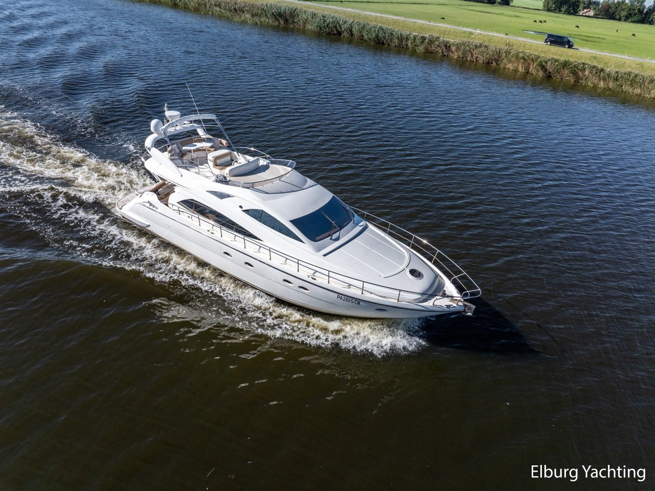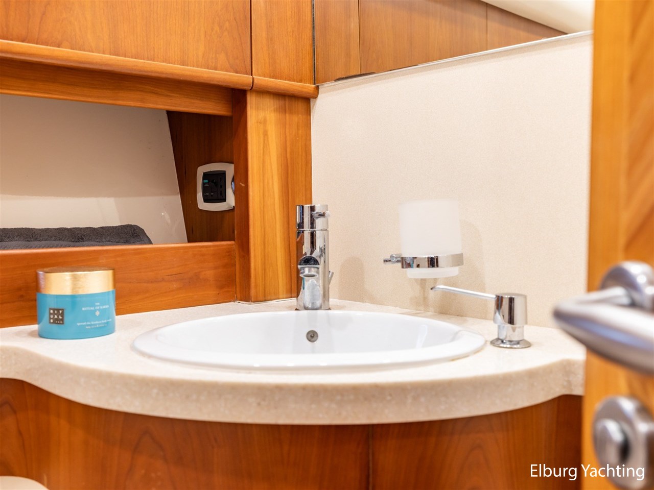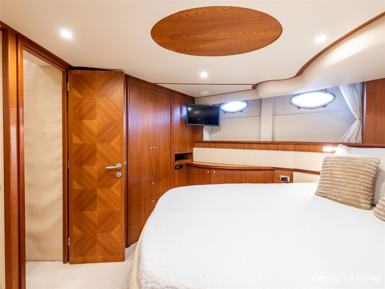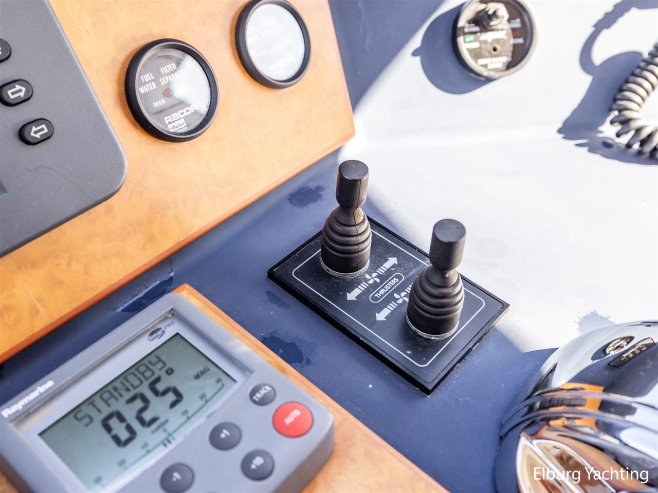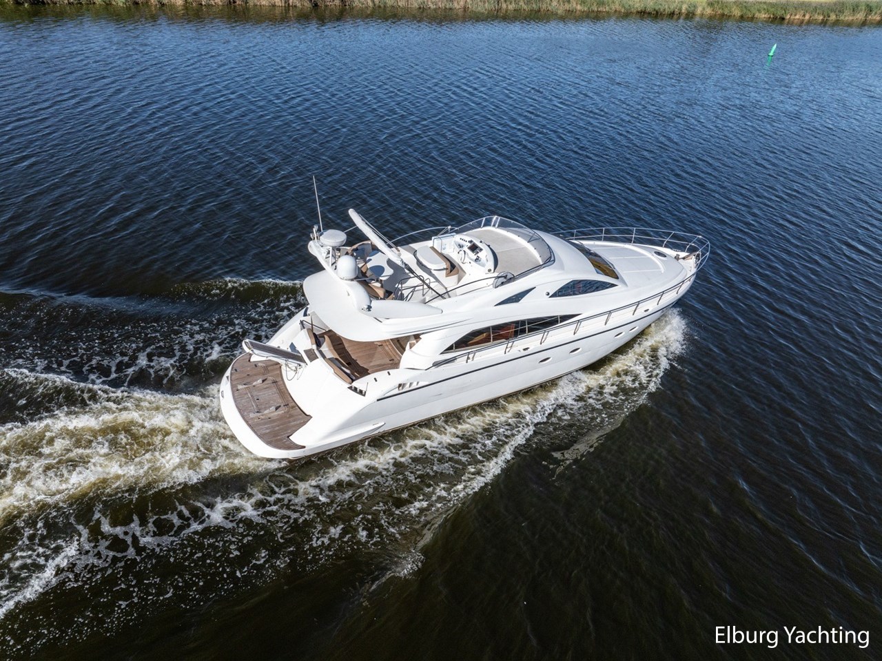 De Aicon 56 is een mooi gelijnd snelvarend polyester jacht. Het jacht beschikt over maar liefst 3 vaste hutten + crew cabin waarmee er plaats aan boord is voor minimaal 6 opvarenden. De salon is ruim opgezet met een aangesloten open keuken. Midscheeps bevind zich de 2-persoons eigenaarshut met eigen douche en toilet voorzieningen. In het voorschip zijn de twee gasten hutten gesitueerd met een 2-persoons frans bed in de voorpiek en een 2 x 1 persoons hut aan SB zijde. Via een vaste halfronde trap op het achterdek bereik je de flybridge. De flybridge heeft een vaste bank op het achterdek, wetbar met koelkast en grillplaat en voor de stuurstand een groot ligbed. De machinekamer is bereikbaar via de open kuip. Deze Aicon 56 is voorzien van: Royale open kuip met geïntegreerde banken met bijbehorende afneembare kussens, zonneschermen rondom kuip, r.v.s. schuifpui naar salon waardoor binnen en buiten met elkaar verbonden worden, TV in salon, koeling/verwarming per vertrek afzonderlijk regelbaar, Bosch vaatwasser, wasmachine, mooring winch in kuip aan SB + BB zijde, Caterpillar motormanagement displays, zonnebed op voordek en flybridge, volledige bimini over flybridge, 2-persoons stuurbank bij beide stuurstanden, afsluitbare kuip met spiegeldeur aan BB zijde, afneembare afdekhoezen voor buiten stuurstand, complete Raymarine navigatie apparatuur, de Yachtcontroller afstandsbediening maakt het aan- en afmeren kinderspel met een directe bediening voor de boeg-/hekschroef en motor(en) voor- en achteruit.