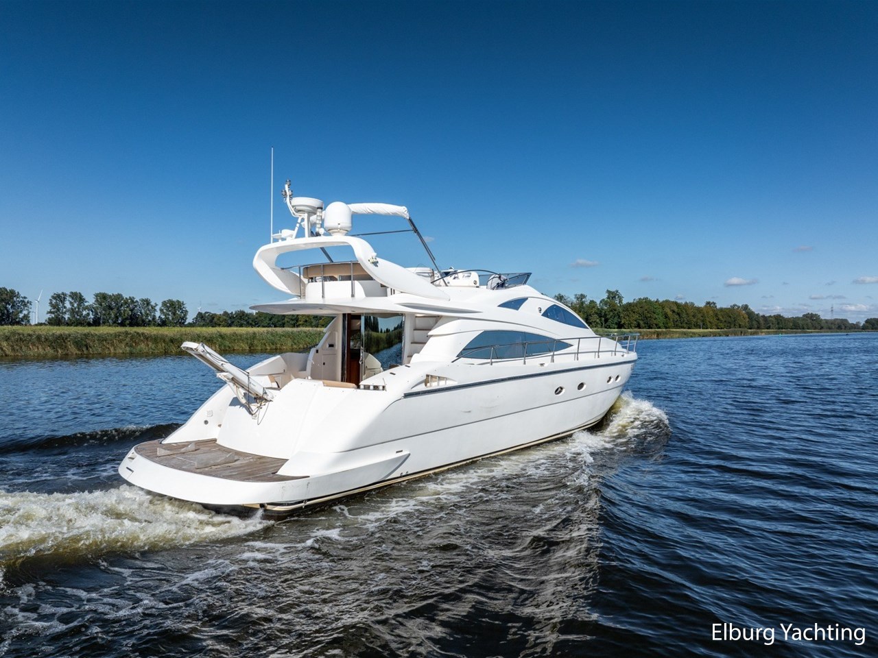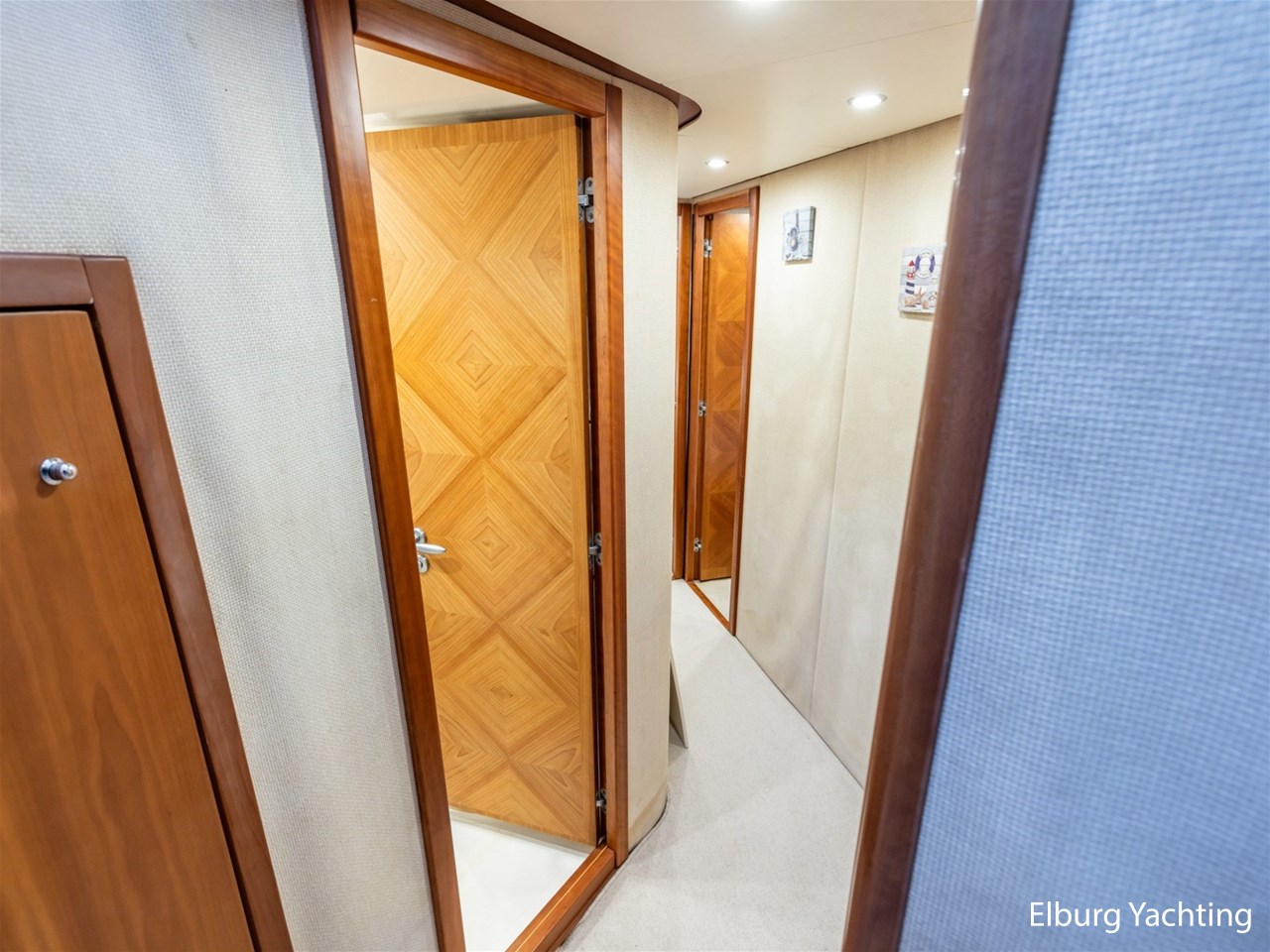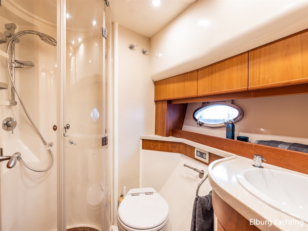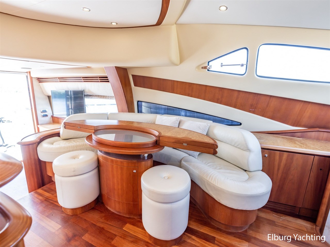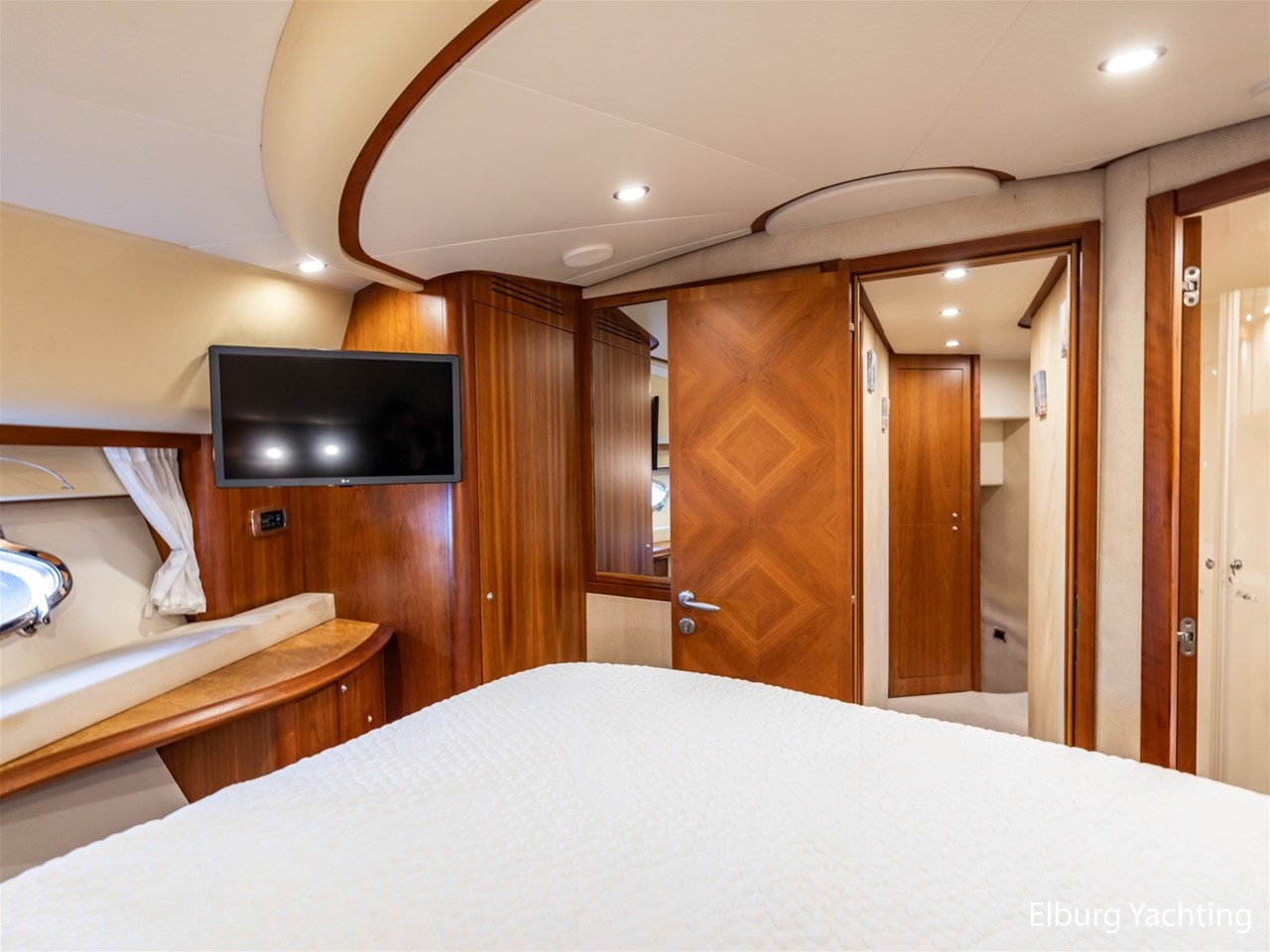 De Aicon 56 is een mooi gelijnd snelvarend polyester jacht. Het jacht beschikt over maar liefst 3 vaste hutten + crew cabin waarmee er plaats aan boord is voor minimaal 6 opvarenden. De salon is ruim opgezet met een aangesloten open keuken. Midscheeps bevind zich de 2-persoons eigenaarshut met eigen douche en toilet voorzieningen. In het voorschip zijn de twee gasten hutten gesitueerd met een 2-persoons frans bed in de voorpiek en een 2 x 1 persoons hut aan SB zijde. Via een vaste halfronde trap op het achterdek bereik je de flybridge. De flybridge heeft een vaste bank op het achterdek, wetbar met koelkast en grillplaat en voor de stuurstand een groot ligbed. De machinekamer is bereikbaar via de open kuip. Deze Aicon 56 is voorzien van: Royale open kuip met geïntegreerde banken met bijbehorende afneembare kussens, zonneschermen rondom kuip, r.v.s. schuifpui naar salon waardoor binnen en buiten met elkaar verbonden worden, TV in salon, koeling/verwarming per vertrek afzonderlijk regelbaar, Bosch vaatwasser, wasmachine, mooring winch in kuip aan SB + BB zijde, Caterpillar motormanagement displays, zonnebed op voordek en flybridge, volledige bimini over flybridge, 2-persoons stuurbank bij beide stuurstanden, afsluitbare kuip met spiegeldeur aan BB zijde, afneembare afdekhoezen voor buiten stuurstand, complete Raymarine navigatie apparatuur, de Yachtcontroller afstandsbediening maakt het aan- en afmeren kinderspel met een directe bediening voor de boeg-/hekschroef en motor(en) voor- en achteruit.