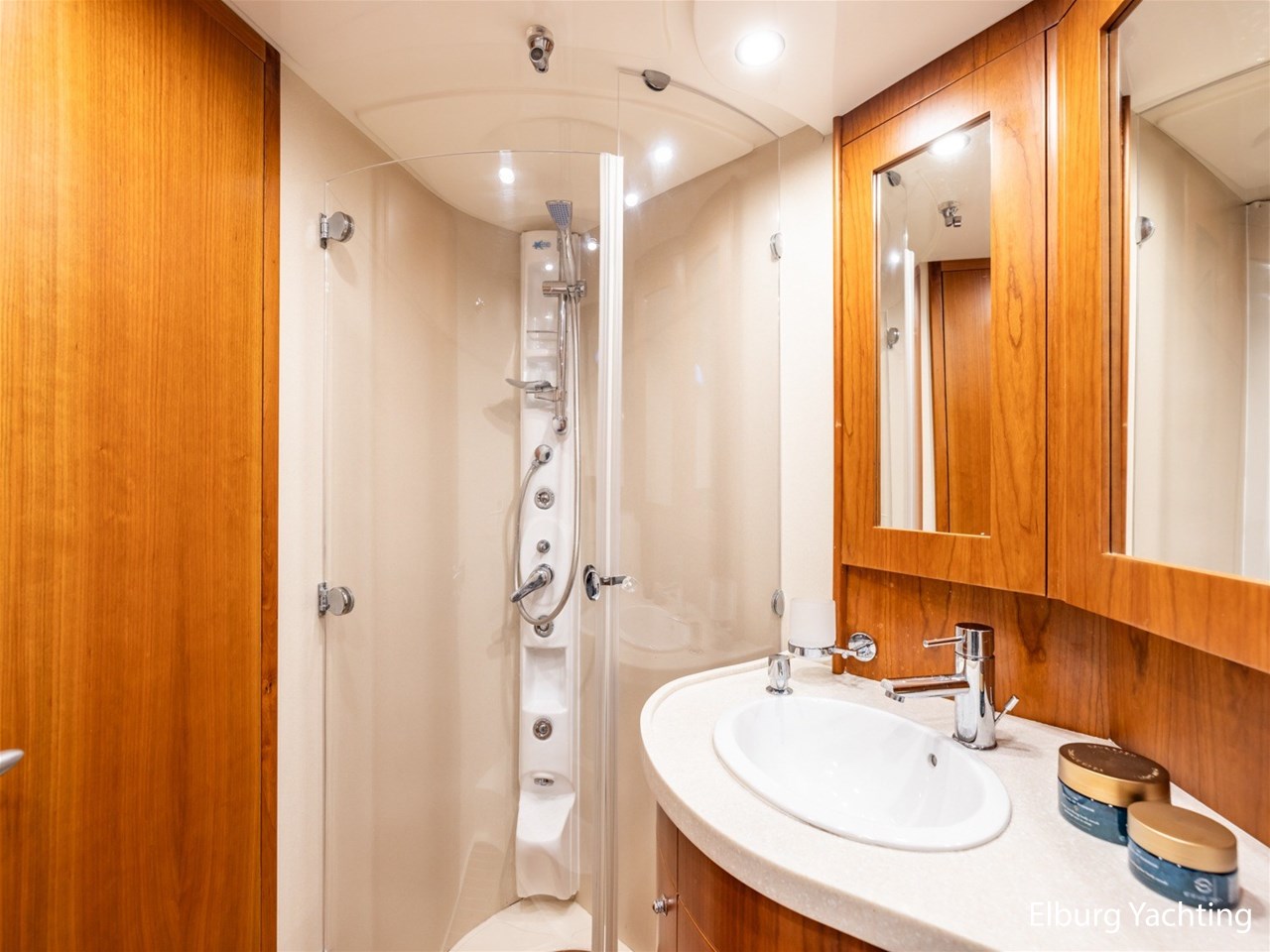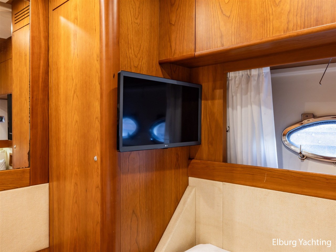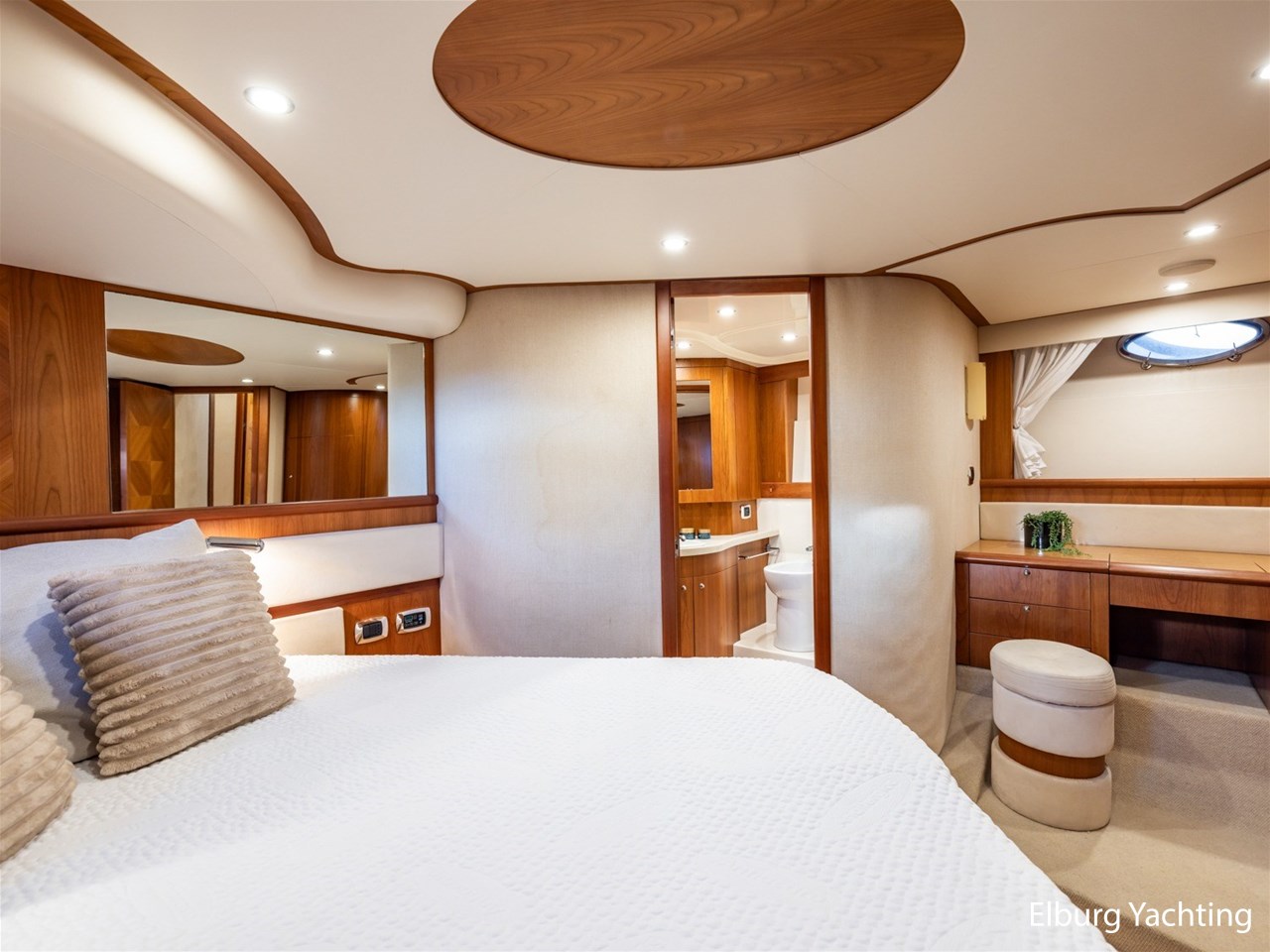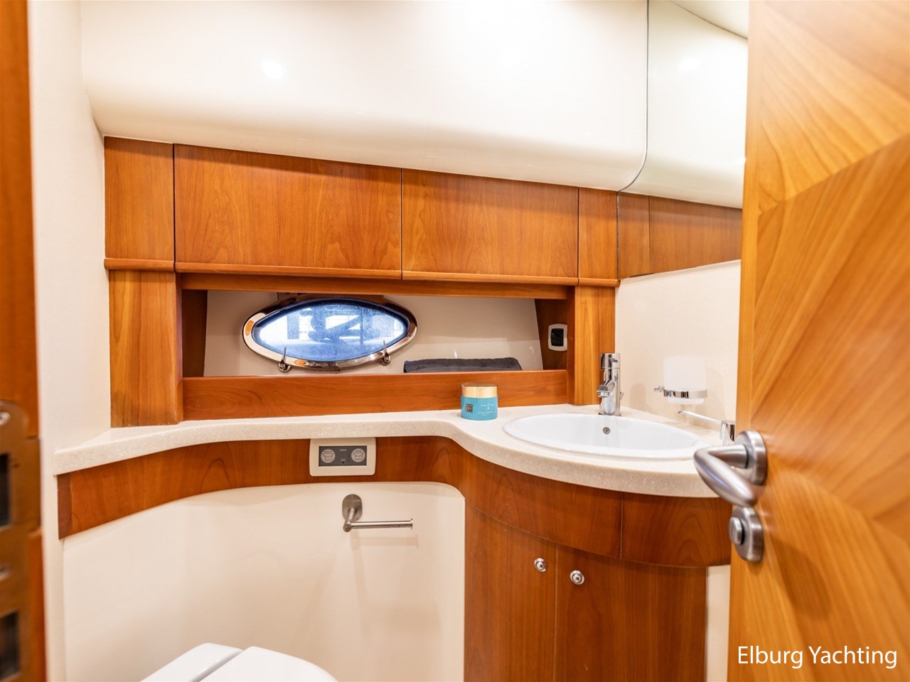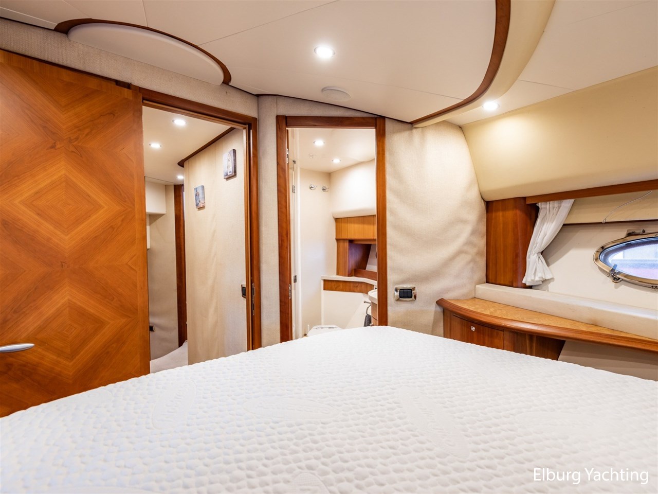 De Aicon 56 is een mooi gelijnd snelvarend polyester jacht. Het jacht beschikt over maar liefst 3 vaste hutten + crew cabin waarmee er plaats aan boord is voor minimaal 6 opvarenden. De salon is ruim opgezet met een aangesloten open keuken. Midscheeps bevind zich de 2-persoons eigenaarshut met eigen douche en toilet voorzieningen. In het voorschip zijn de twee gasten hutten gesitueerd met een 2-persoons frans bed in de voorpiek en een 2 x 1 persoons hut aan SB zijde. Via een vaste halfronde trap op het achterdek bereik je de flybridge. De flybridge heeft een vaste bank op het achterdek, wetbar met koelkast en grillplaat en voor de stuurstand een groot ligbed. De machinekamer is bereikbaar via de open kuip. Deze Aicon 56 is voorzien van: Royale open kuip met geïntegreerde banken met bijbehorende afneembare kussens, zonneschermen rondom kuip, r.v.s. schuifpui naar salon waardoor binnen en buiten met elkaar verbonden worden, TV in salon, koeling/verwarming per vertrek afzonderlijk regelbaar, Bosch vaatwasser, wasmachine, mooring winch in kuip aan SB + BB zijde, Caterpillar motormanagement displays, zonnebed op voordek en flybridge, volledige bimini over flybridge, 2-persoons stuurbank bij beide stuurstanden, afsluitbare kuip met spiegeldeur aan BB zijde, afneembare afdekhoezen voor buiten stuurstand, complete Raymarine navigatie apparatuur, de Yachtcontroller afstandsbediening maakt het aan- en afmeren kinderspel met een directe bediening voor de boeg-/hekschroef en motor(en) voor- en achteruit.