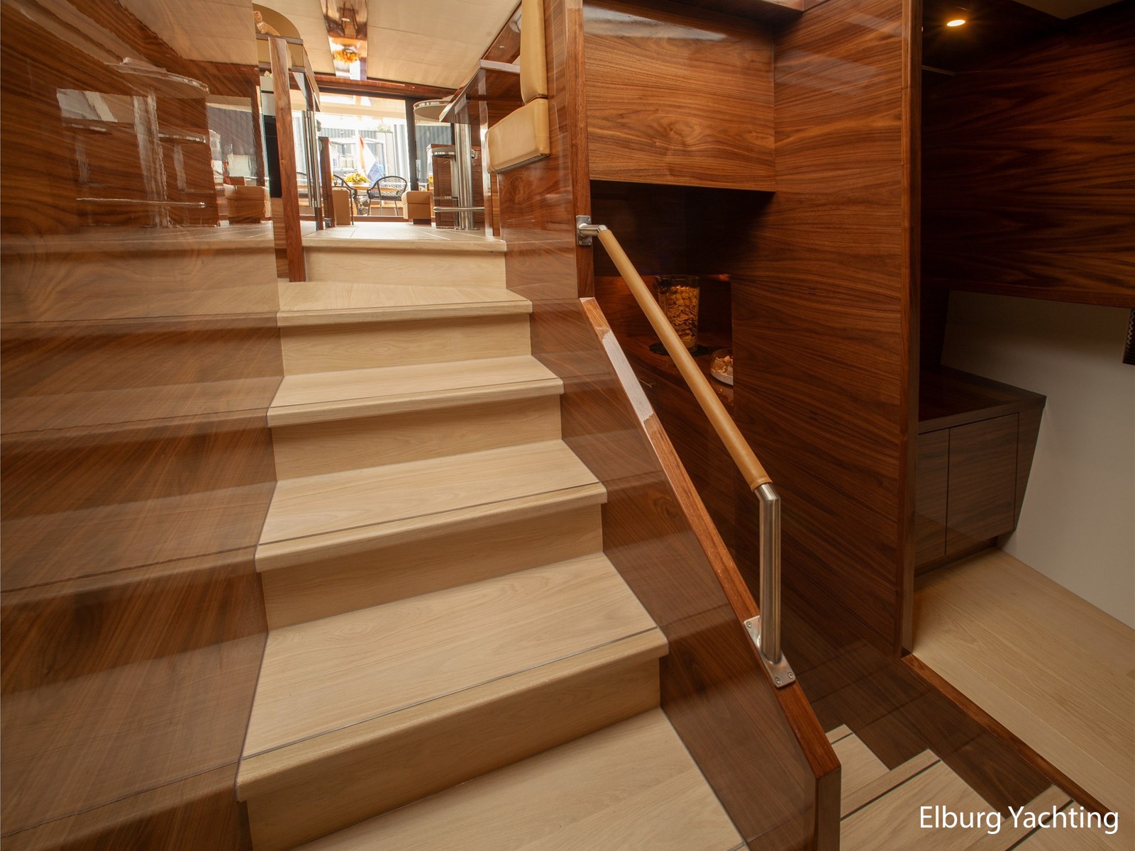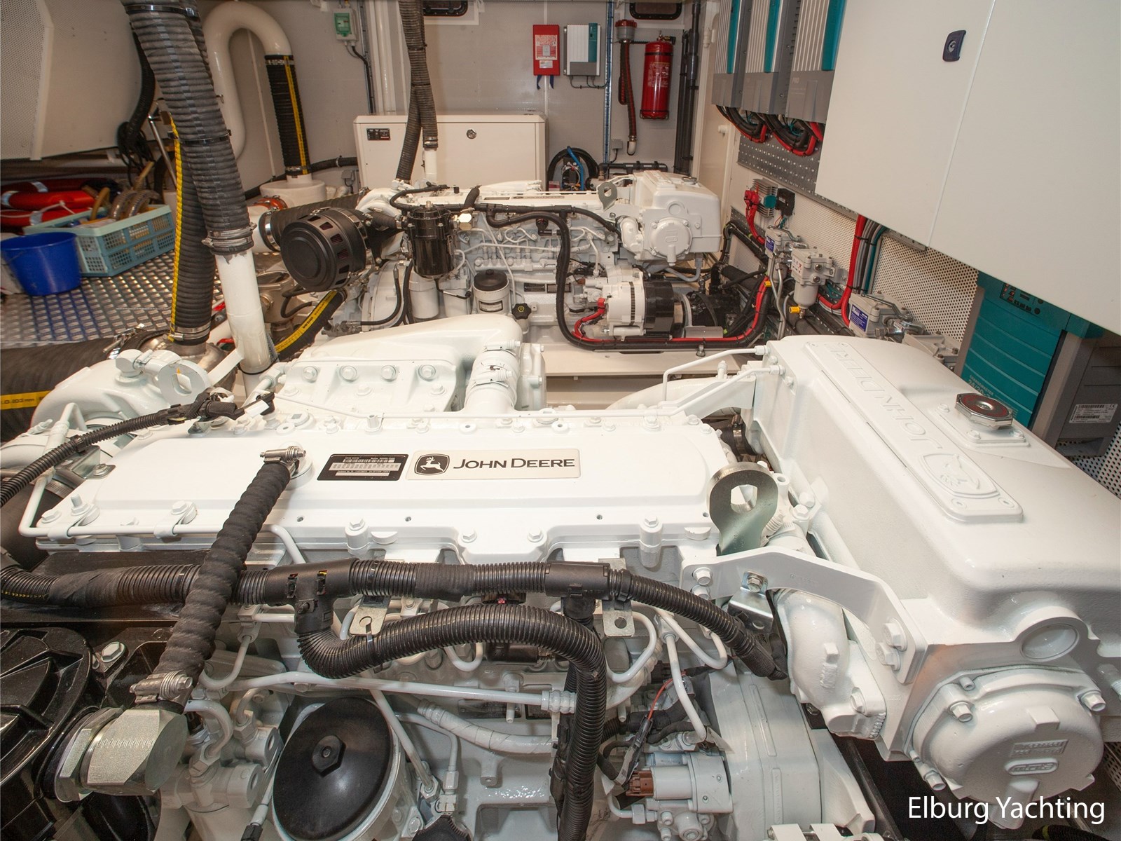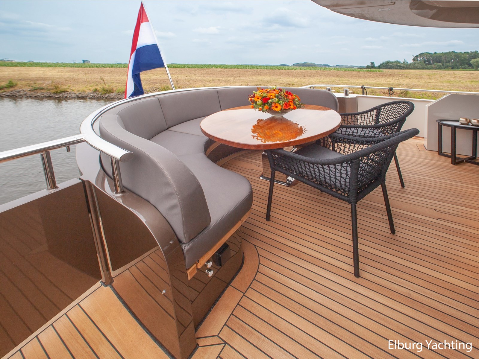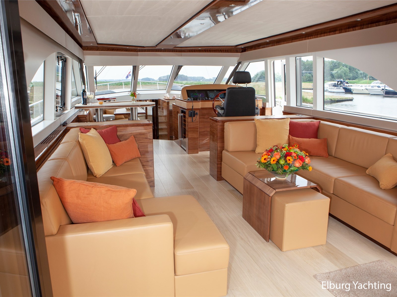 De salon op dekniveau biedt een spectaculair 360-graden uitzicht, wat het gevoel van ruimte en licht versterkt doormiddel van de grote raampartijen. De brede gangboorden rondom maken het veilig en gemakkelijk om gelijkvloers rondom het dek te bewegen. Het voordek biedt volop ruimte om te loungen, compleet met een comfortabele bank om in alle rust van het uitzicht te genieten. Ook het achterdek is royaal opgezet, met een halfronde bank voor vijf personen en een overkapping die schaduw biedt tijdens zonnige dagen. Aan beide zijden van het jacht leiden stijlvolle trappen naar het ruime zwemplateau, dat tevens toegang biedt tot de professioneel ingerichte machinekamer met stahoogte. Met plezier maak je hier een dagelijks inspectie rondje en ziet in een oogopslag dat alle techniek in orde is. Dit schip beschikt over een geldig CVO certificaat.